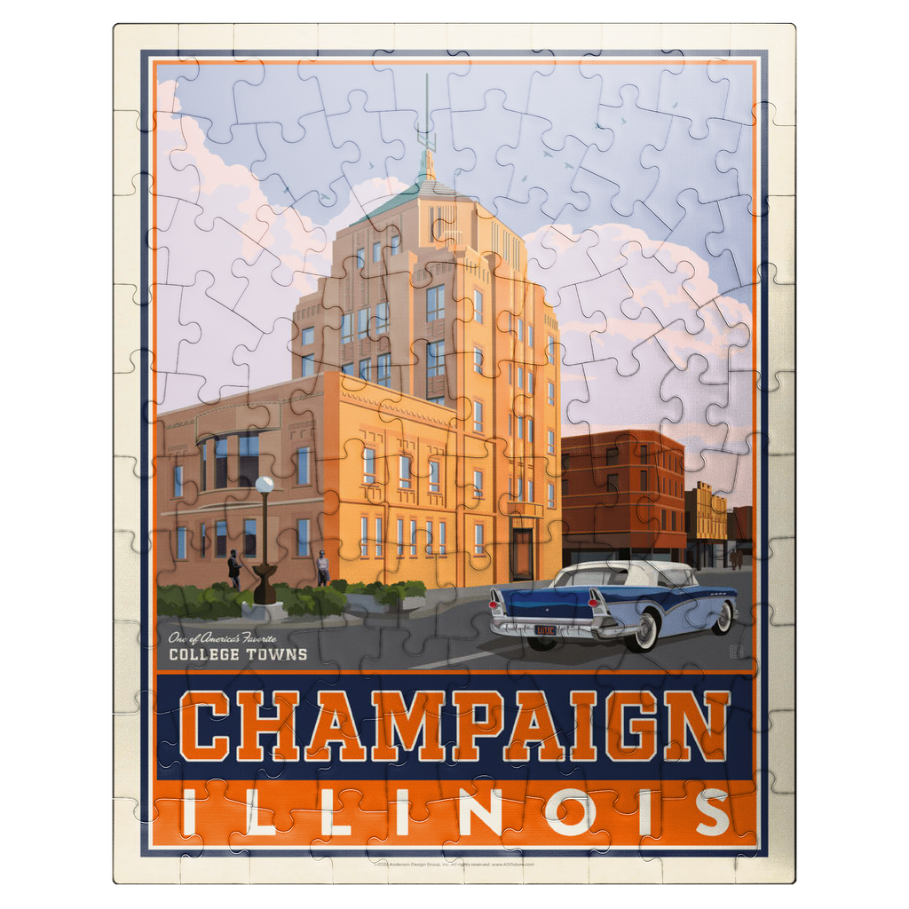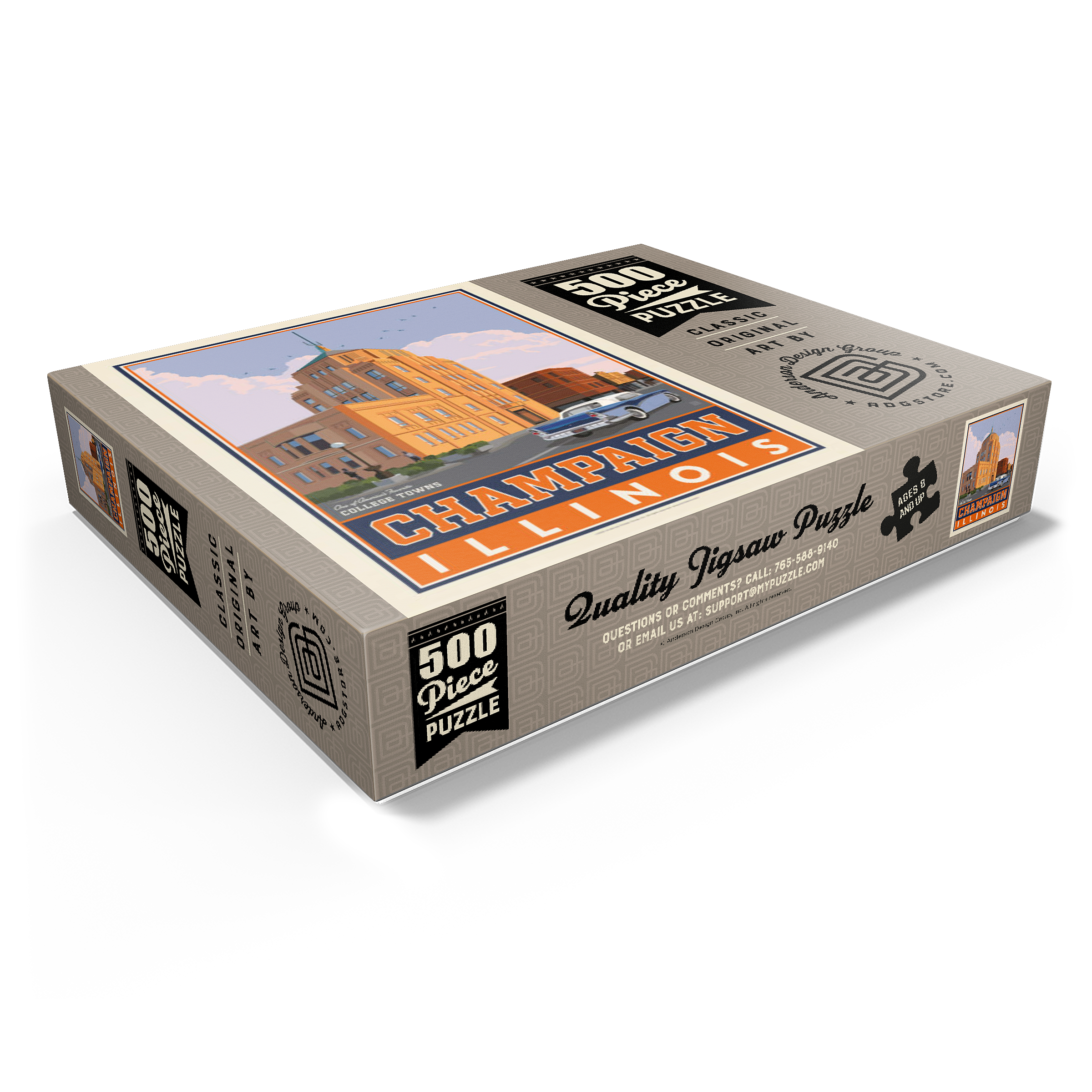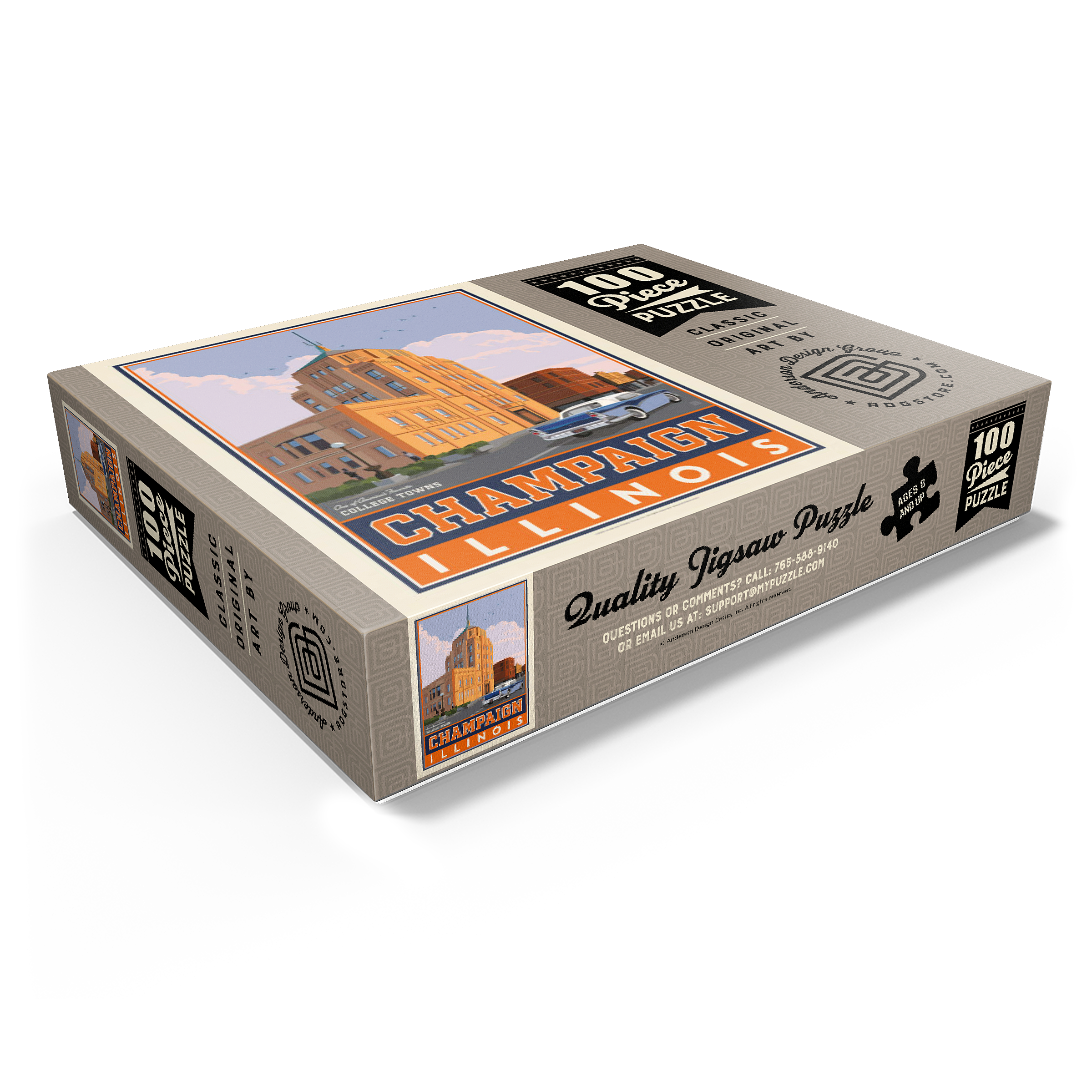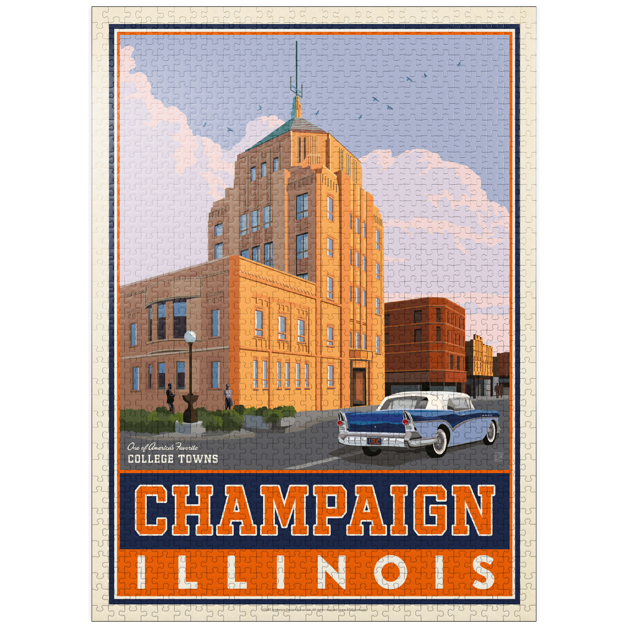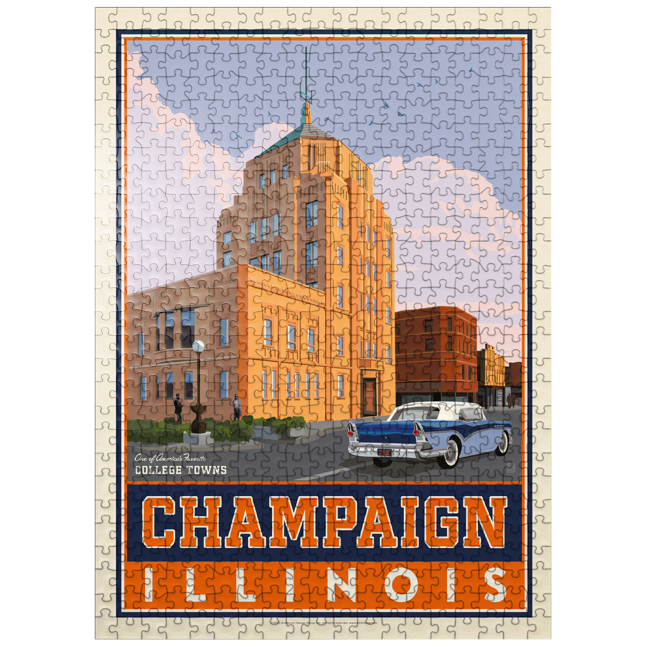 Champaign, Illinois is depicted in a vibrant city scene showcasing its distinctive Art Deco architecture under a clear Midwestern sky. The warm tones of the historic downtown building contrast beautifully with the soft pastel clouds above, while a classic vintage car adds a nostalgic touch to the streetscape. This depiction highlights Champaign's charm as one of America's favorite college towns, known for its blend of academic energy, historic design, and modern culture. The artwork captures the spirit of the city's urban core, reflecting both its architectural heritage and lively community atmosphere.
