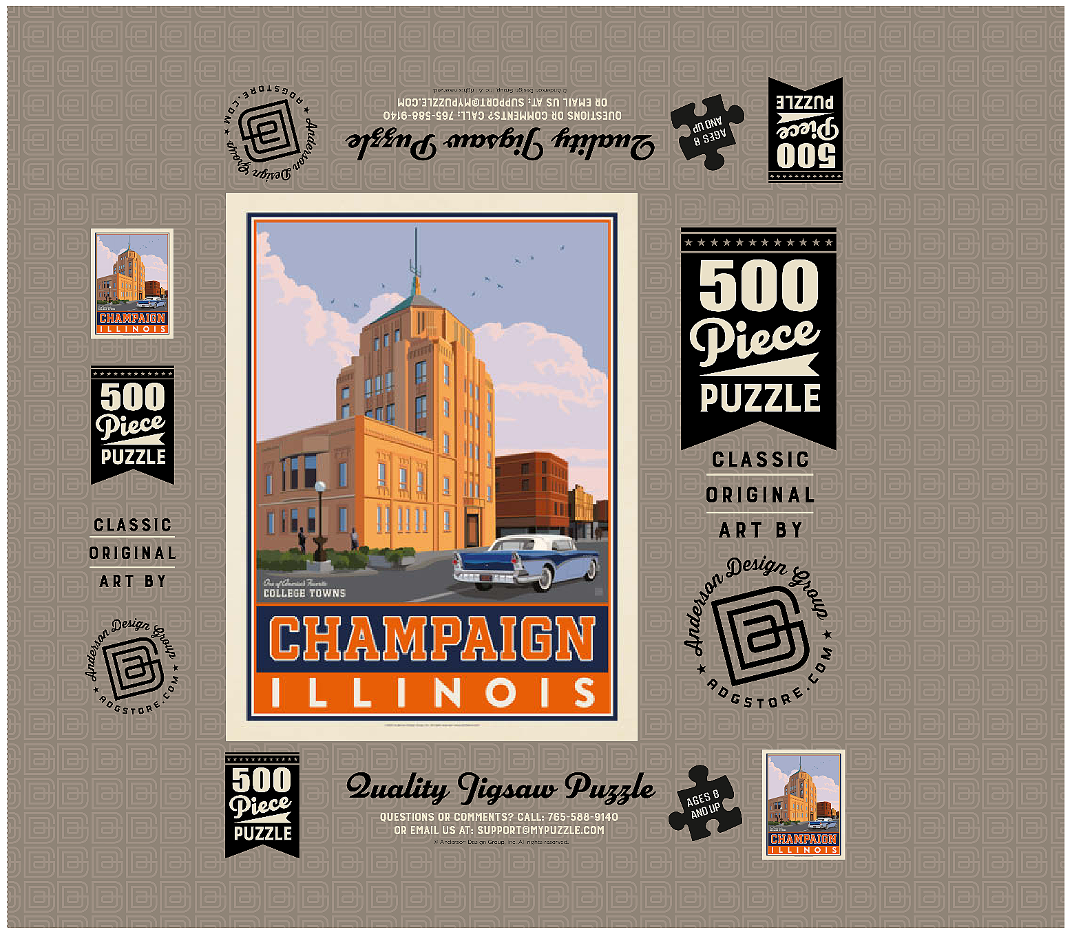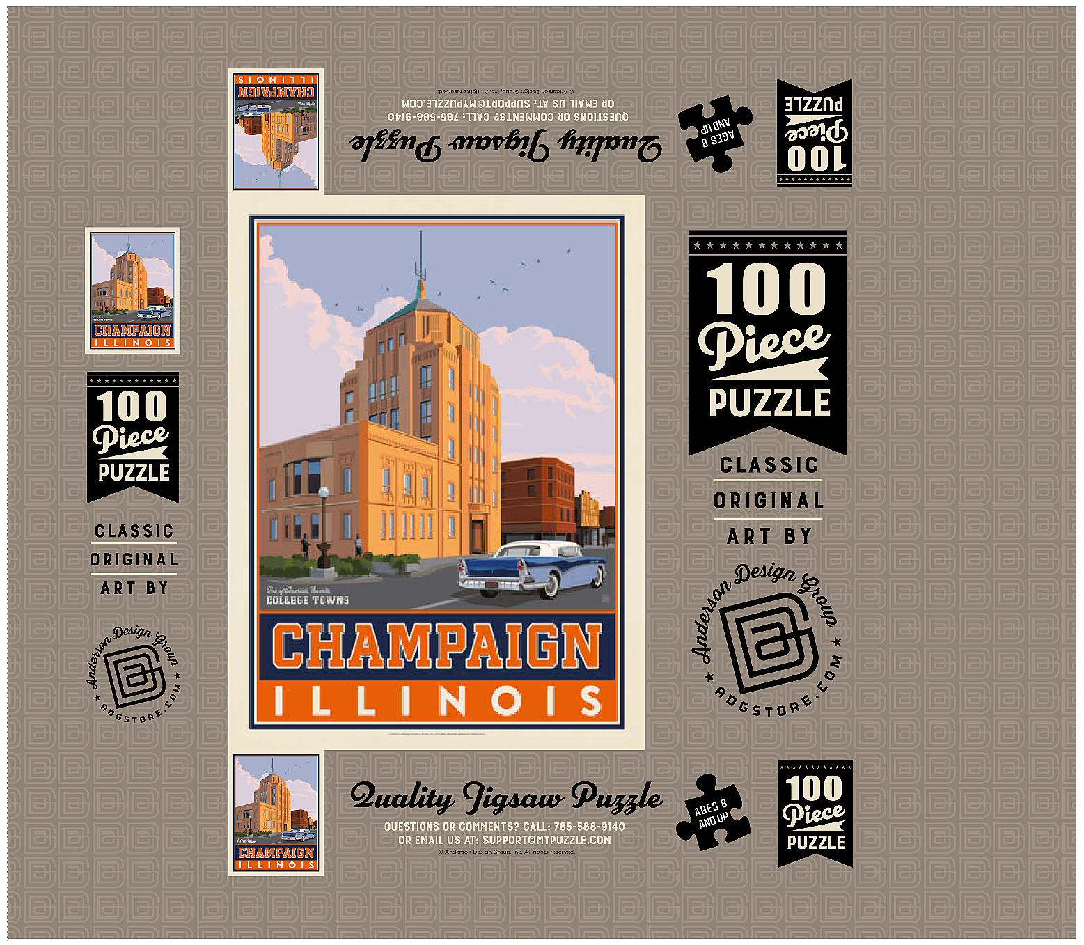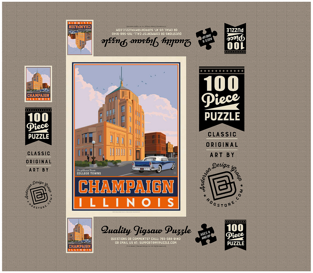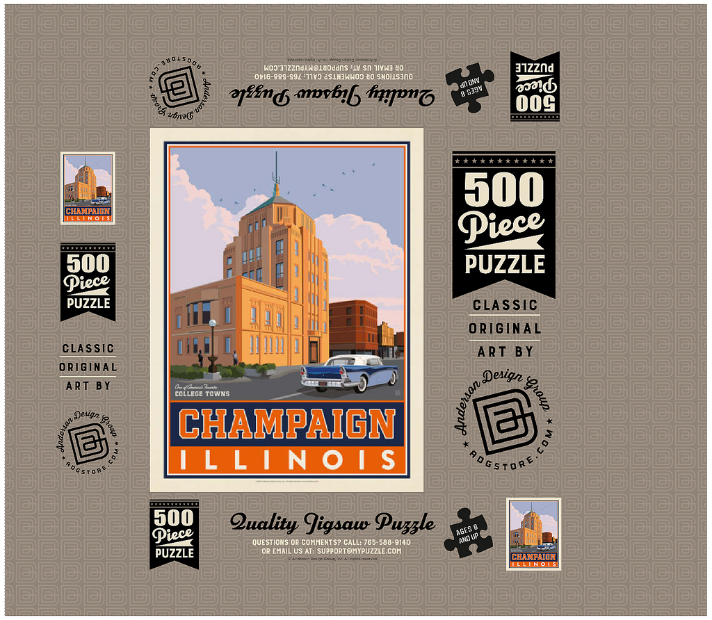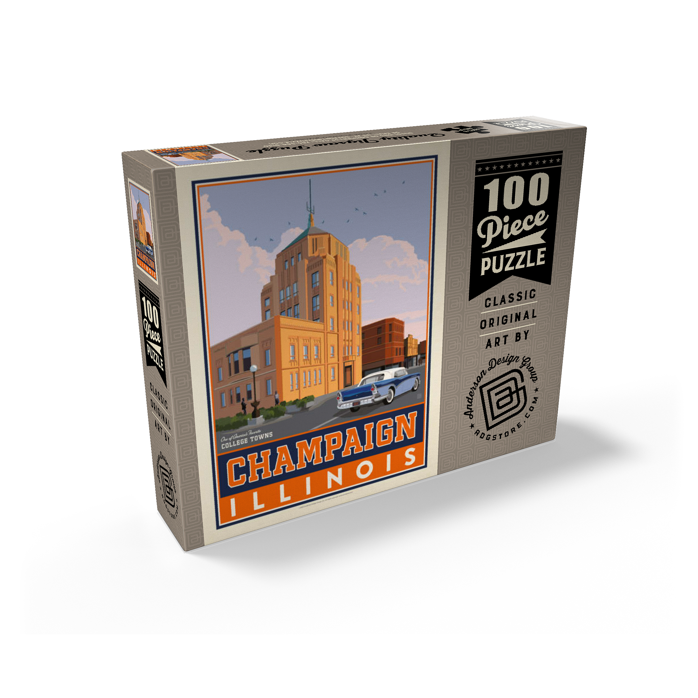 Champaign, Illinois is depicted in a vibrant city scene showcasing its distinctive Art Deco architecture under a clear Midwestern sky. The warm tones of the historic downtown building contrast beautifully with the soft pastel clouds above, while a classic vintage car adds a nostalgic touch to the streetscape. This depiction highlights Champaign's charm as one of America's favorite college towns, known for its blend of academic energy, historic design, and modern culture. The artwork captures the spirit of the city's urban core, reflecting both its architectural heritage and lively community atmosphere.