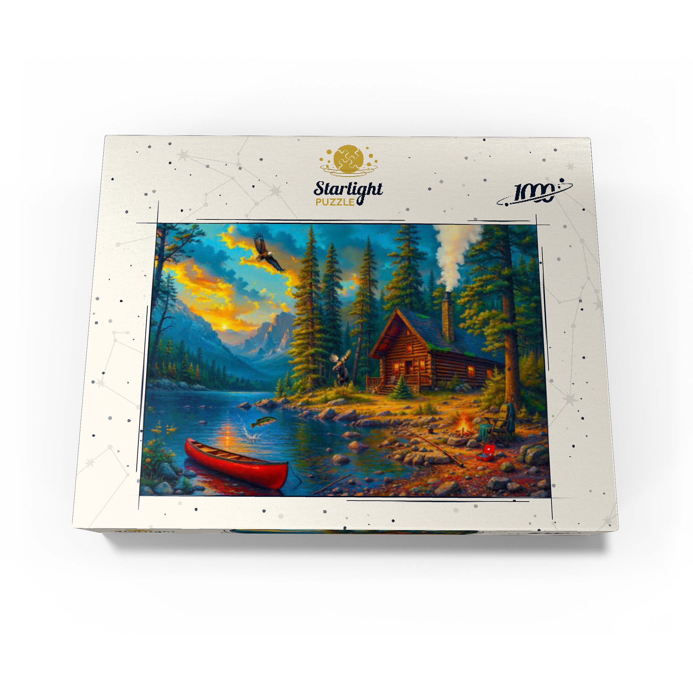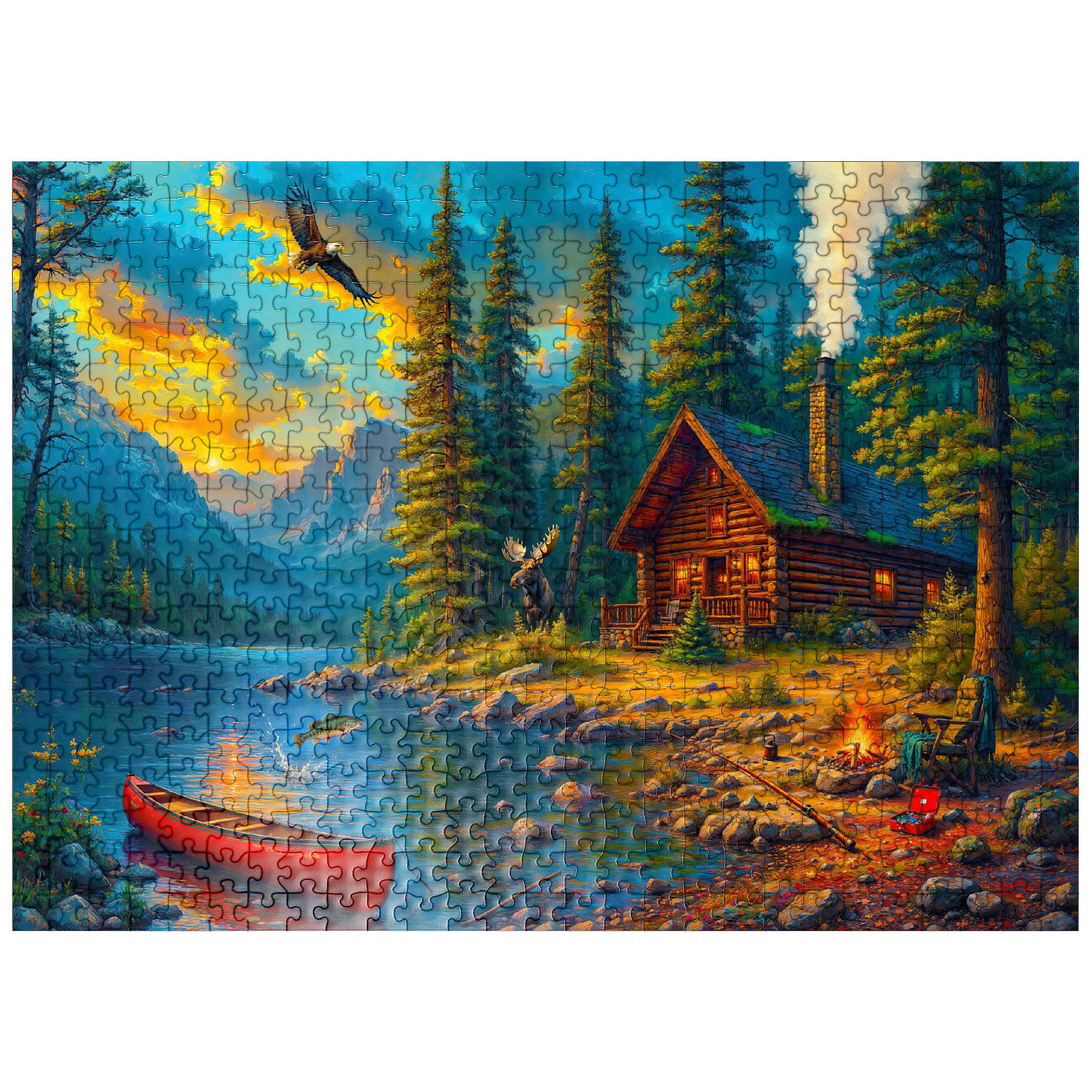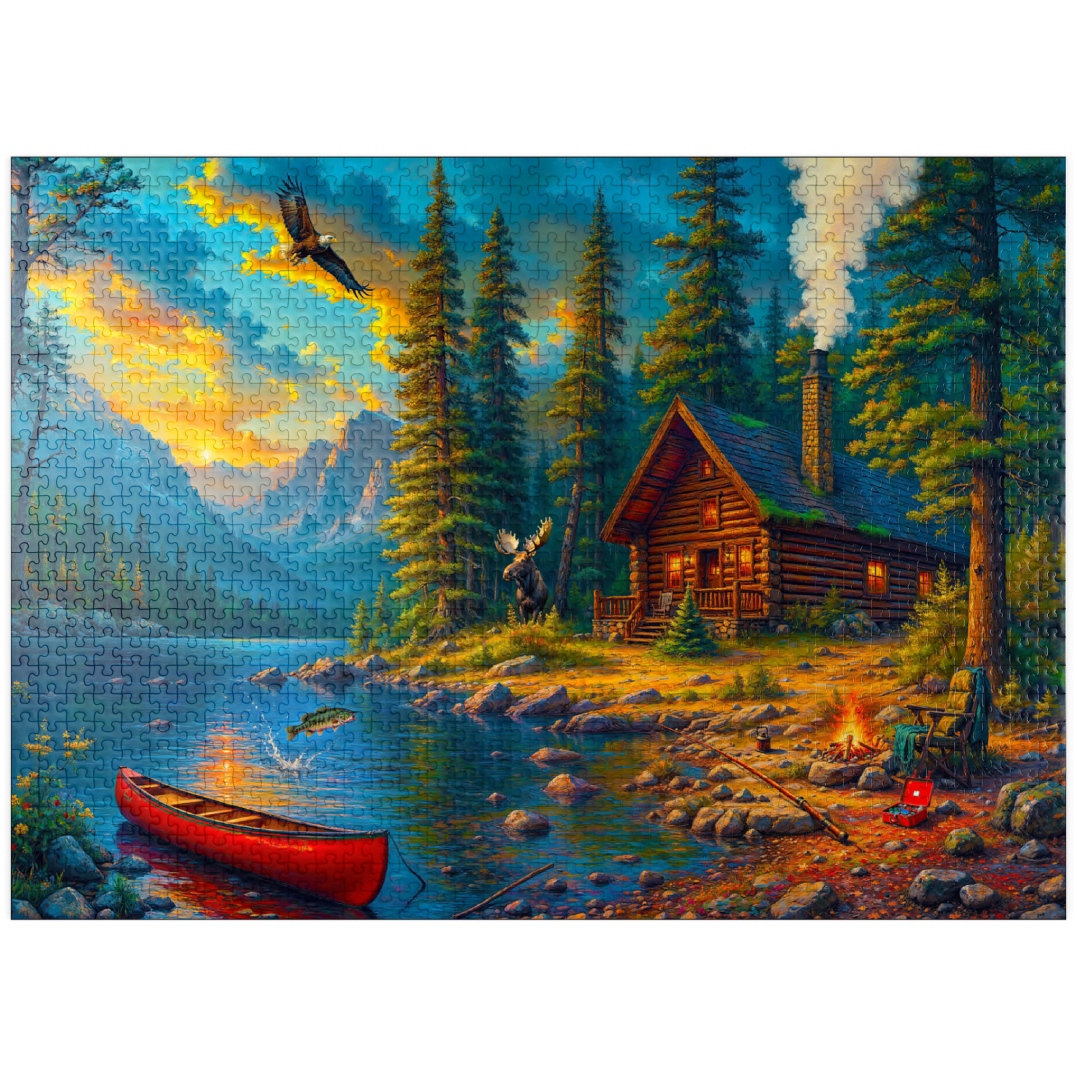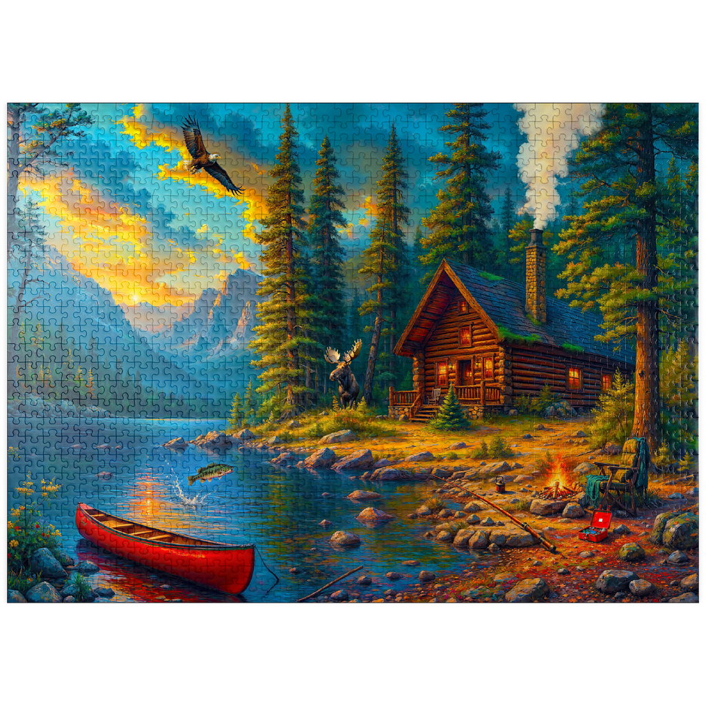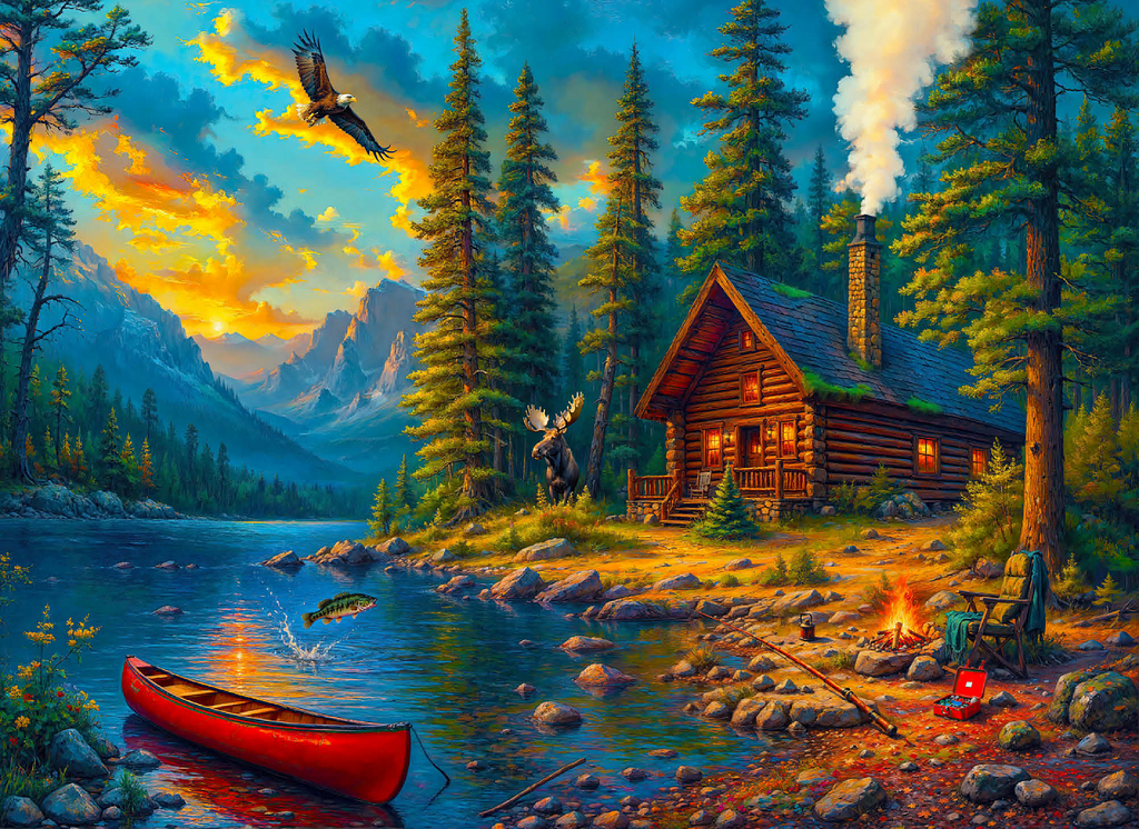 This captivating artwork portrays a tranquil log cabin nestled in a lush pine forest, with warm lights glowing from its windows and smoke rising from the chimney. The scene features a serene mountain lake reflecting the vibrant colors of a sunset, while a red canoe rests by the shore. Wildlife adds life to the setting: a majestic eagle soars above, a moose stands amidst the trees, and a fish leaps joyfully from the water. In the foreground, a cozy campfire and fishing gear invite the viewer into this peaceful wilderness retreat, surrounded by towering peaks and natural beauty.