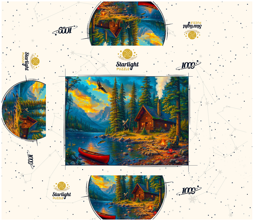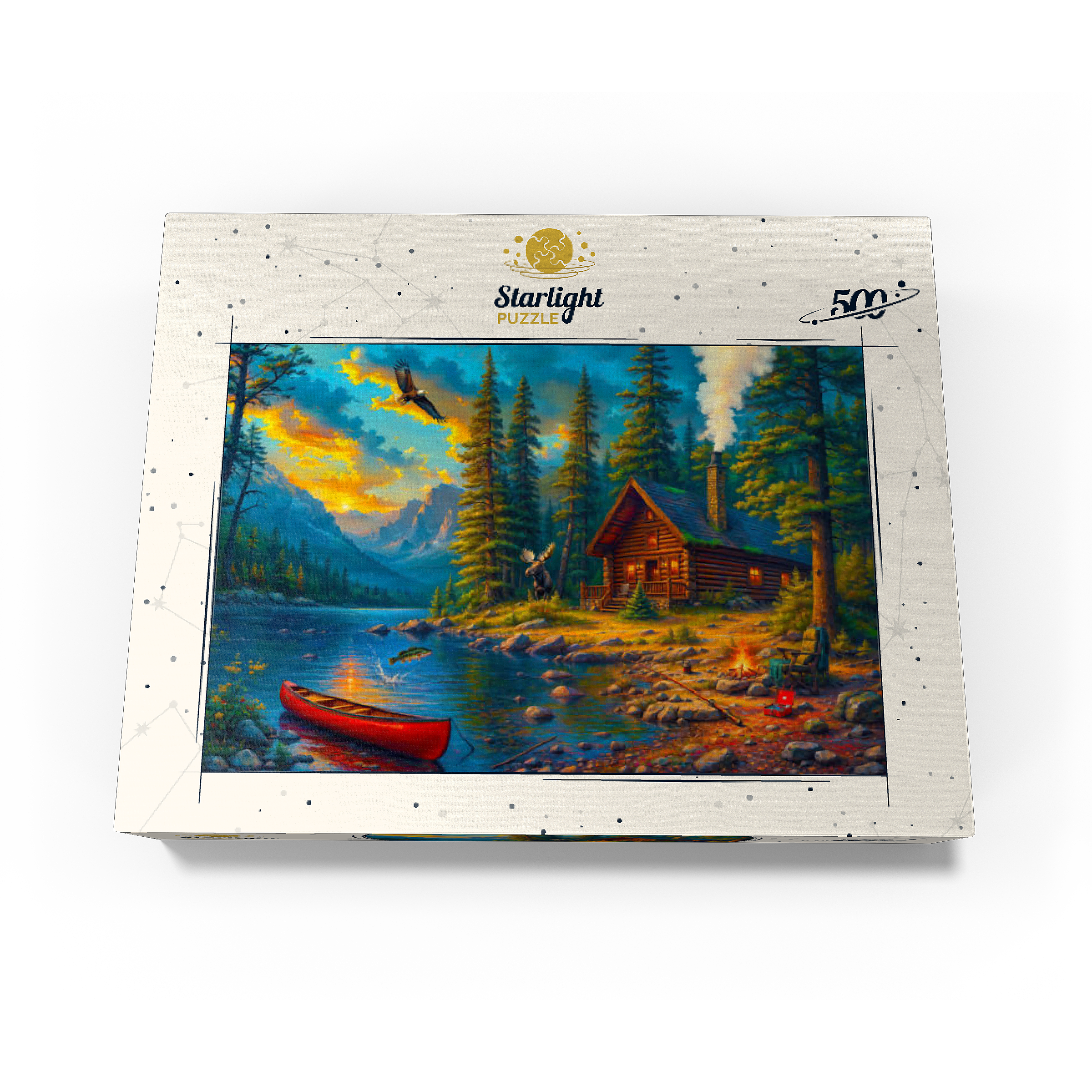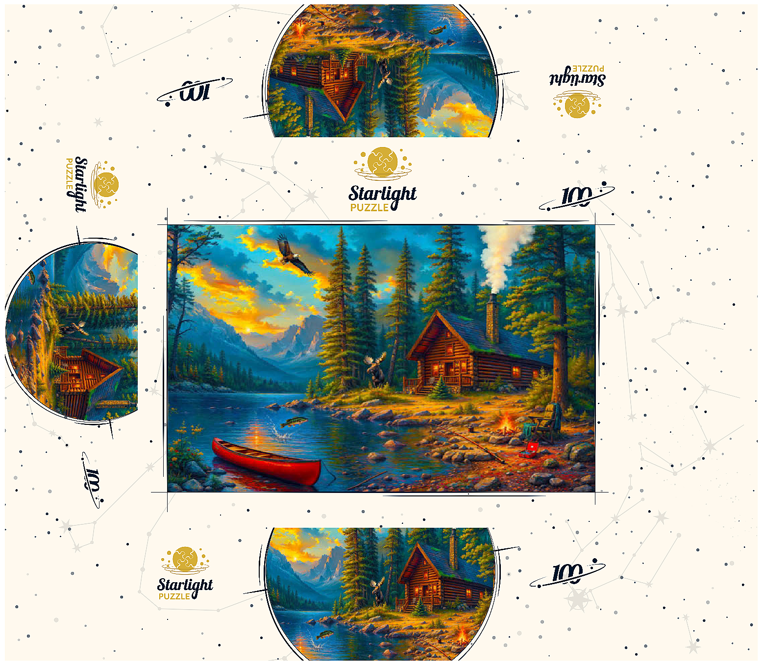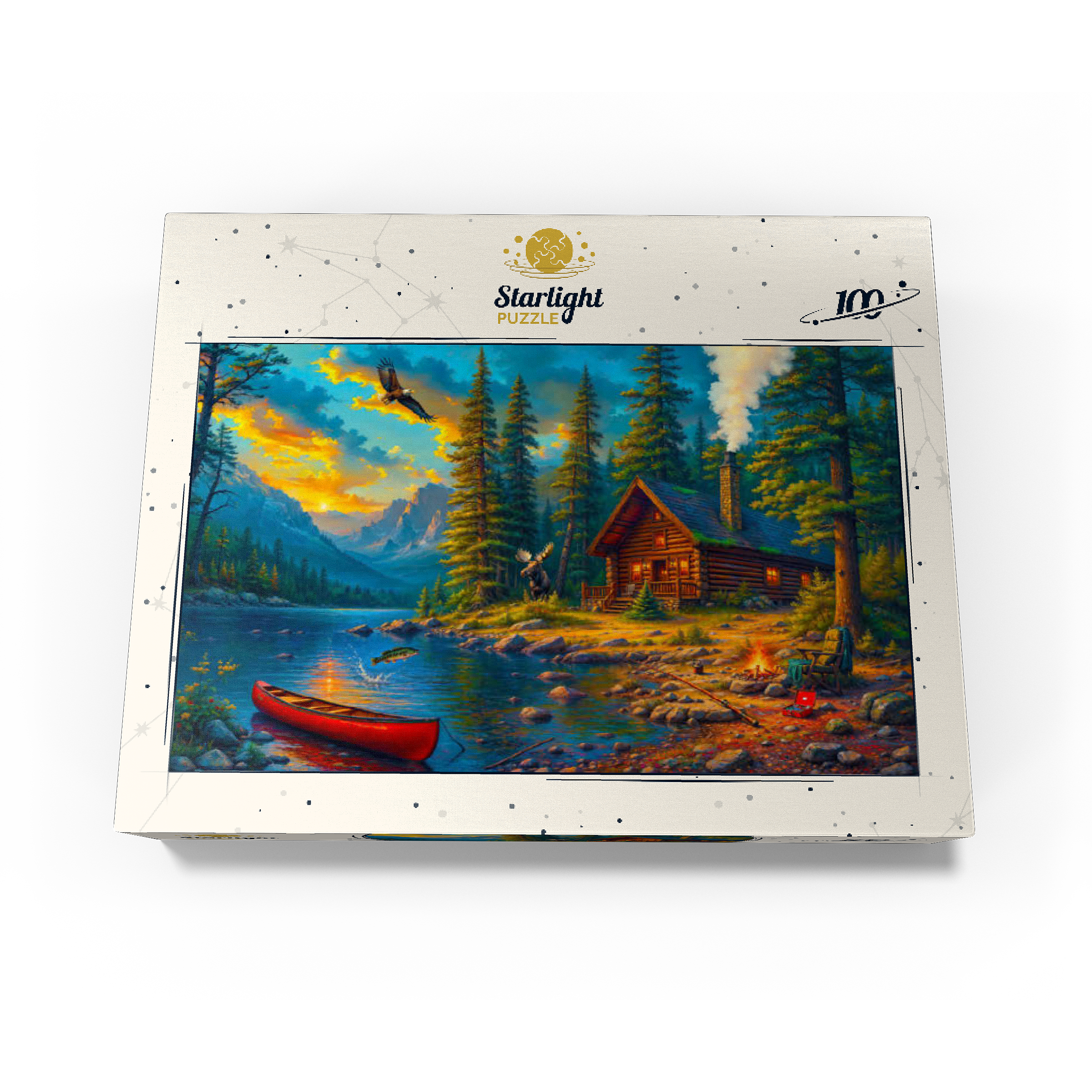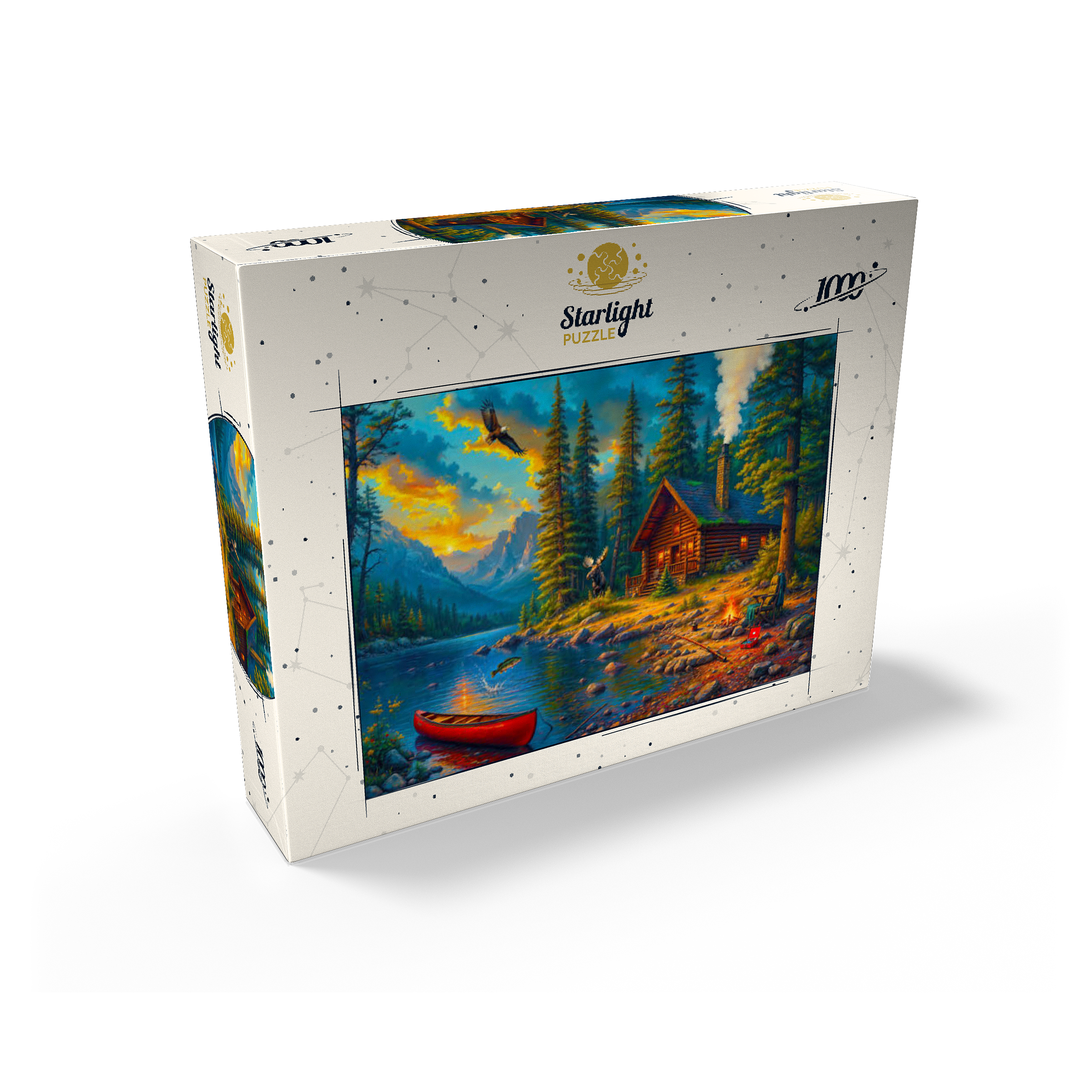 This captivating artwork portrays a tranquil log cabin nestled in a lush pine forest, with warm lights glowing from its windows and smoke rising from the chimney. The scene features a serene mountain lake reflecting the vibrant colors of a sunset, while a red canoe rests by the shore. Wildlife adds life to the setting: a majestic eagle soars above, a moose stands amidst the trees, and a fish leaps joyfully from the water. In the foreground, a cozy campfire and fishing gear invite the viewer into this peaceful wilderness retreat, surrounded by towering peaks and natural beauty.
