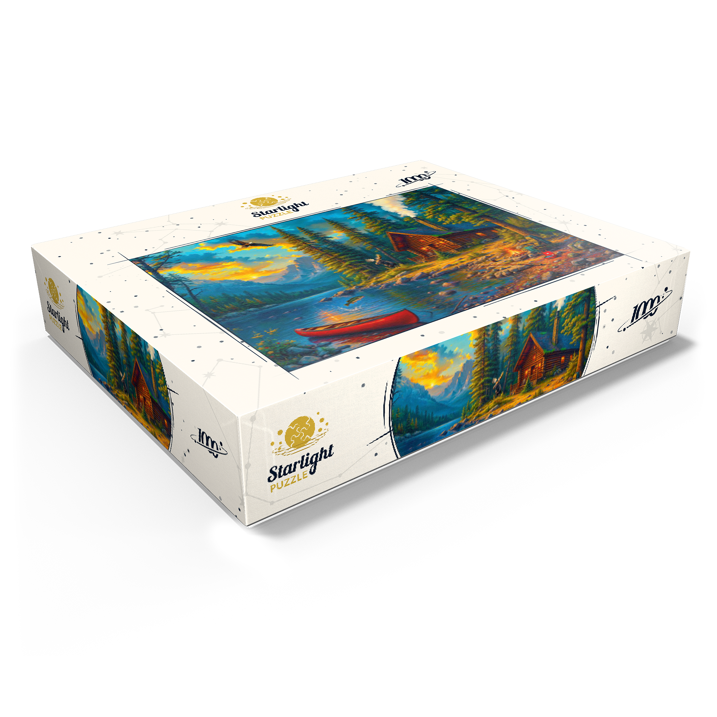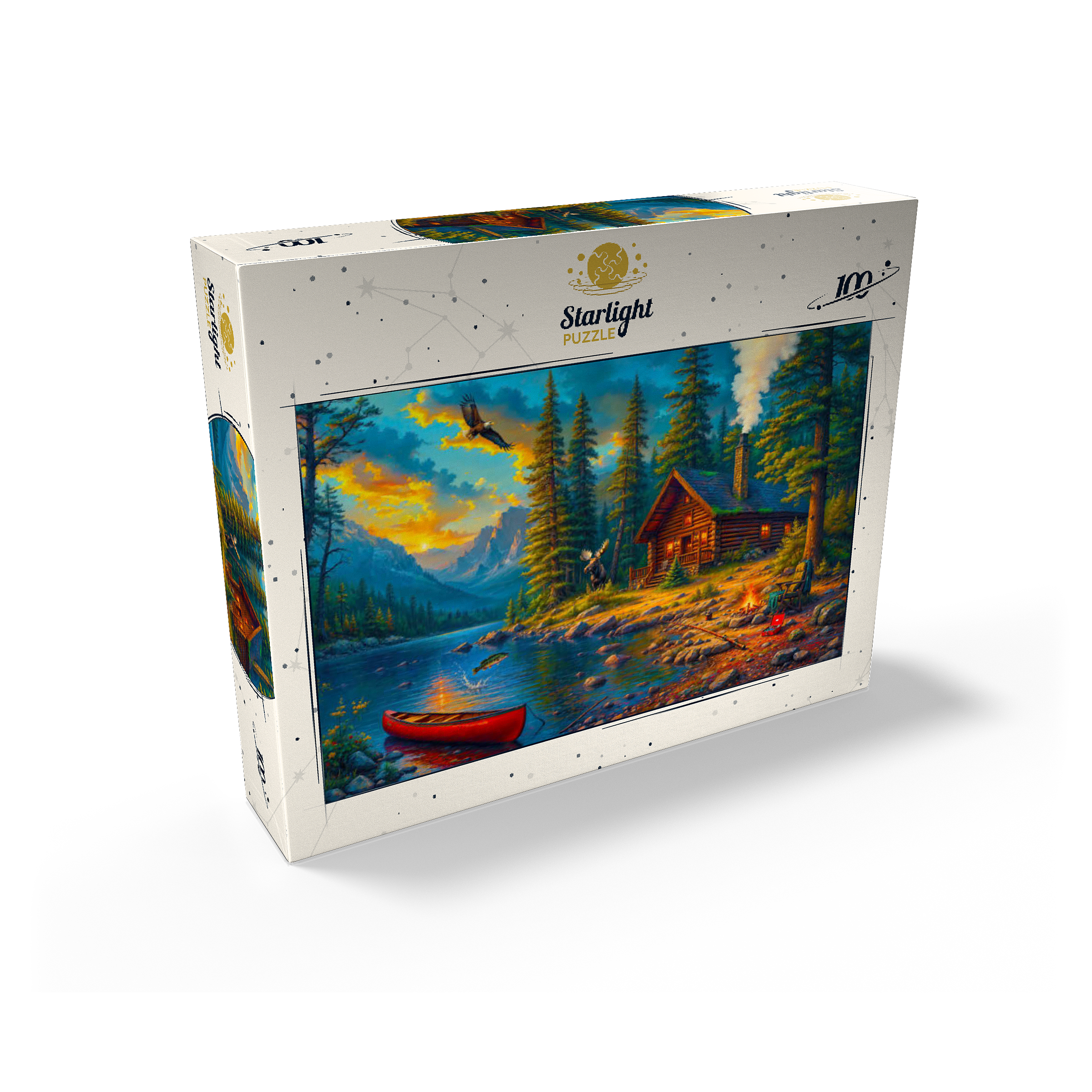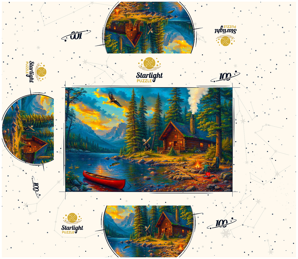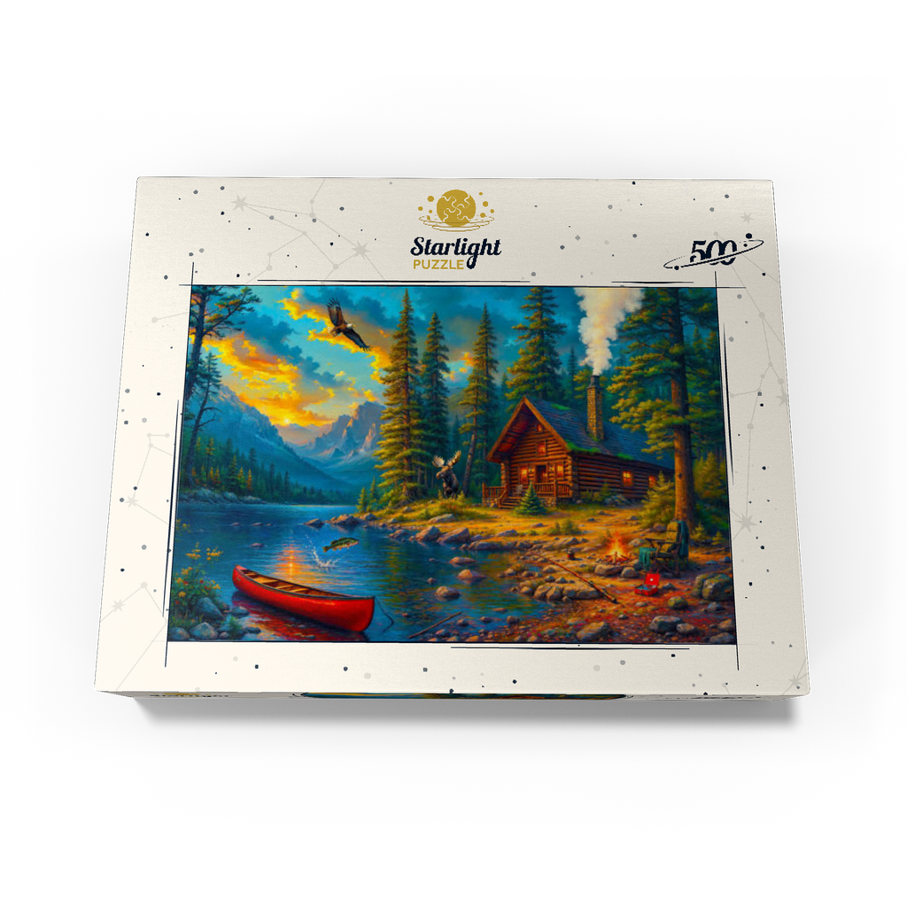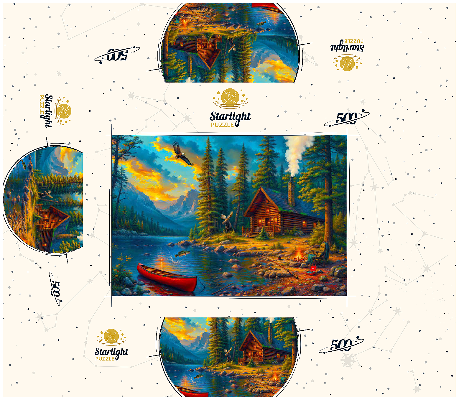 This captivating artwork portrays a tranquil log cabin nestled in a lush pine forest, with warm lights glowing from its windows and smoke rising from the chimney. The scene features a serene mountain lake reflecting the vibrant colors of a sunset, while a red canoe rests by the shore. Wildlife adds life to the setting: a majestic eagle soars above, a moose stands amidst the trees, and a fish leaps joyfully from the water. In the foreground, a cozy campfire and fishing gear invite the viewer into this peaceful wilderness retreat, surrounded by towering peaks and natural beauty.