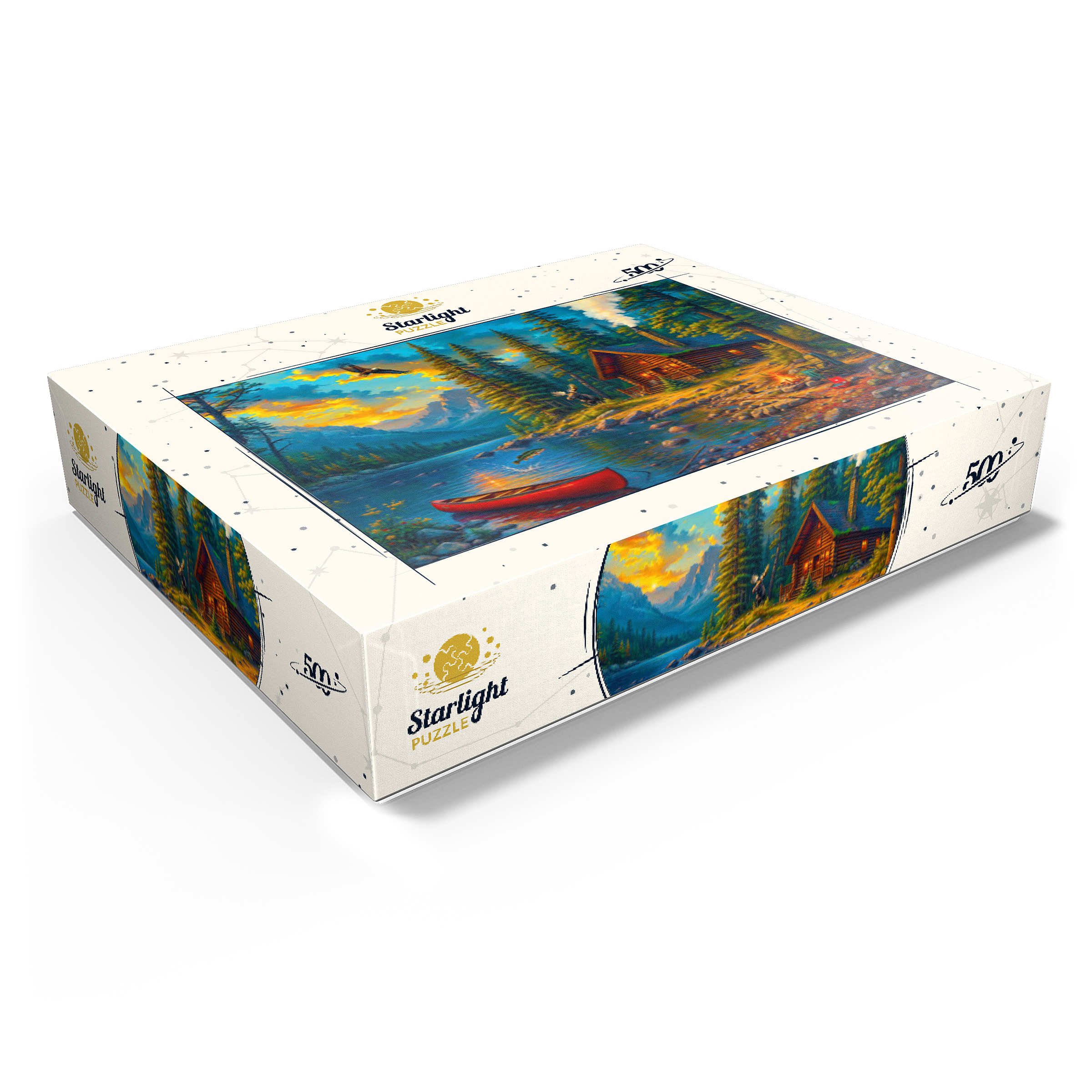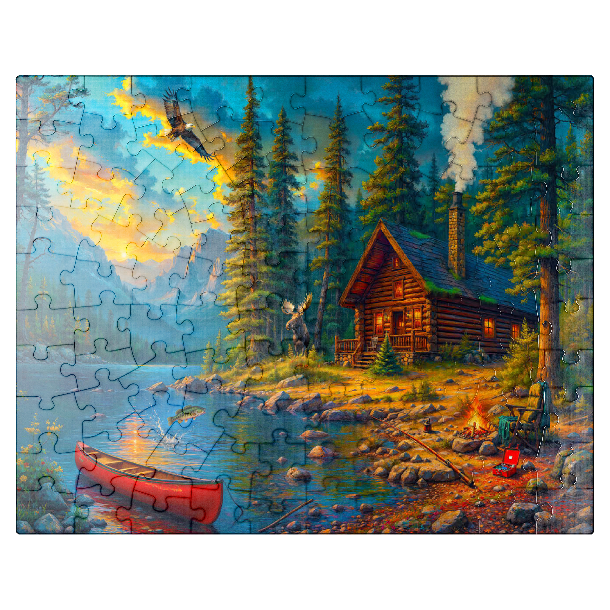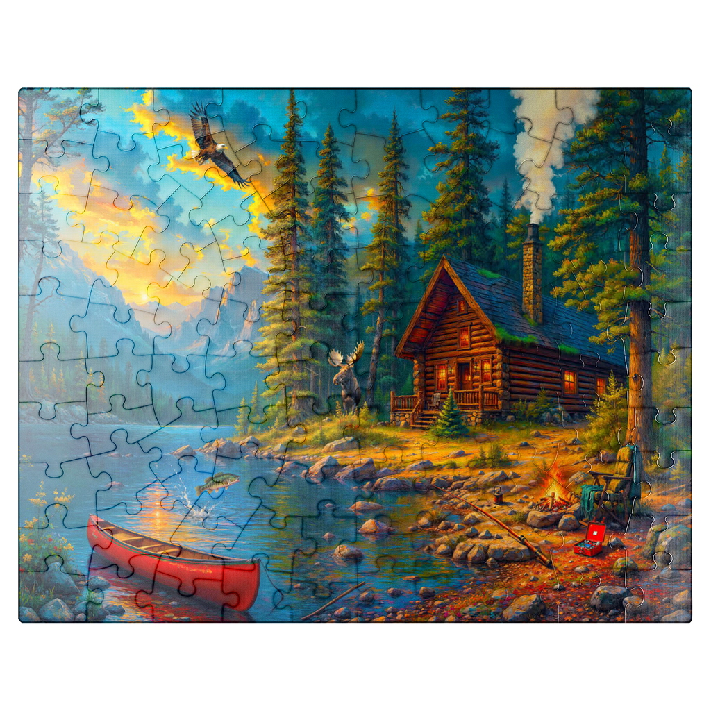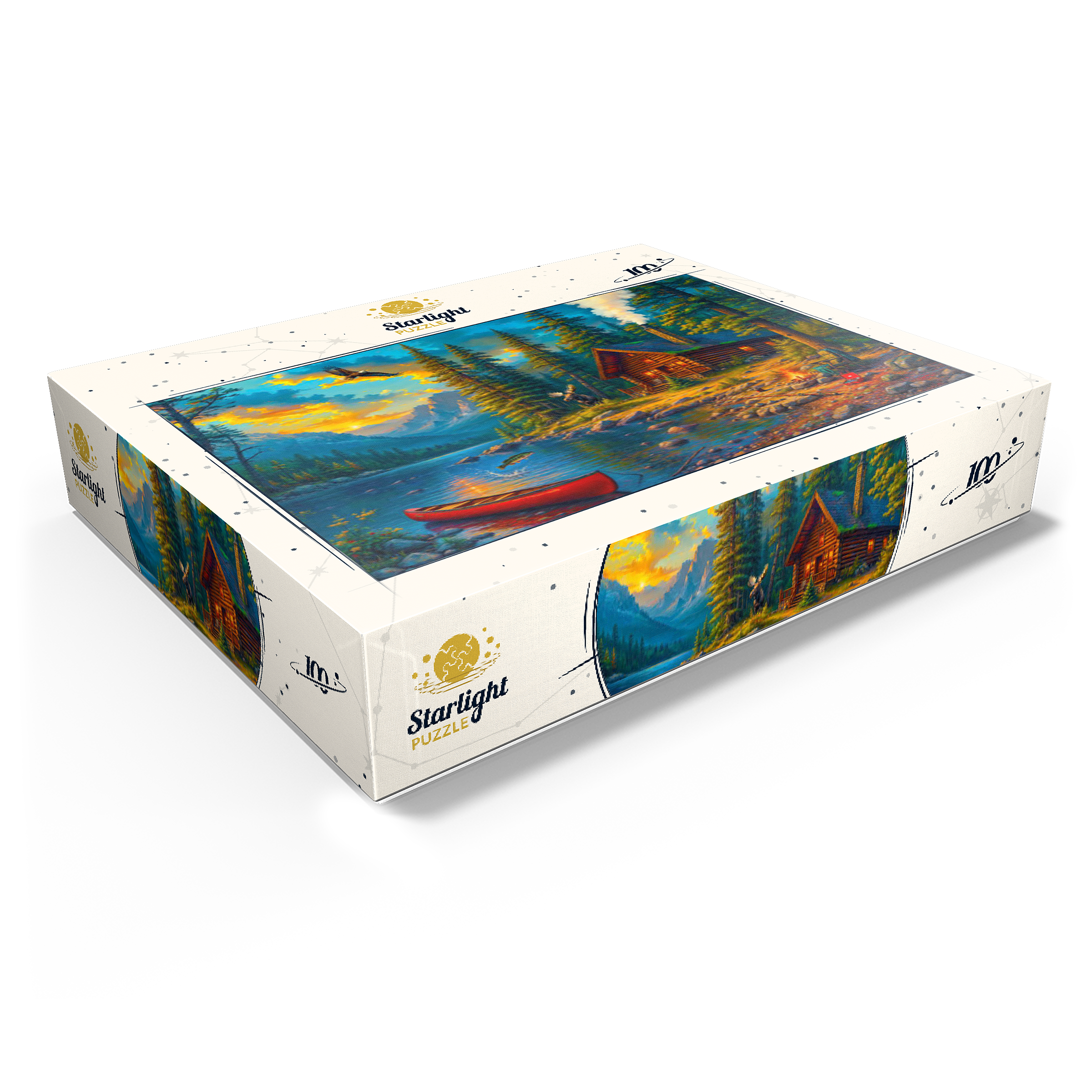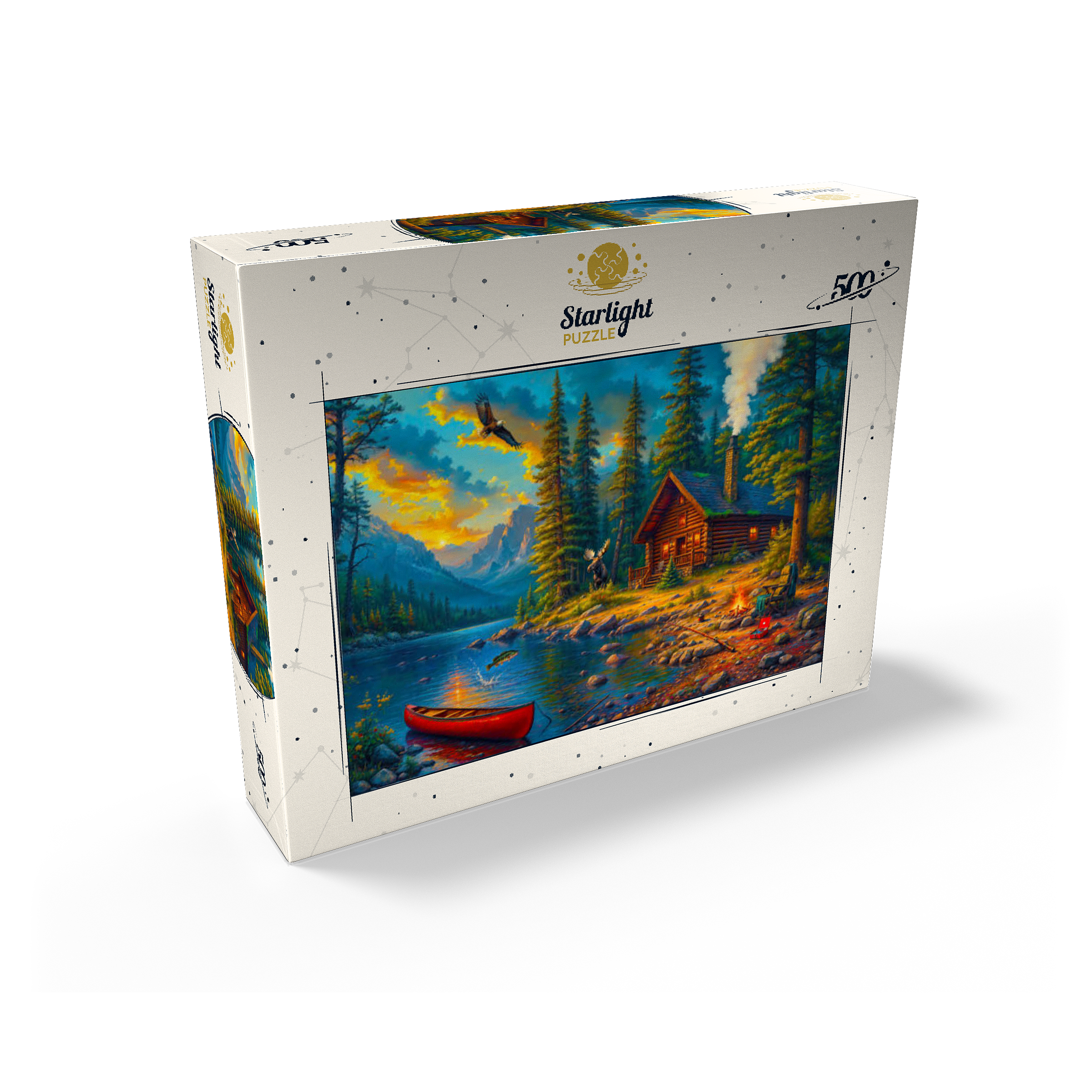 This captivating artwork portrays a tranquil log cabin nestled in a lush pine forest, with warm lights glowing from its windows and smoke rising from the chimney. The scene features a serene mountain lake reflecting the vibrant colors of a sunset, while a red canoe rests by the shore. Wildlife adds life to the setting: a majestic eagle soars above, a moose stands amidst the trees, and a fish leaps joyfully from the water. In the foreground, a cozy campfire and fishing gear invite the viewer into this peaceful wilderness retreat, surrounded by towering peaks and natural beauty.