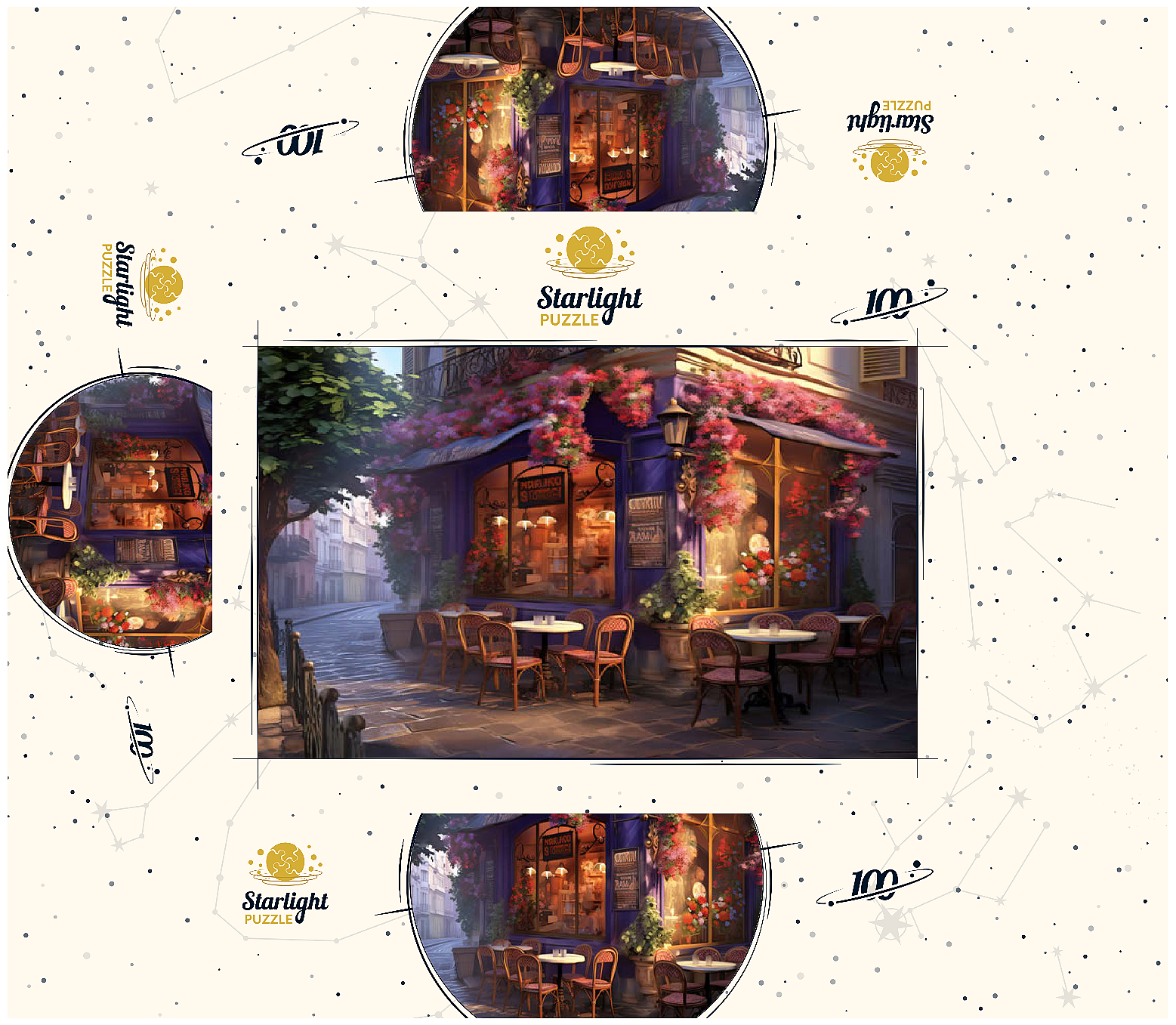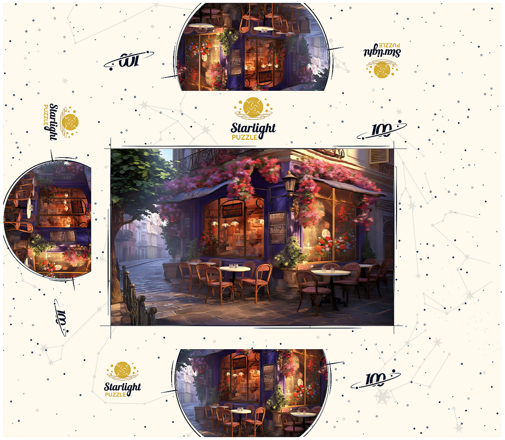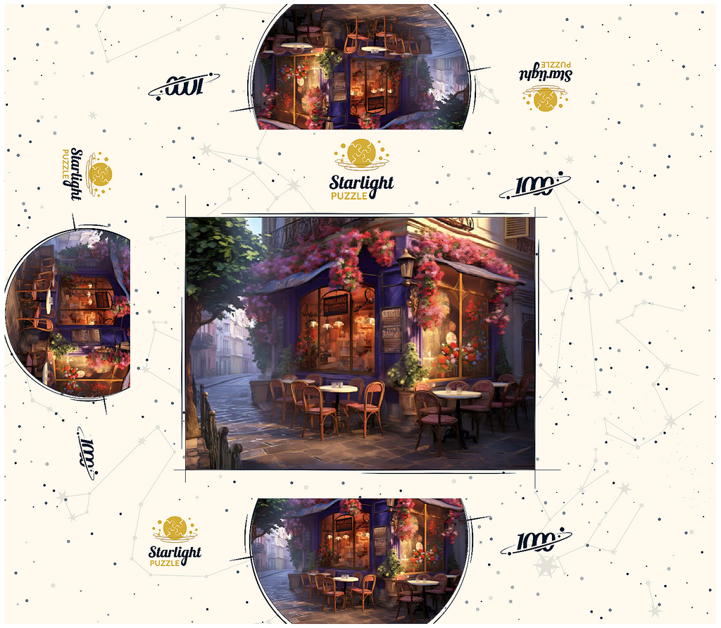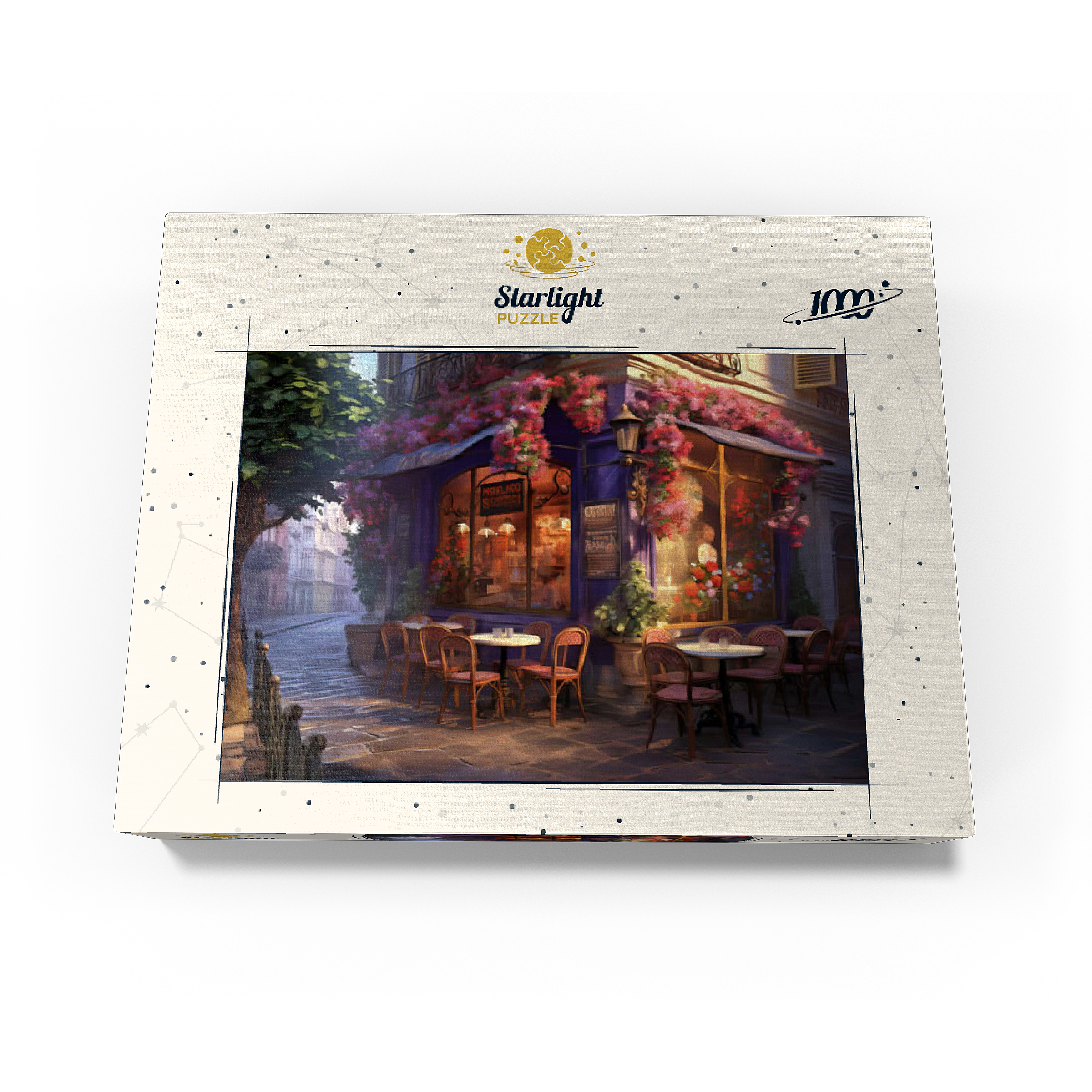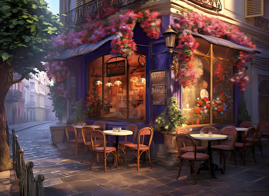 A quaint Parisian café adorned with cascading flowers and a warm, inviting ambiance. the cozy outdoor seating area features elegant chairs and round tables, perfect for enjoying a quiet moment on the cobblestone streets. the café's vibrant purple exterior and golden accents are beautifully complemented by the soft glow of lanterns and natural sunlight. the surrounding architecture, lush greenery, and peaceful atmosphere evoke the timeless romance of a Parisian neighborhood.