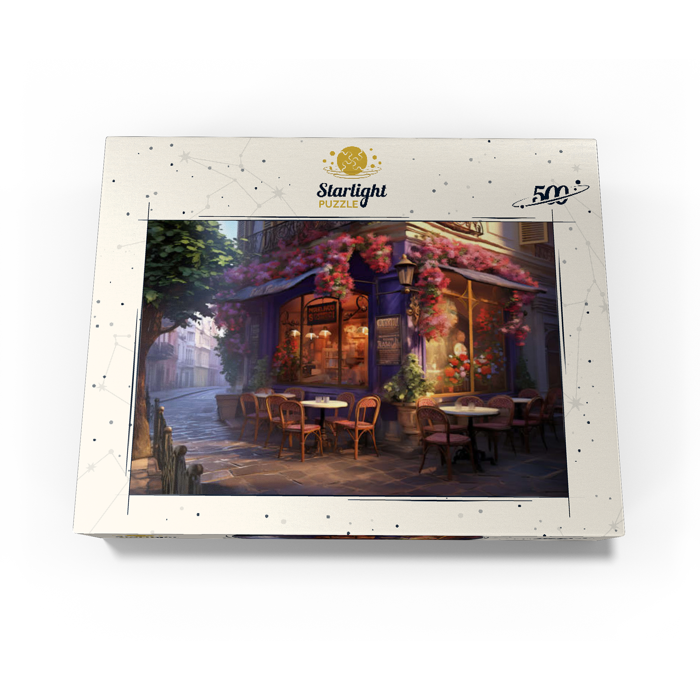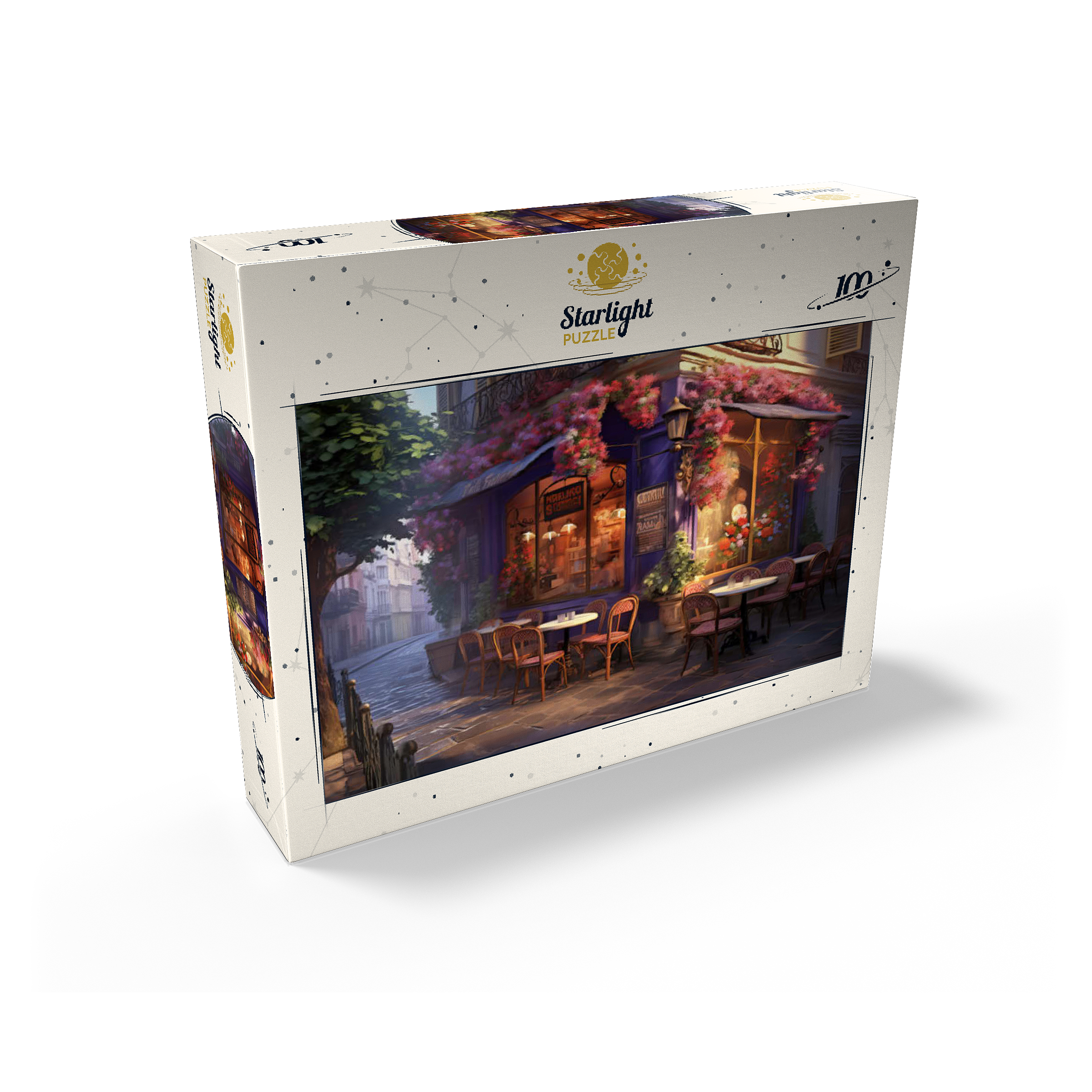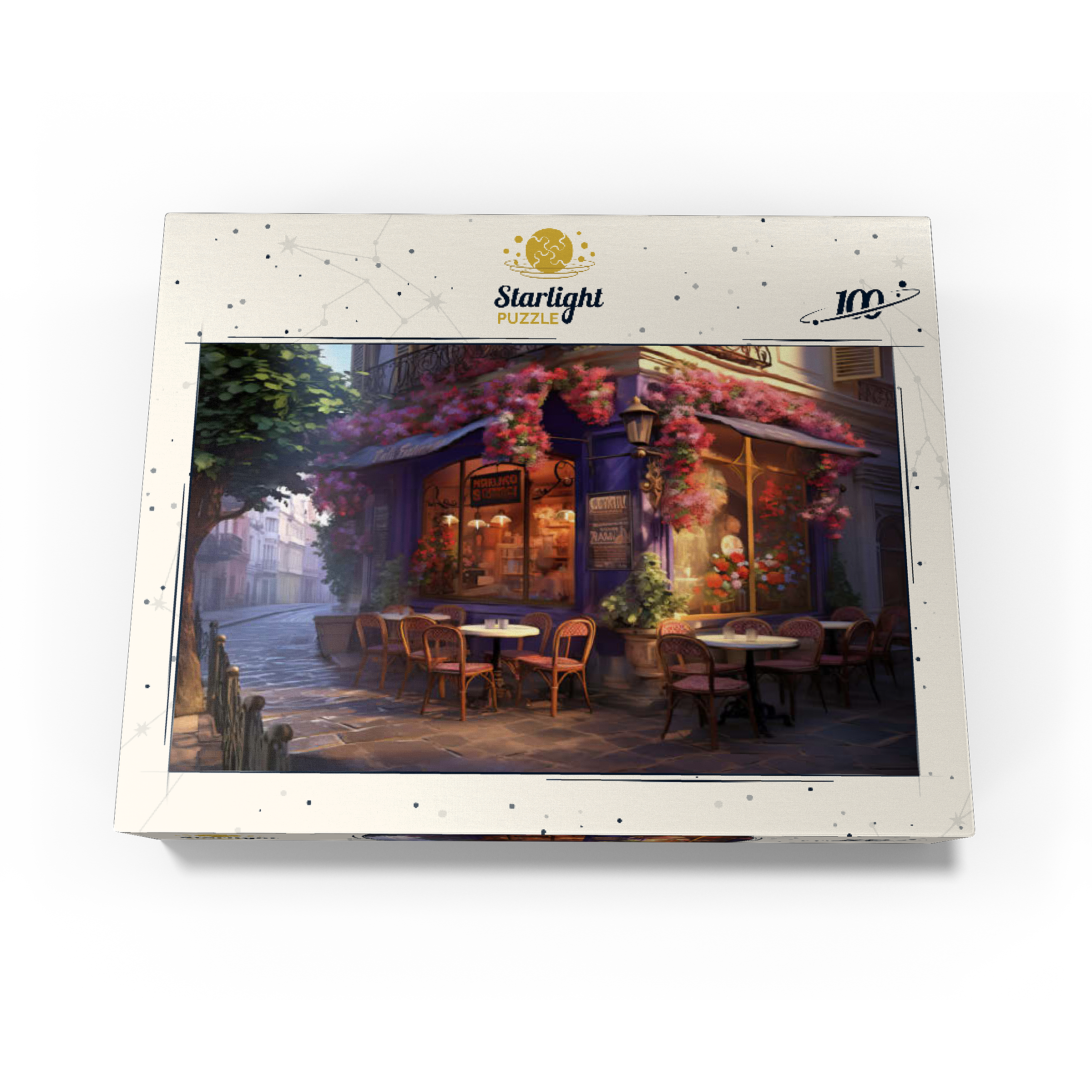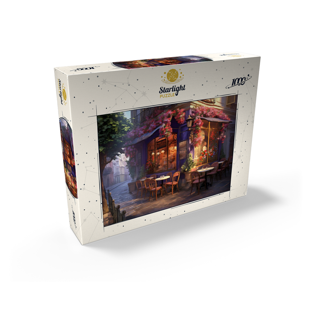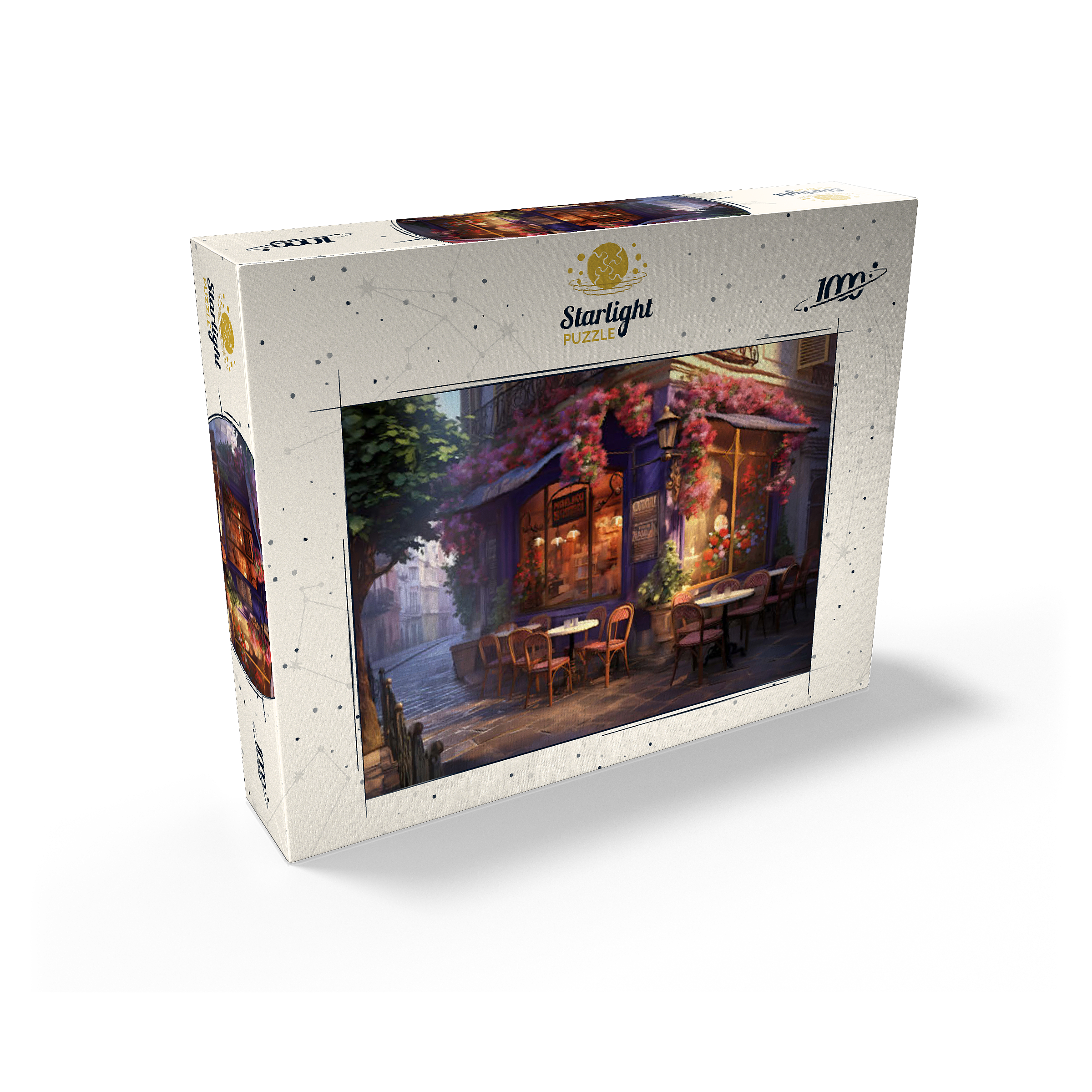 A quaint Parisian café adorned with cascading flowers and a warm, inviting ambiance. the cozy outdoor seating area features elegant chairs and round tables, perfect for enjoying a quiet moment on the cobblestone streets. the café's vibrant purple exterior and golden accents are beautifully complemented by the soft glow of lanterns and natural sunlight. the surrounding architecture, lush greenery, and peaceful atmosphere evoke the timeless romance of a Parisian neighborhood.