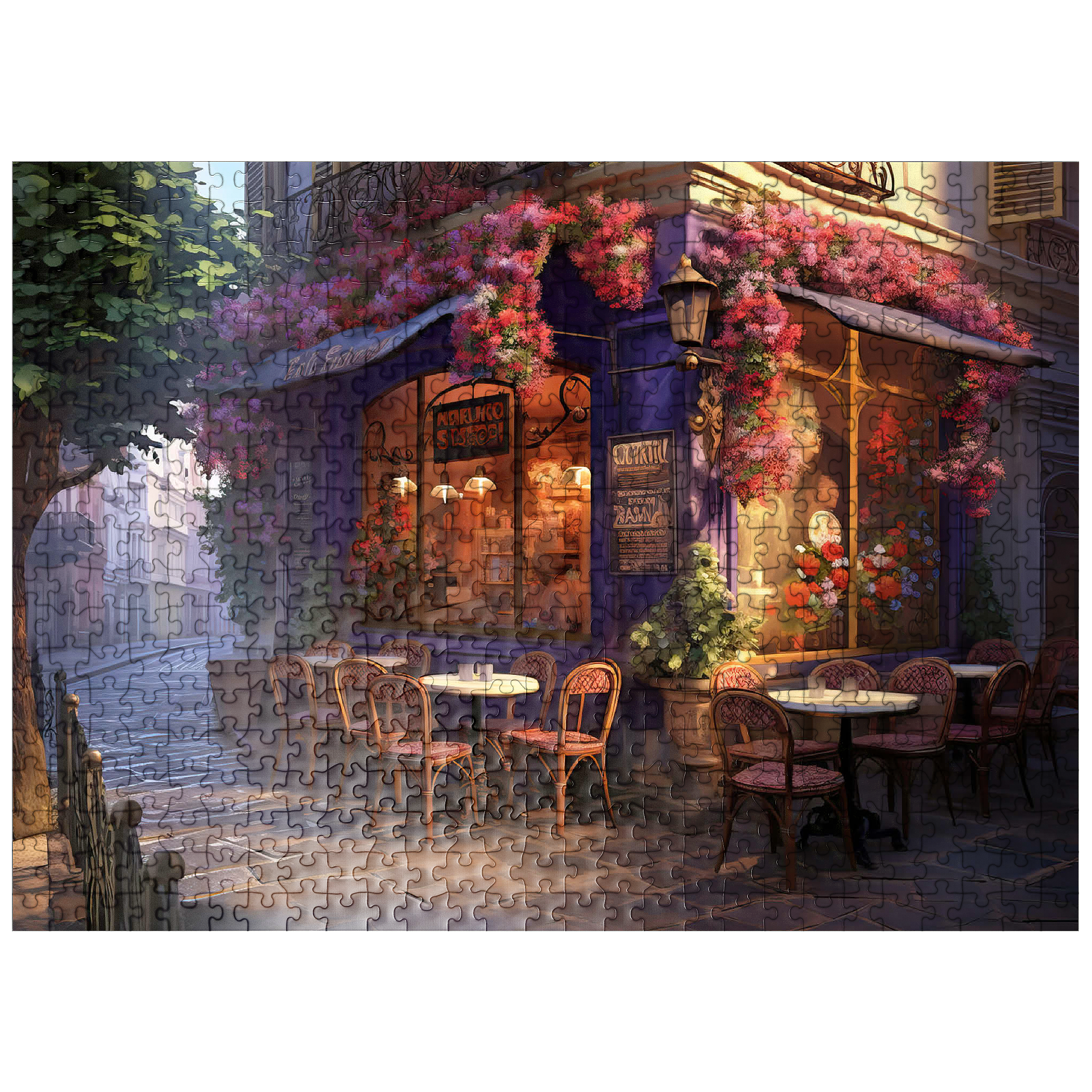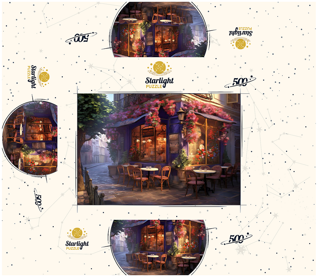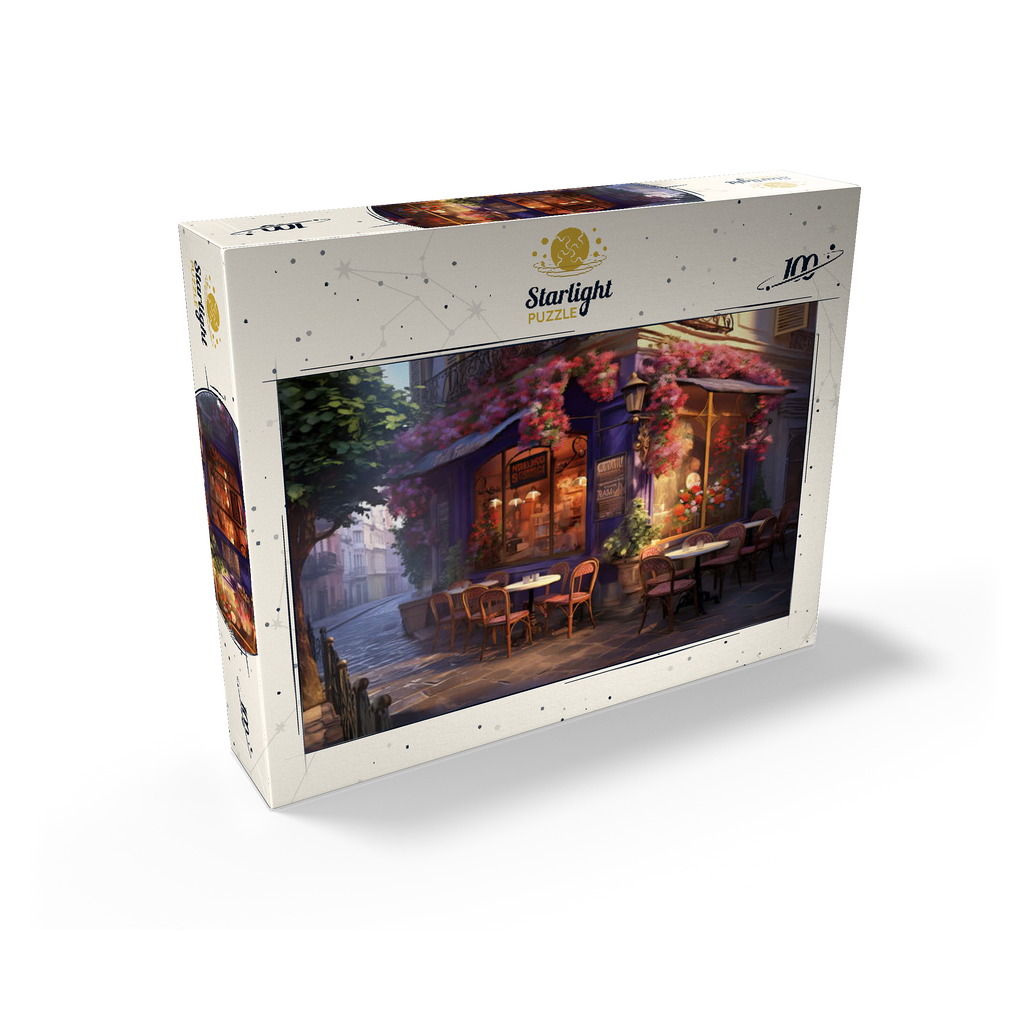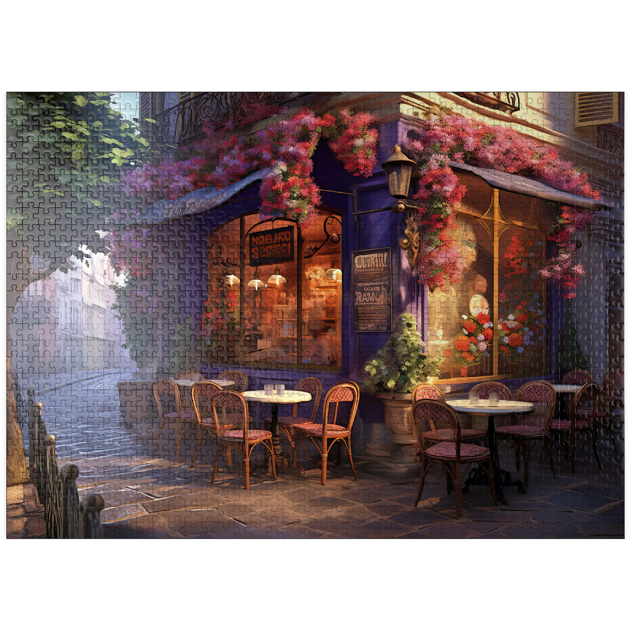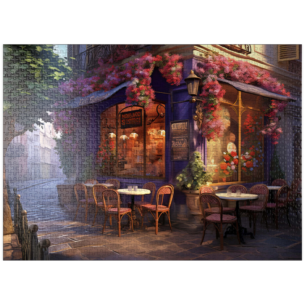 A quaint Parisian café adorned with cascading flowers and a warm, inviting ambiance. the cozy outdoor seating area features elegant chairs and round tables, perfect for enjoying a quiet moment on the cobblestone streets. the café's vibrant purple exterior and golden accents are beautifully complemented by the soft glow of lanterns and natural sunlight. the surrounding architecture, lush greenery, and peaceful atmosphere evoke the timeless romance of a Parisian neighborhood.