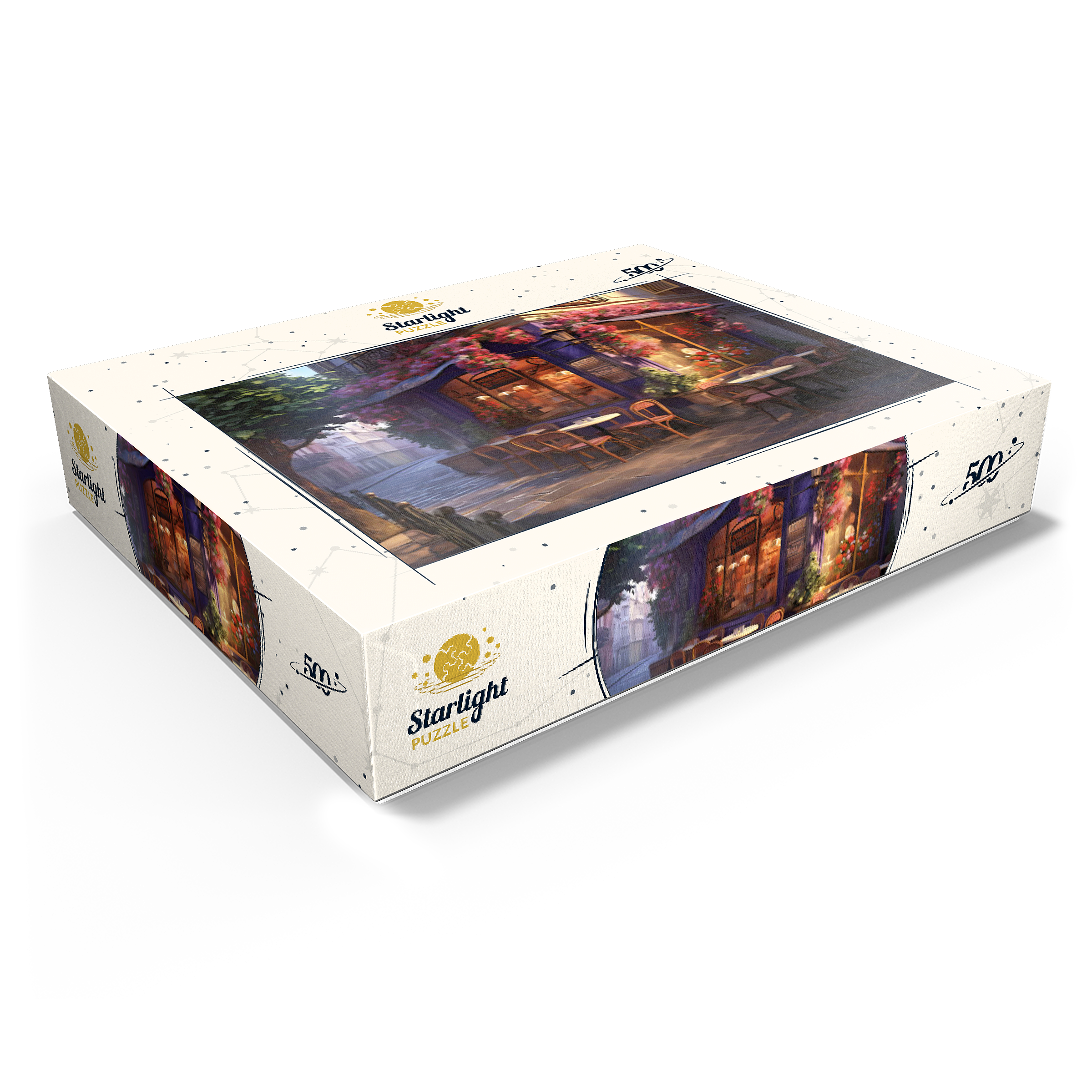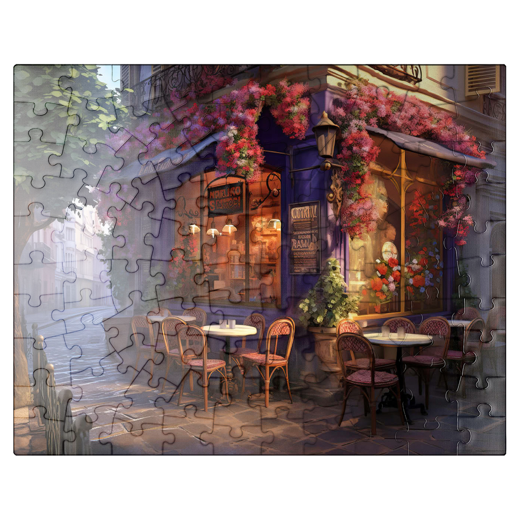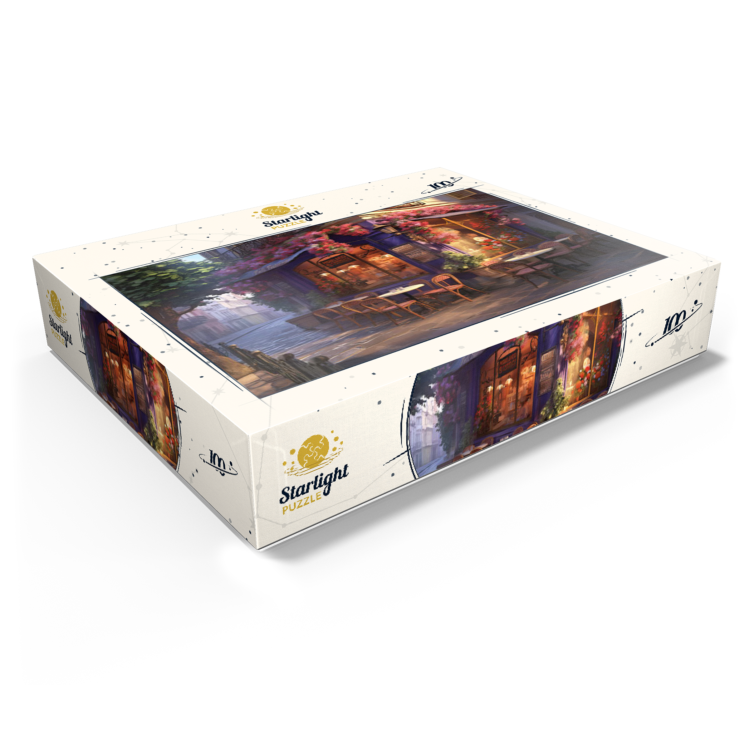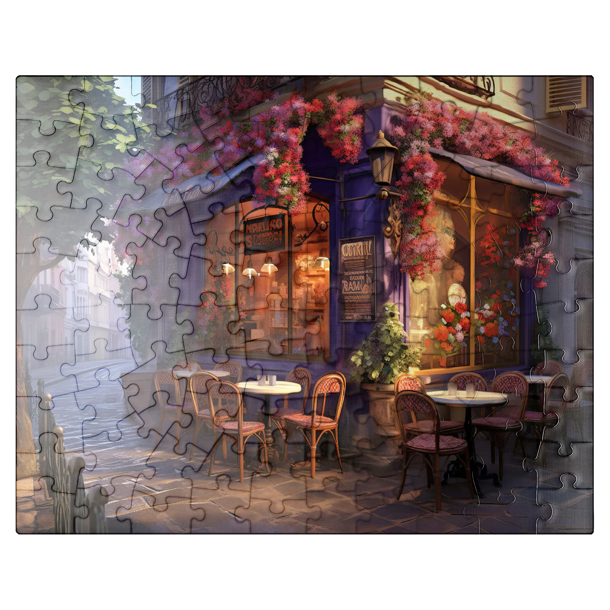 A quaint Parisian café adorned with cascading flowers and a warm, inviting ambiance. the cozy outdoor seating area features elegant chairs and round tables, perfect for enjoying a quiet moment on the cobblestone streets. the café's vibrant purple exterior and golden accents are beautifully complemented by the soft glow of lanterns and natural sunlight. the surrounding architecture, lush greenery, and peaceful atmosphere evoke the timeless romance of a Parisian neighborhood.