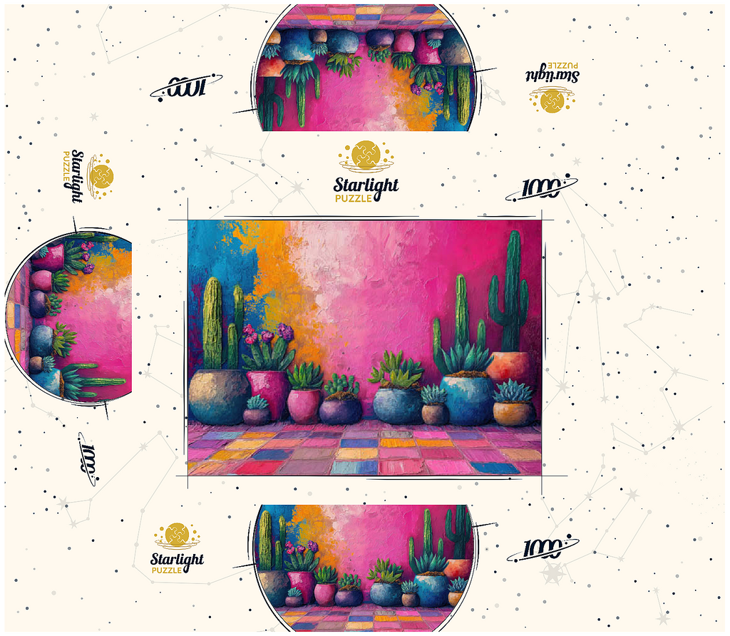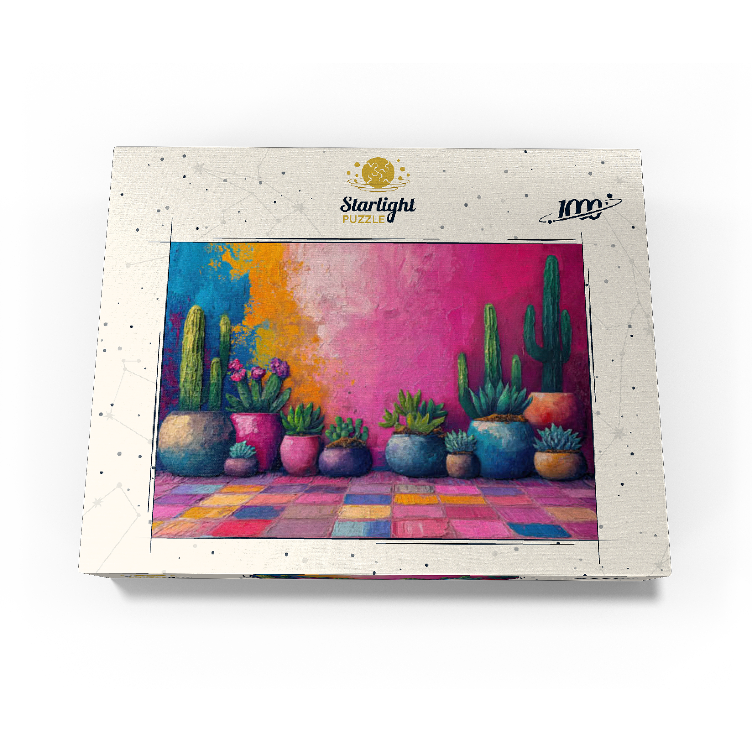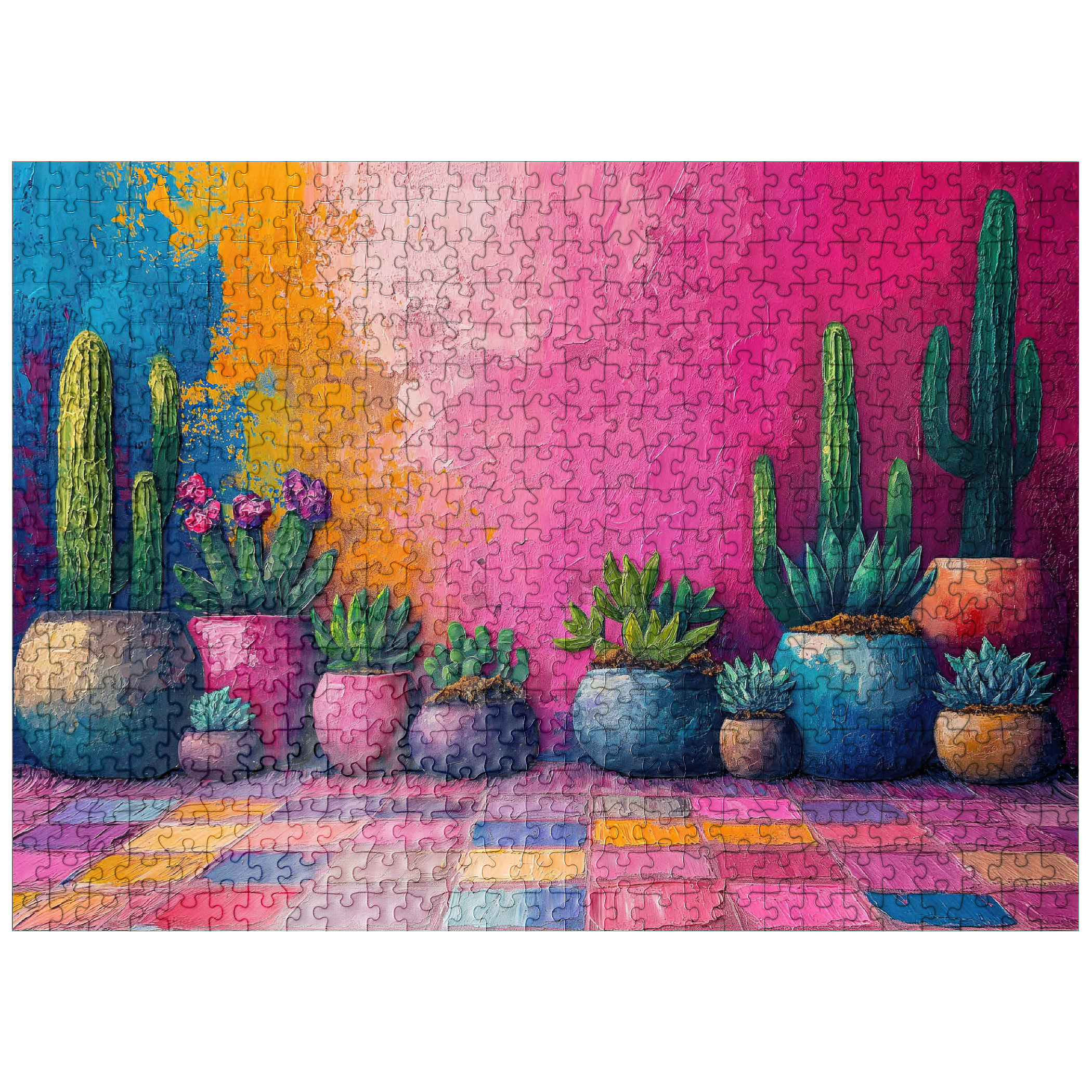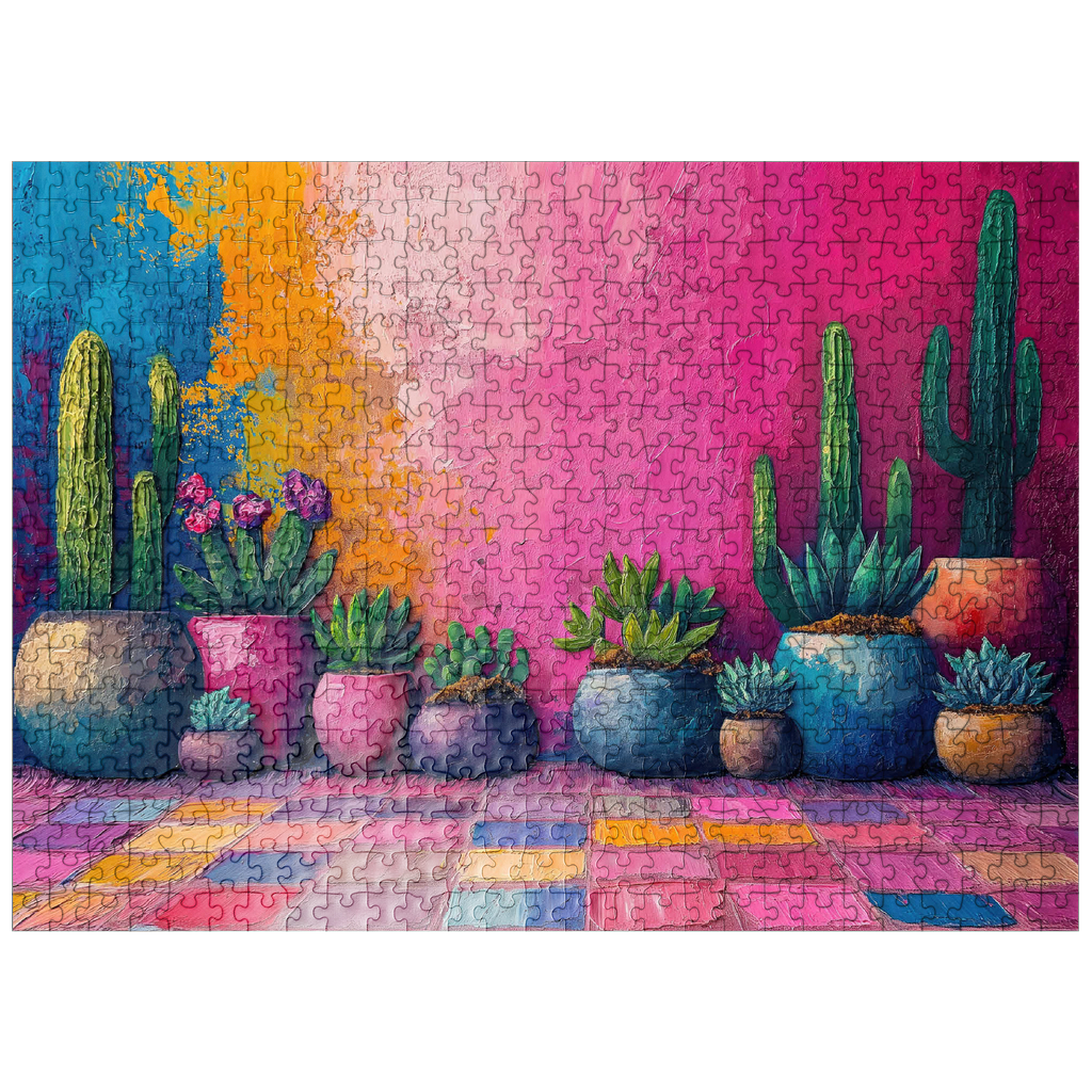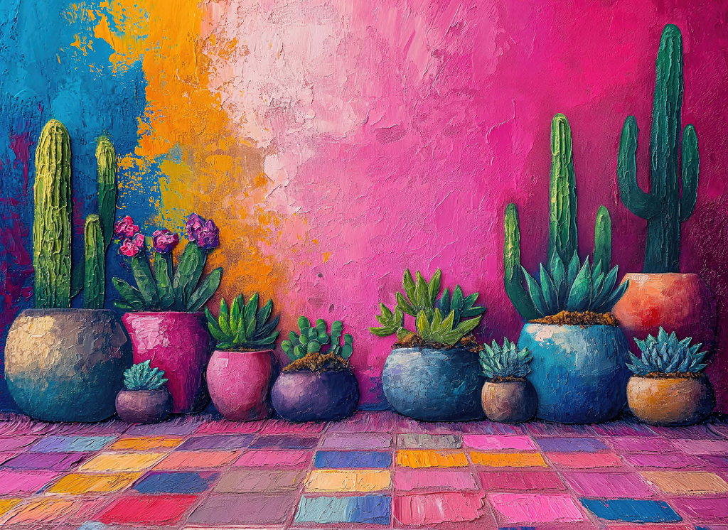 A vibrant and textured painting featuring an array of cacti and succulents in uniquely designed pots, set against a striking pink, orange, and blue gradient wall. The bold, lively colors create a cheerful and artistic atmosphere, while the potted plants showcase diverse shapes and textures. The tiled floor, painted in a patchwork of multicolored hues, adds depth and personality to the scene. This artwork is a celebration of desert plants and modern decor, perfect for lovers of bold and colorful design.