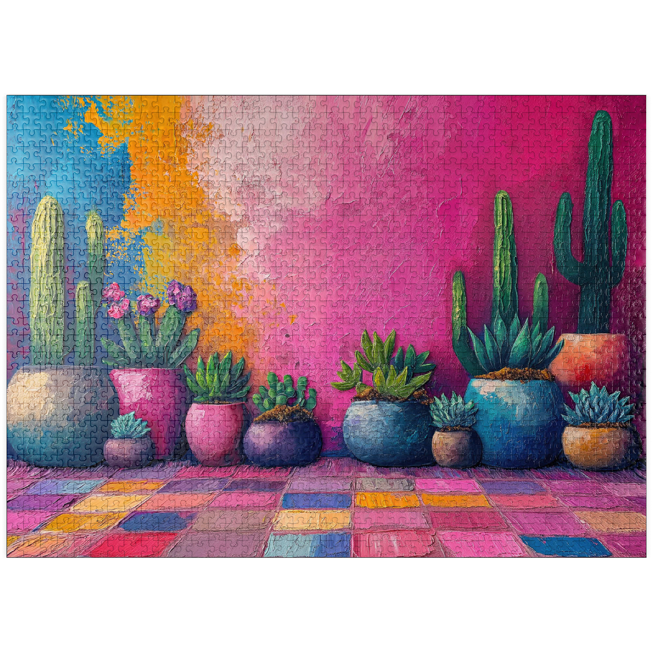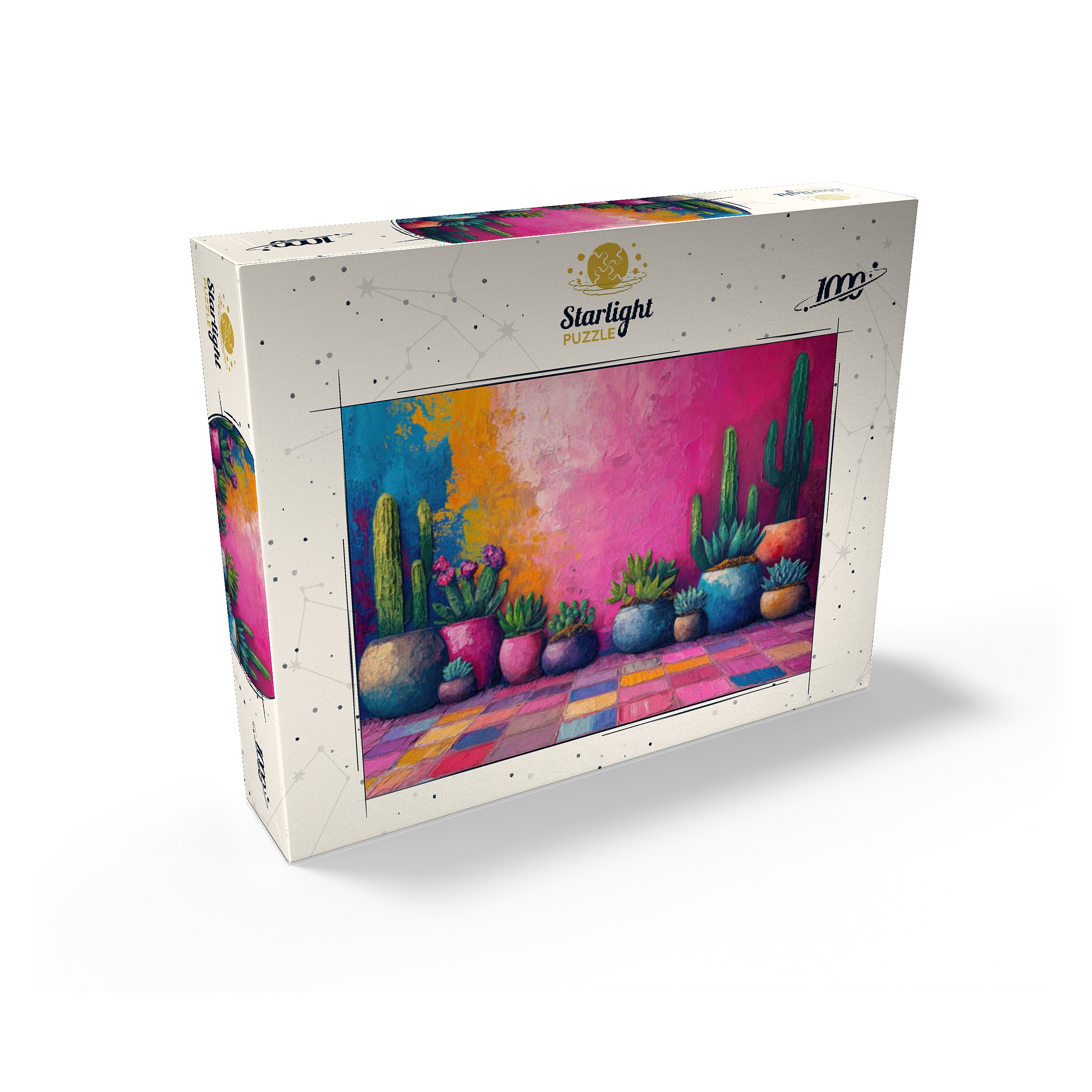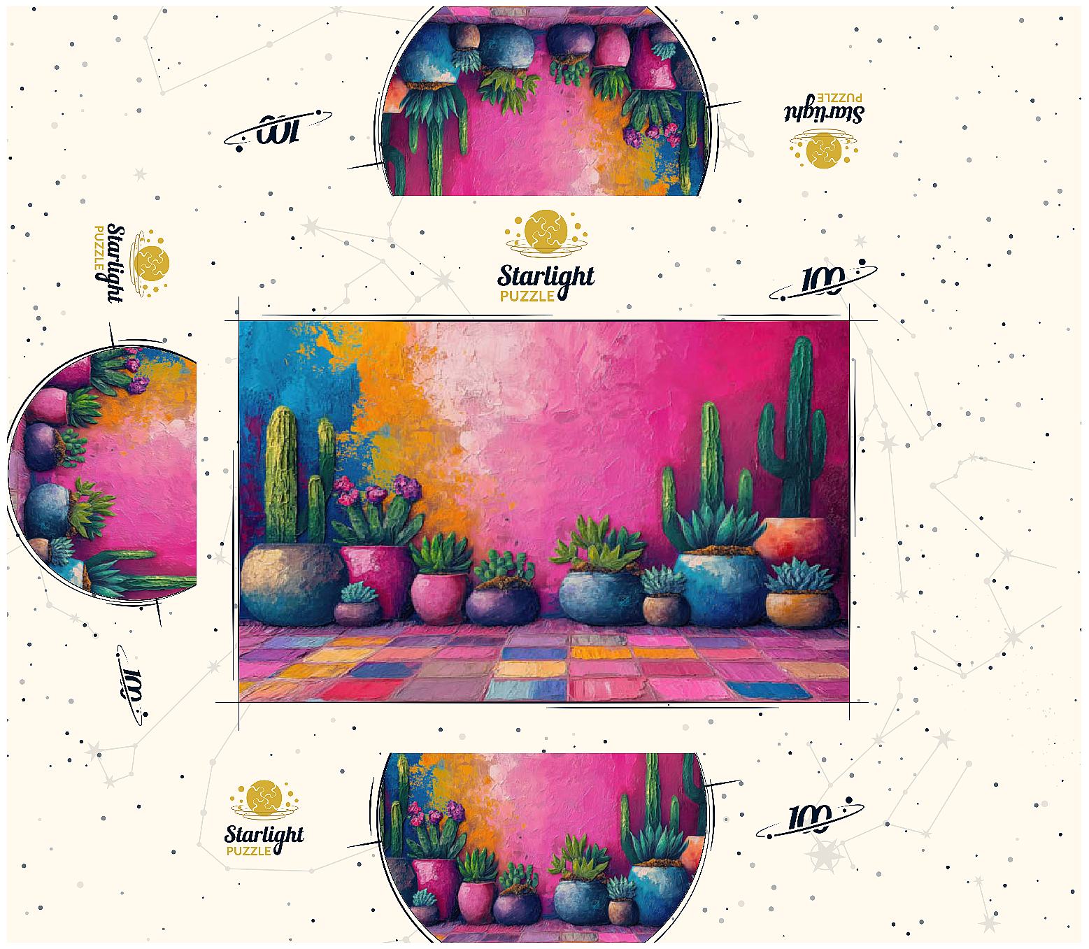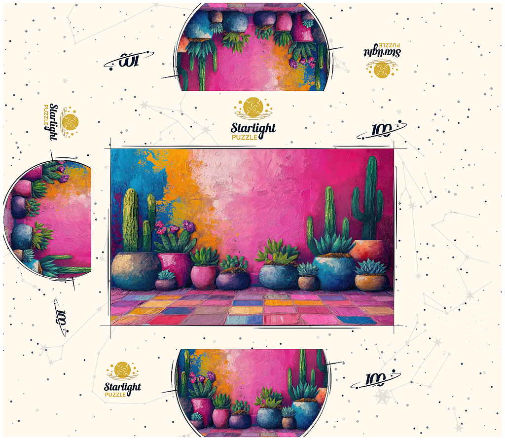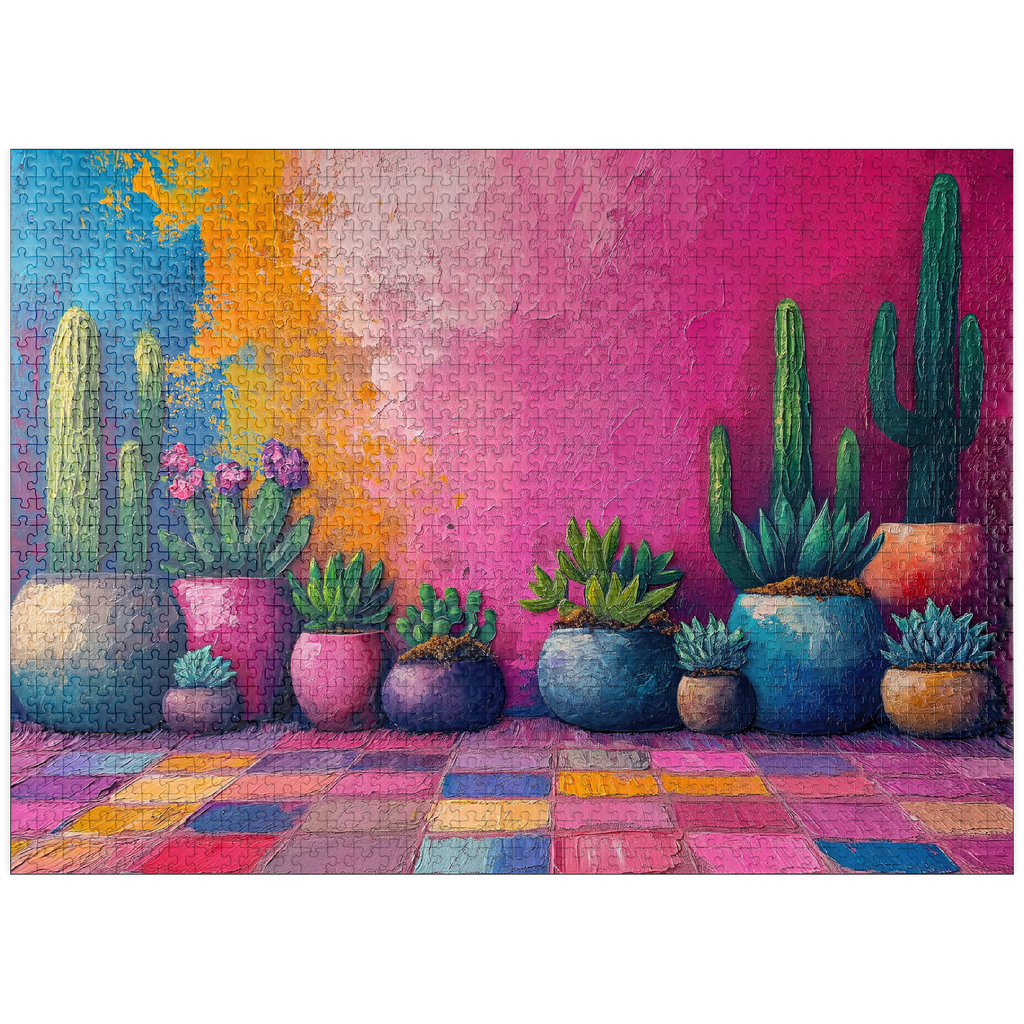 A vibrant and textured painting featuring an array of cacti and succulents in uniquely designed pots, set against a striking pink, orange, and blue gradient wall. The bold, lively colors create a cheerful and artistic atmosphere, while the potted plants showcase diverse shapes and textures. The tiled floor, painted in a patchwork of multicolored hues, adds depth and personality to the scene. This artwork is a celebration of desert plants and modern decor, perfect for lovers of bold and colorful design.
