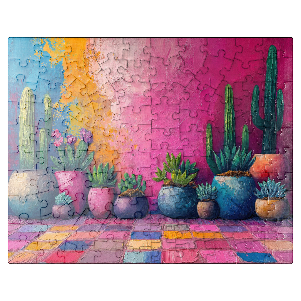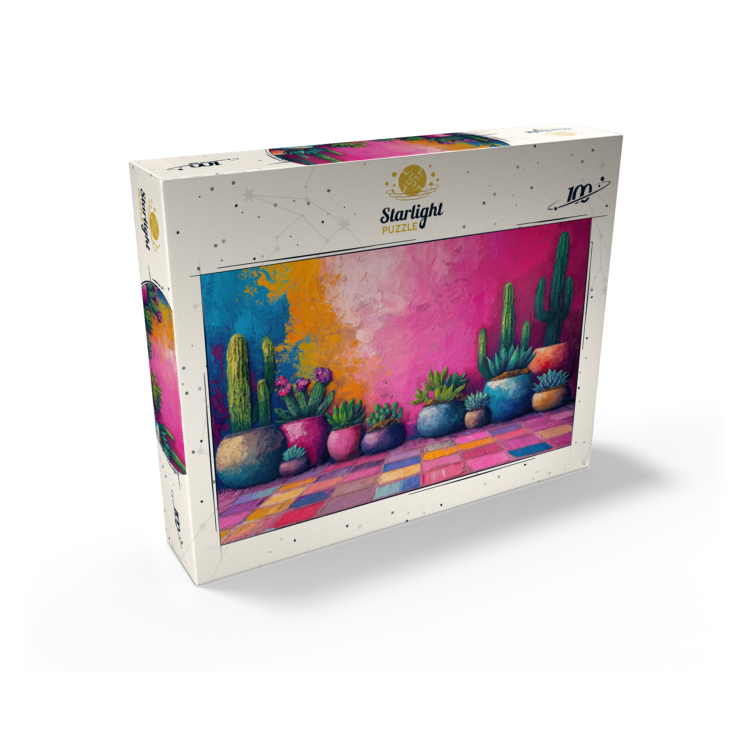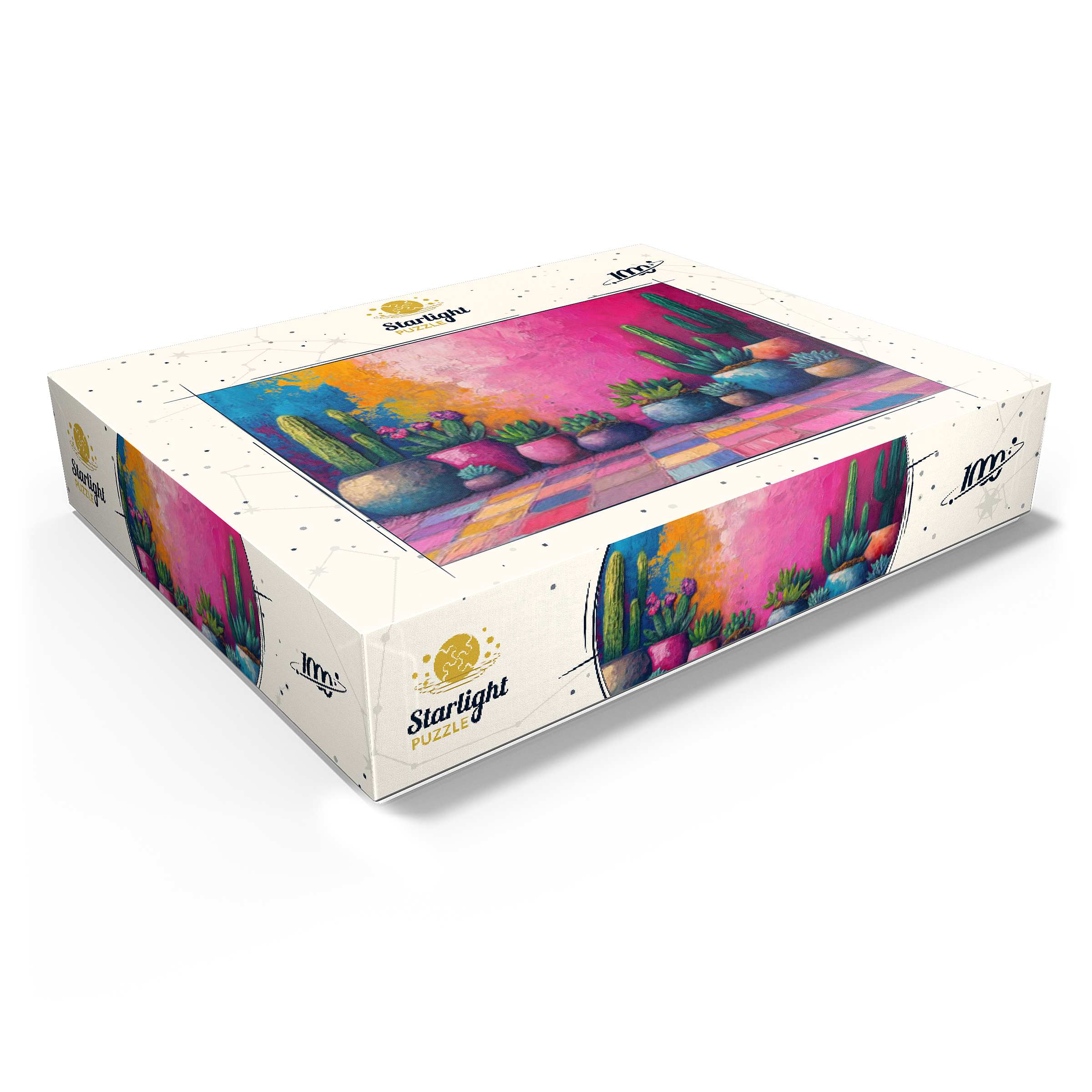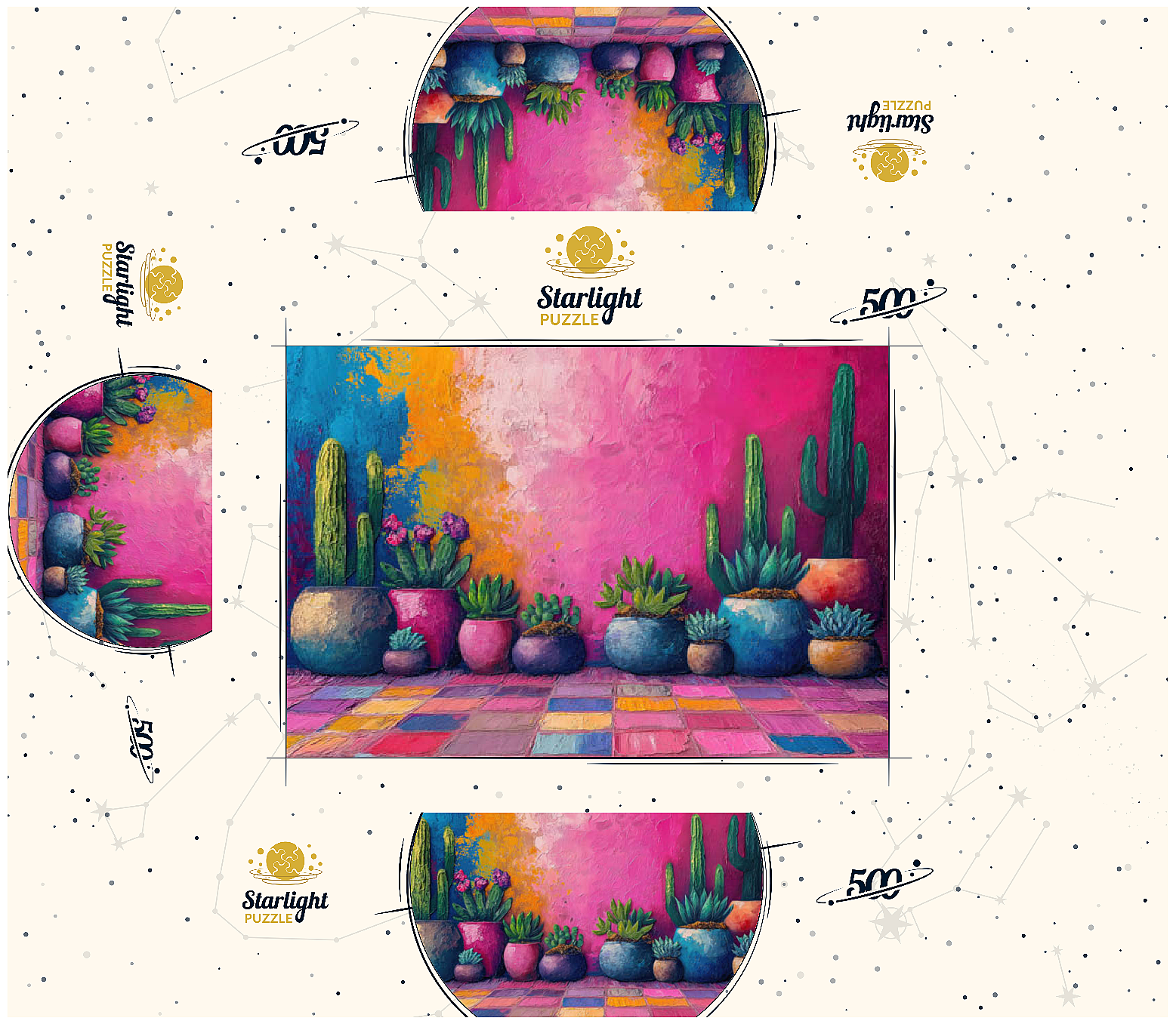 A vibrant and textured painting featuring an array of cacti and succulents in uniquely designed pots, set against a striking pink, orange, and blue gradient wall. The bold, lively colors create a cheerful and artistic atmosphere, while the potted plants showcase diverse shapes and textures. The tiled floor, painted in a patchwork of multicolored hues, adds depth and personality to the scene. This artwork is a celebration of desert plants and modern decor, perfect for lovers of bold and colorful design.