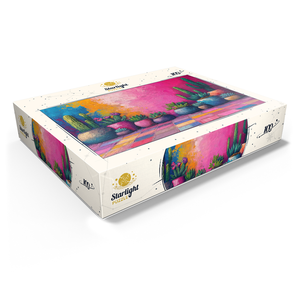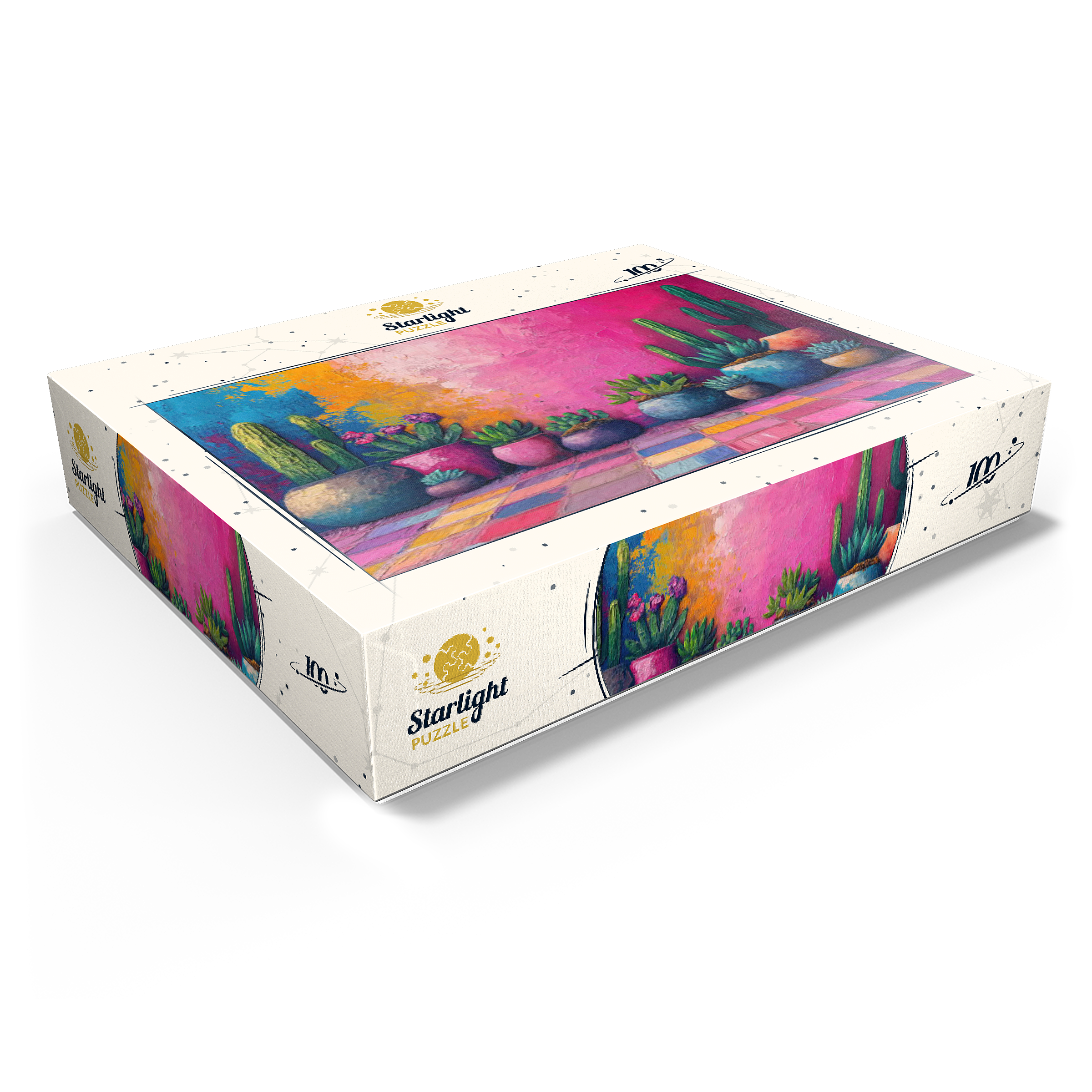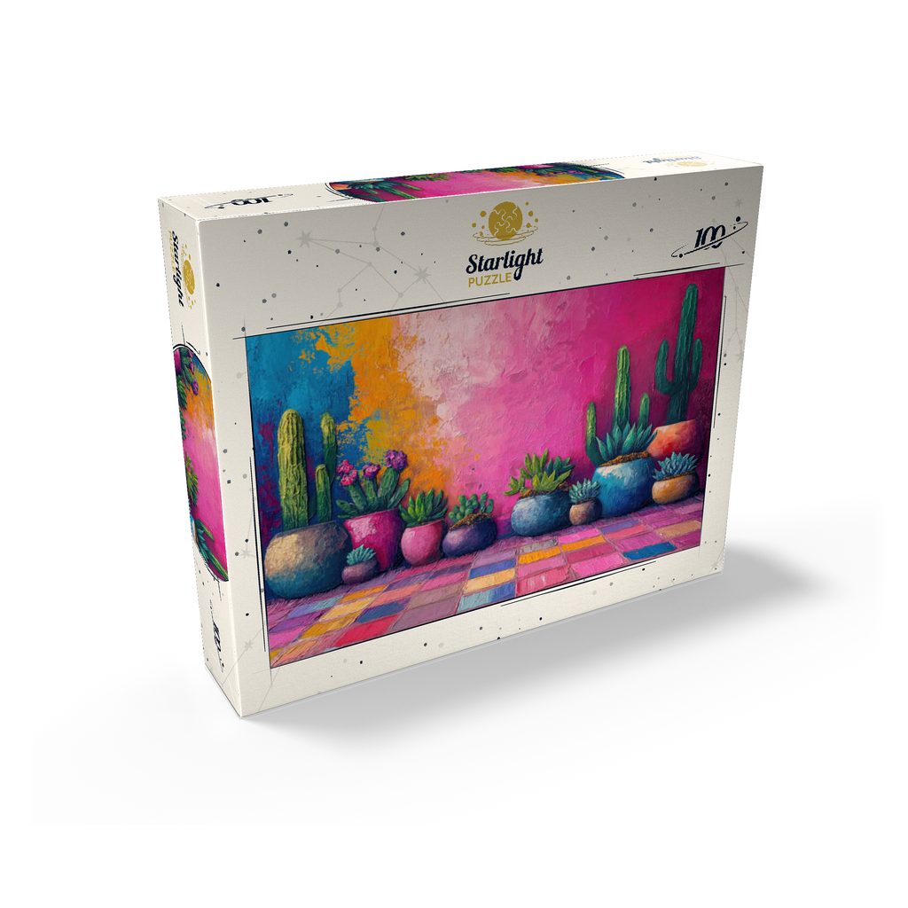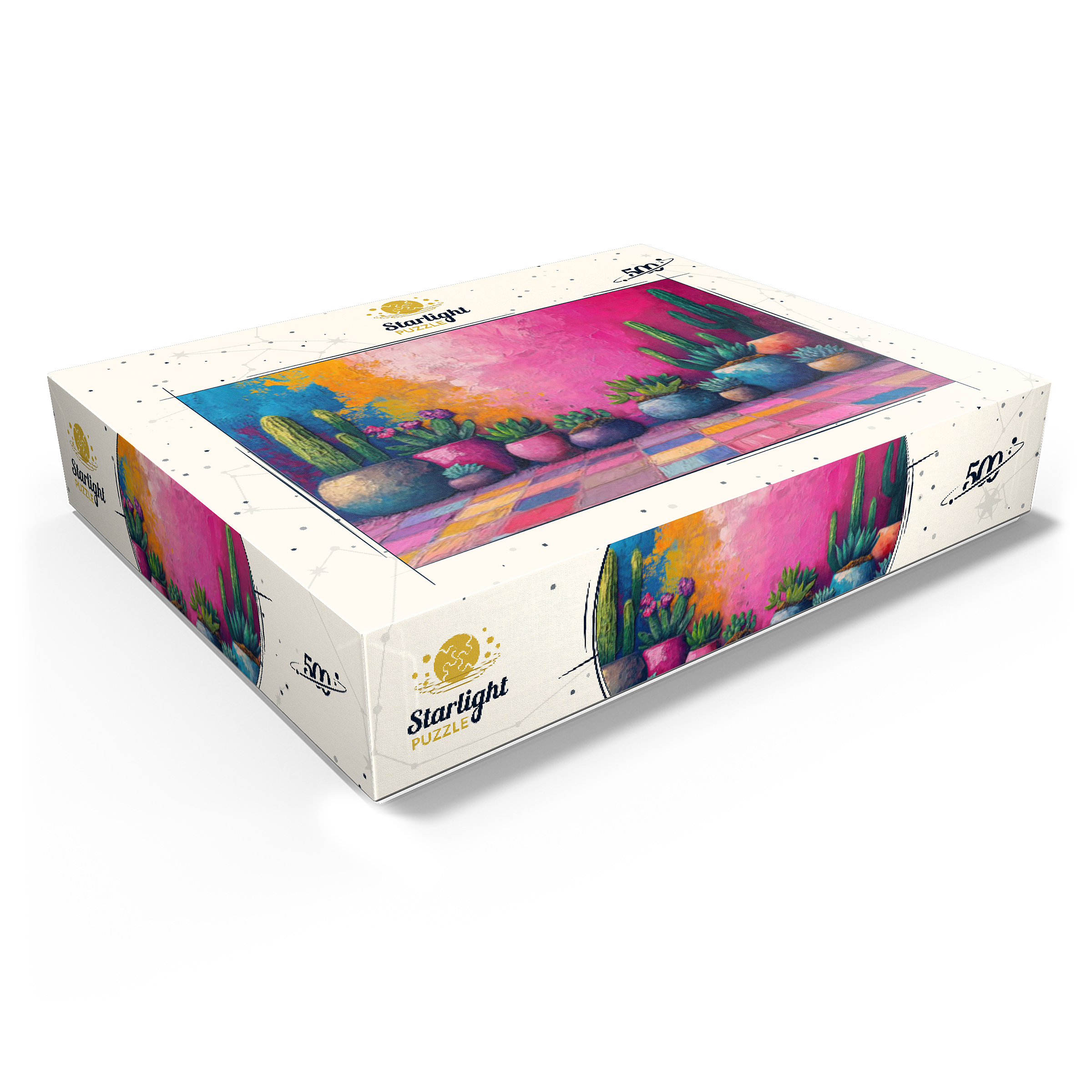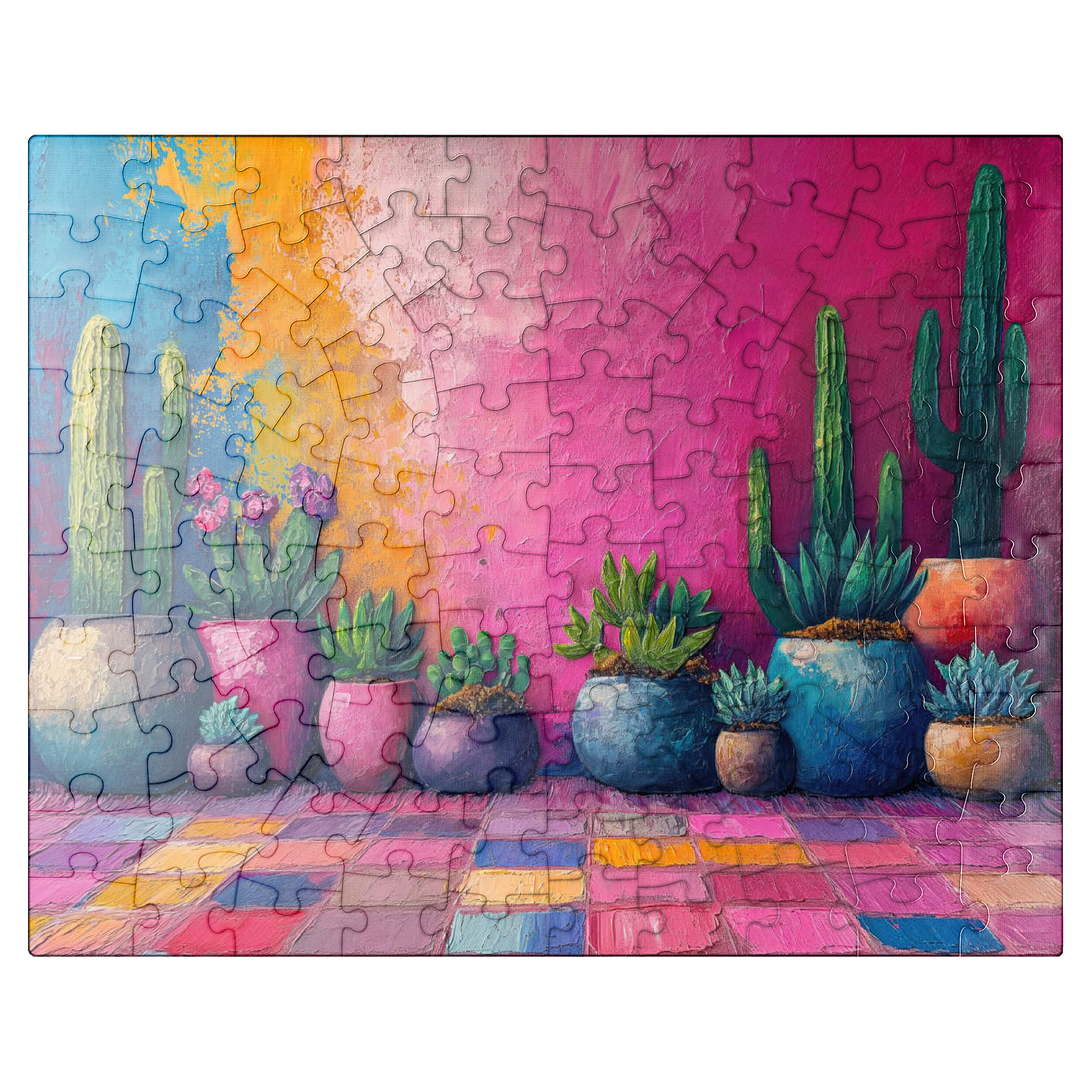 A vibrant and textured painting featuring an array of cacti and succulents in uniquely designed pots, set against a striking pink, orange, and blue gradient wall. The bold, lively colors create a cheerful and artistic atmosphere, while the potted plants showcase diverse shapes and textures. The tiled floor, painted in a patchwork of multicolored hues, adds depth and personality to the scene. This artwork is a celebration of desert plants and modern decor, perfect for lovers of bold and colorful design.