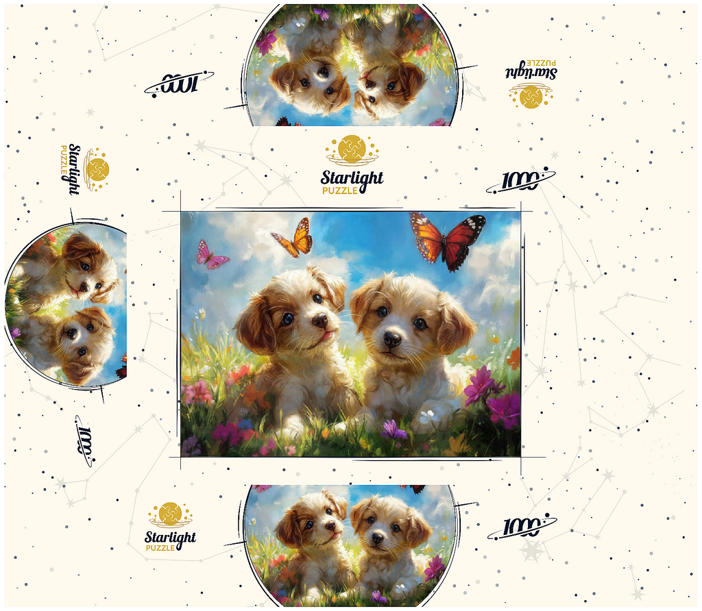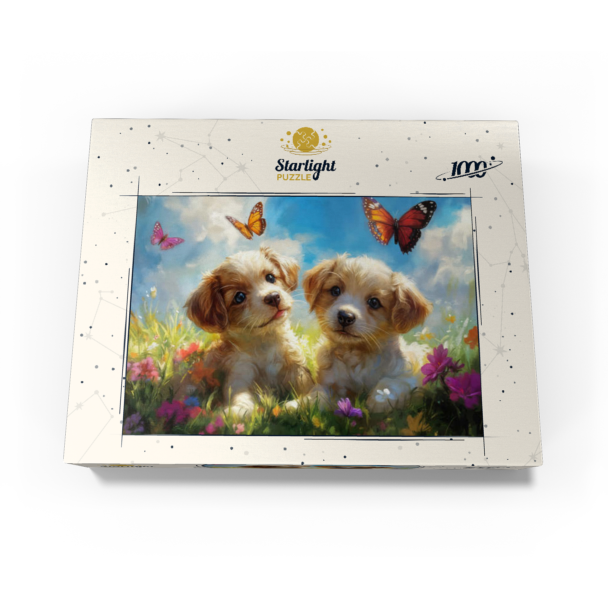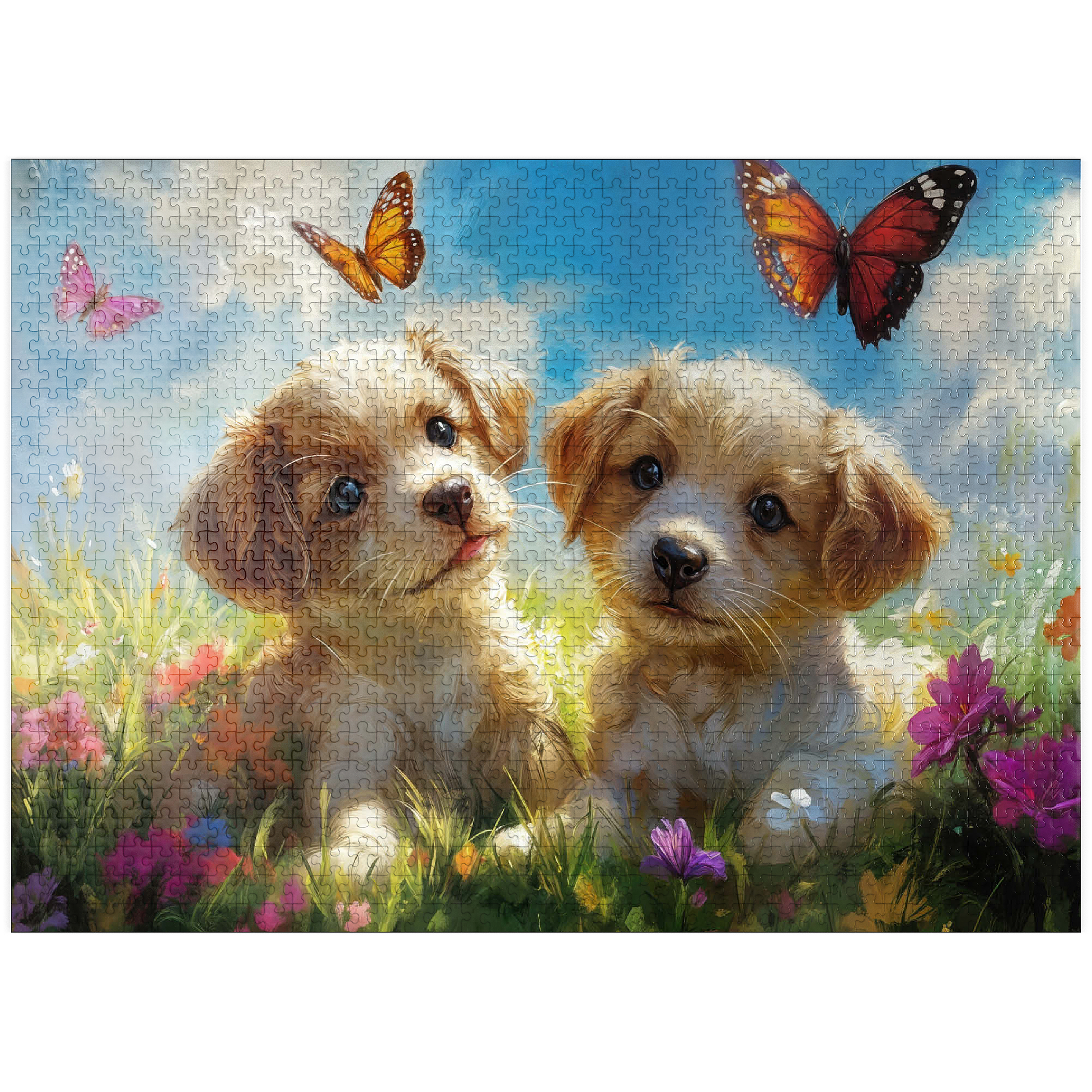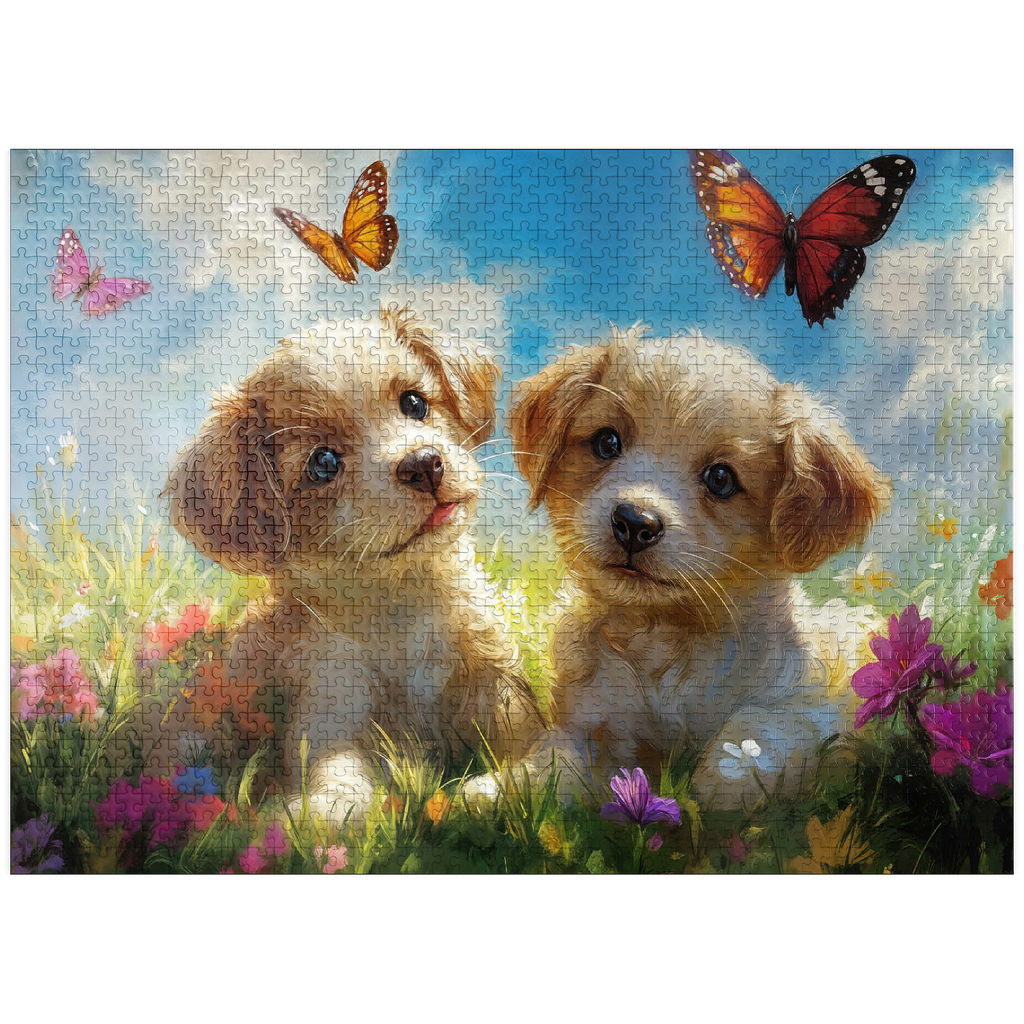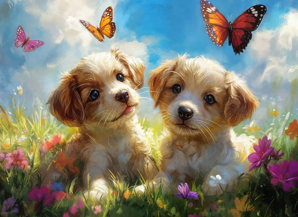 This delightful image features two fluffy puppies resting in a vibrant meadow filled with colorful wildflowers. Their playful expressions and sparkling eyes capture the joy of the moment as butterflies in shades of orange and pink flutter around them. The bright blue sky with soft clouds creates a serene and cheerful backdrop, making this a heartwarming scene that celebrates nature and the innocence of playful pups.