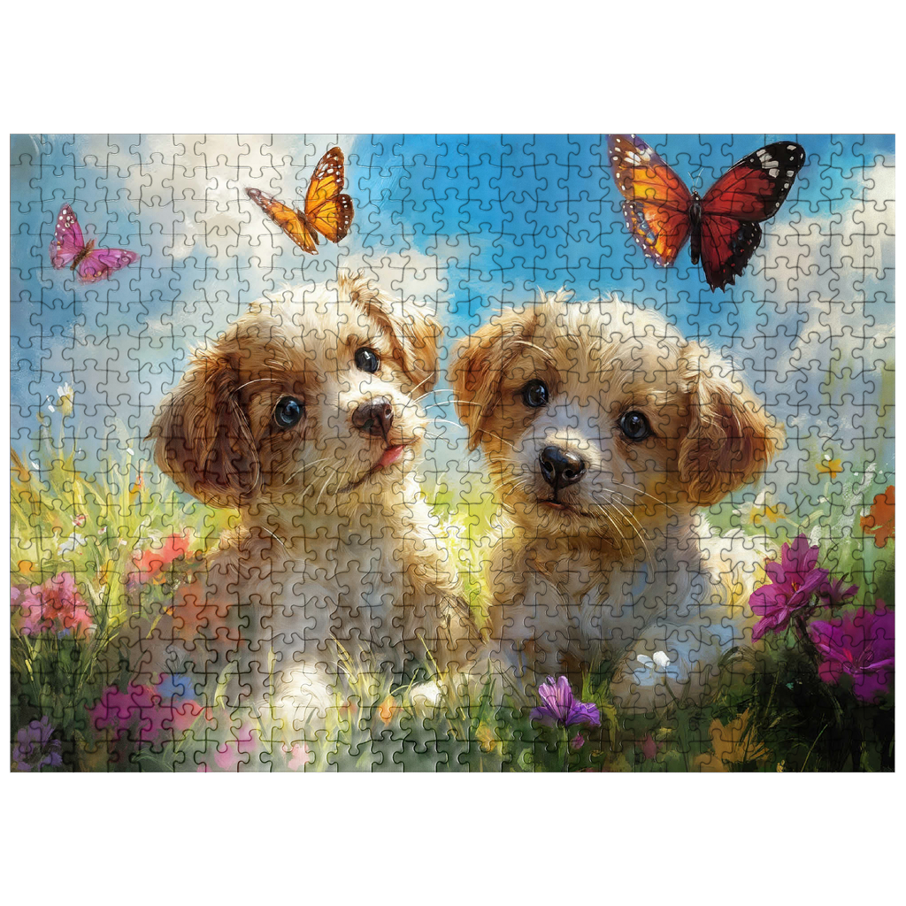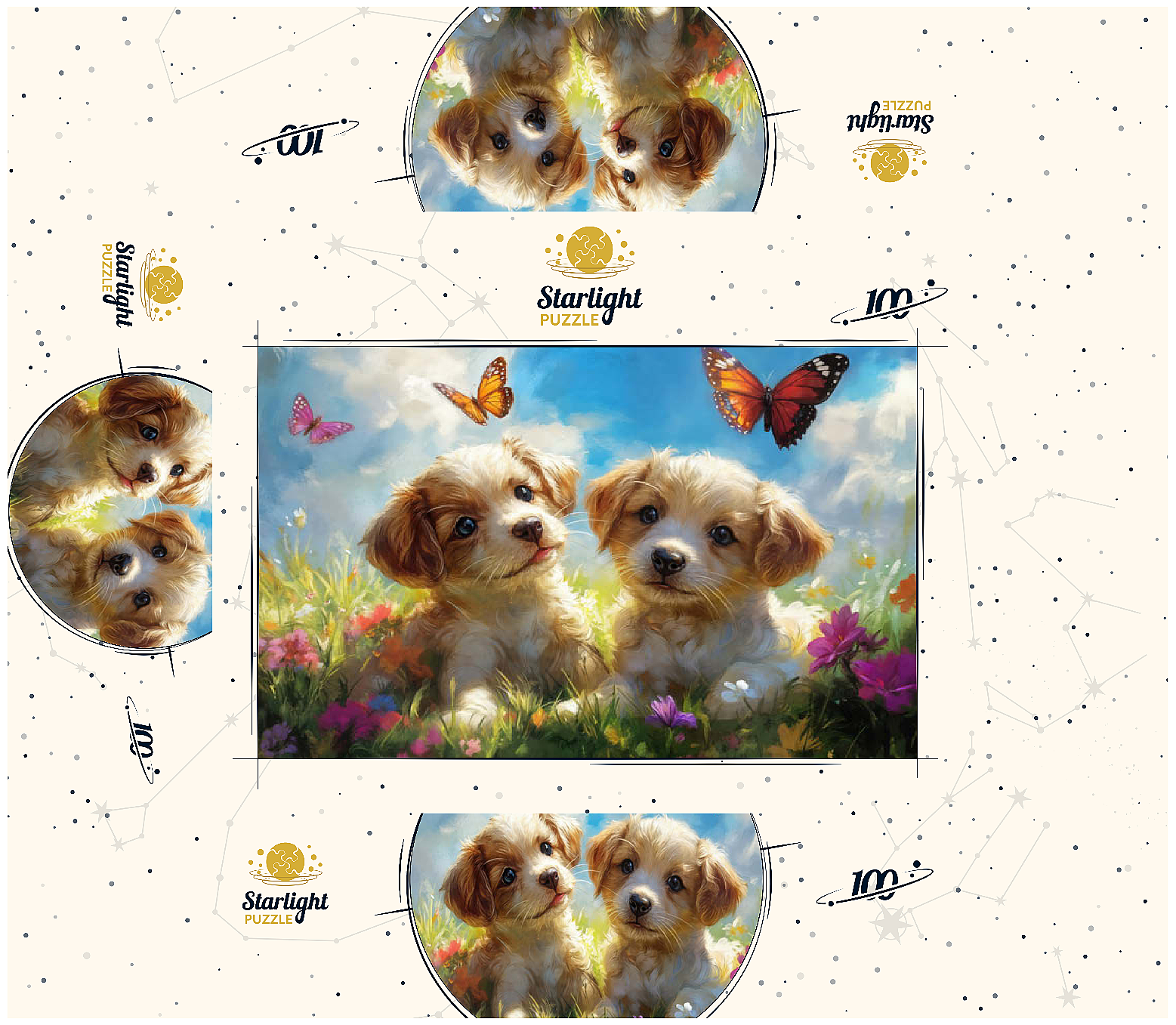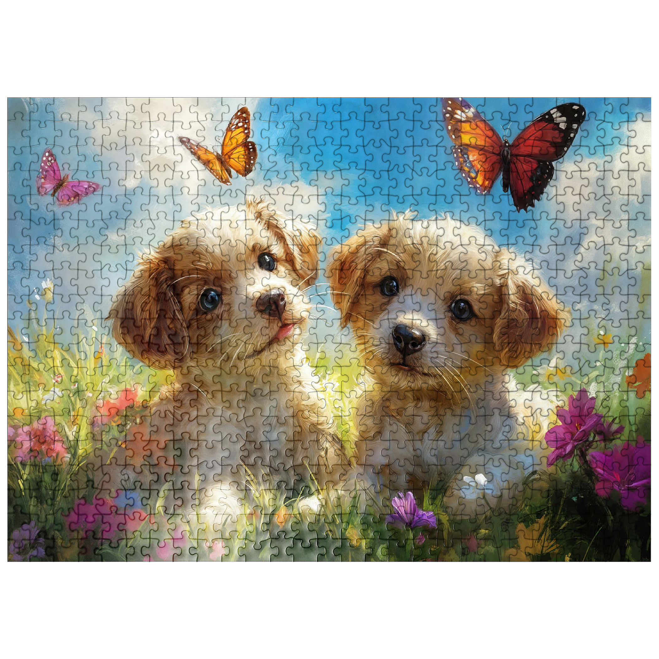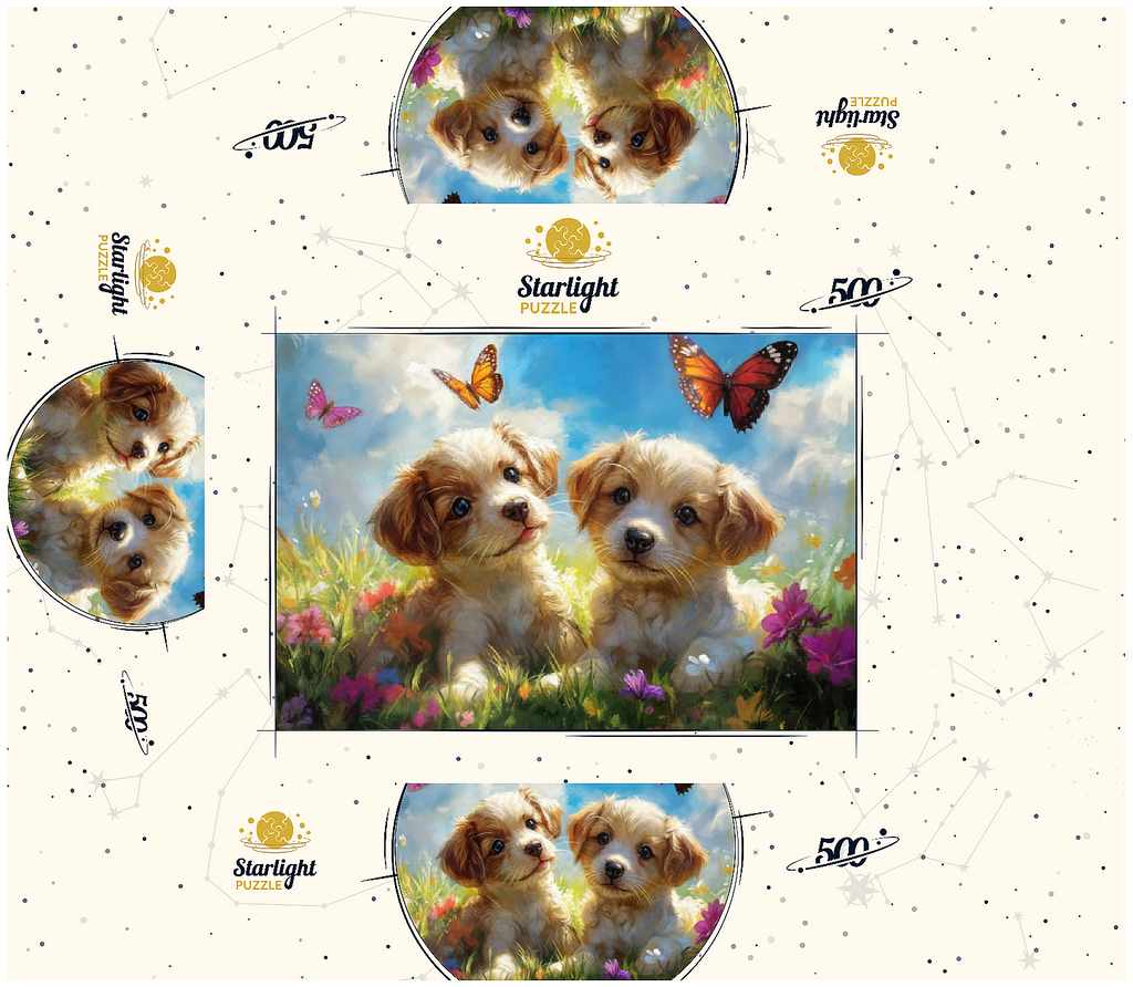 This delightful image features two fluffy puppies resting in a vibrant meadow filled with colorful wildflowers. Their playful expressions and sparkling eyes capture the joy of the moment as butterflies in shades of orange and pink flutter around them. The bright blue sky with soft clouds creates a serene and cheerful backdrop, making this a heartwarming scene that celebrates nature and the innocence of playful pups.