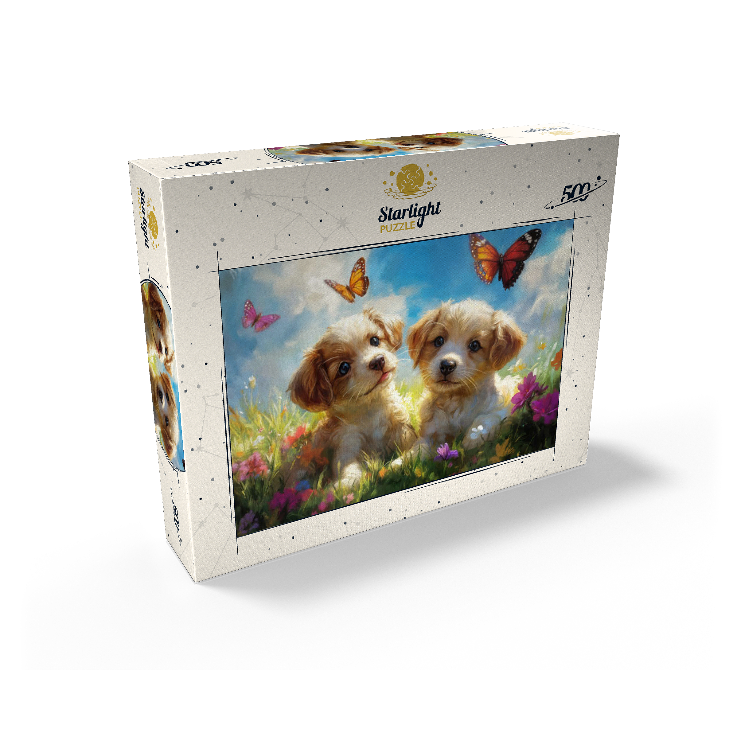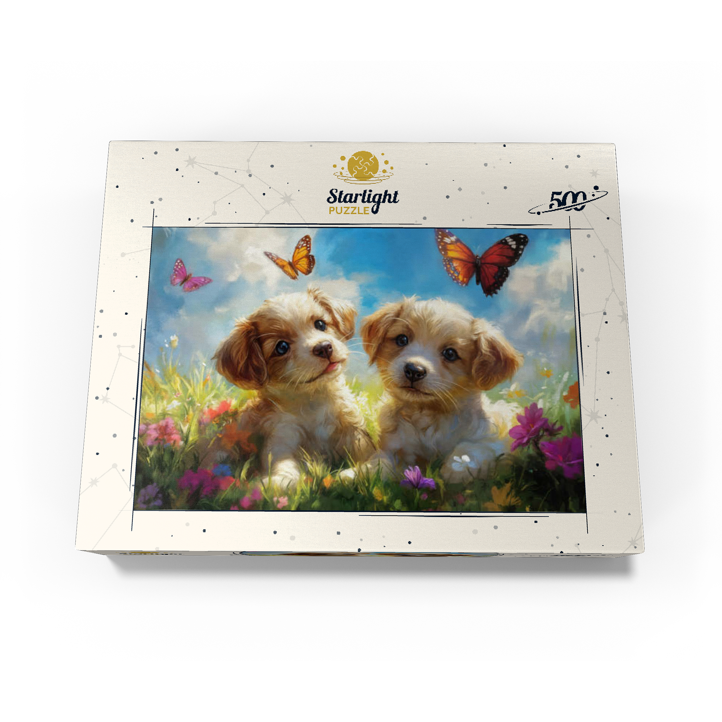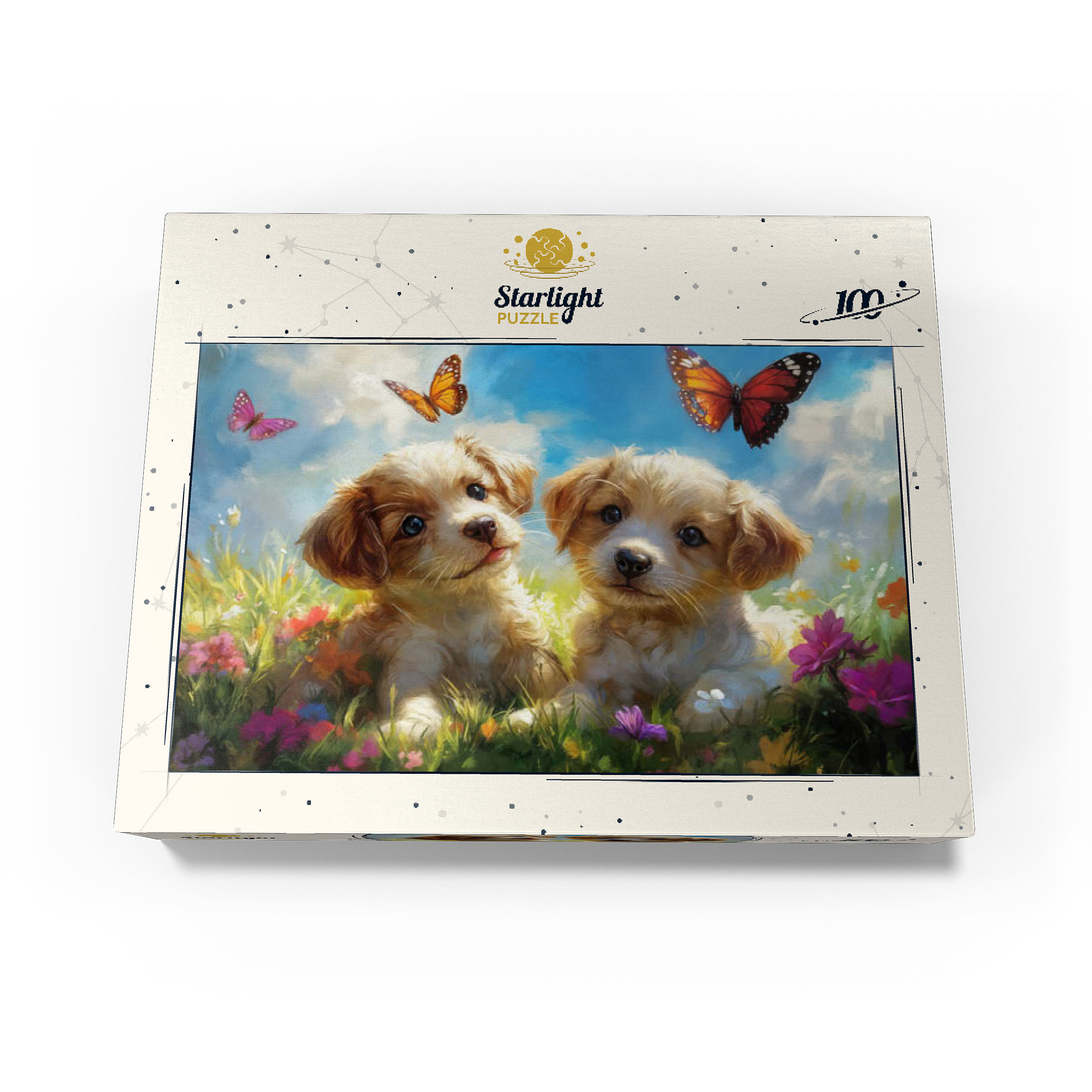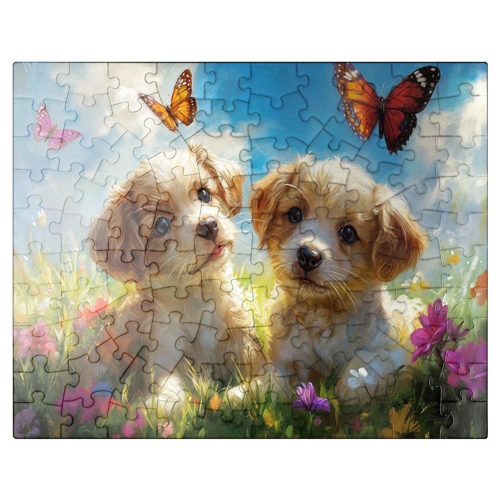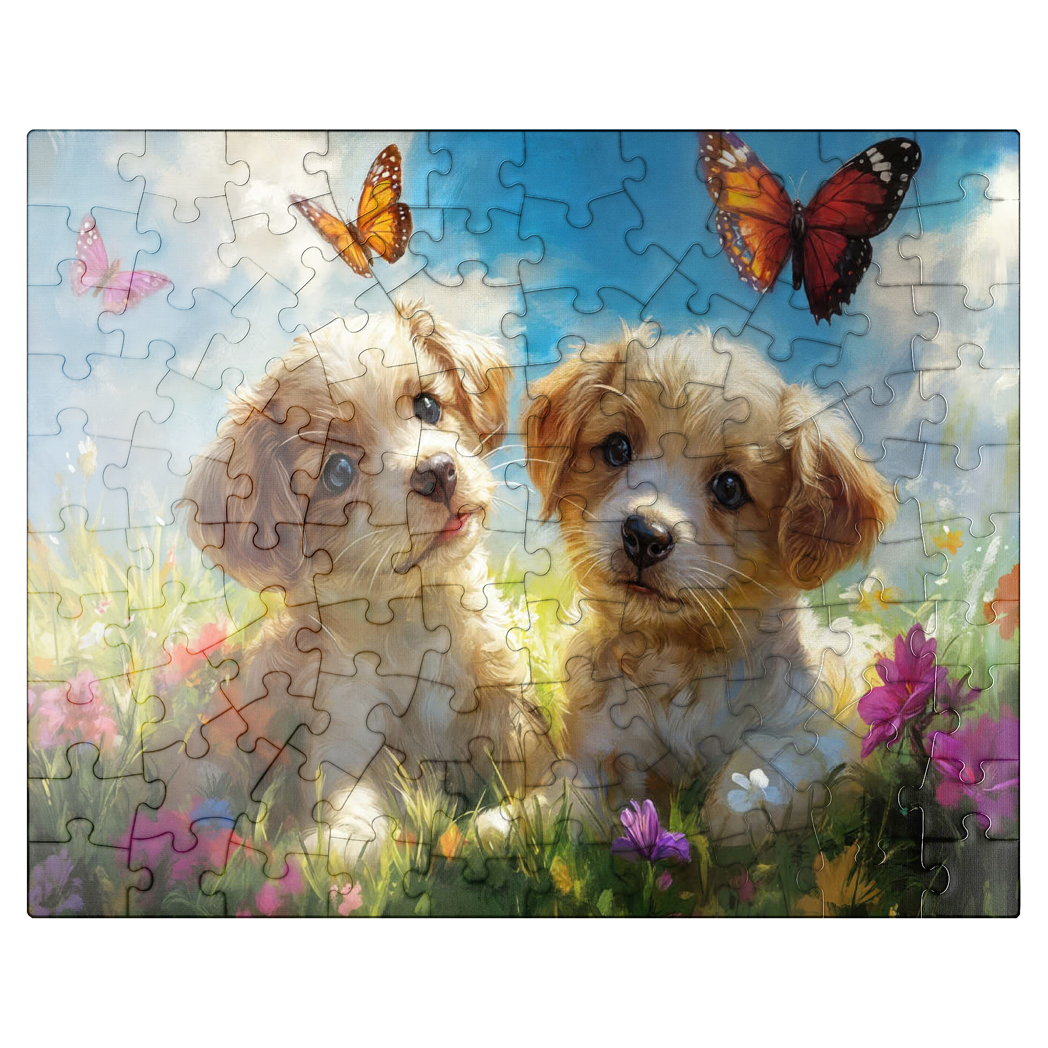 This delightful image features two fluffy puppies resting in a vibrant meadow filled with colorful wildflowers. Their playful expressions and sparkling eyes capture the joy of the moment as butterflies in shades of orange and pink flutter around them. The bright blue sky with soft clouds creates a serene and cheerful backdrop, making this a heartwarming scene that celebrates nature and the innocence of playful pups.