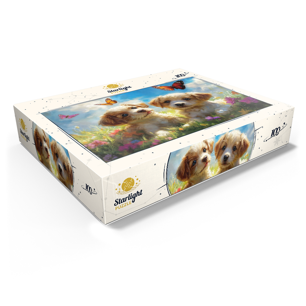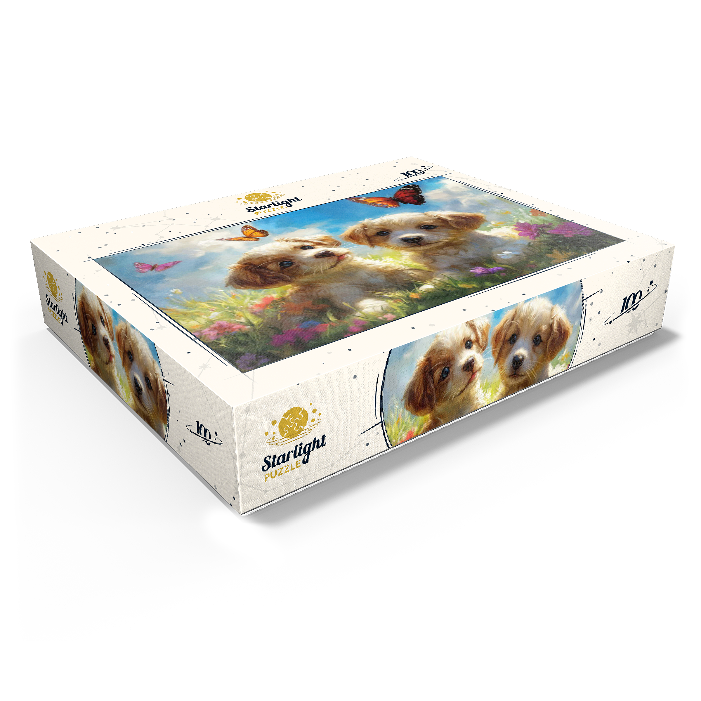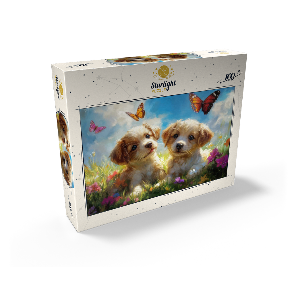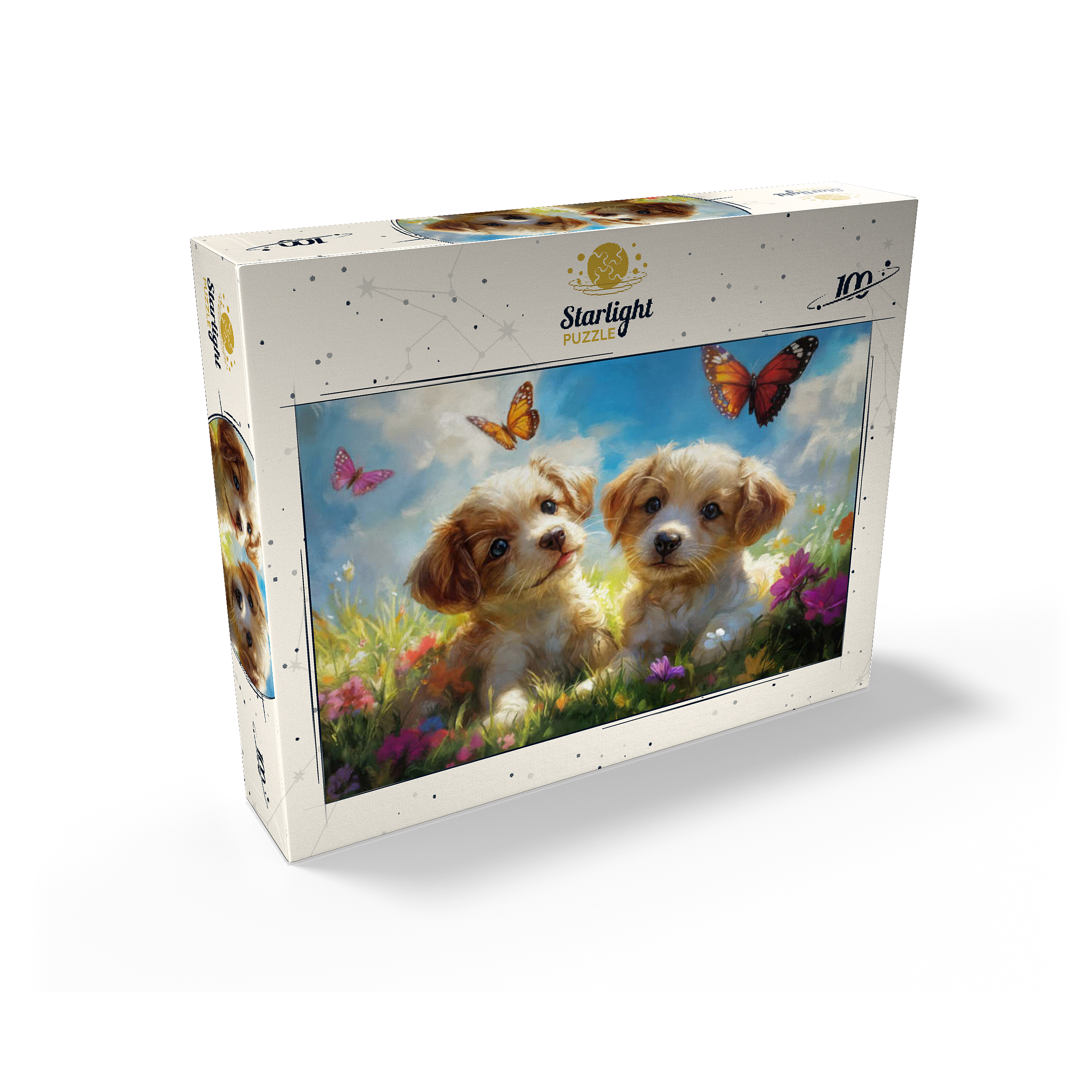 This delightful image features two fluffy puppies resting in a vibrant meadow filled with colorful wildflowers. Their playful expressions and sparkling eyes capture the joy of the moment as butterflies in shades of orange and pink flutter around them. The bright blue sky with soft clouds creates a serene and cheerful backdrop, making this a heartwarming scene that celebrates nature and the innocence of playful pups.
