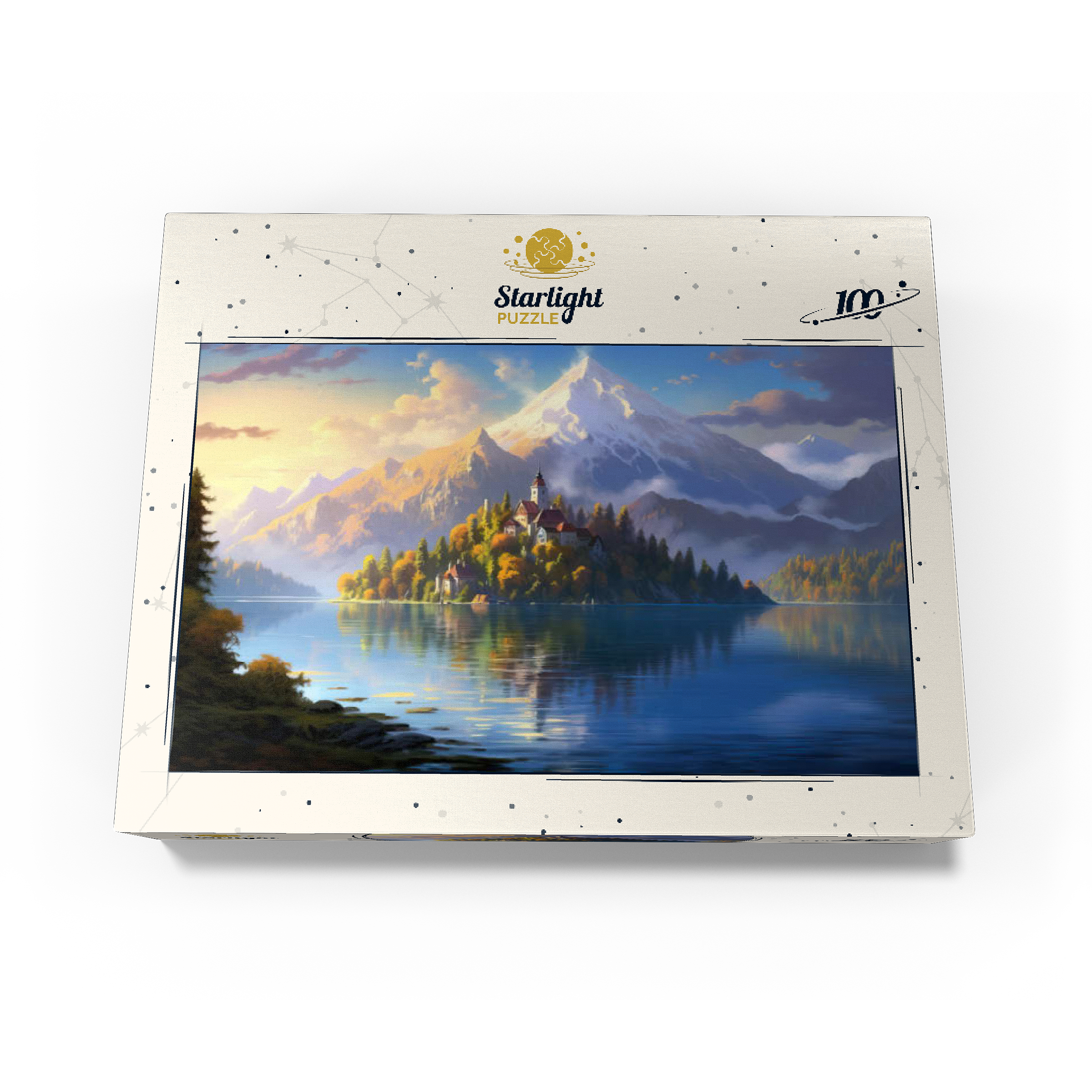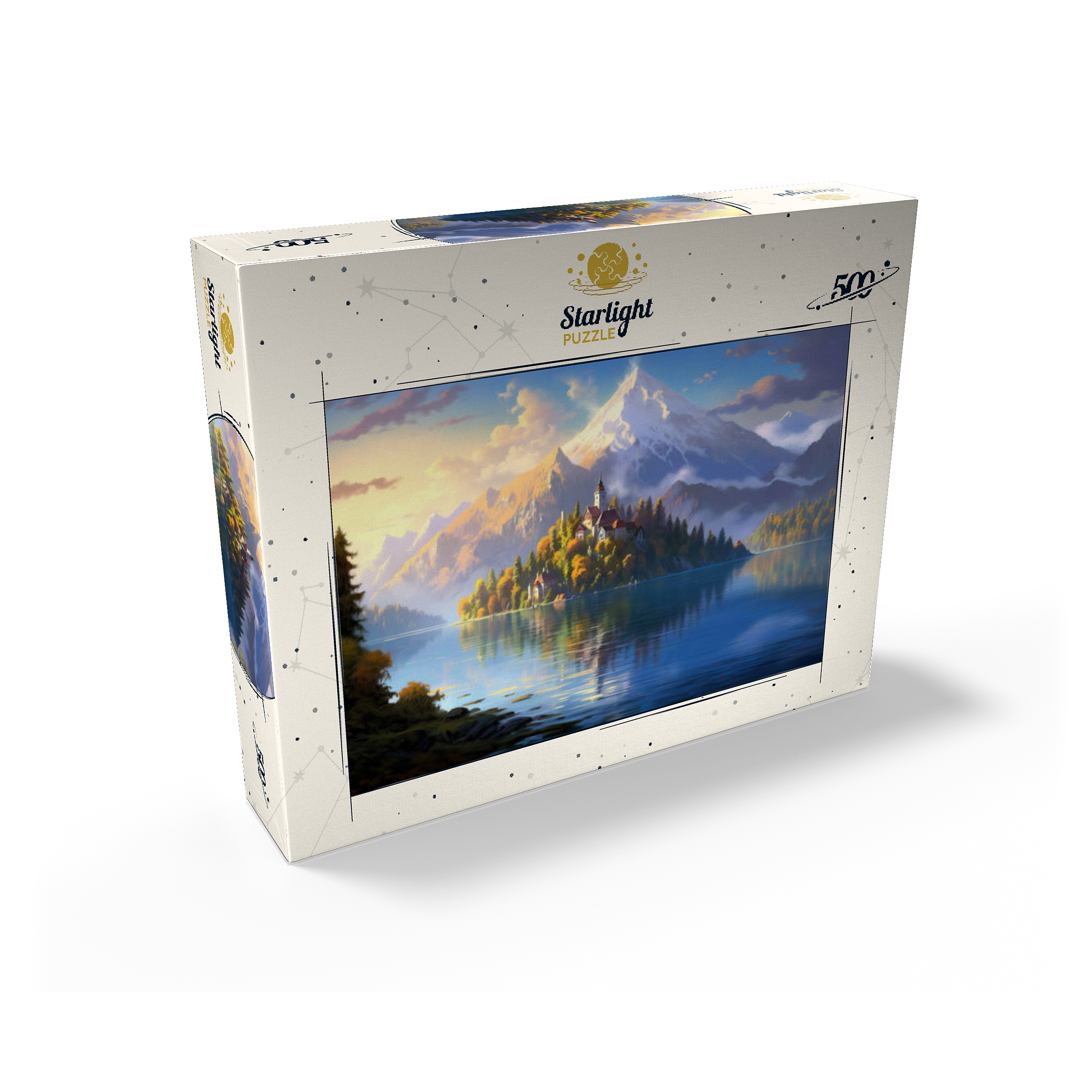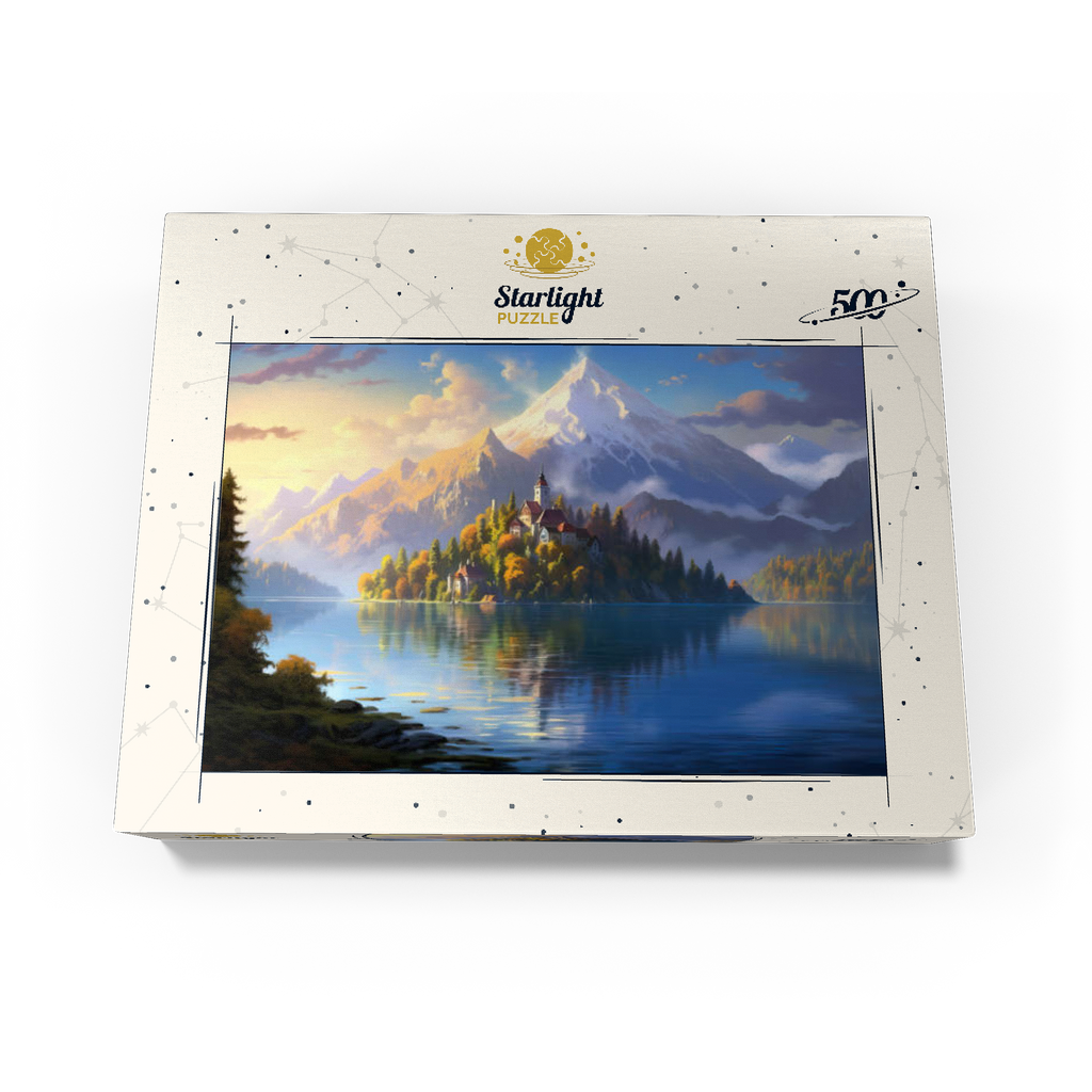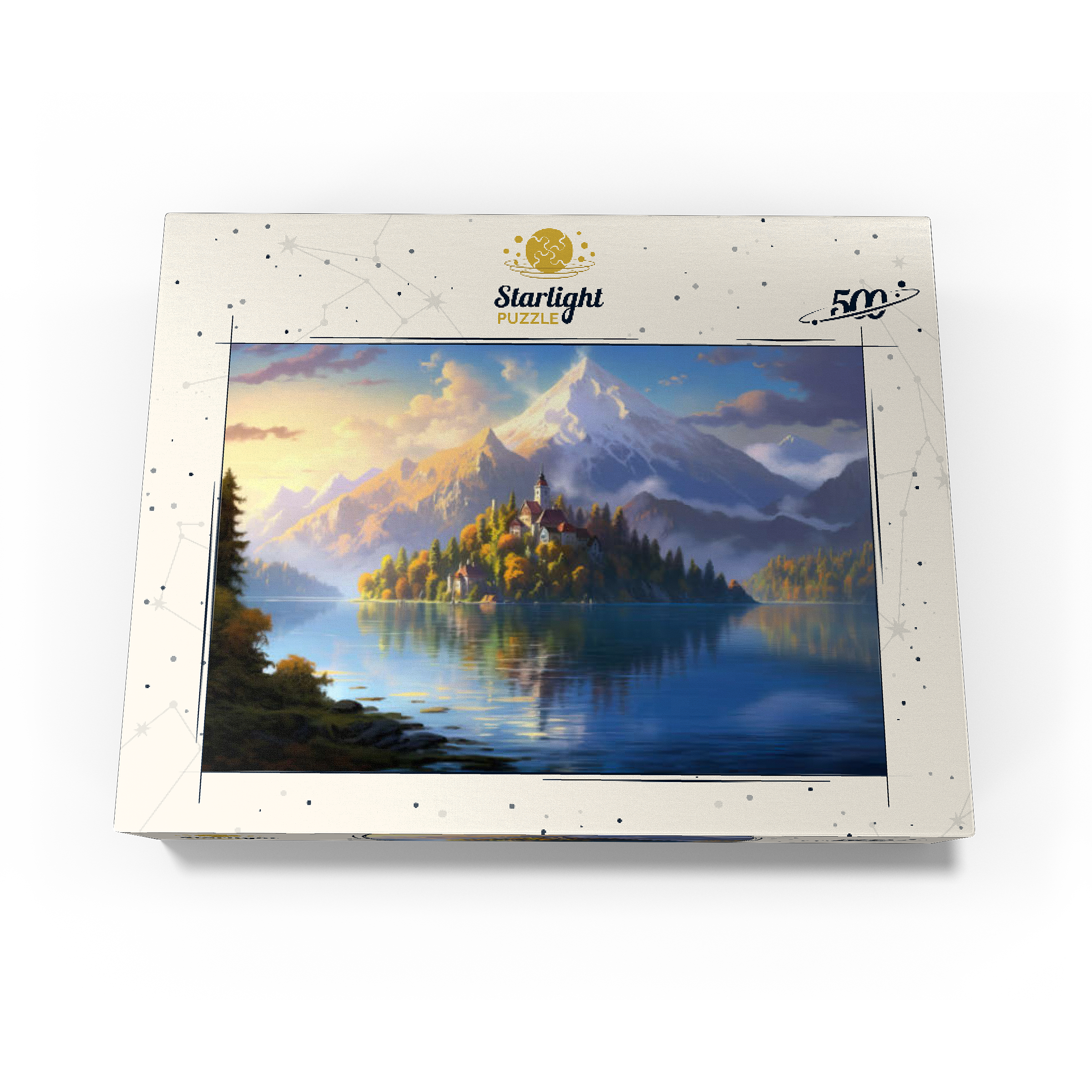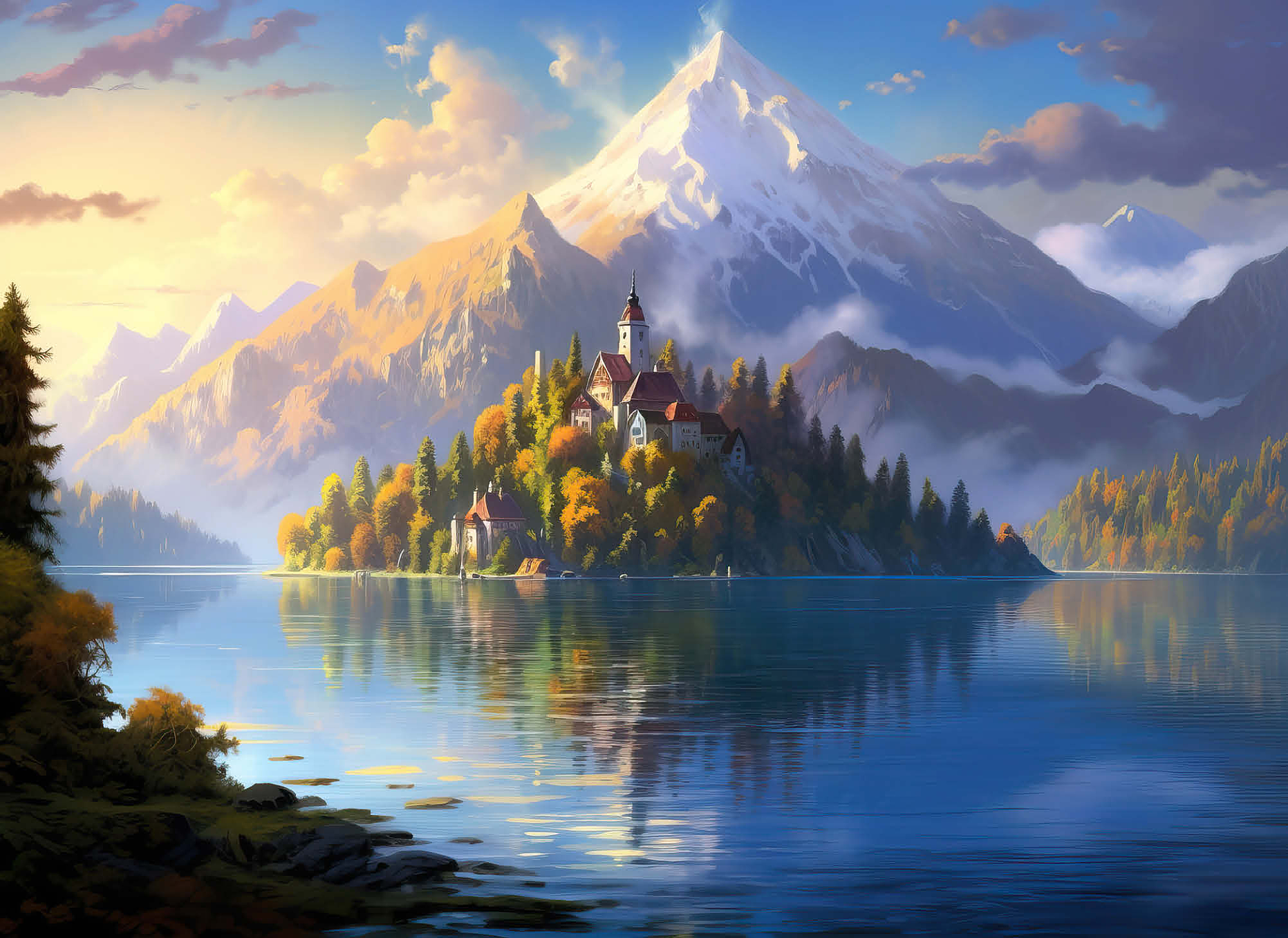 A breathtaking view of Lake Bled, with its iconic island featuring a charming church nestled amid lush autumn foliage. The serene waters of the lake mirror the towering snow-capped peaks and vibrant colors of the surrounding landscape. Soft morning light bathes the scene, creating an ethereal atmosphere that perfectly captures the tranquility of this Slovenian gem. The distant mountains, shrouded in mist, add depth and majesty to this idyllic setting.