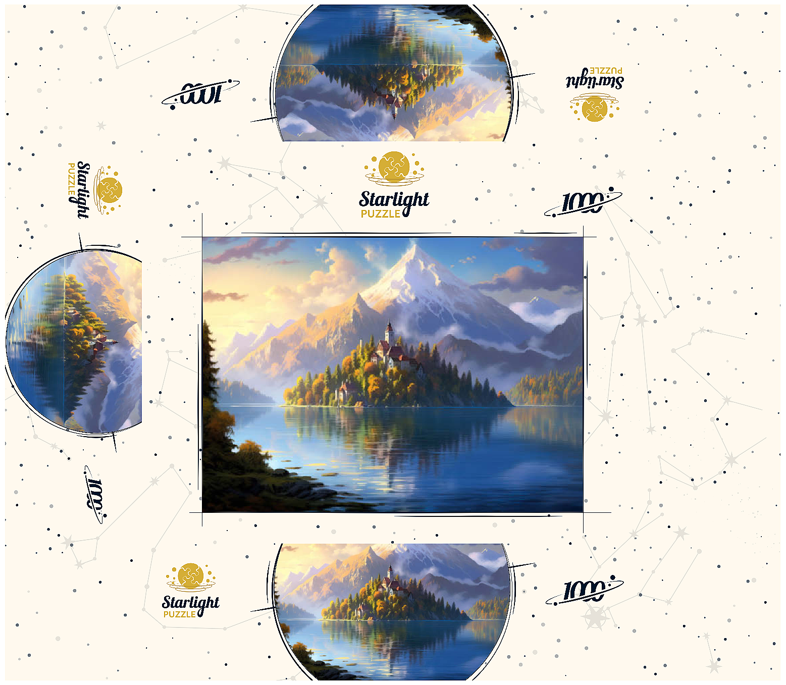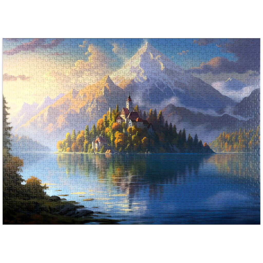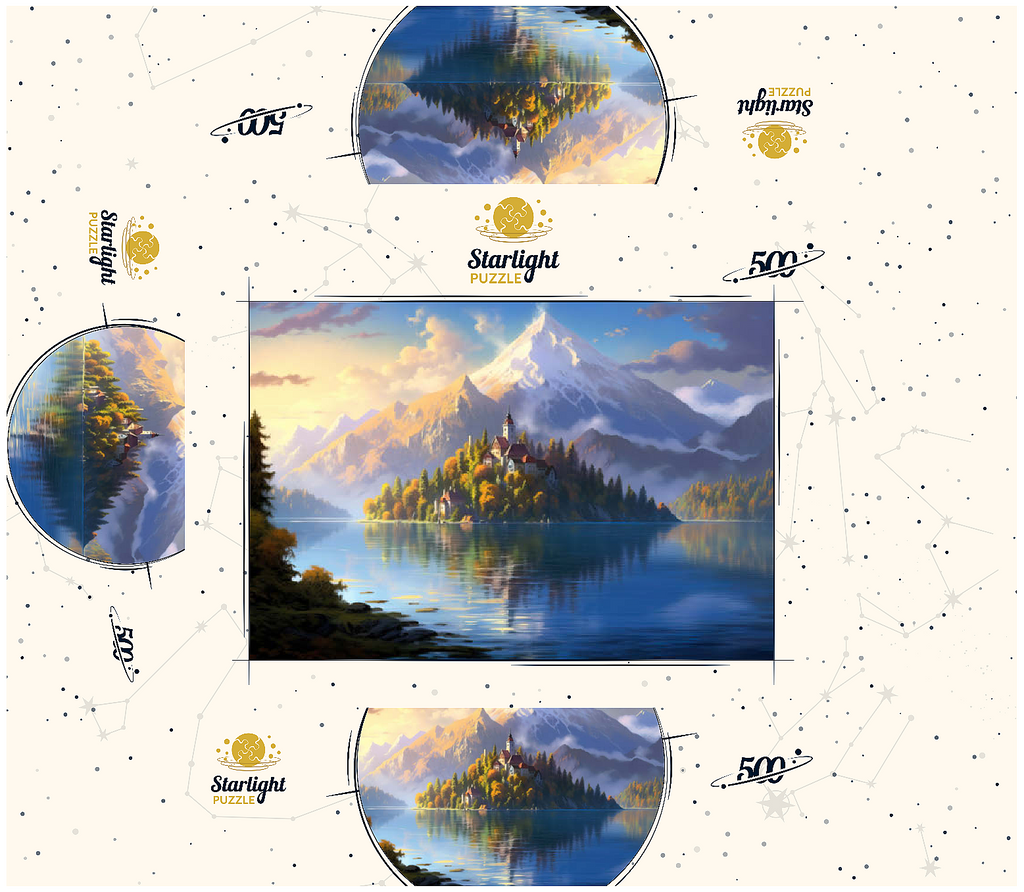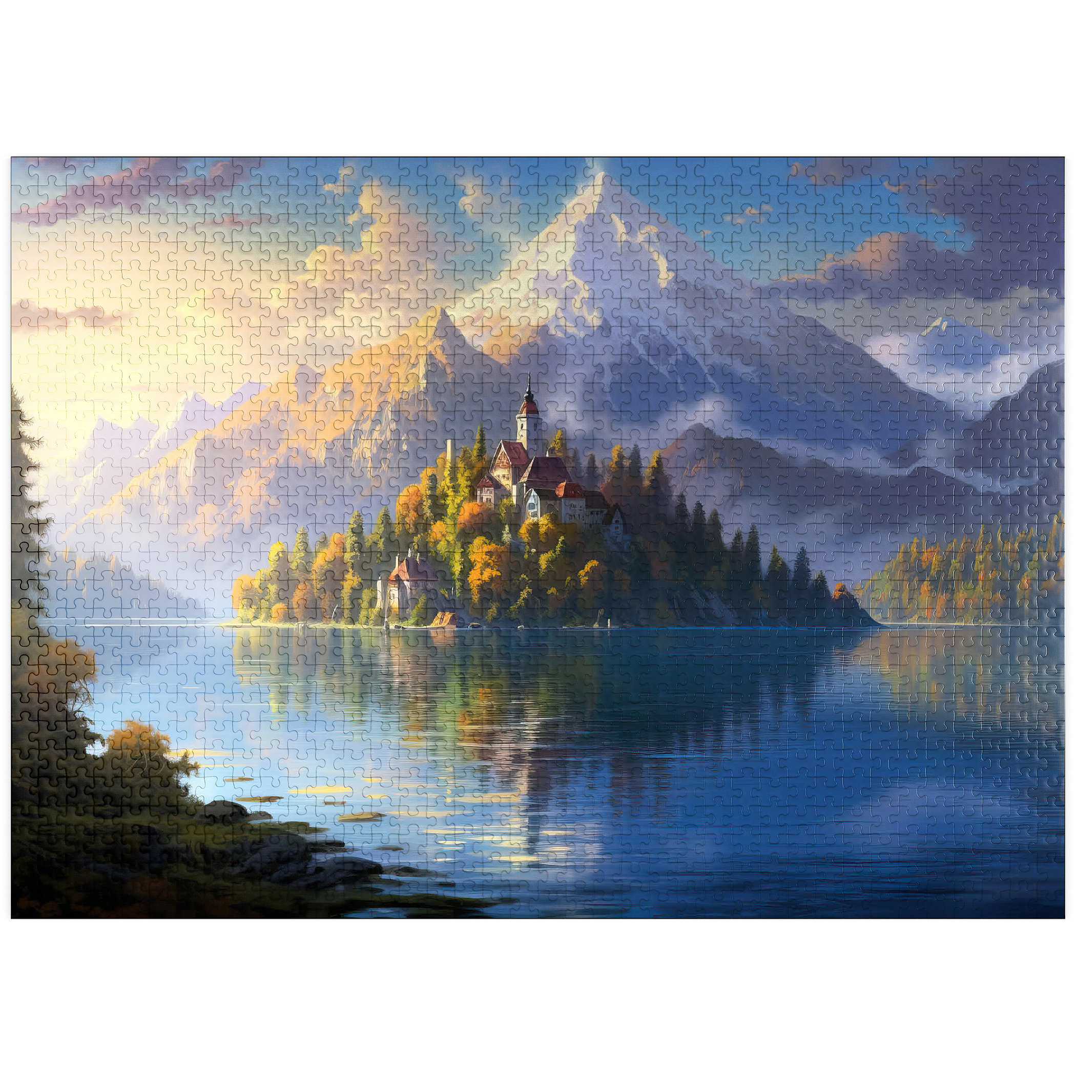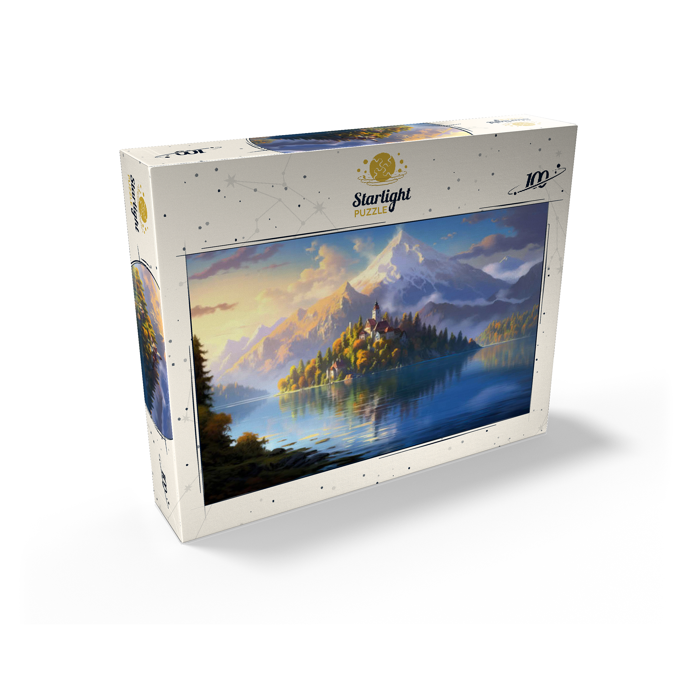 A breathtaking view of Lake Bled, with its iconic island featuring a charming church nestled amid lush autumn foliage. The serene waters of the lake mirror the towering snow-capped peaks and vibrant colors of the surrounding landscape. Soft morning light bathes the scene, creating an ethereal atmosphere that perfectly captures the tranquility of this Slovenian gem. The distant mountains, shrouded in mist, add depth and majesty to this idyllic setting.