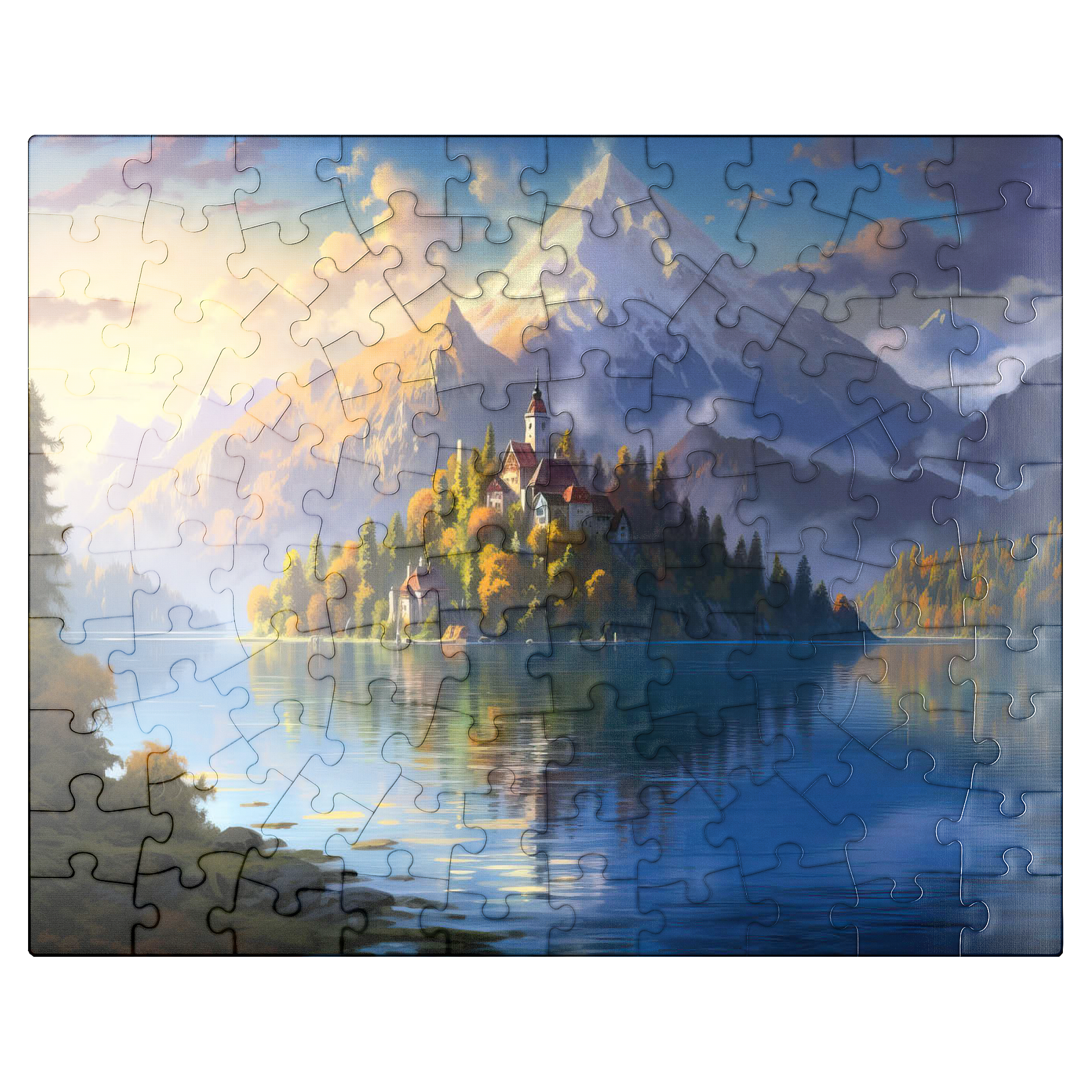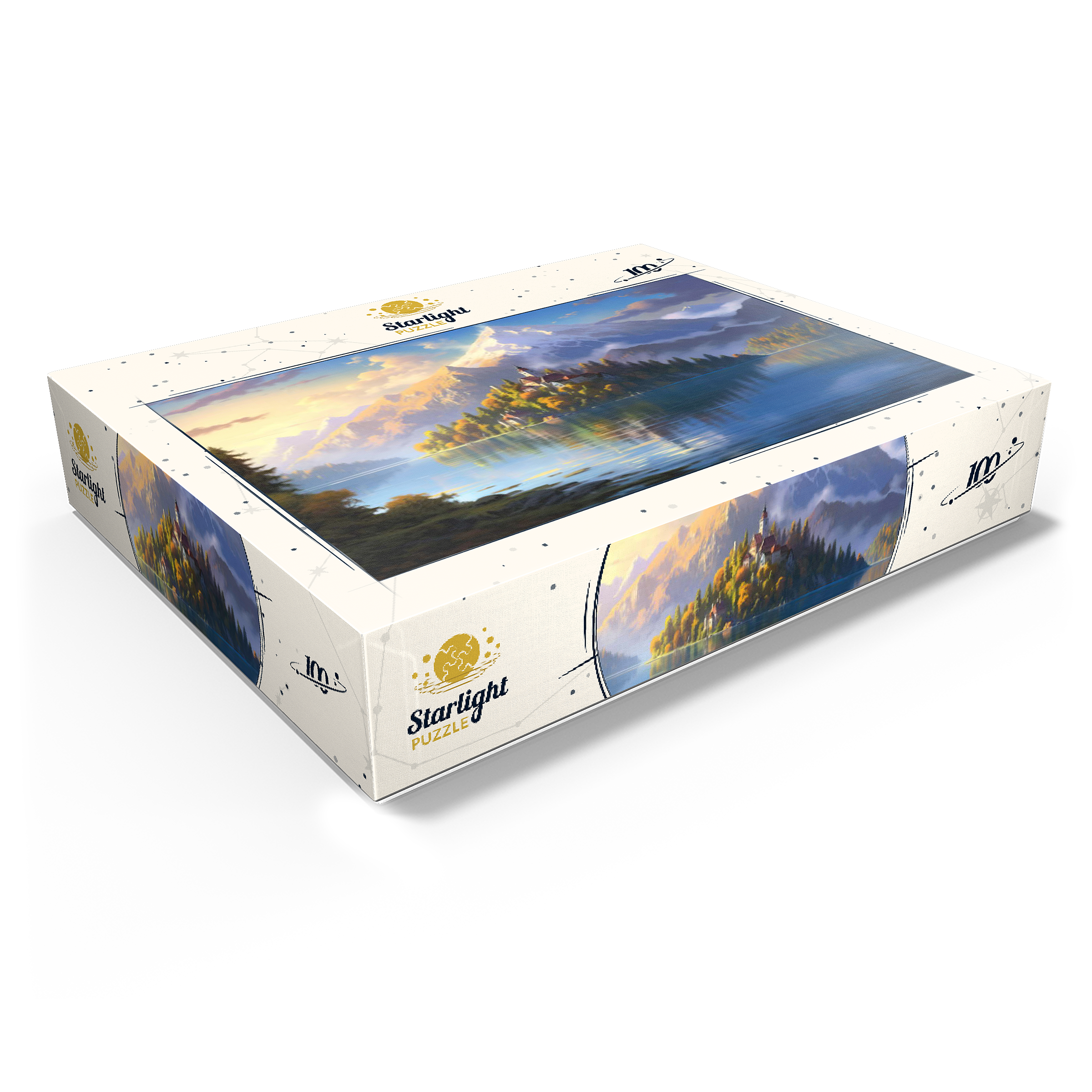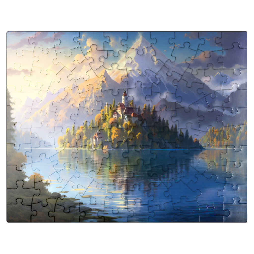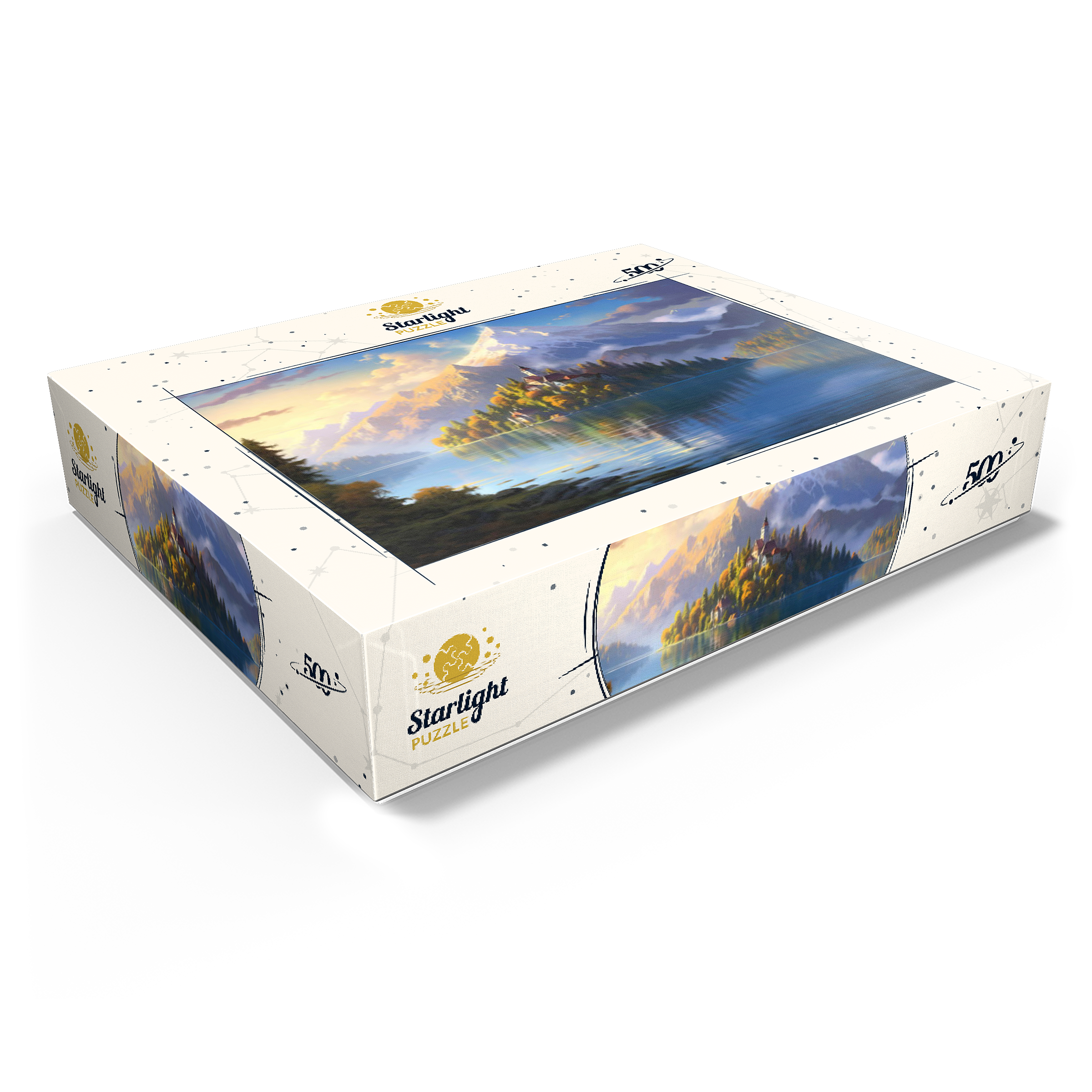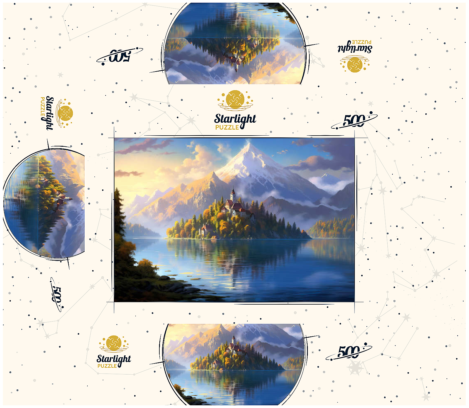 A breathtaking view of Lake Bled, with its iconic island featuring a charming church nestled amid lush autumn foliage. The serene waters of the lake mirror the towering snow-capped peaks and vibrant colors of the surrounding landscape. Soft morning light bathes the scene, creating an ethereal atmosphere that perfectly captures the tranquility of this Slovenian gem. The distant mountains, shrouded in mist, add depth and majesty to this idyllic setting.