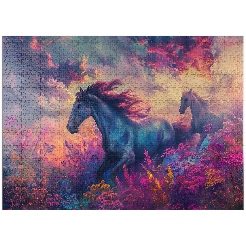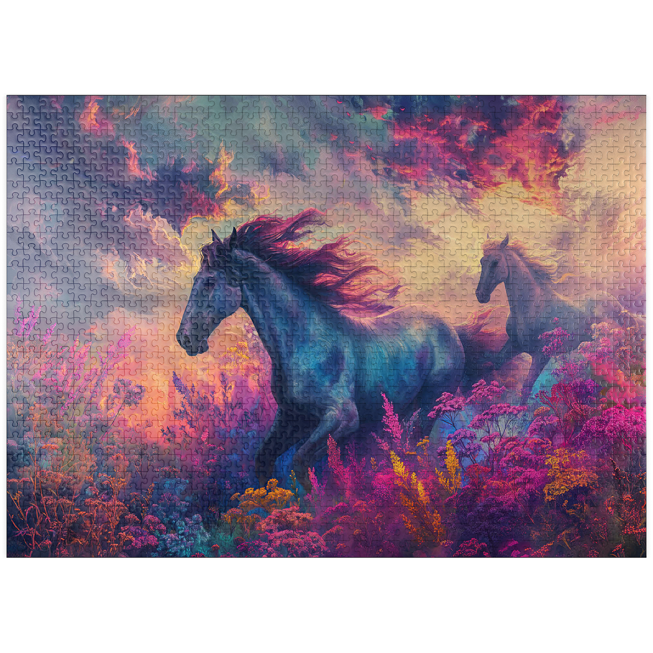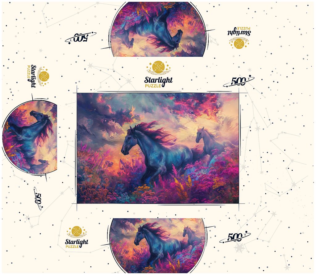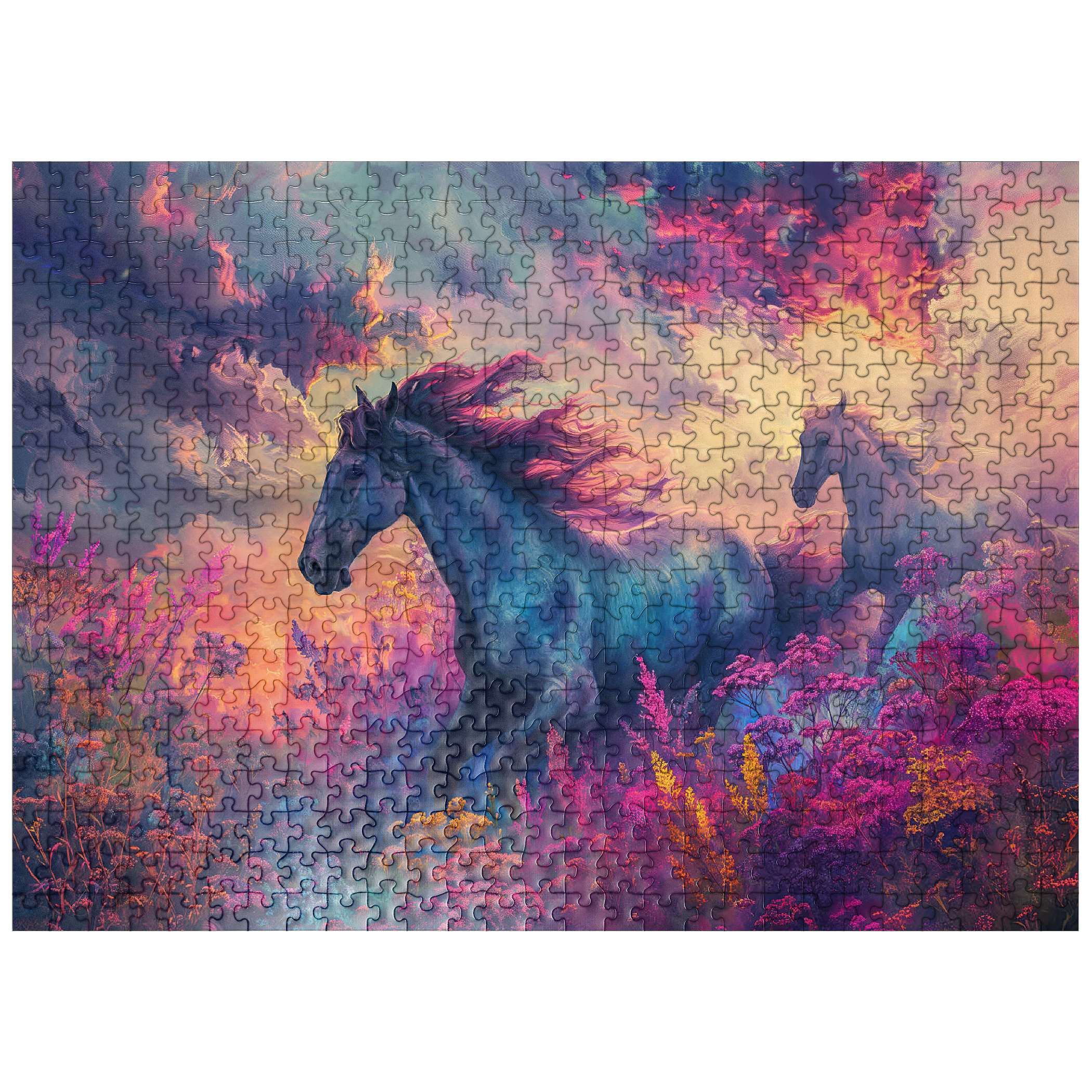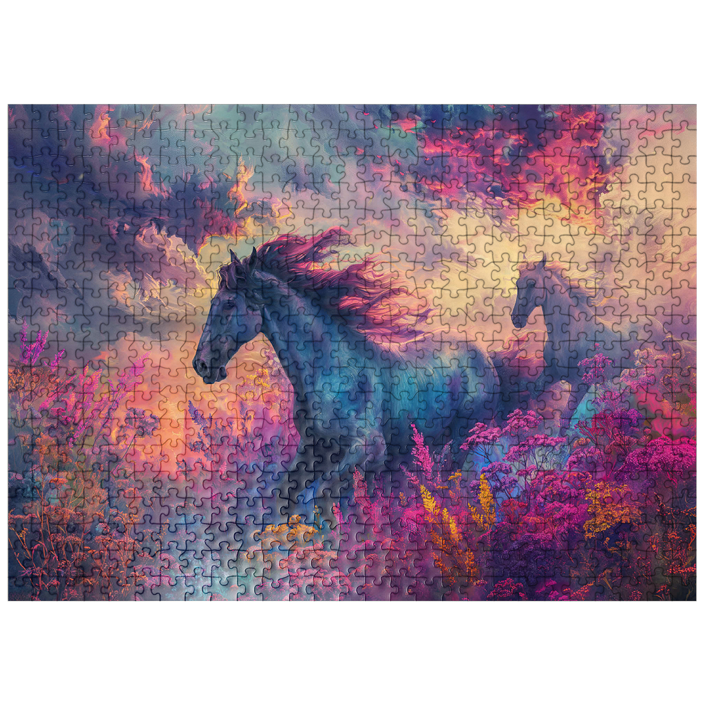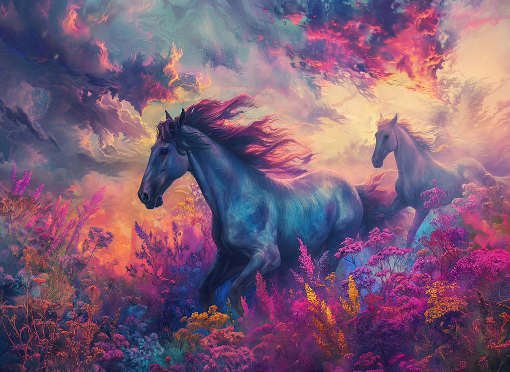This breathtaking artwork portrays two majestic horses galloping through a surreal, vividly colored landscape. the scene is alive with hues of purple, pink, orange, and blue, blending seamlessly into the dramatic sky filled with swirling clouds. the horses, with their flowing manes and muscular forms, exude grace and power, embodying the spirit of freedom. the vibrant flora adds depth and texture, creating a harmonious fusion of nature and fantasy. this image captures the wild beauty of horses amidst an imaginative dreamscape, making it a true masterpiece.