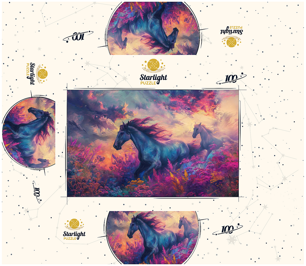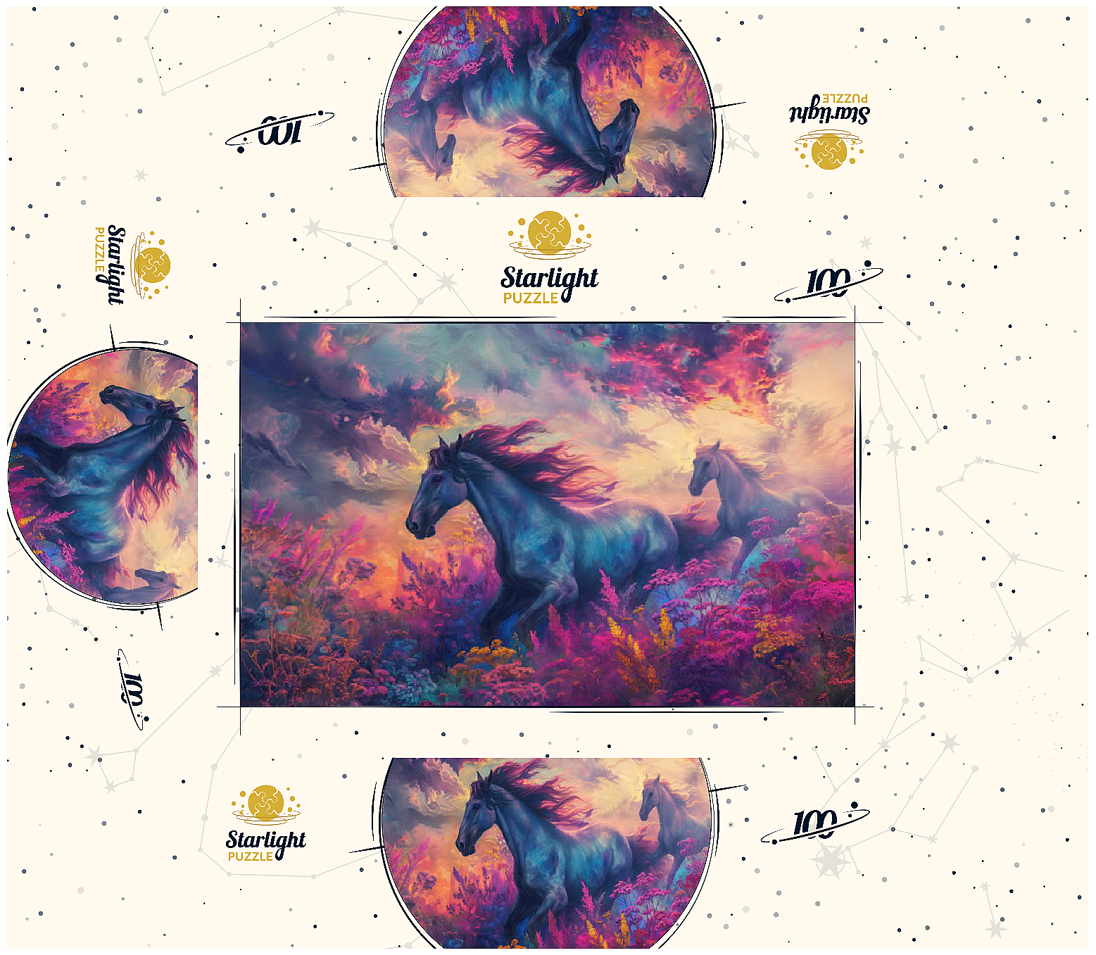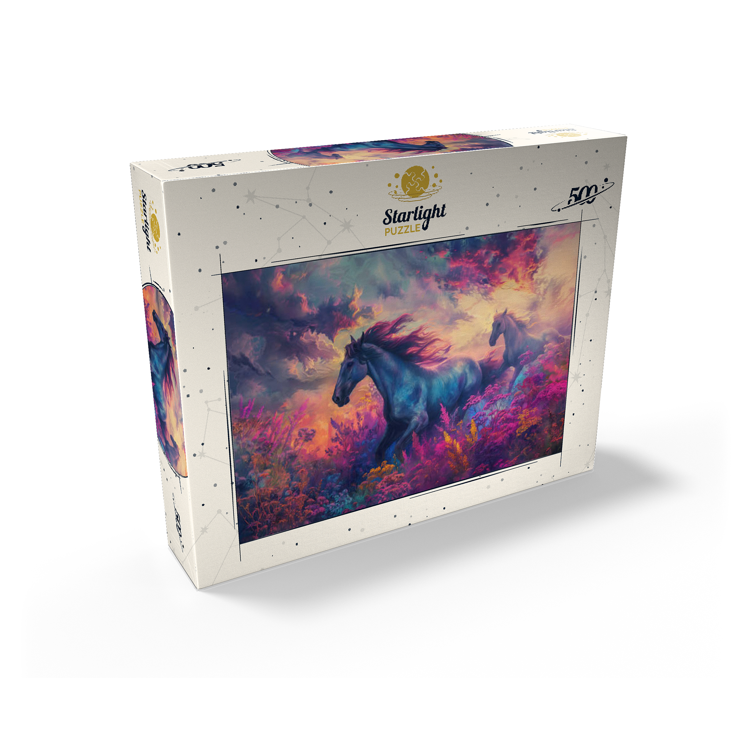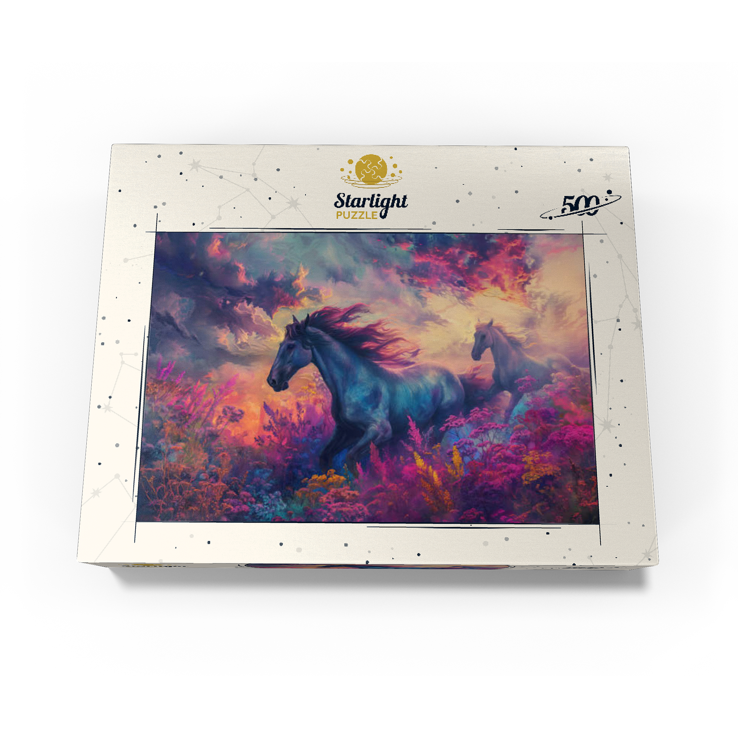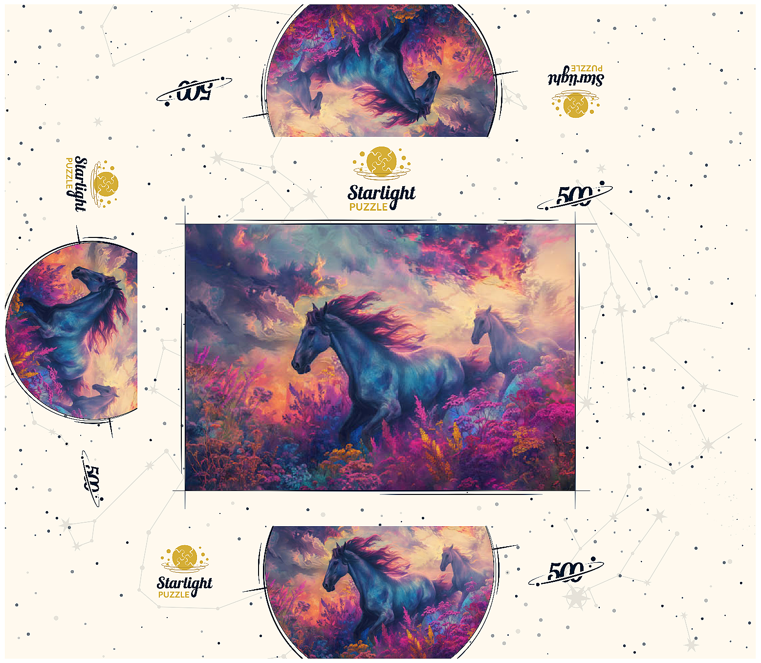 This breathtaking artwork portrays two majestic horses galloping through a surreal, vividly colored landscape. the scene is alive with hues of purple, pink, orange, and blue, blending seamlessly into the dramatic sky filled with swirling clouds. the horses, with their flowing manes and muscular forms, exude grace and power, embodying the spirit of freedom. the vibrant flora adds depth and texture, creating a harmonious fusion of nature and fantasy. this image captures the wild beauty of horses amidst an imaginative dreamscape, making it a true masterpiece.