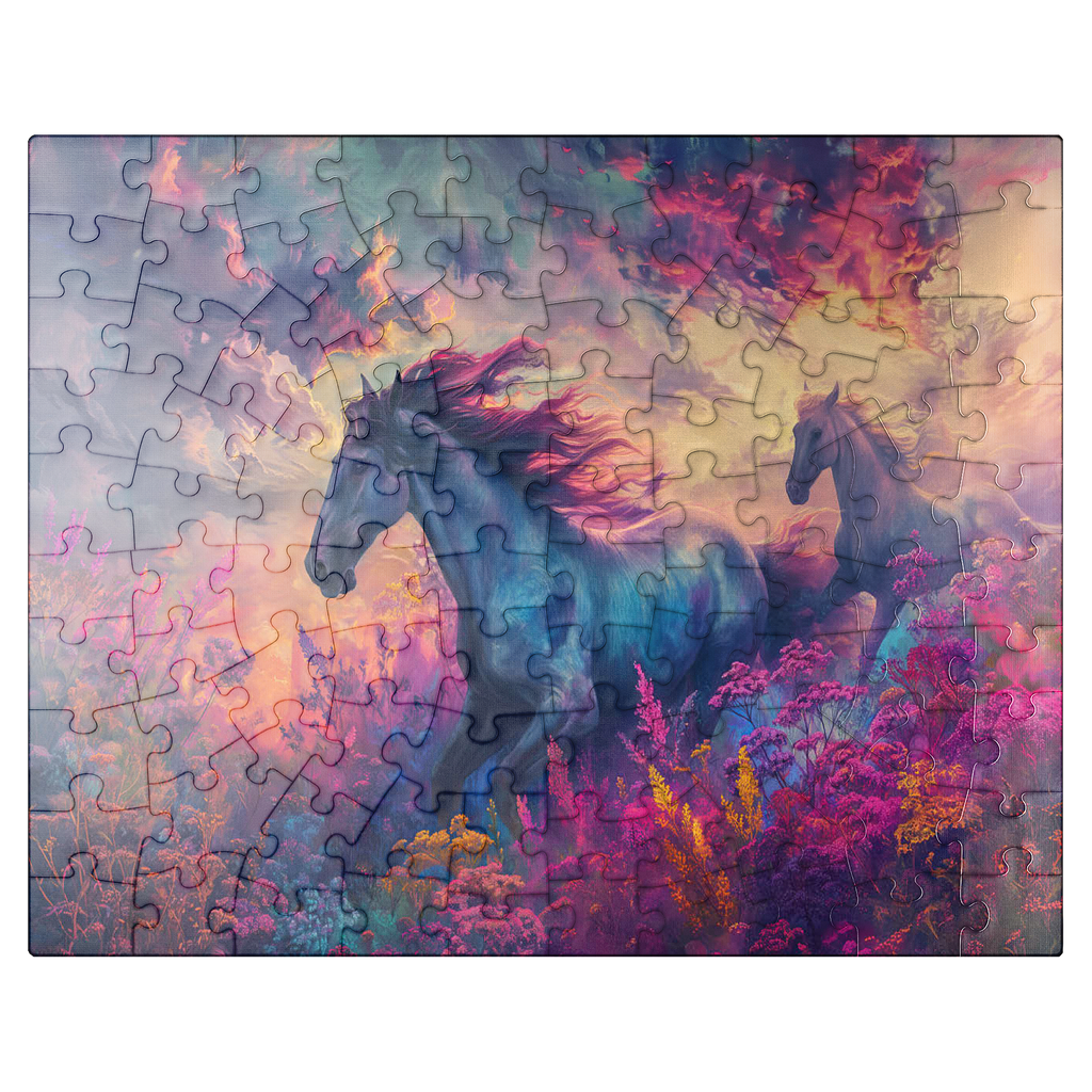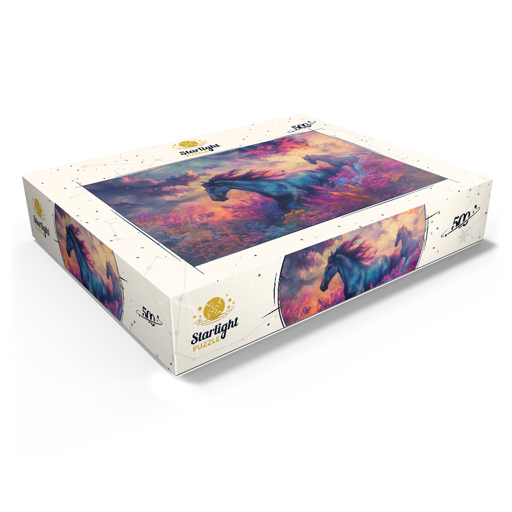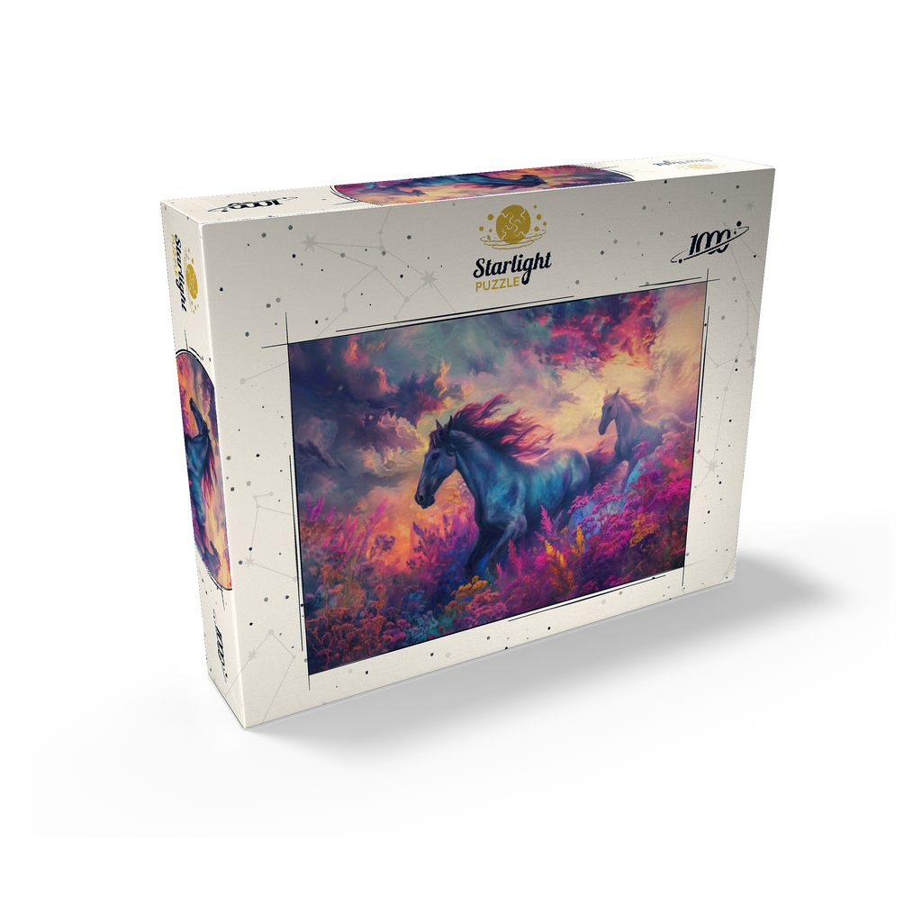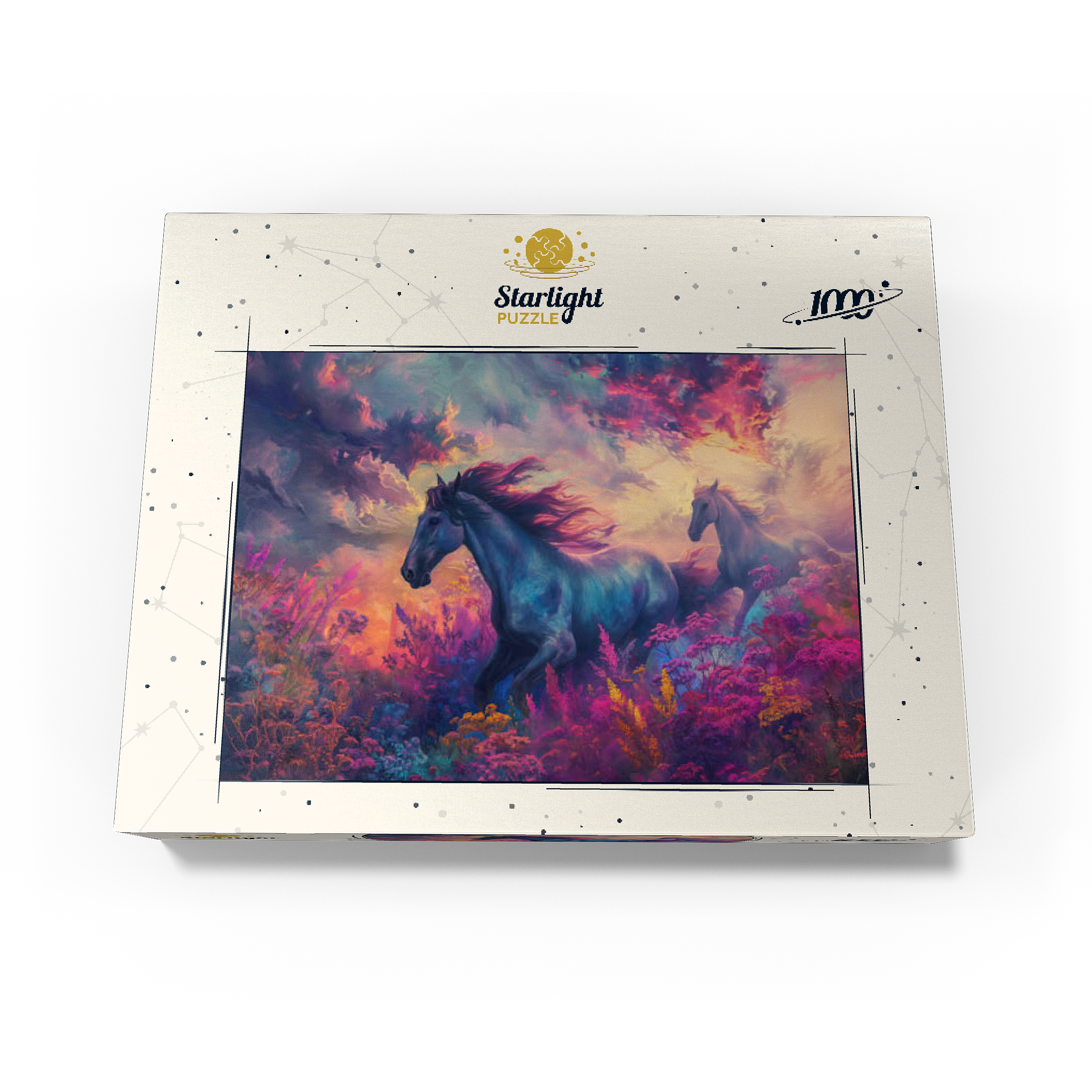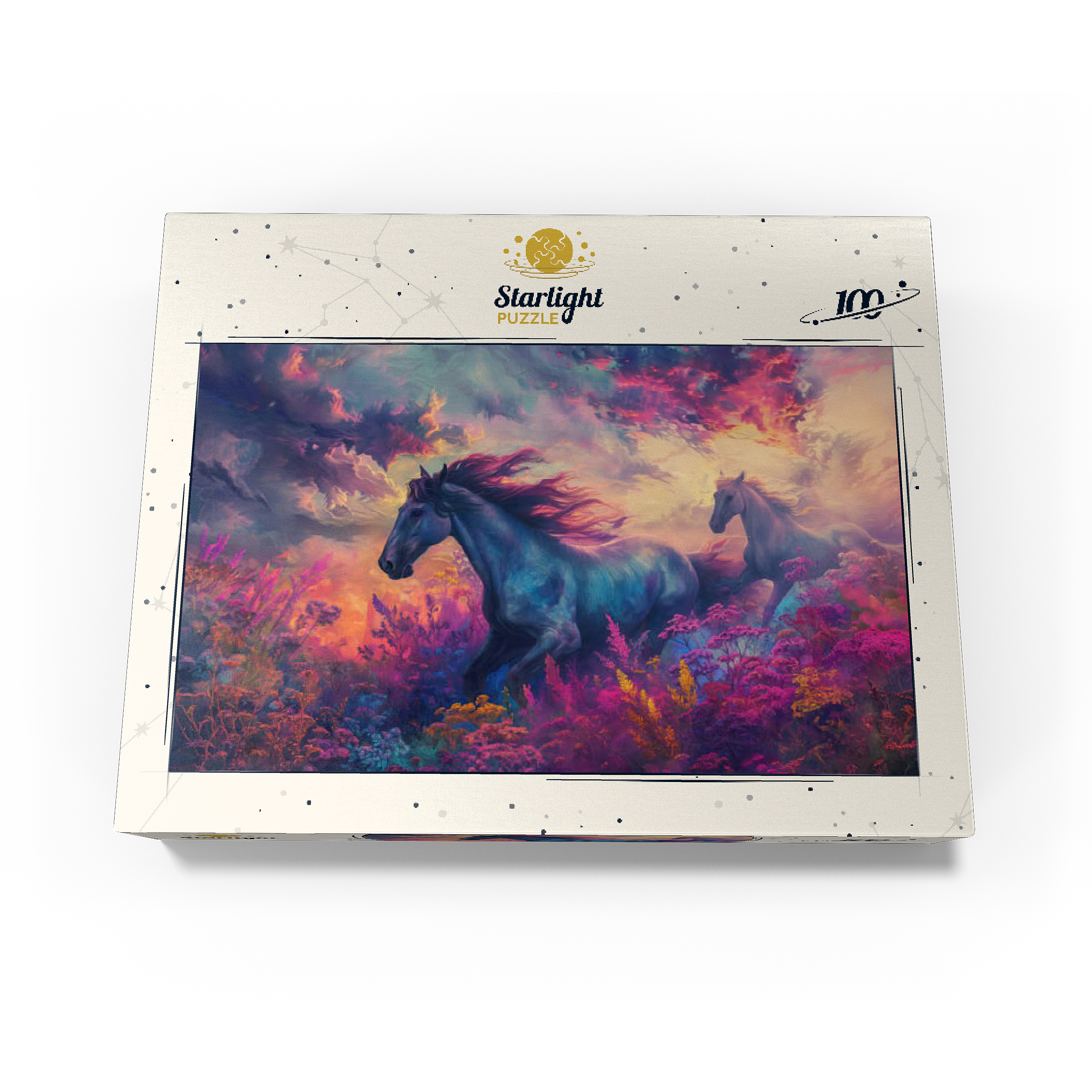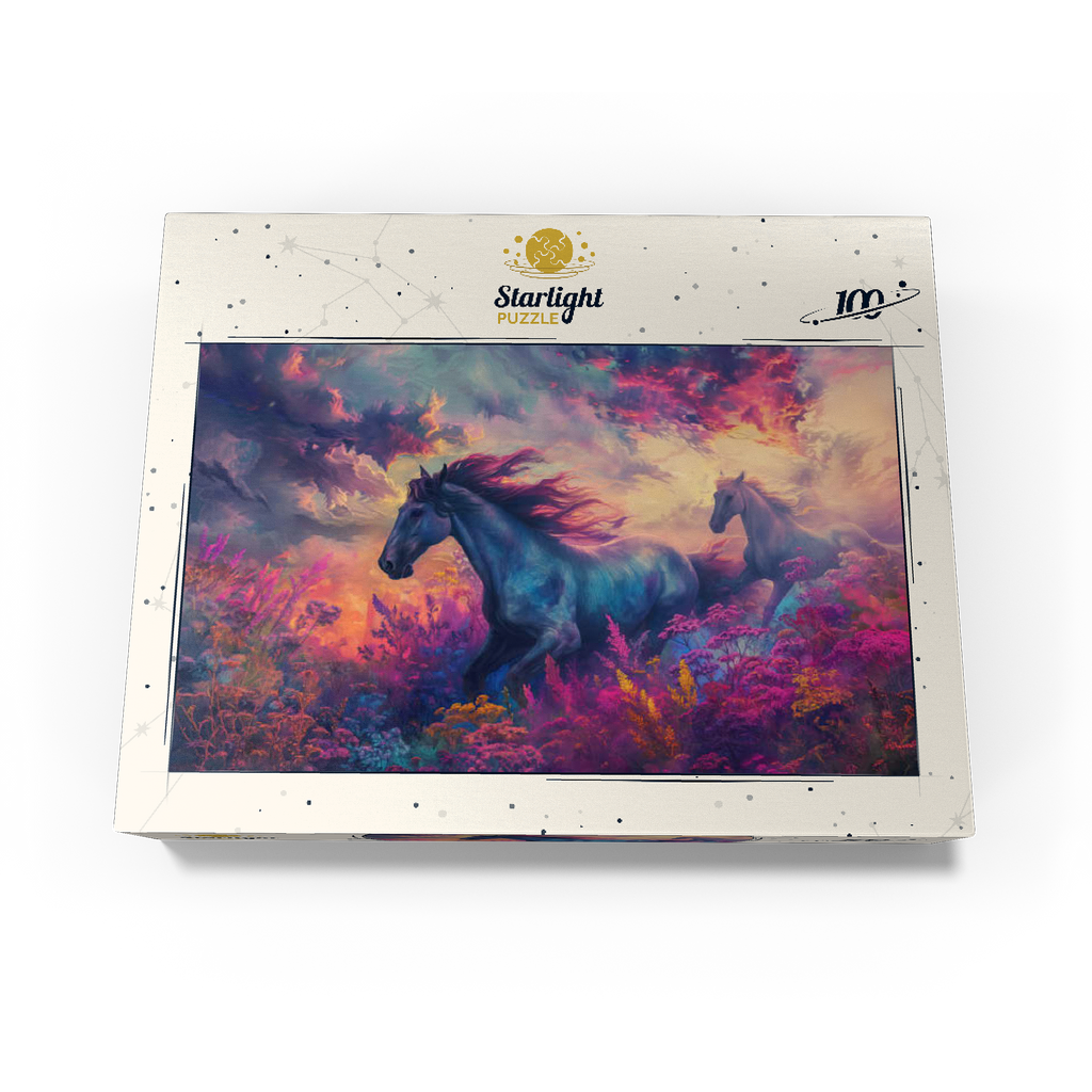 This breathtaking artwork portrays two majestic horses galloping through a surreal, vividly colored landscape. the scene is alive with hues of purple, pink, orange, and blue, blending seamlessly into the dramatic sky filled with swirling clouds. the horses, with their flowing manes and muscular forms, exude grace and power, embodying the spirit of freedom. the vibrant flora adds depth and texture, creating a harmonious fusion of nature and fantasy. this image captures the wild beauty of horses amidst an imaginative dreamscape, making it a true masterpiece.