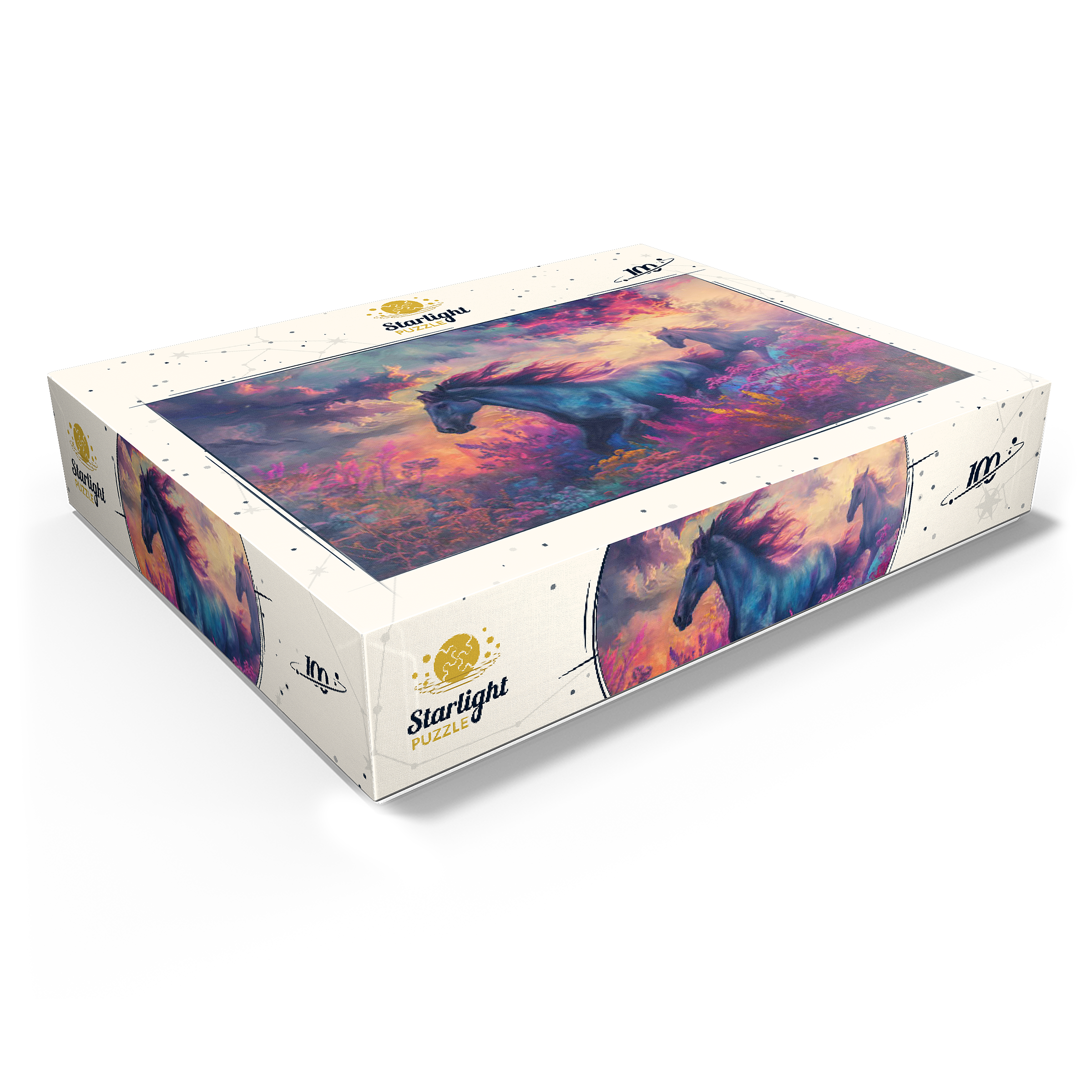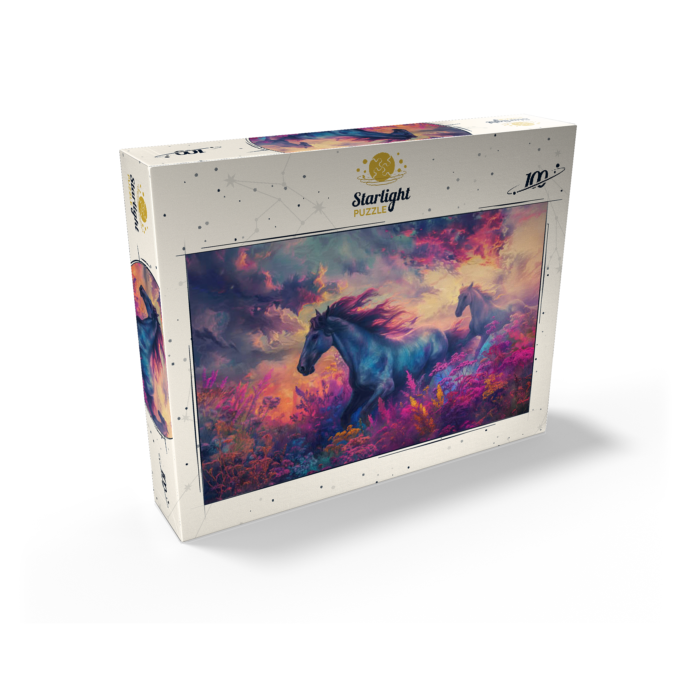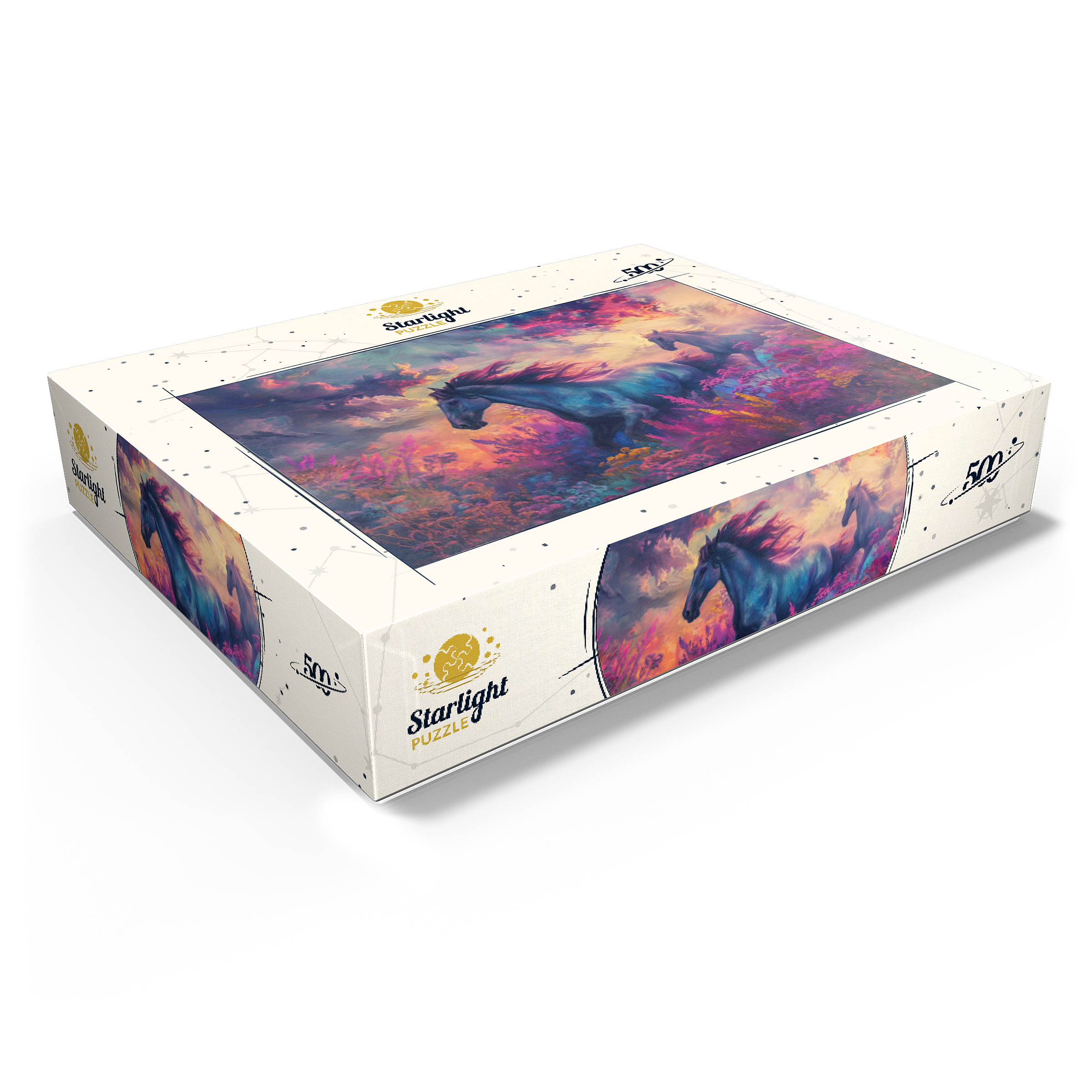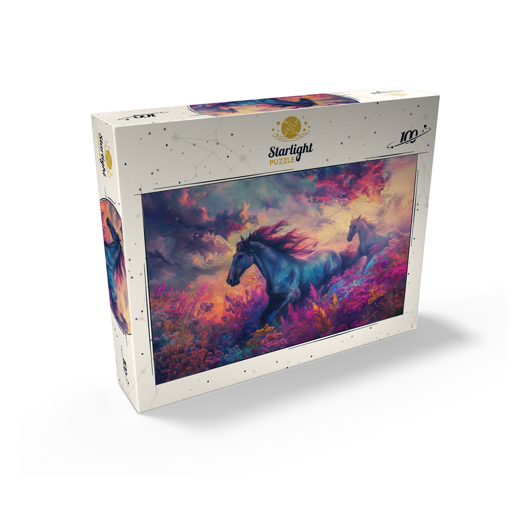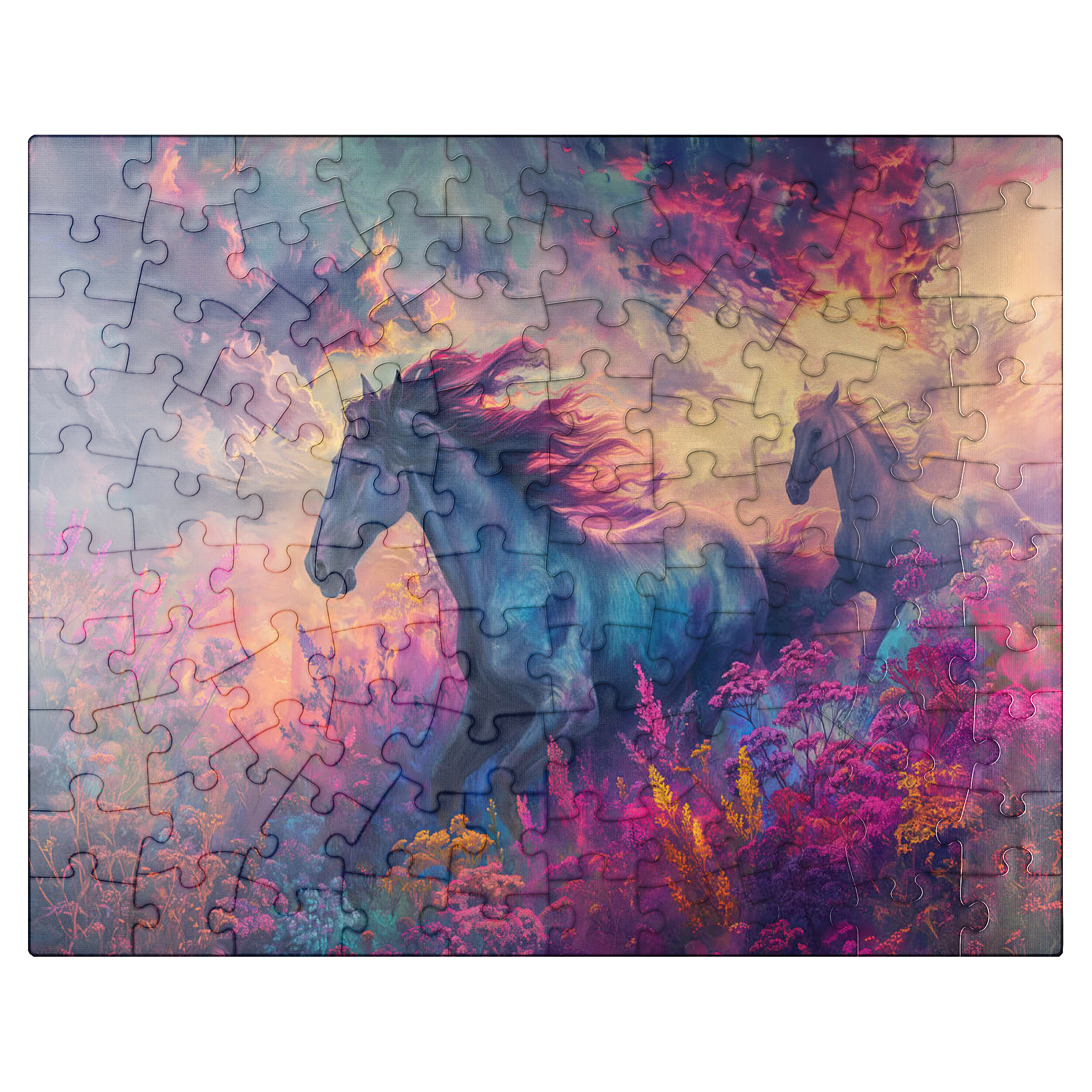 This breathtaking artwork portrays two majestic horses galloping through a surreal, vividly colored landscape. the scene is alive with hues of purple, pink, orange, and blue, blending seamlessly into the dramatic sky filled with swirling clouds. the horses, with their flowing manes and muscular forms, exude grace and power, embodying the spirit of freedom. the vibrant flora adds depth and texture, creating a harmonious fusion of nature and fantasy. this image captures the wild beauty of horses amidst an imaginative dreamscape, making it a true masterpiece.
