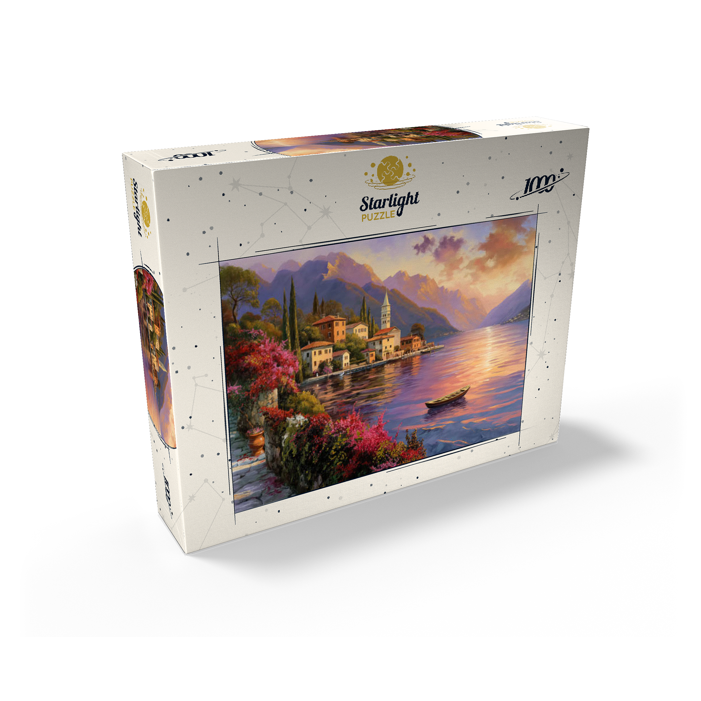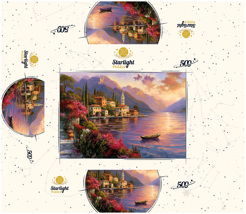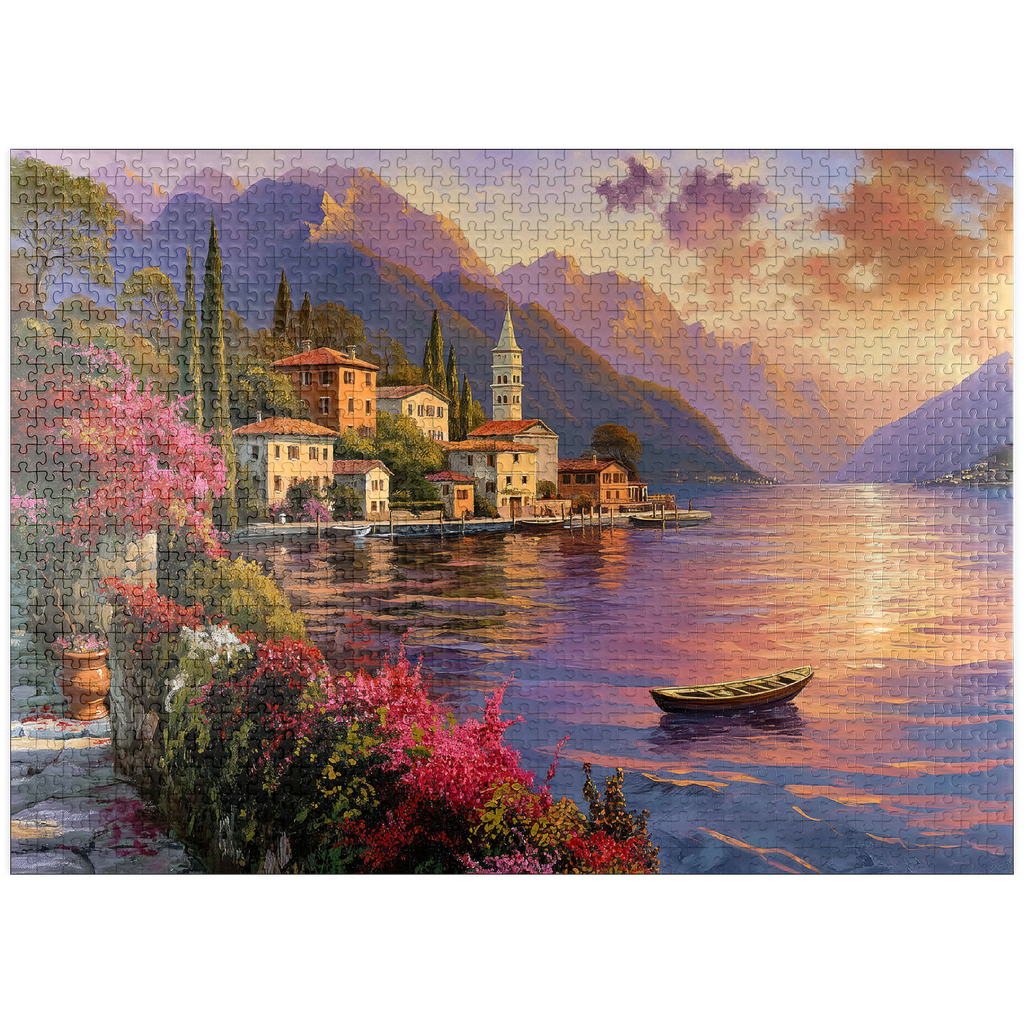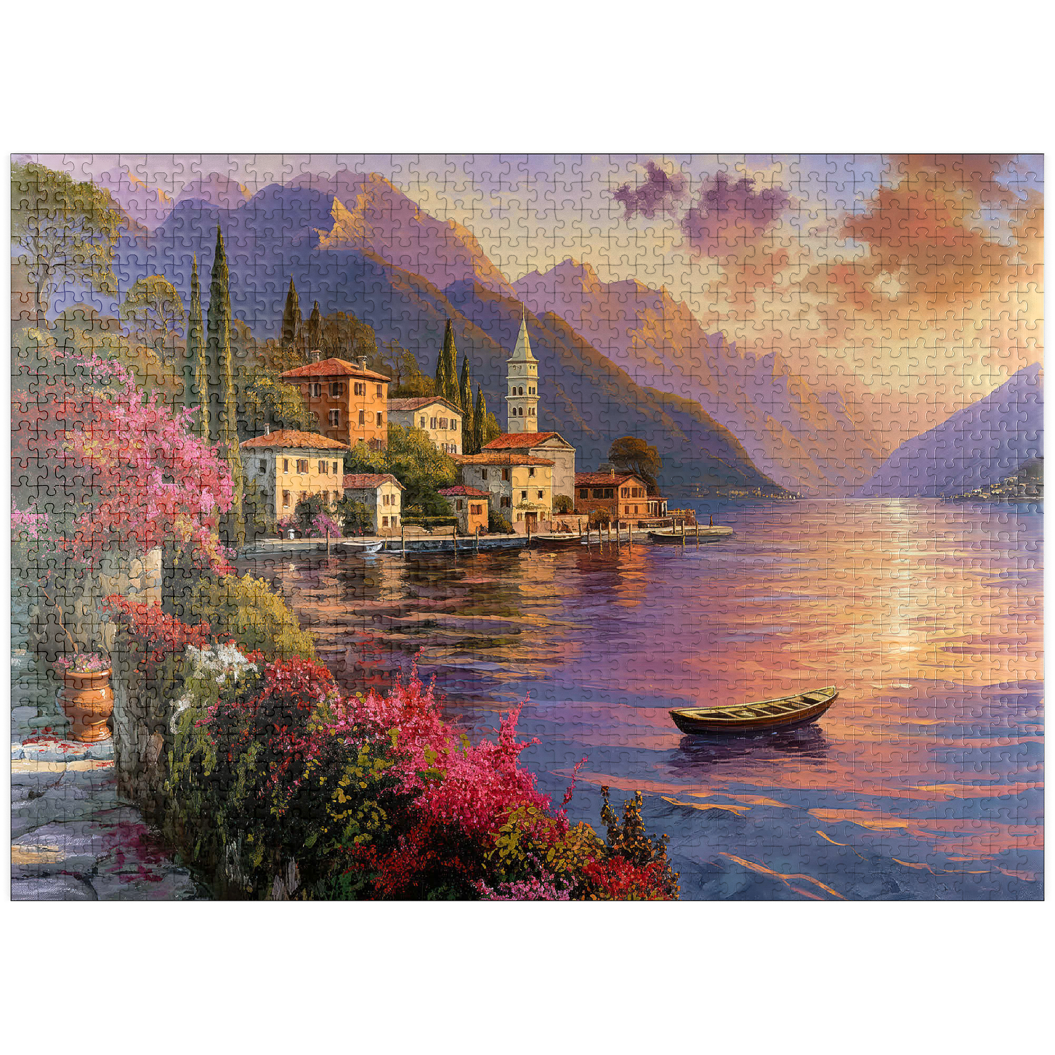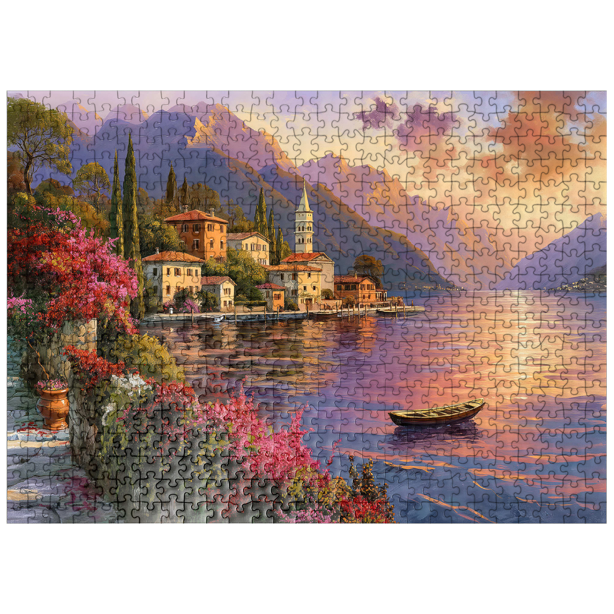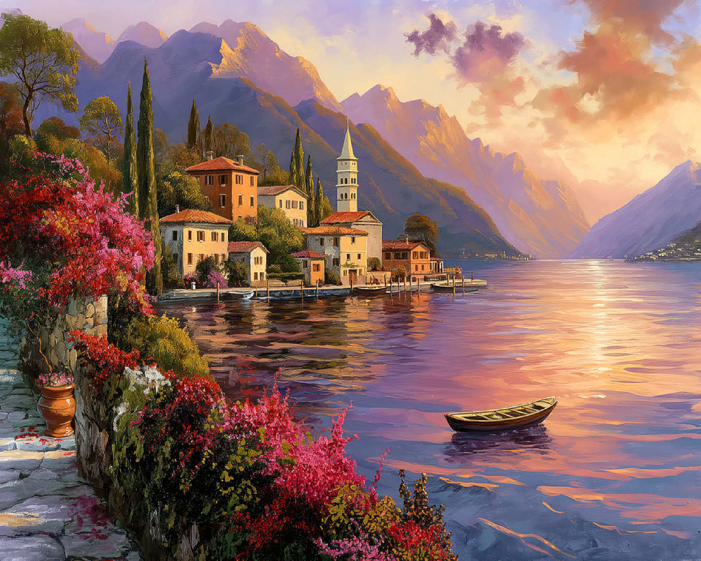 This enchanting artwork showcases a picturesque village on the shores of Lake Como, illuminated by the soft glow of a golden sunset. Vibrant pink and red bougainvillea frame a stone pathway leading to charming Mediterranean-style houses with terracotta roofs. A serene wooden boat floats on the tranquil water, reflecting the warm hues of the sky and surrounding mountains. Towering cypress trees and a graceful church steeple add to the idyllic atmosphere. The dramatic backdrop of purple-hued mountains completes this breathtaking scene, capturing the timeless beauty of Italy's famous Lake Como.