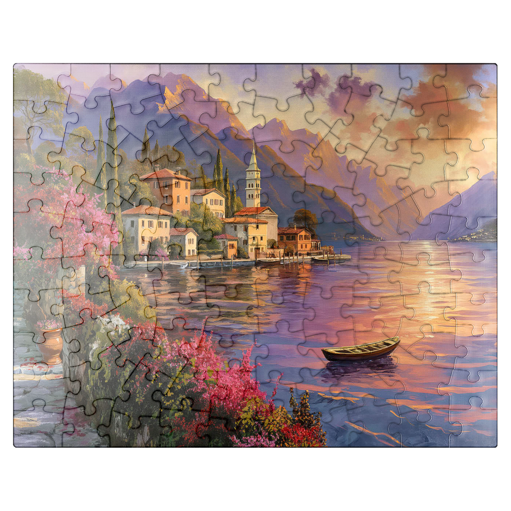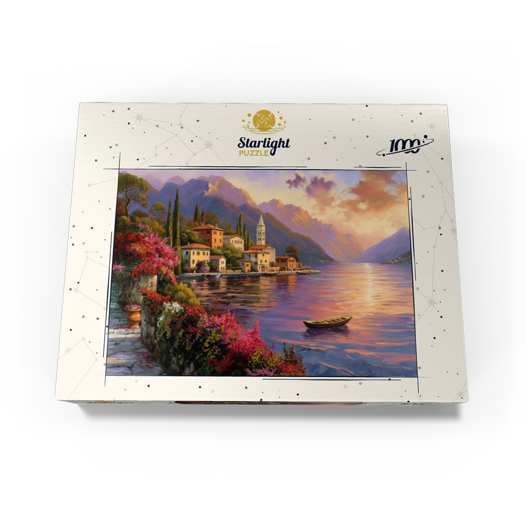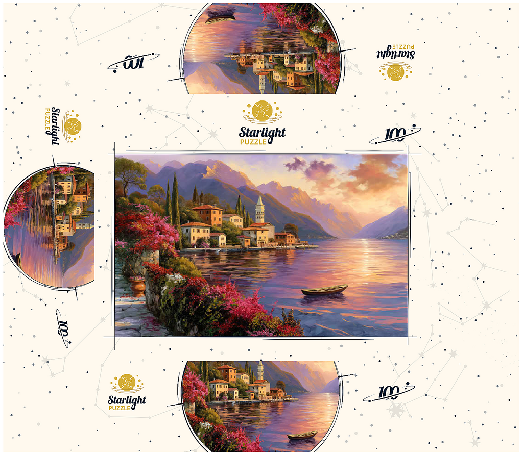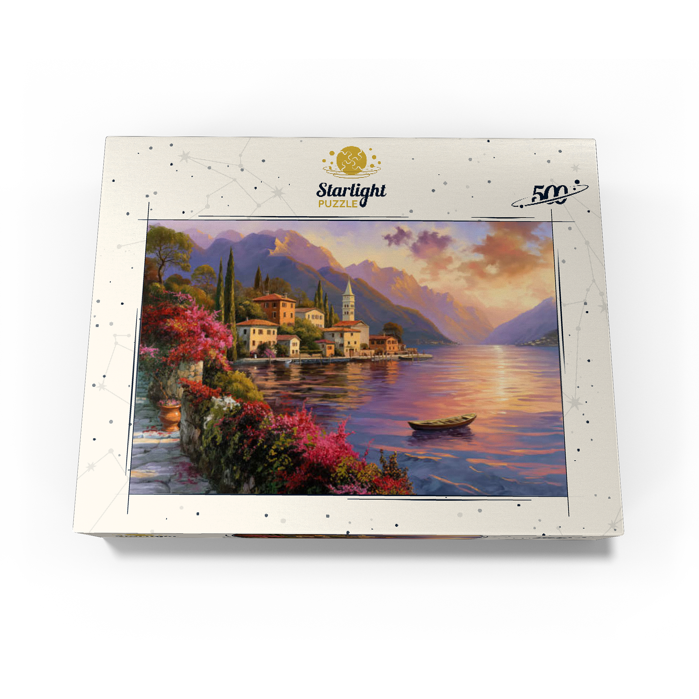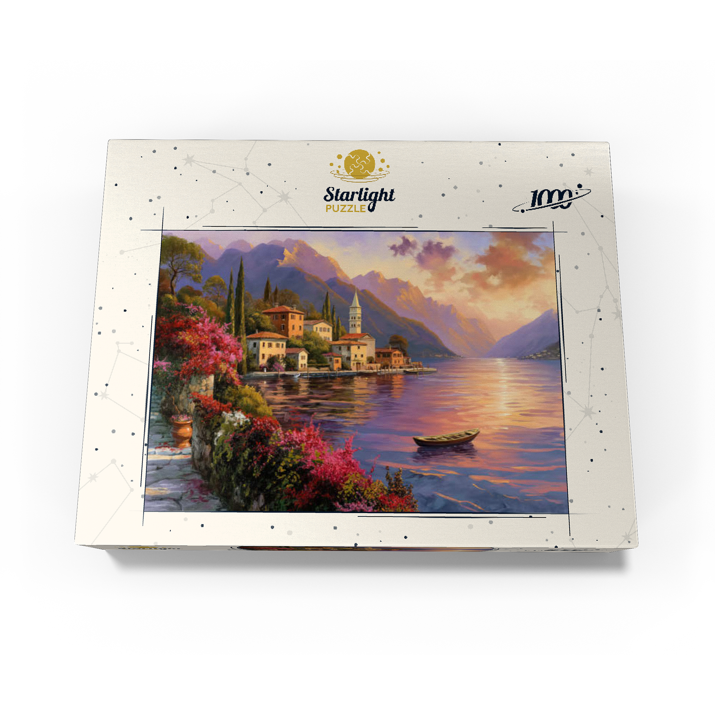 This enchanting artwork showcases a picturesque village on the shores of Lake Como, illuminated by the soft glow of a golden sunset. Vibrant pink and red bougainvillea frame a stone pathway leading to charming Mediterranean-style houses with terracotta roofs. A serene wooden boat floats on the tranquil water, reflecting the warm hues of the sky and surrounding mountains. Towering cypress trees and a graceful church steeple add to the idyllic atmosphere. The dramatic backdrop of purple-hued mountains completes this breathtaking scene, capturing the timeless beauty of Italy's famous Lake Como.