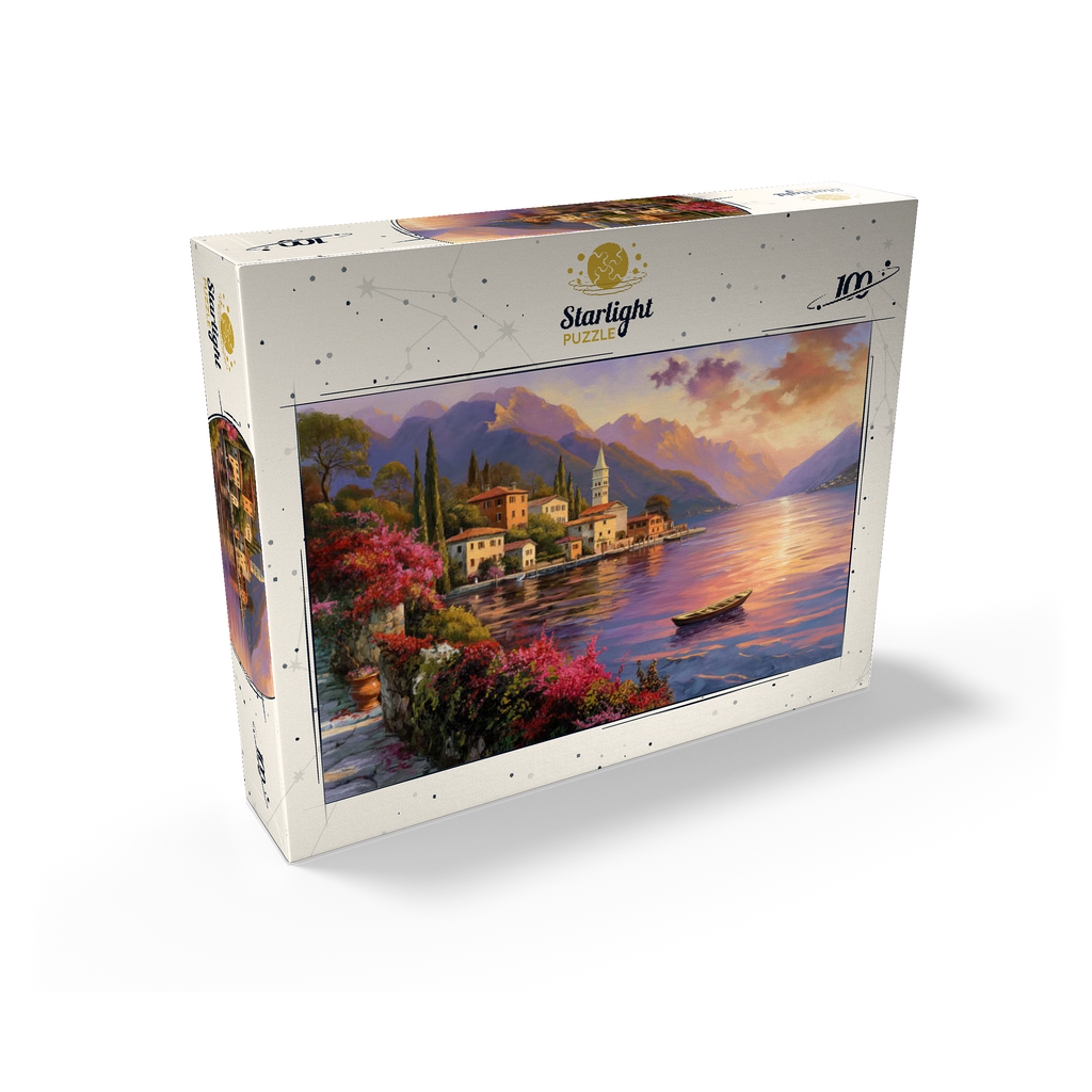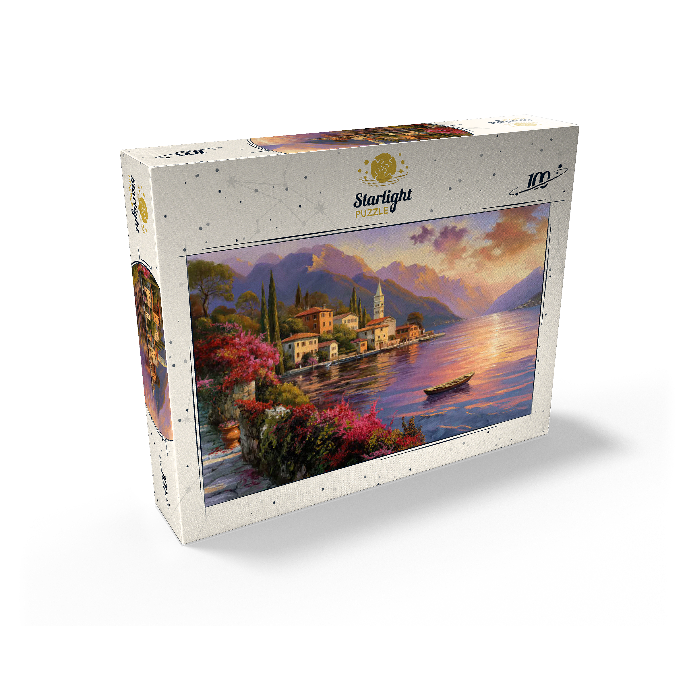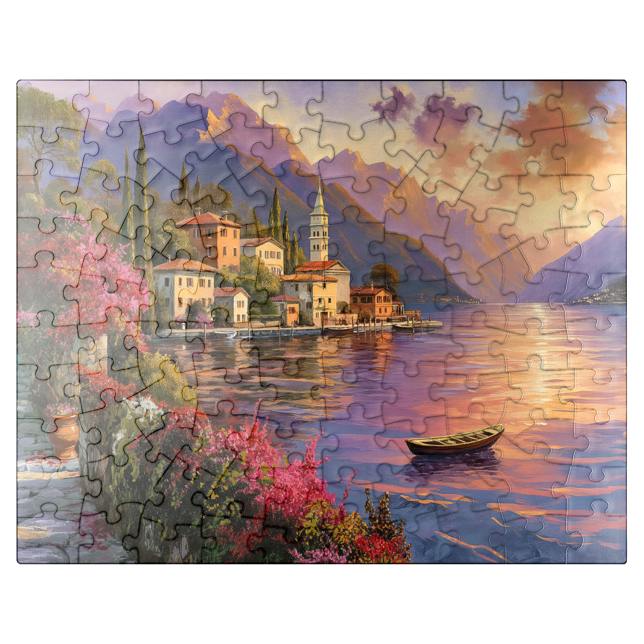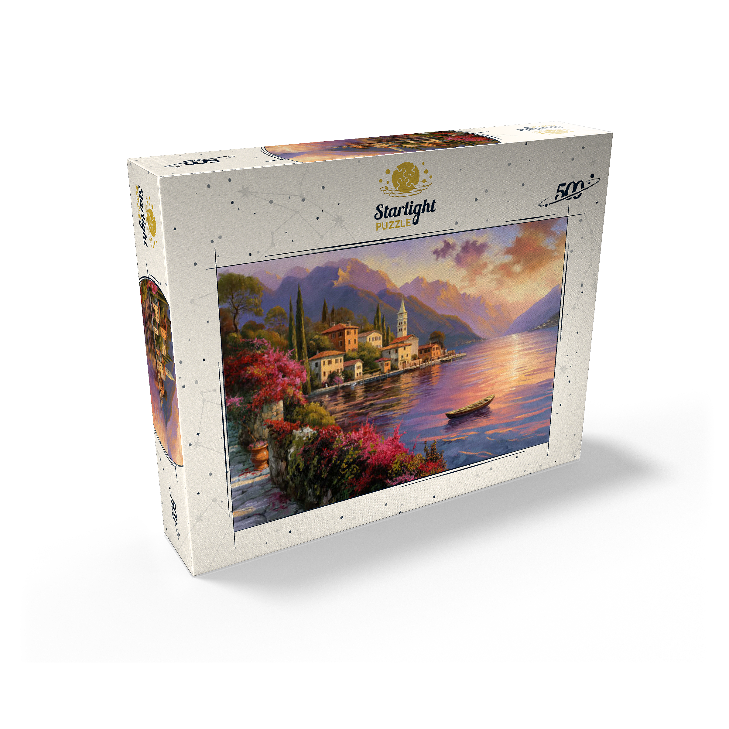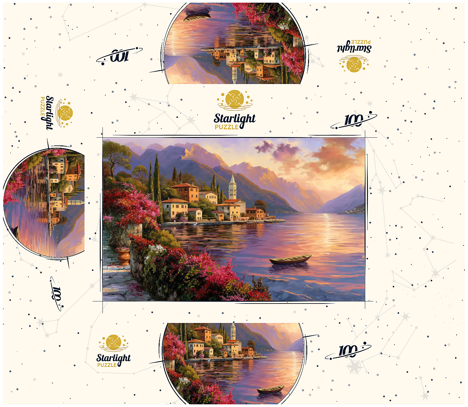 This enchanting artwork showcases a picturesque village on the shores of Lake Como, illuminated by the soft glow of a golden sunset. Vibrant pink and red bougainvillea frame a stone pathway leading to charming Mediterranean-style houses with terracotta roofs. A serene wooden boat floats on the tranquil water, reflecting the warm hues of the sky and surrounding mountains. Towering cypress trees and a graceful church steeple add to the idyllic atmosphere. The dramatic backdrop of purple-hued mountains completes this breathtaking scene, capturing the timeless beauty of Italy's famous Lake Como.