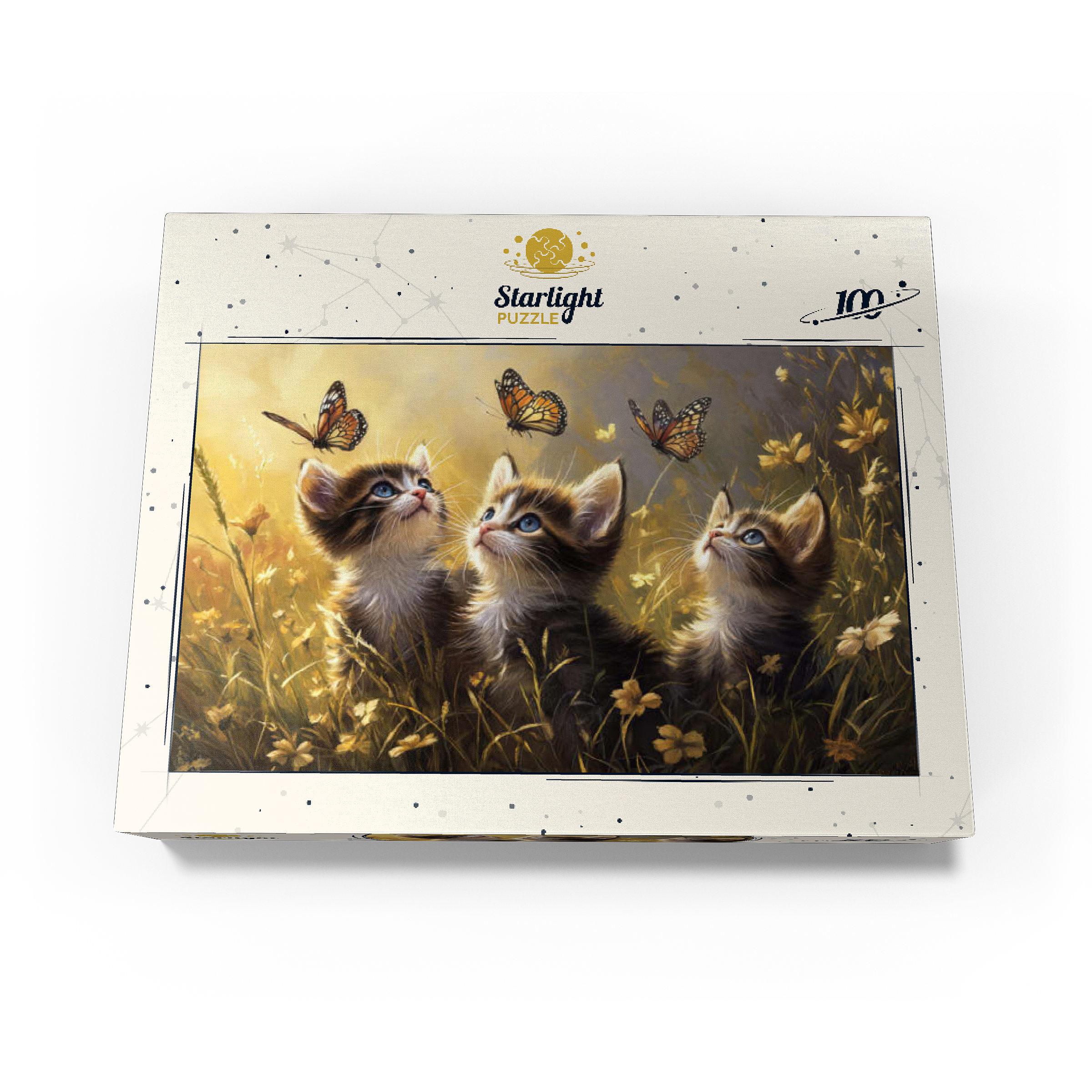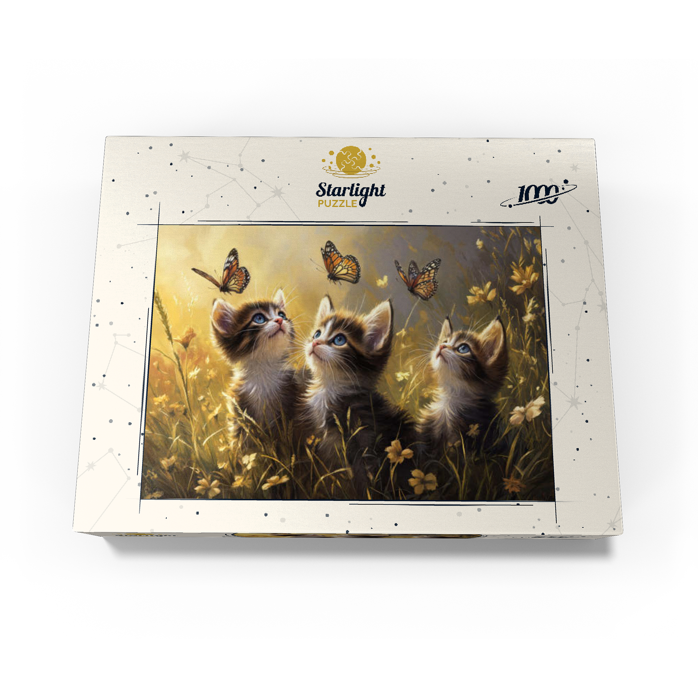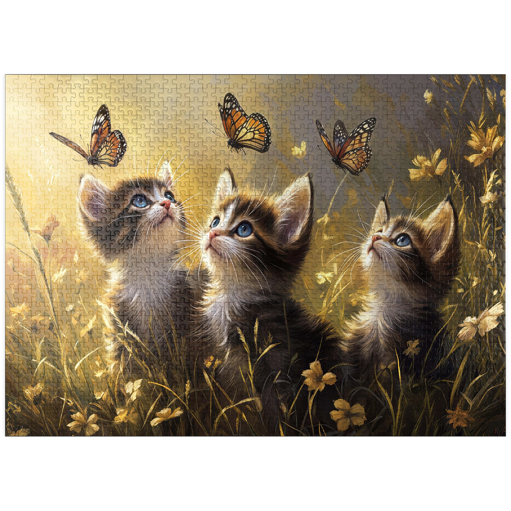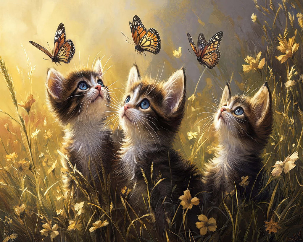 This image showcases three adorable kittens sitting amidst golden wildflowers, their bright blue eyes fixed on the delicate monarch butterflies fluttering above them. The warm light of a sunny day bathes the scene, highlighting the soft fur of the kittens and the intricate patterns of the butterflies wings. The playful yet serene atmosphere captures the essence of curiosity and the beauty of nature's gentle moments.