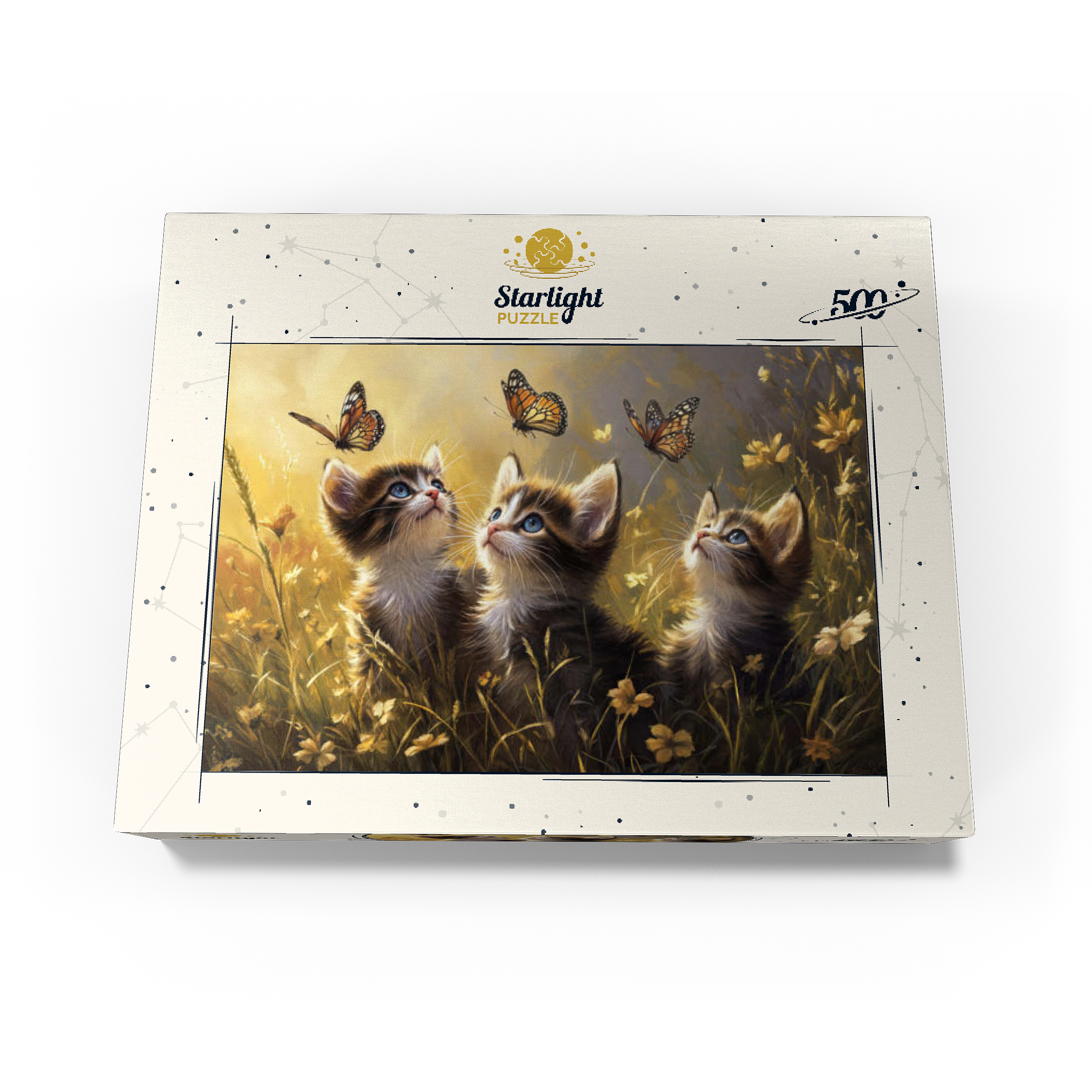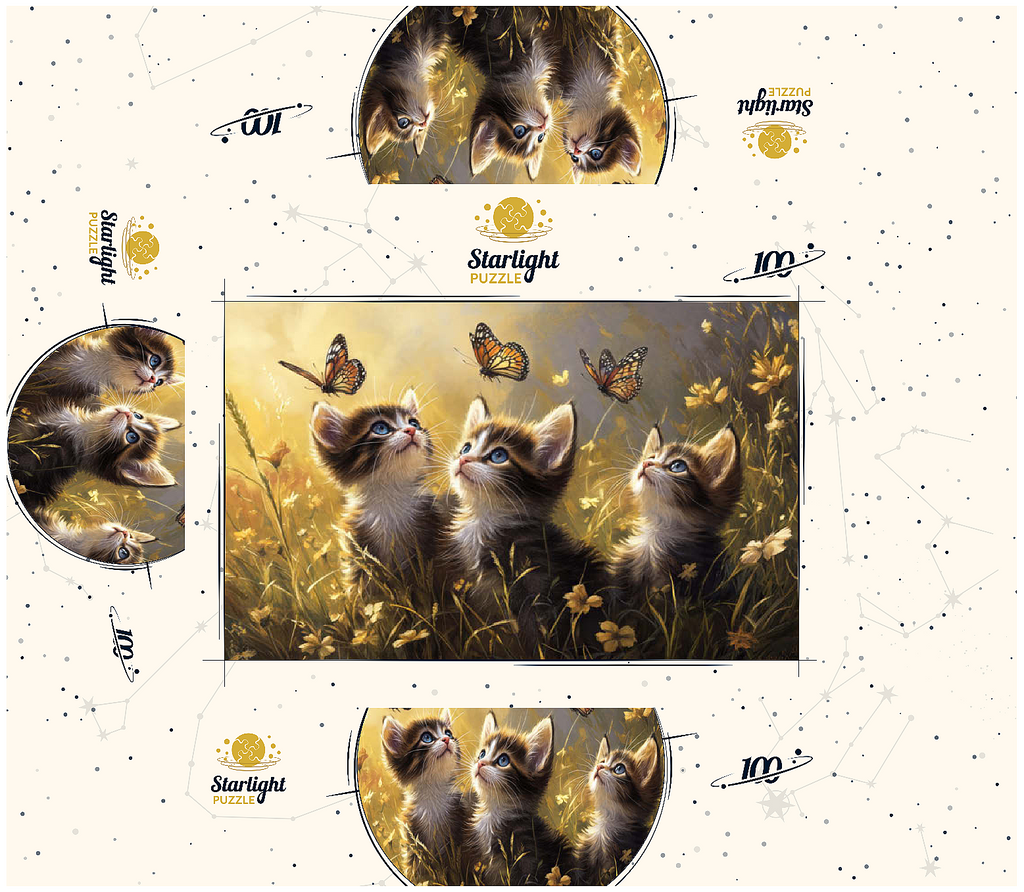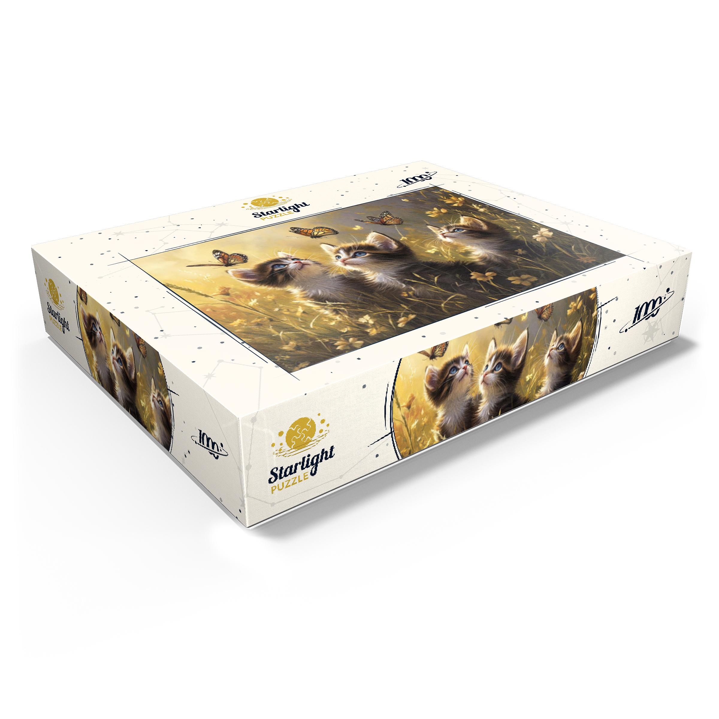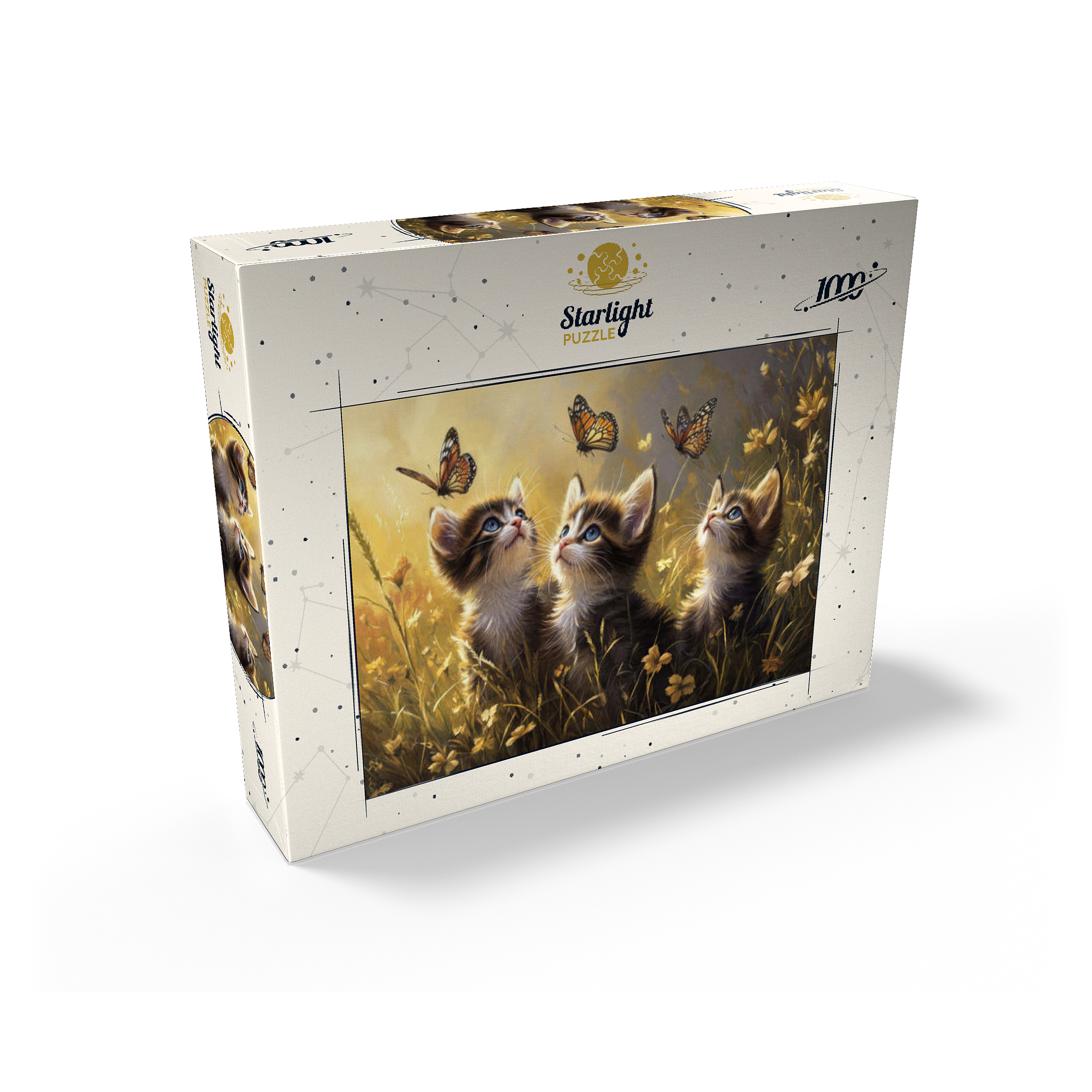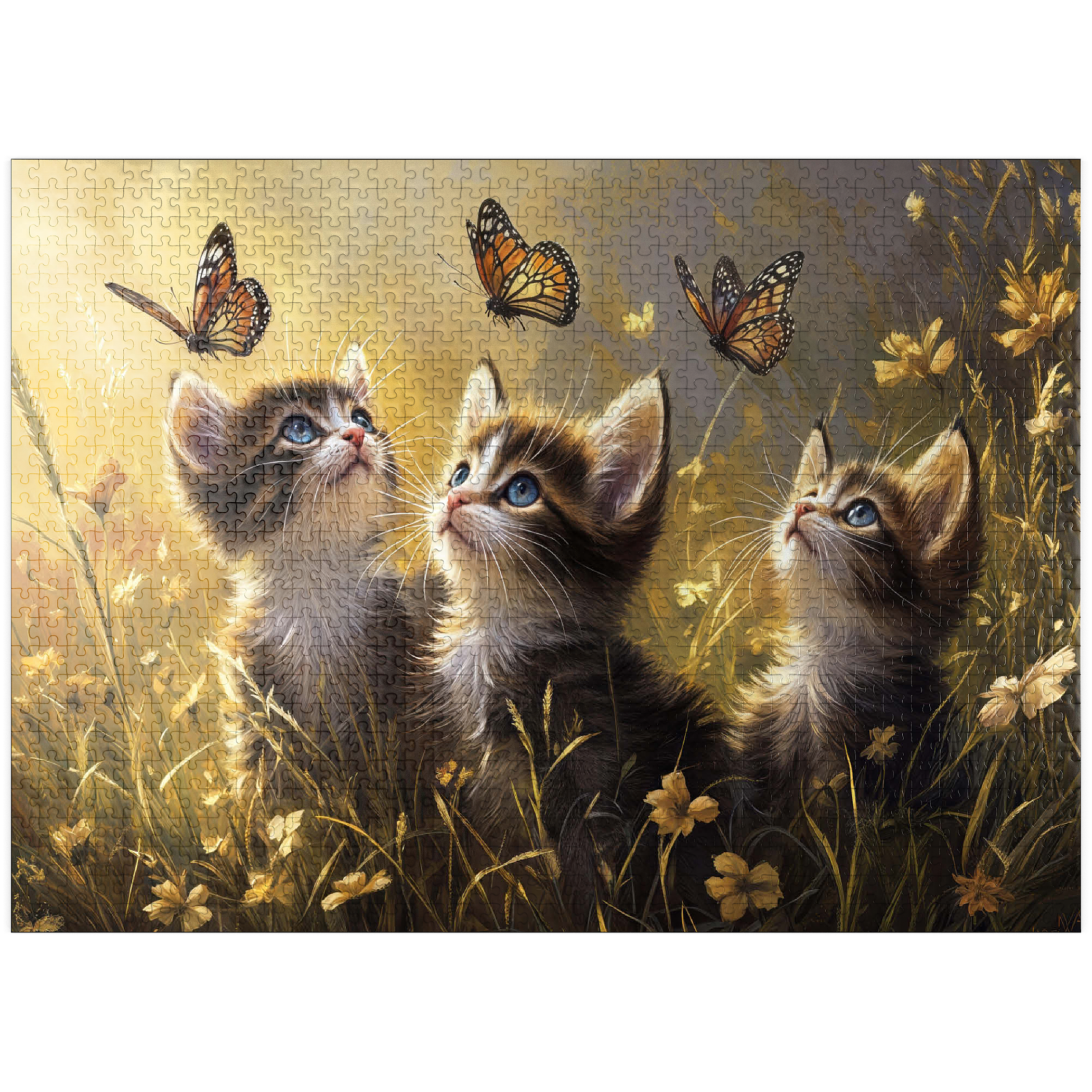 This image showcases three adorable kittens sitting amidst golden wildflowers, their bright blue eyes fixed on the delicate monarch butterflies fluttering above them. The warm light of a sunny day bathes the scene, highlighting the soft fur of the kittens and the intricate patterns of the butterflies wings. The playful yet serene atmosphere captures the essence of curiosity and the beauty of nature's gentle moments.