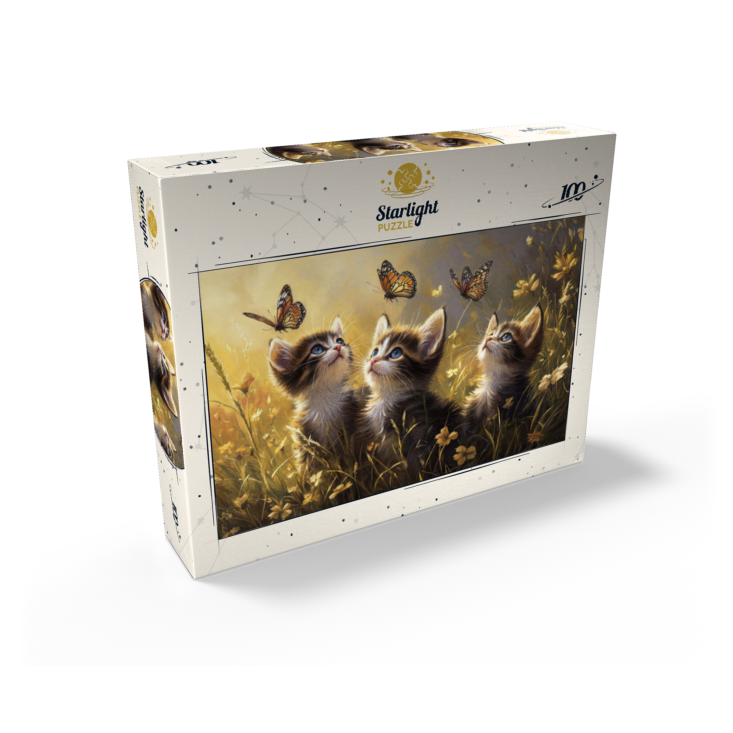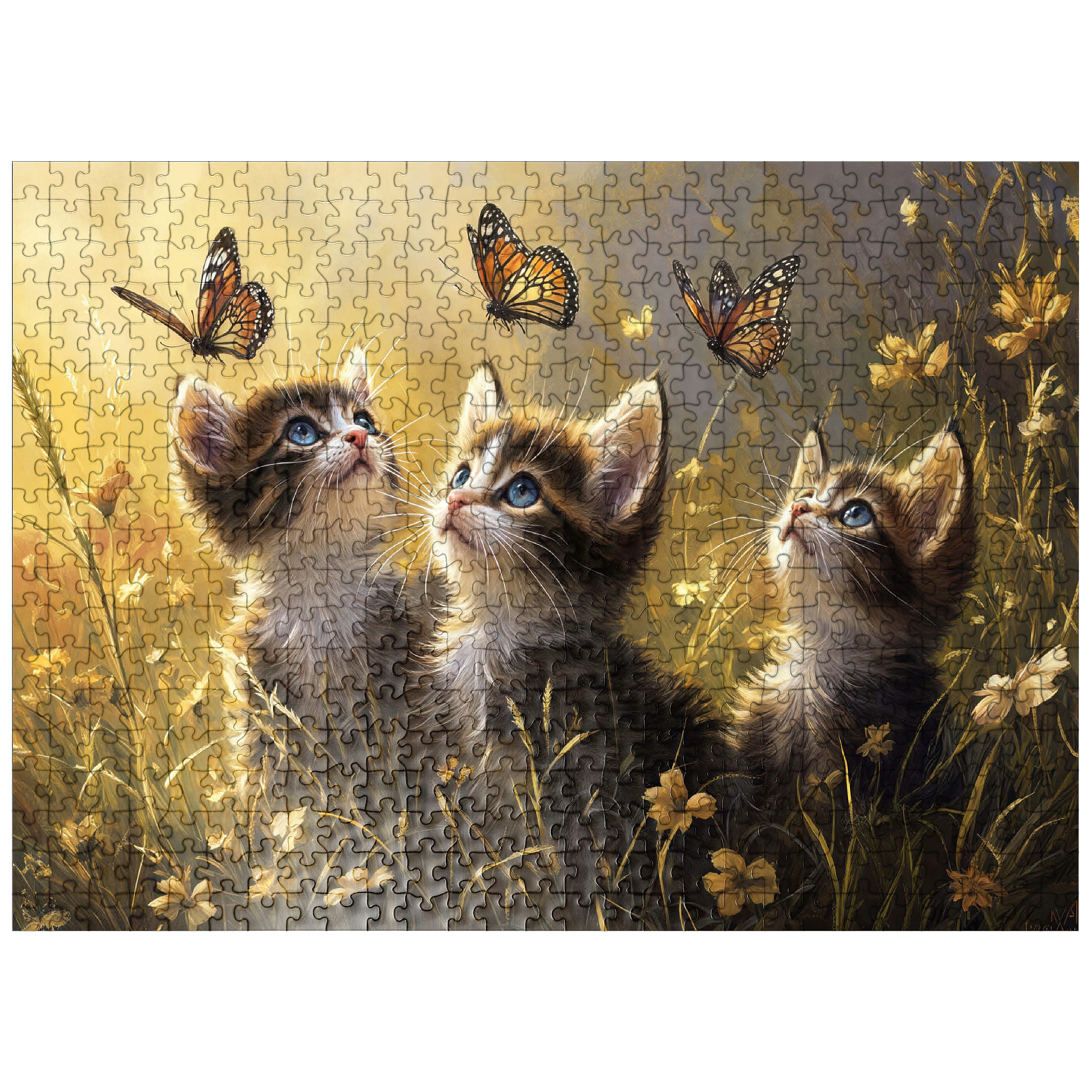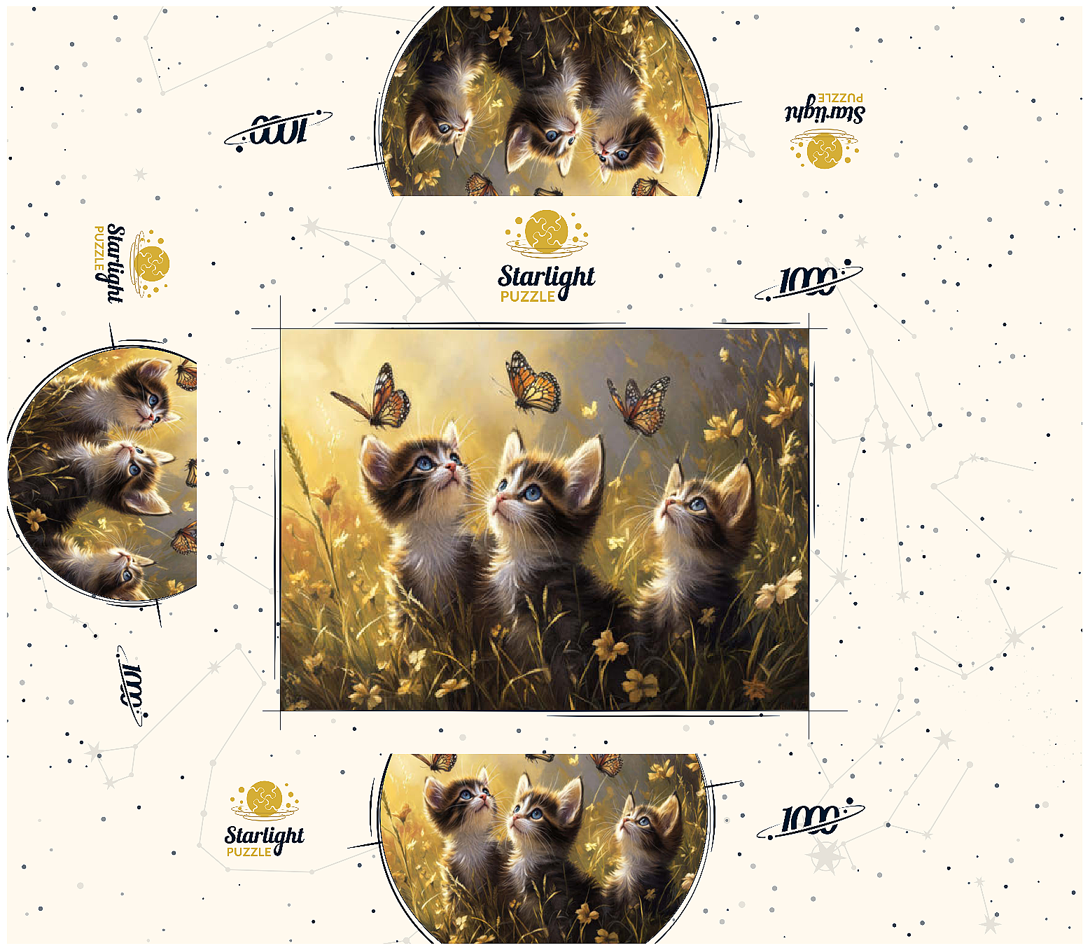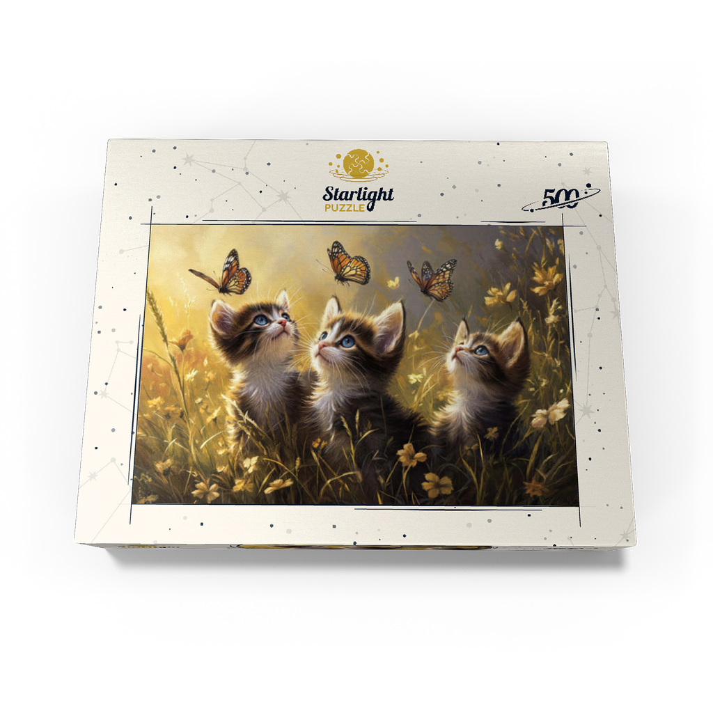 This image showcases three adorable kittens sitting amidst golden wildflowers, their bright blue eyes fixed on the delicate monarch butterflies fluttering above them. The warm light of a sunny day bathes the scene, highlighting the soft fur of the kittens and the intricate patterns of the butterflies wings. The playful yet serene atmosphere captures the essence of curiosity and the beauty of nature's gentle moments.