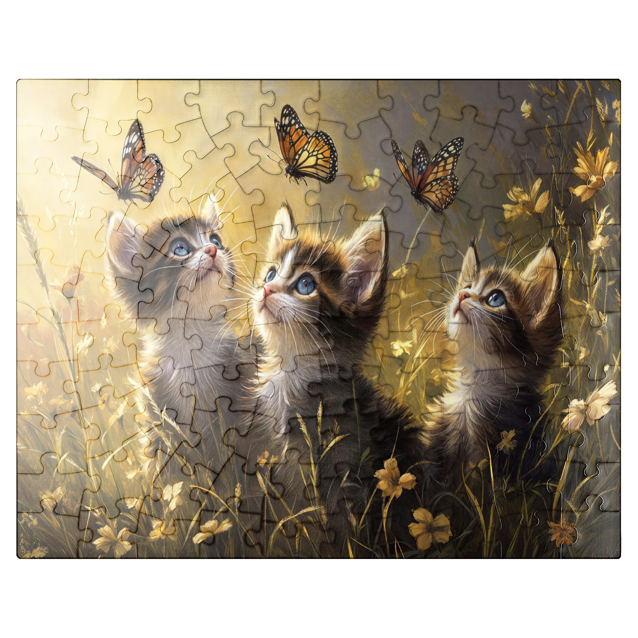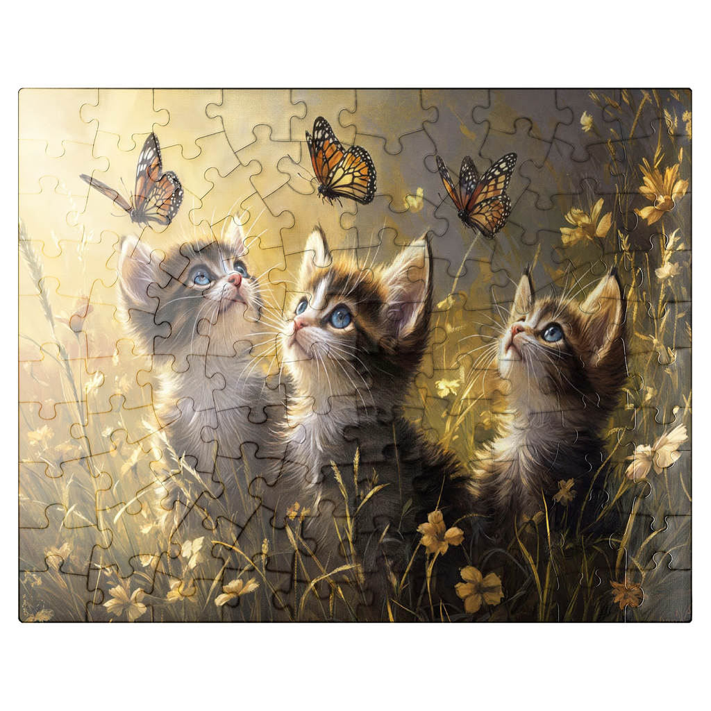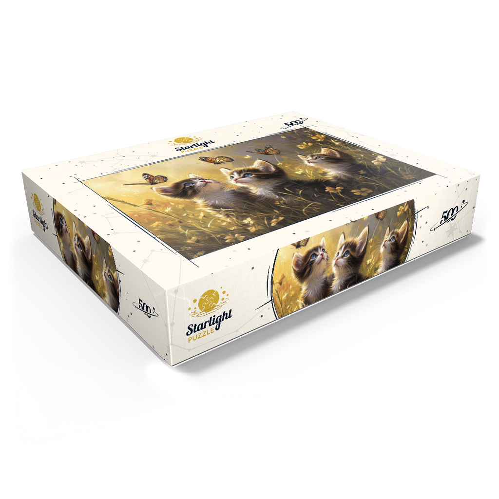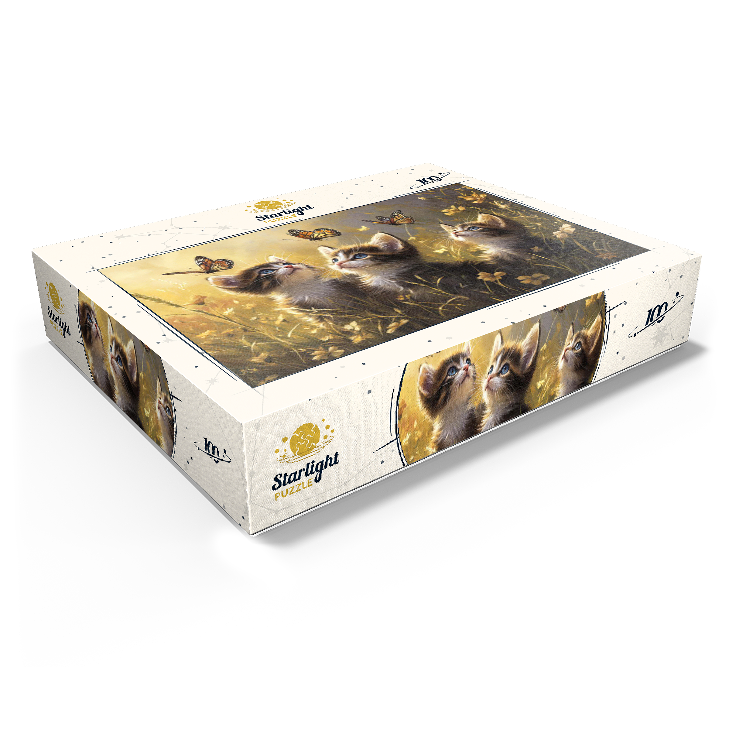 This image showcases three adorable kittens sitting amidst golden wildflowers, their bright blue eyes fixed on the delicate monarch butterflies fluttering above them. The warm light of a sunny day bathes the scene, highlighting the soft fur of the kittens and the intricate patterns of the butterflies wings. The playful yet serene atmosphere captures the essence of curiosity and the beauty of nature's gentle moments.