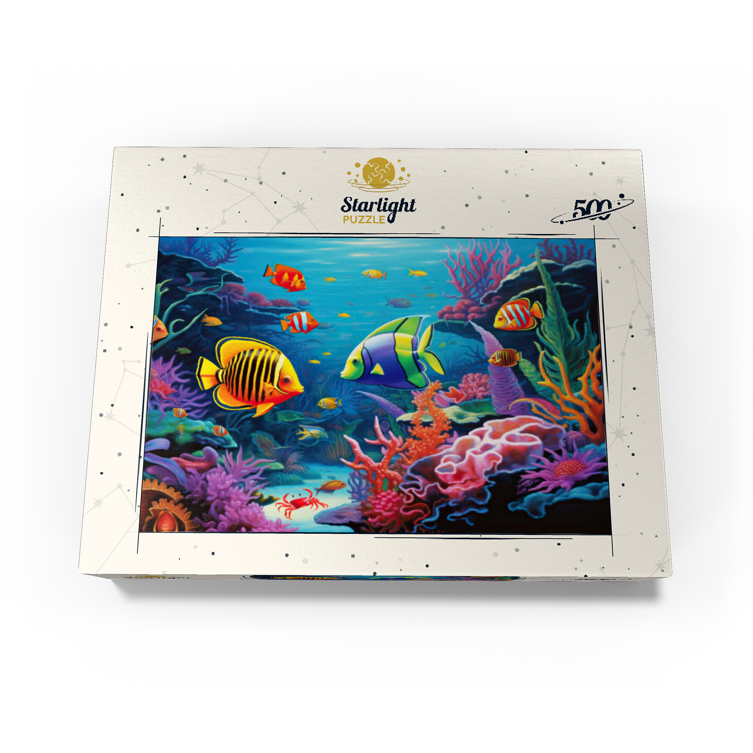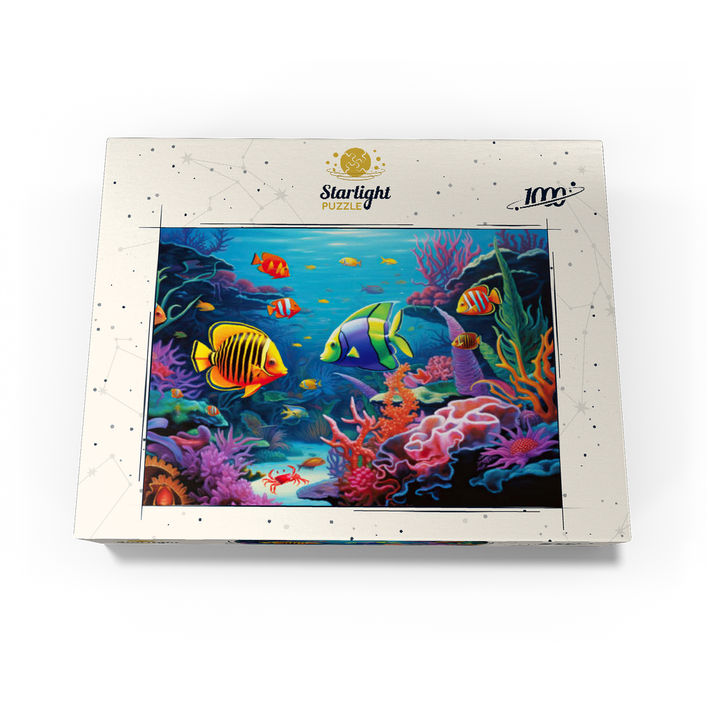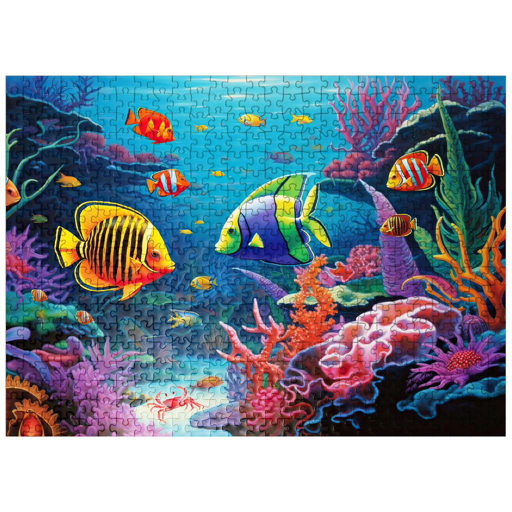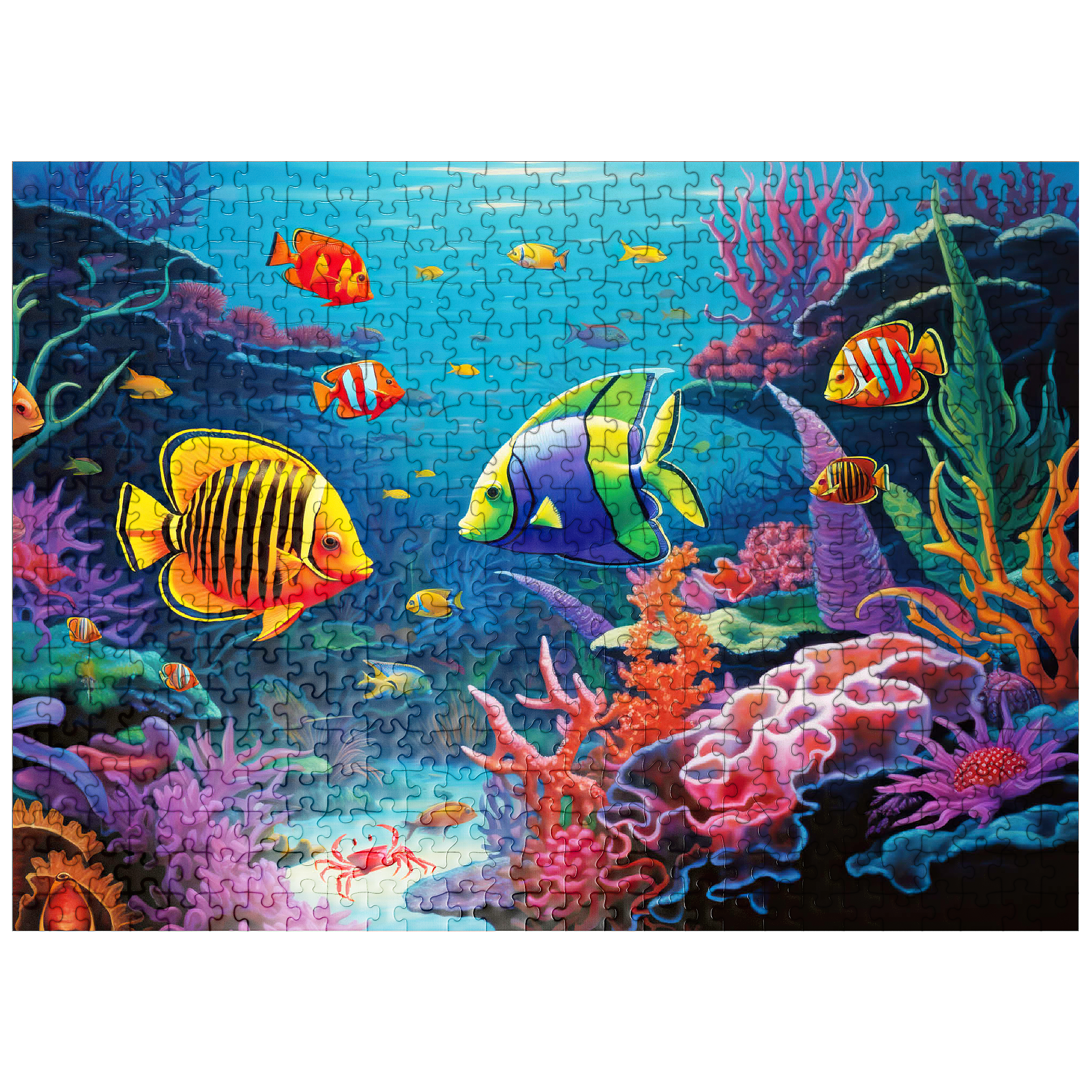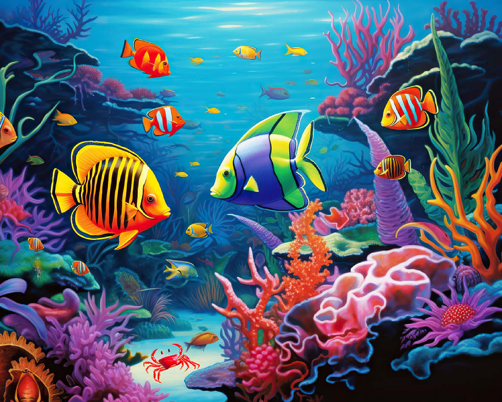 A mesmerizing underwater world filled with colorful tropical fish swimming gracefully amidst vibrant coral formations. The reef showcases a diverse palette of marine life, from striped angelfish and bright clownfish to yellow tangs and vivid butterflyfish. Coral structures in shades of pink, orange, and purple provide a stunning backdrop, while a playful red crab scuttles across the sandy seabed. The crystal-clear water captures the sunlight, enhancing the brilliant colors and dynamic movement of this thriving aquatic paradise.