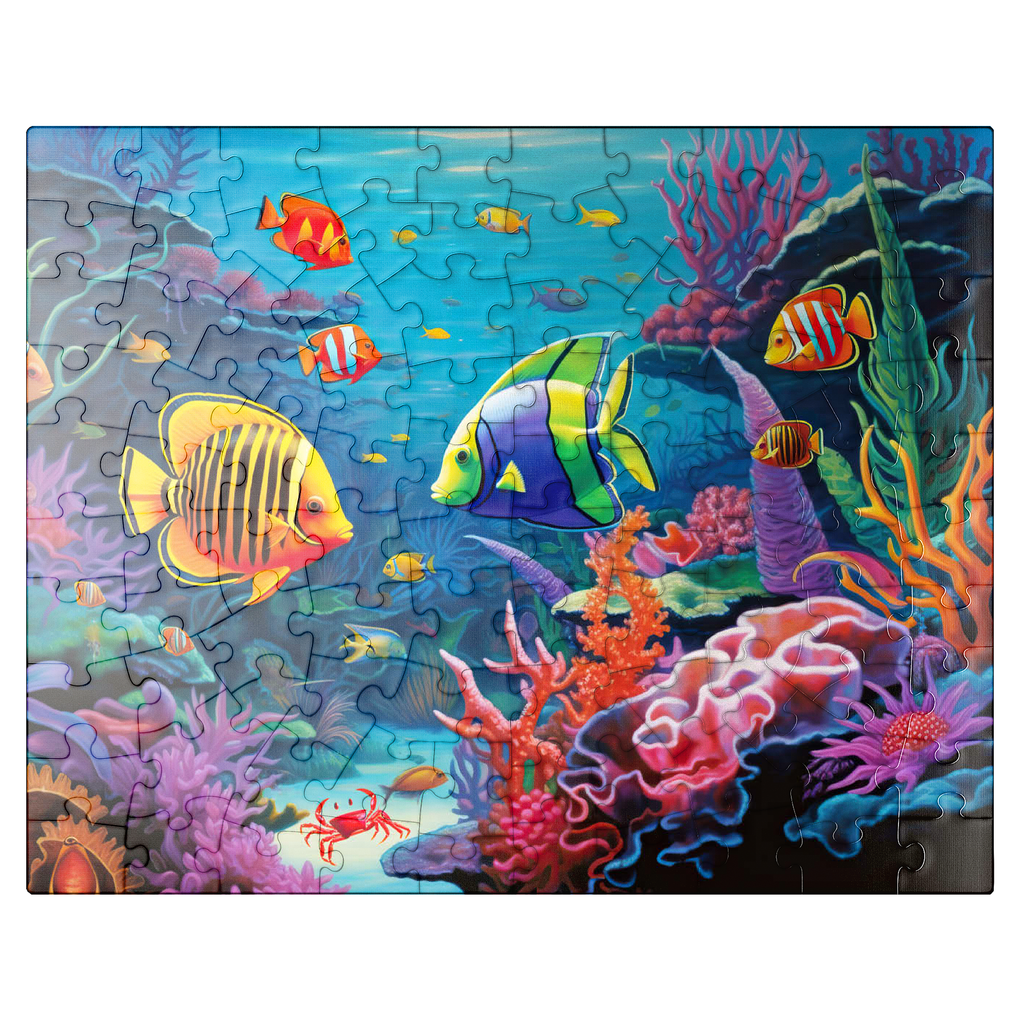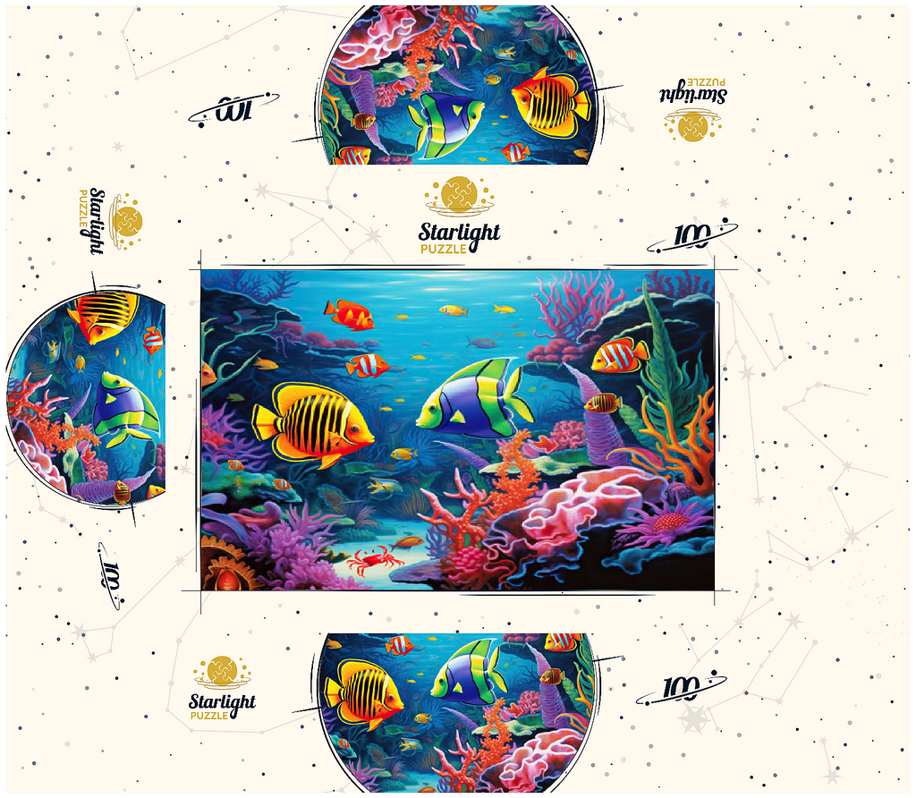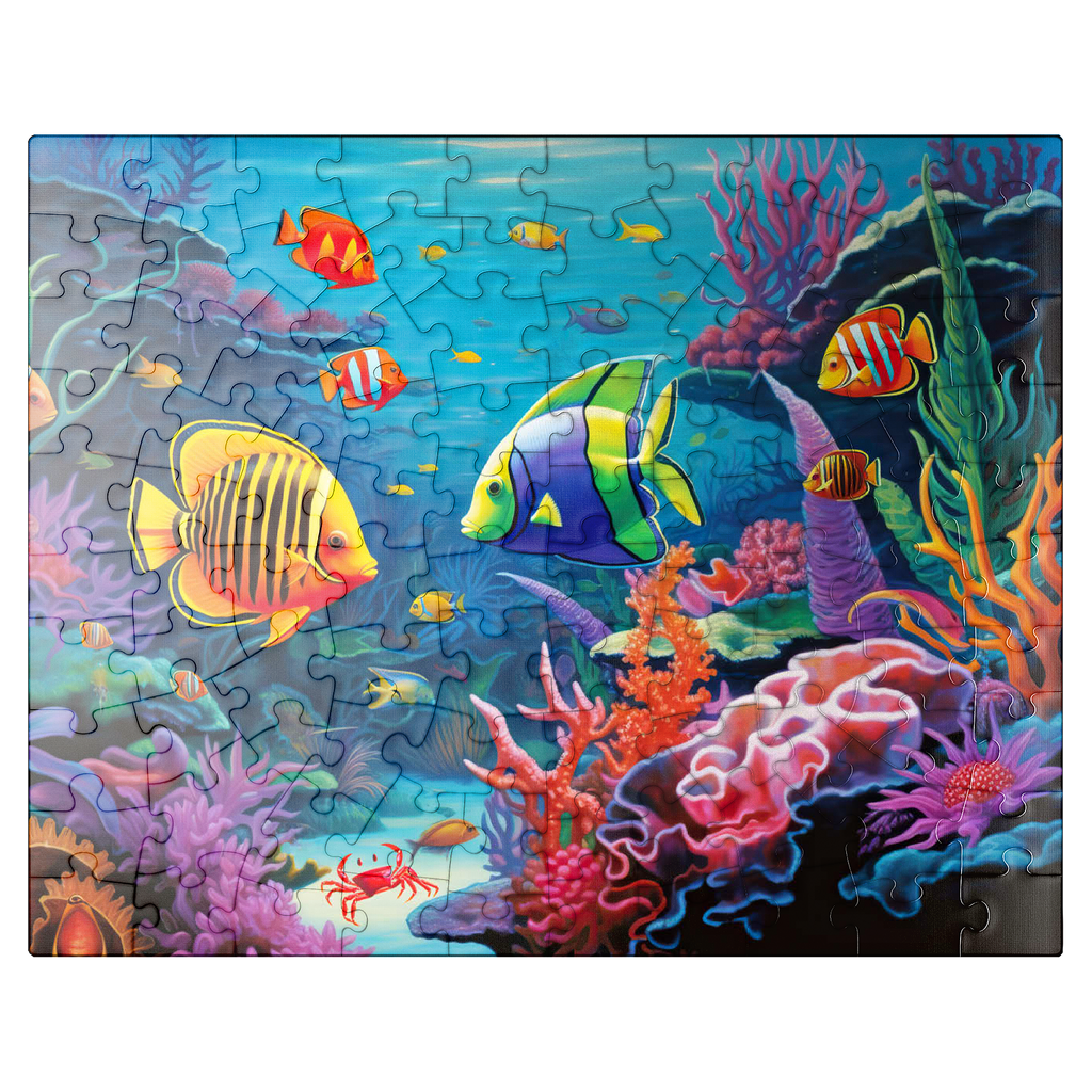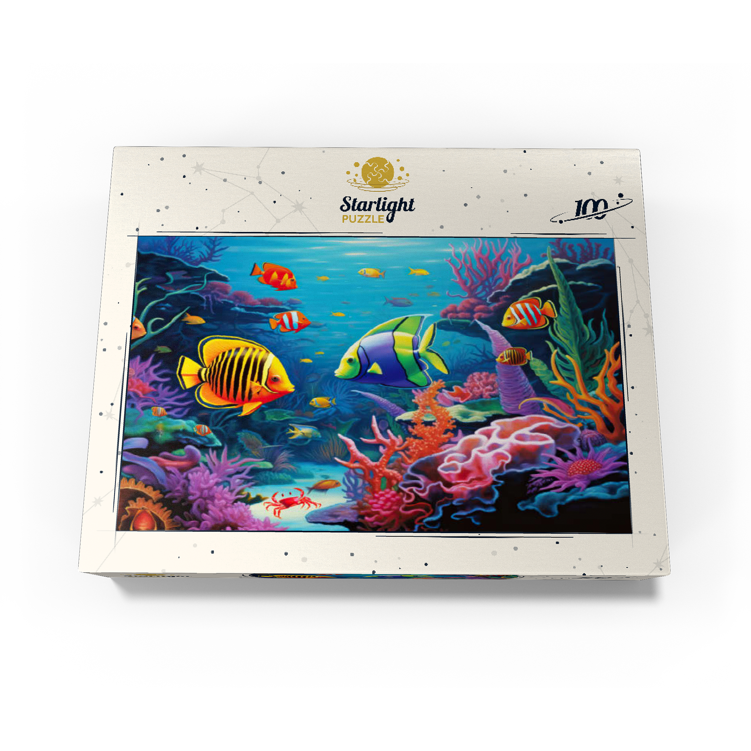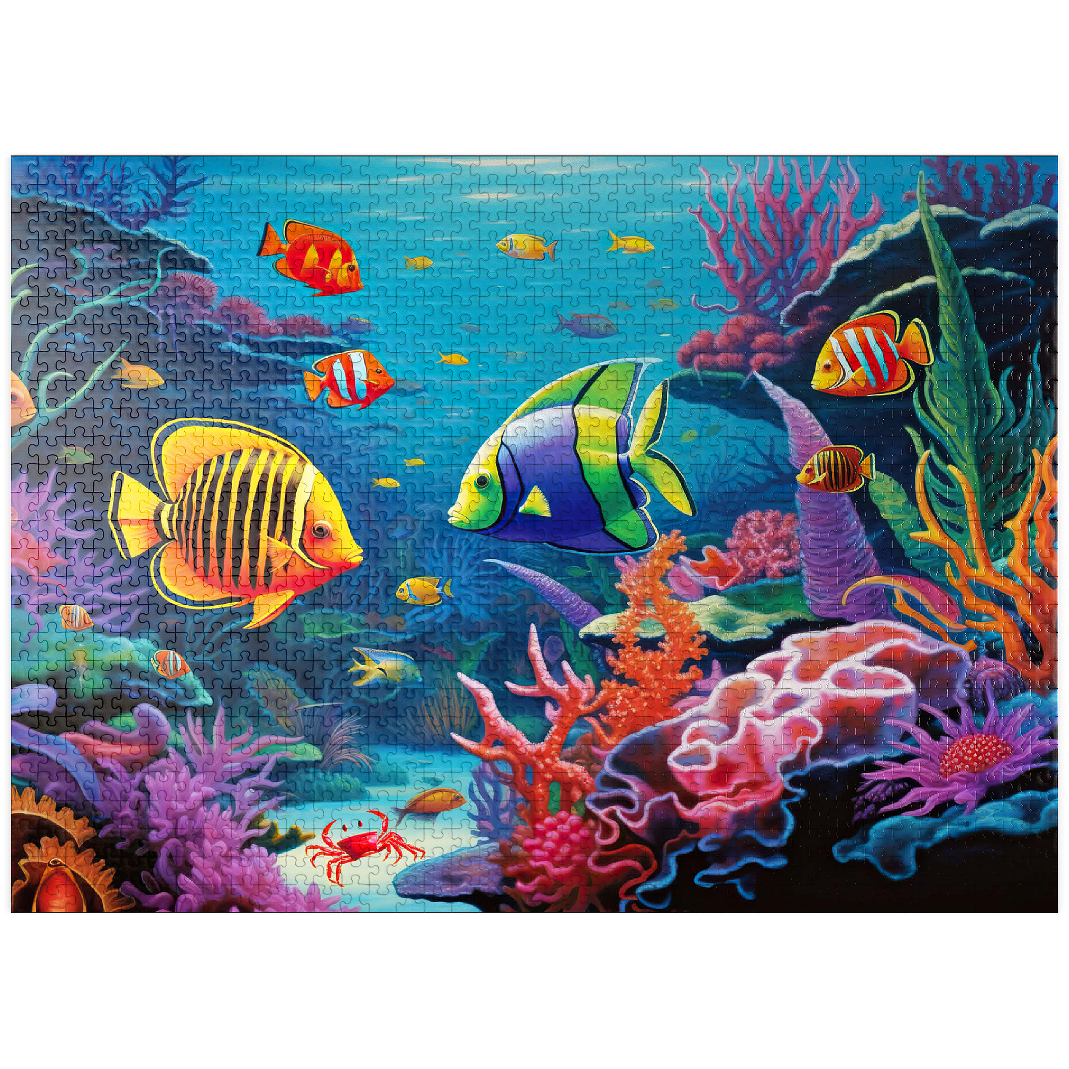 A mesmerizing underwater world filled with colorful tropical fish swimming gracefully amidst vibrant coral formations. The reef showcases a diverse palette of marine life, from striped angelfish and bright clownfish to yellow tangs and vivid butterflyfish. Coral structures in shades of pink, orange, and purple provide a stunning backdrop, while a playful red crab scuttles across the sandy seabed. The crystal-clear water captures the sunlight, enhancing the brilliant colors and dynamic movement of this thriving aquatic paradise.