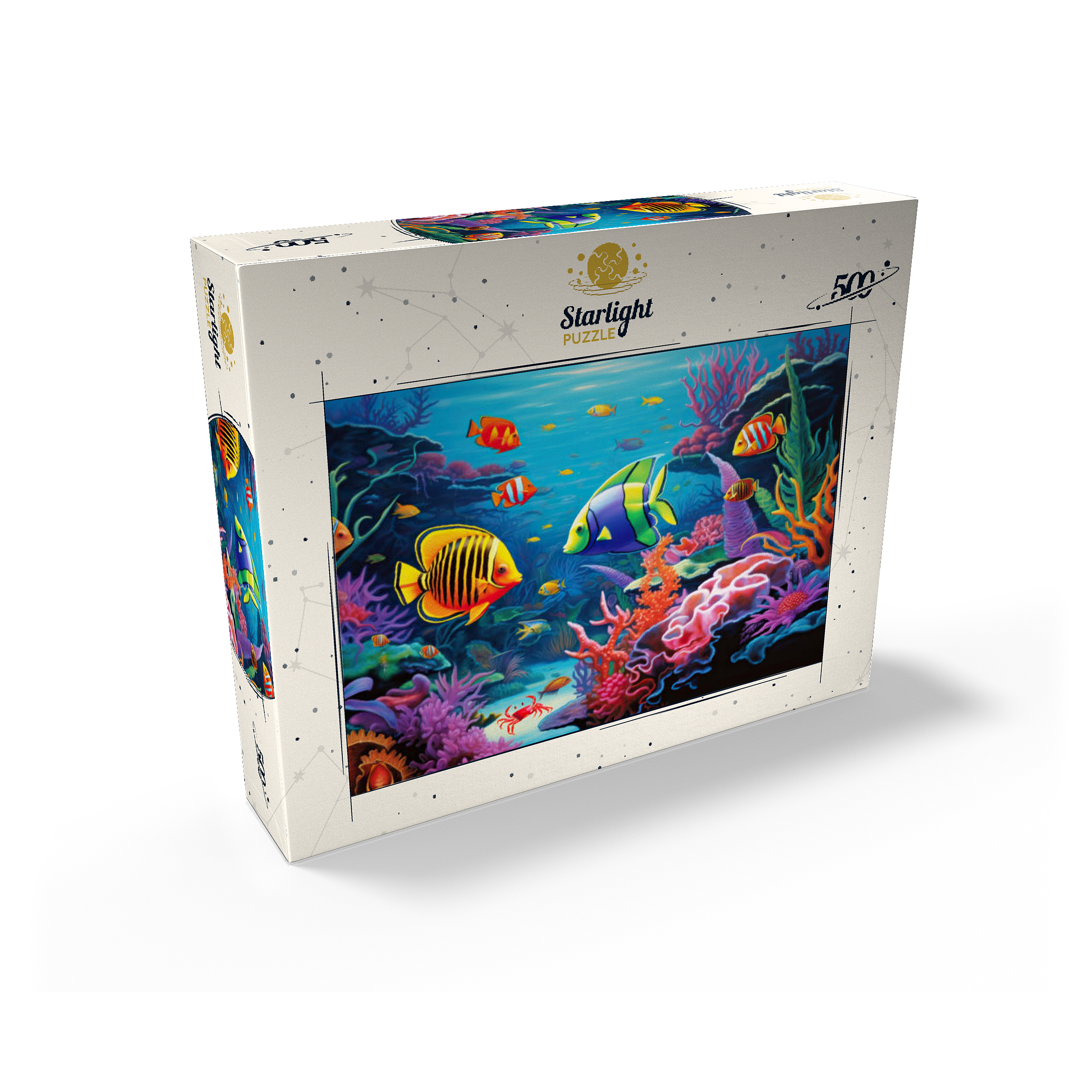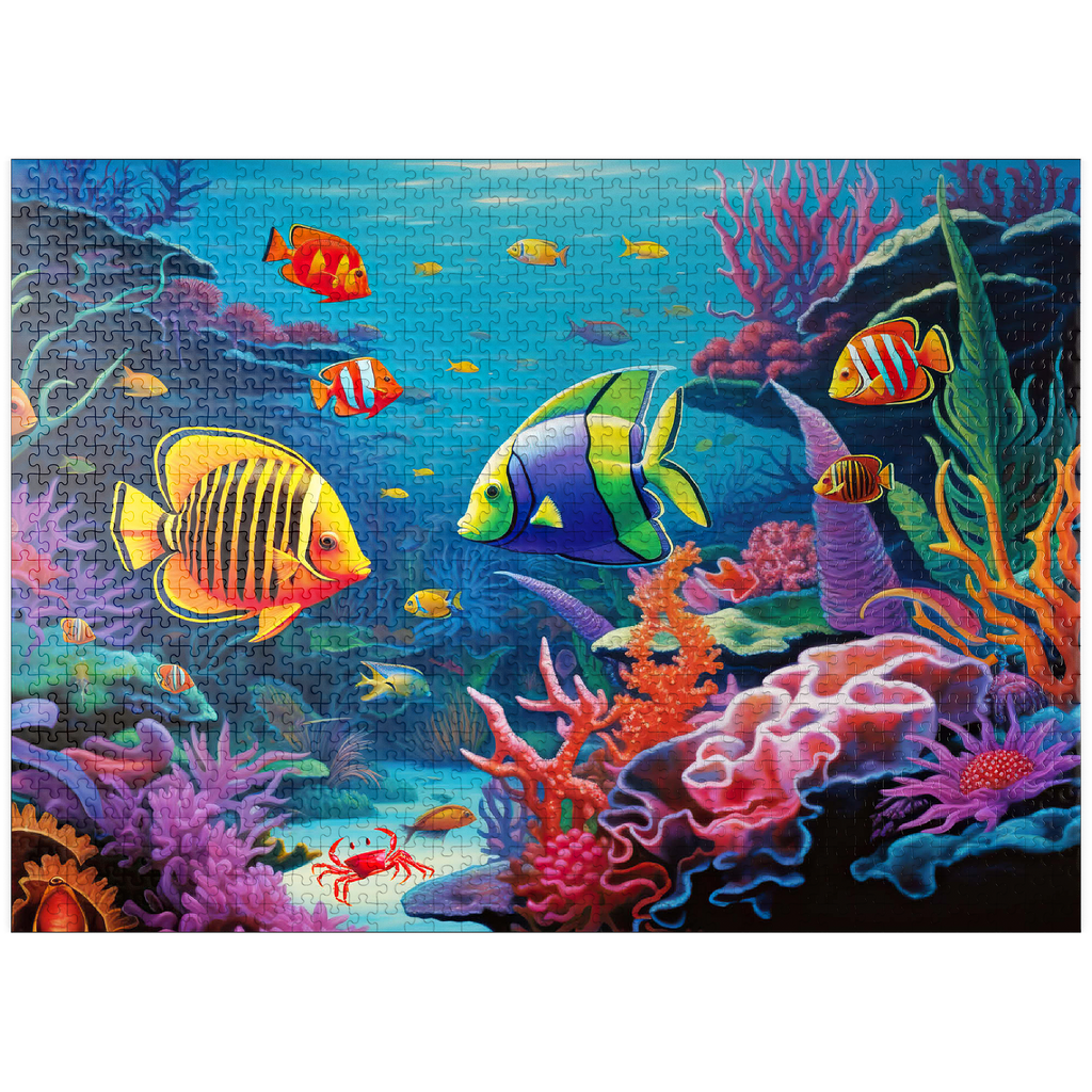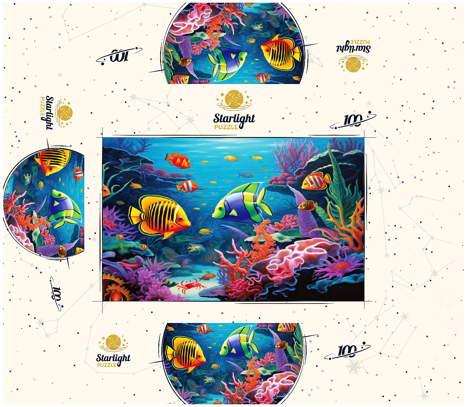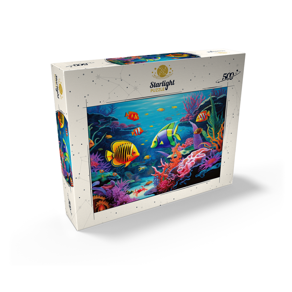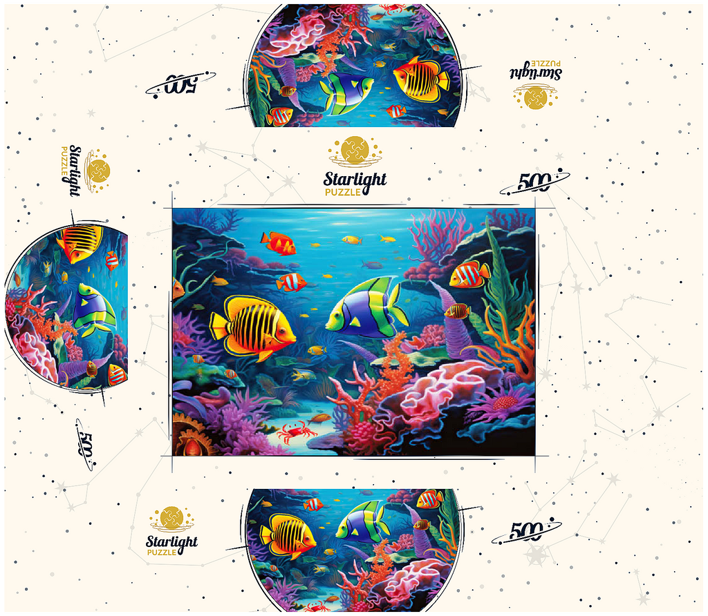 A mesmerizing underwater world filled with colorful tropical fish swimming gracefully amidst vibrant coral formations. The reef showcases a diverse palette of marine life, from striped angelfish and bright clownfish to yellow tangs and vivid butterflyfish. Coral structures in shades of pink, orange, and purple provide a stunning backdrop, while a playful red crab scuttles across the sandy seabed. The crystal-clear water captures the sunlight, enhancing the brilliant colors and dynamic movement of this thriving aquatic paradise.