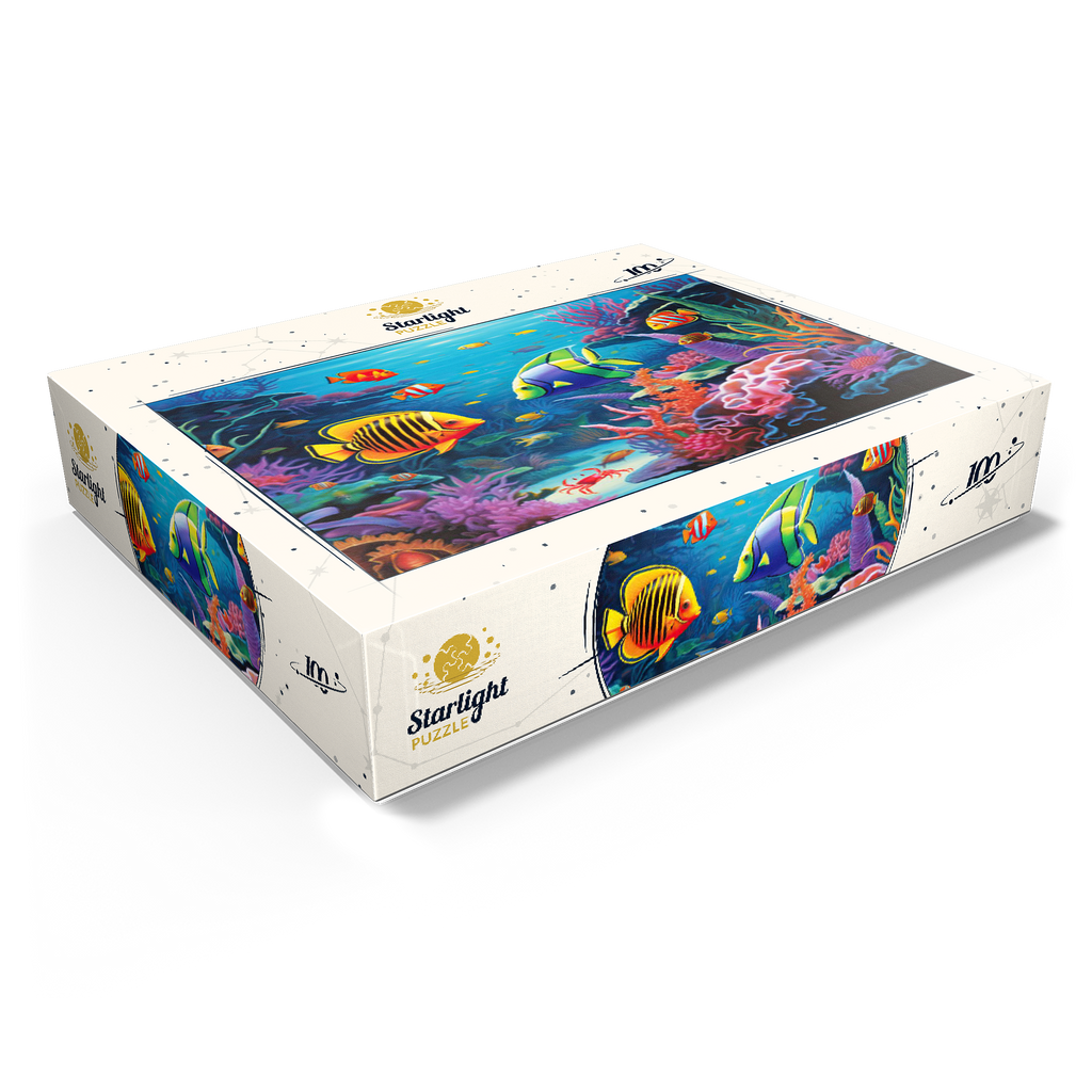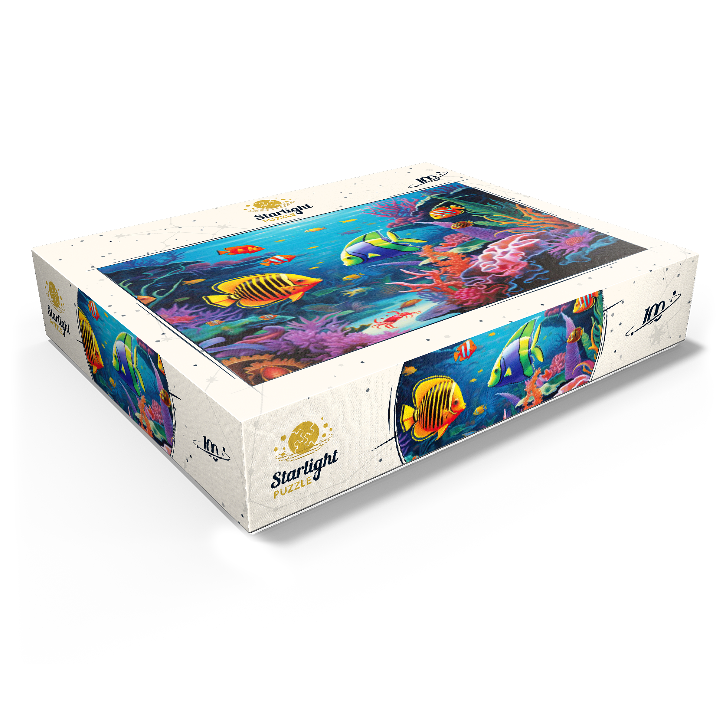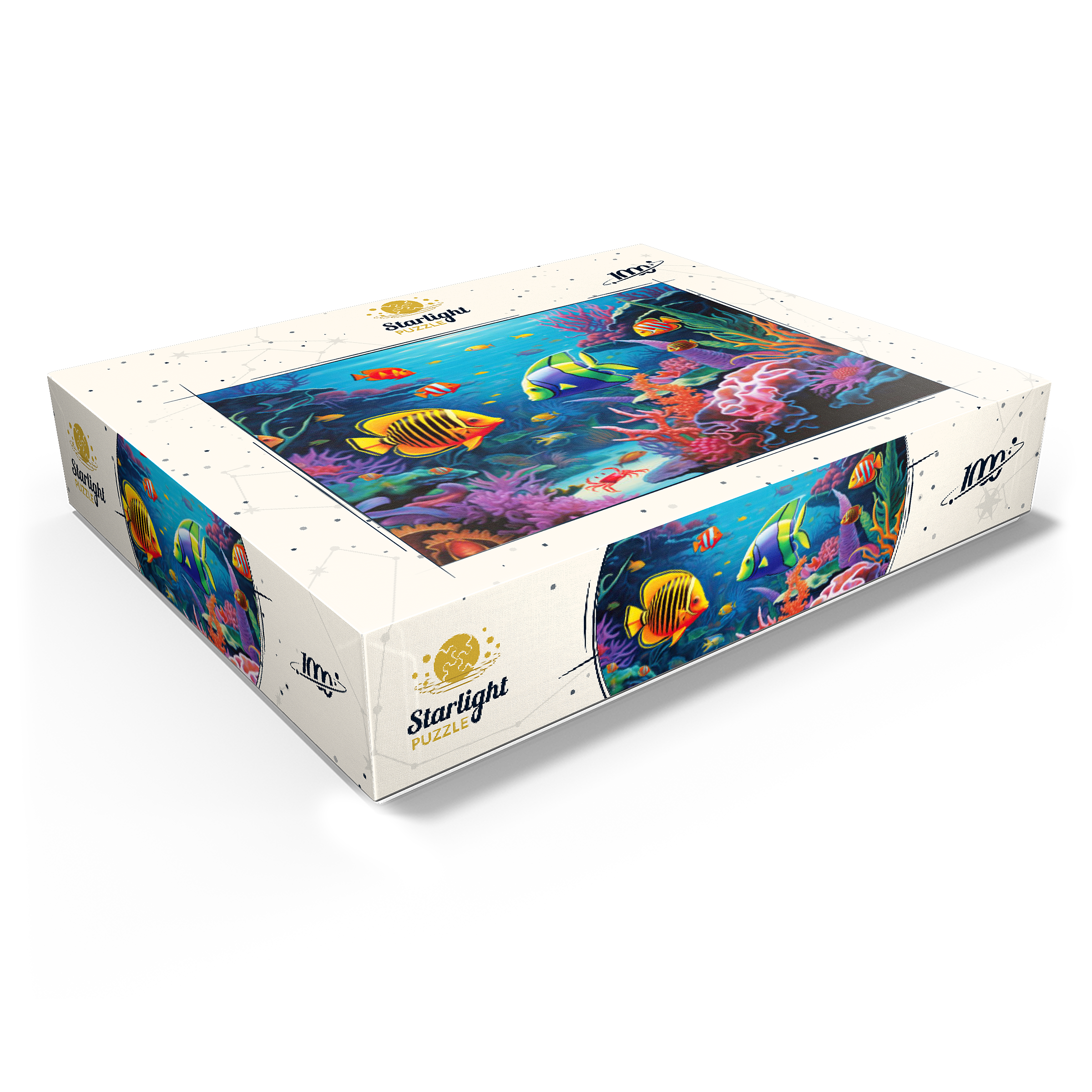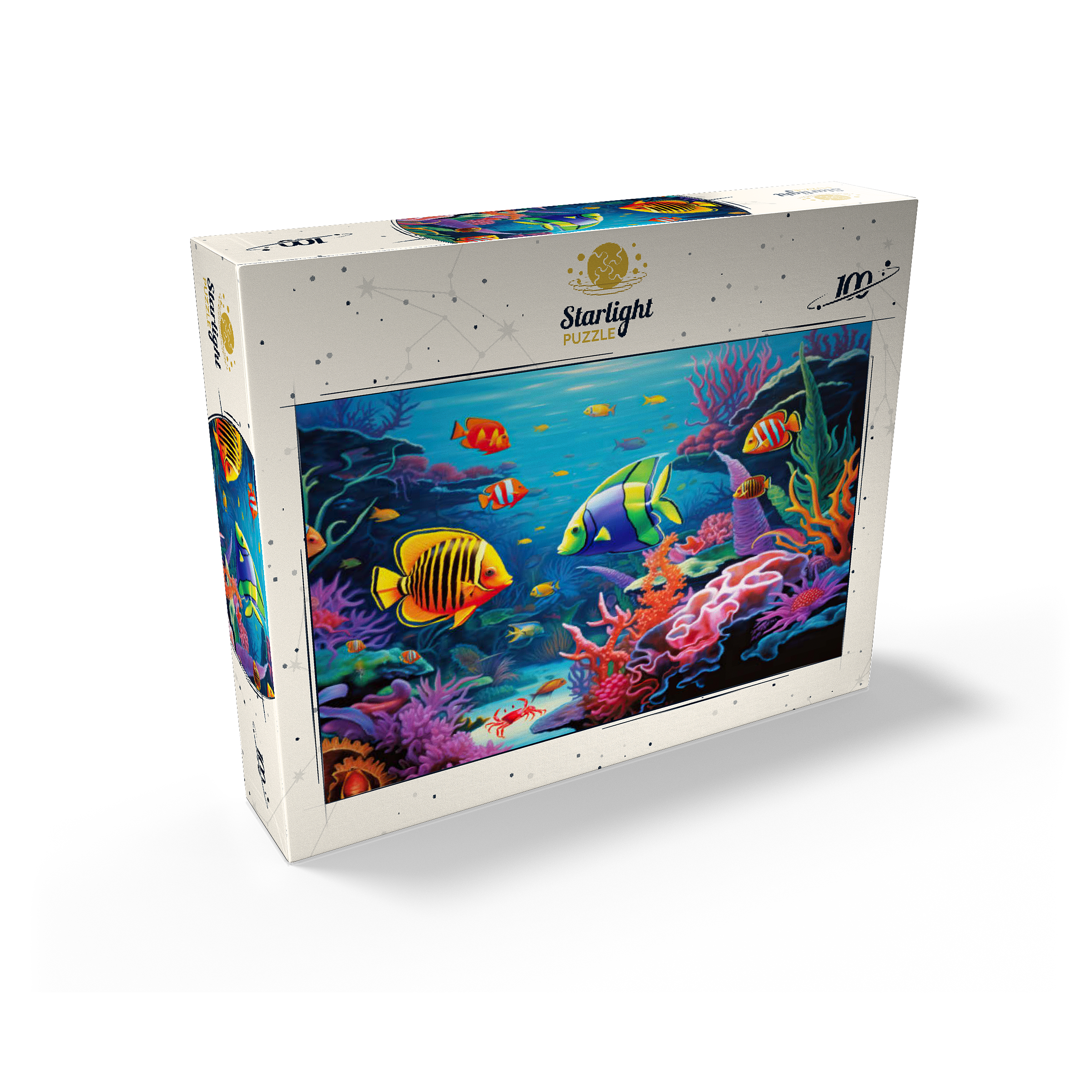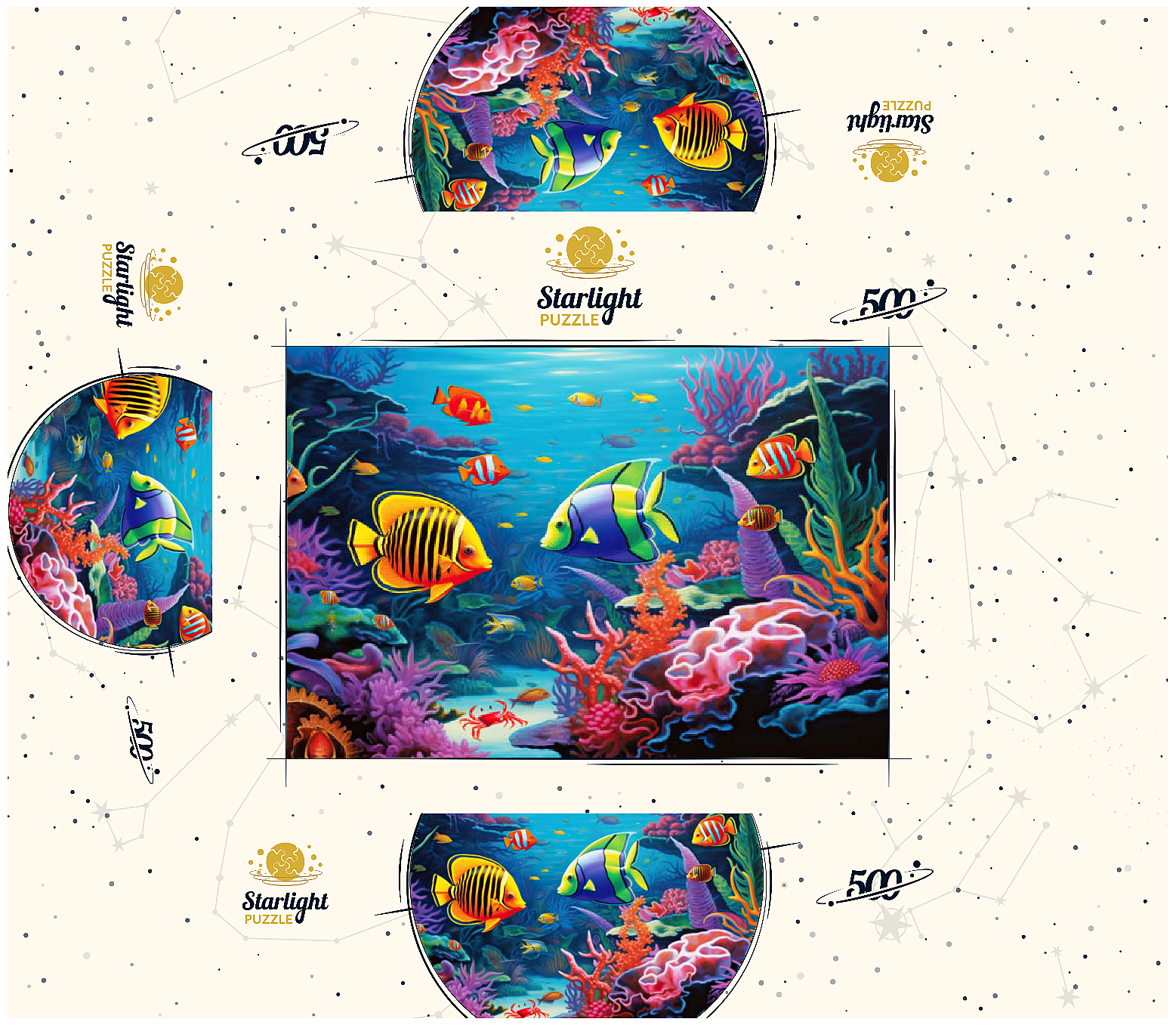 A mesmerizing underwater world filled with colorful tropical fish swimming gracefully amidst vibrant coral formations. The reef showcases a diverse palette of marine life, from striped angelfish and bright clownfish to yellow tangs and vivid butterflyfish. Coral structures in shades of pink, orange, and purple provide a stunning backdrop, while a playful red crab scuttles across the sandy seabed. The crystal-clear water captures the sunlight, enhancing the brilliant colors and dynamic movement of this thriving aquatic paradise.