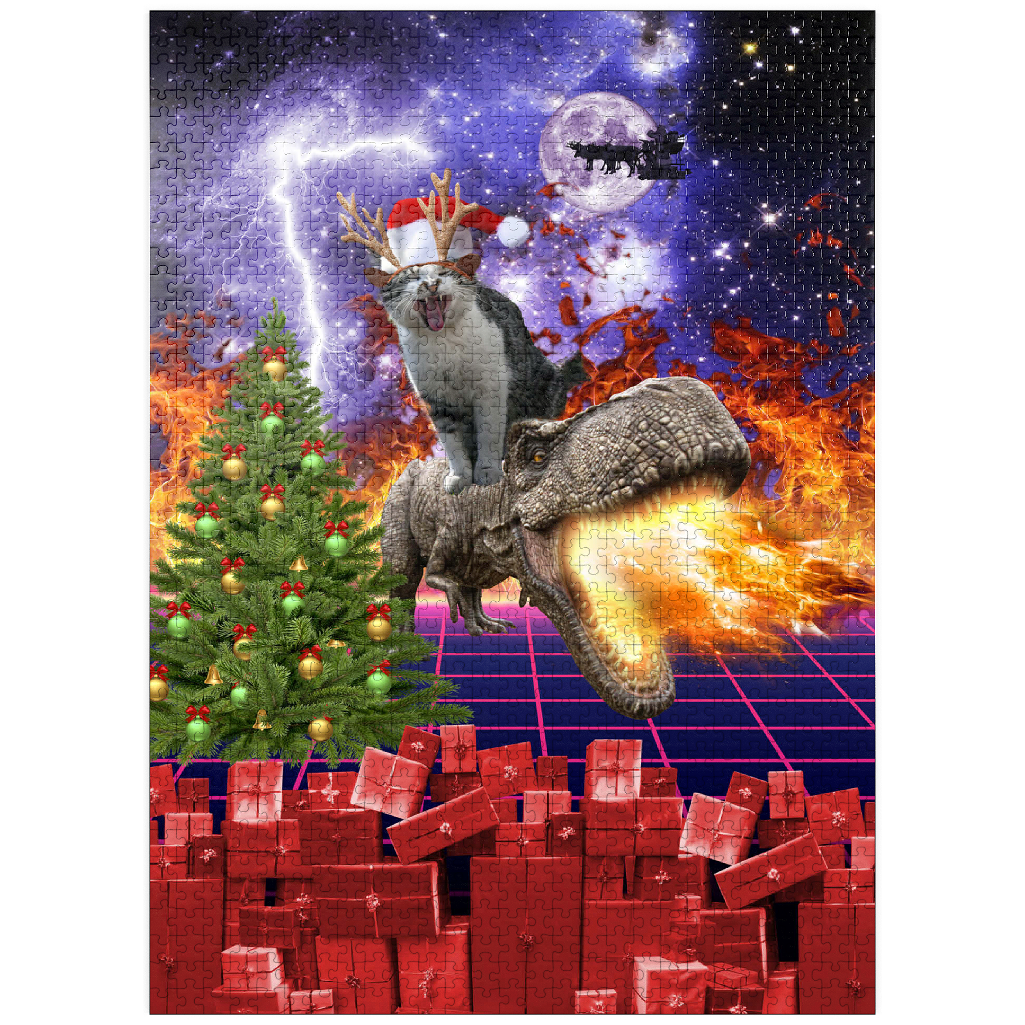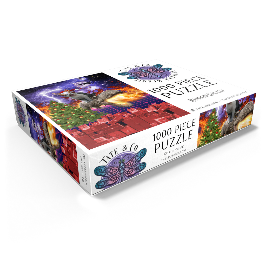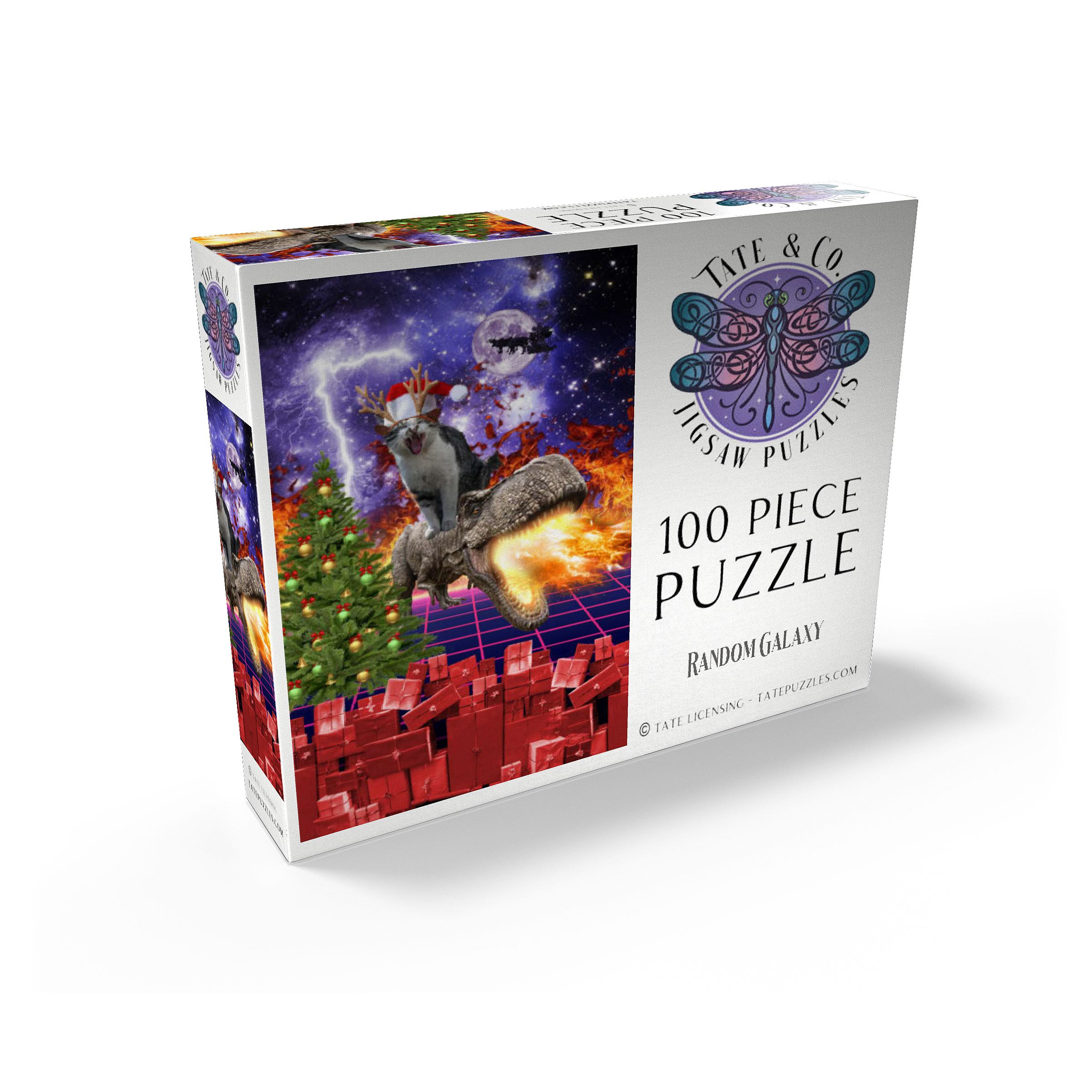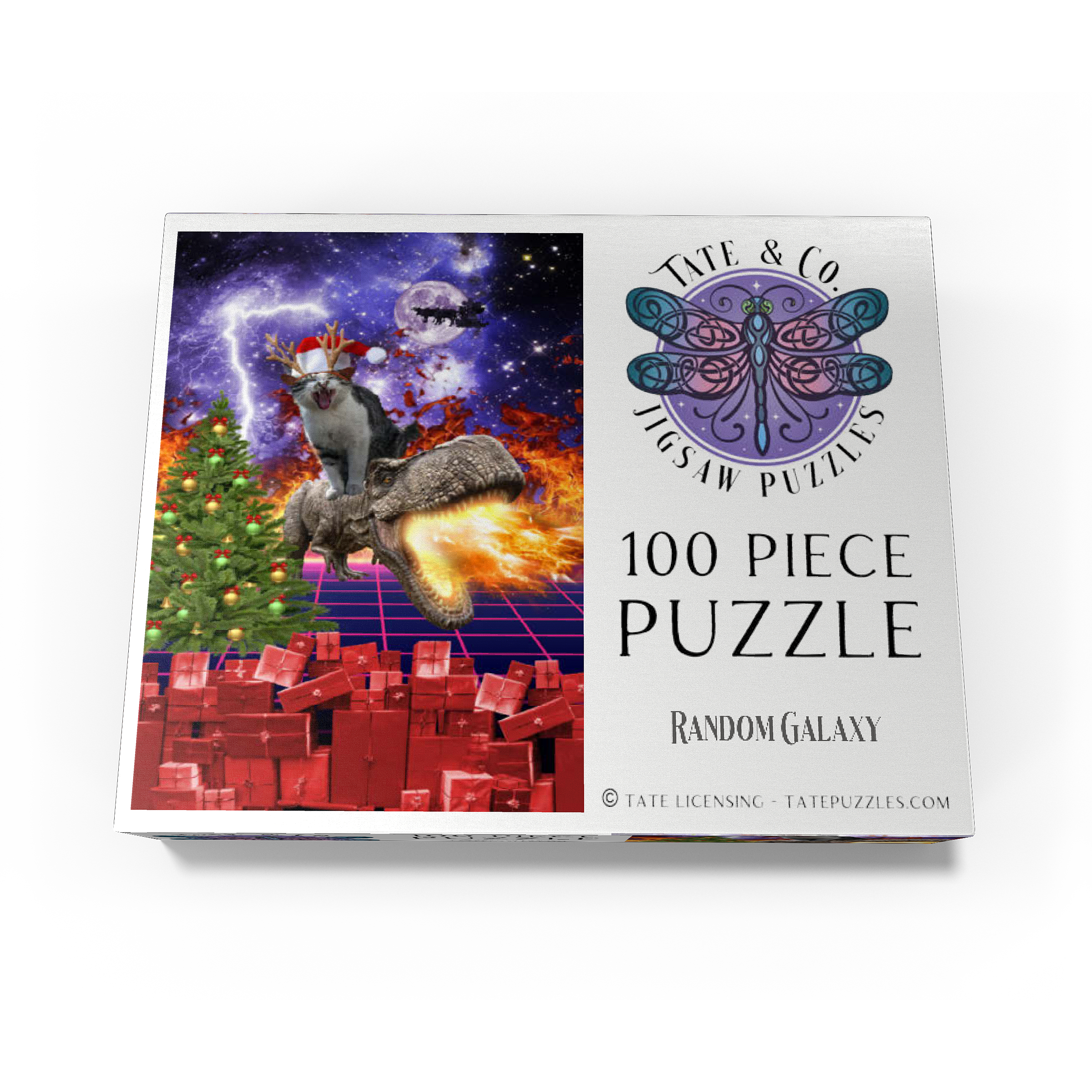 A festive cat dressed as Santa rides a roaring T-Rex across snowy galaxies. Hilariously blending dinosaurs, Christmas cheer, and cosmic absurdity, this Random Galaxy piece is unforgettable.