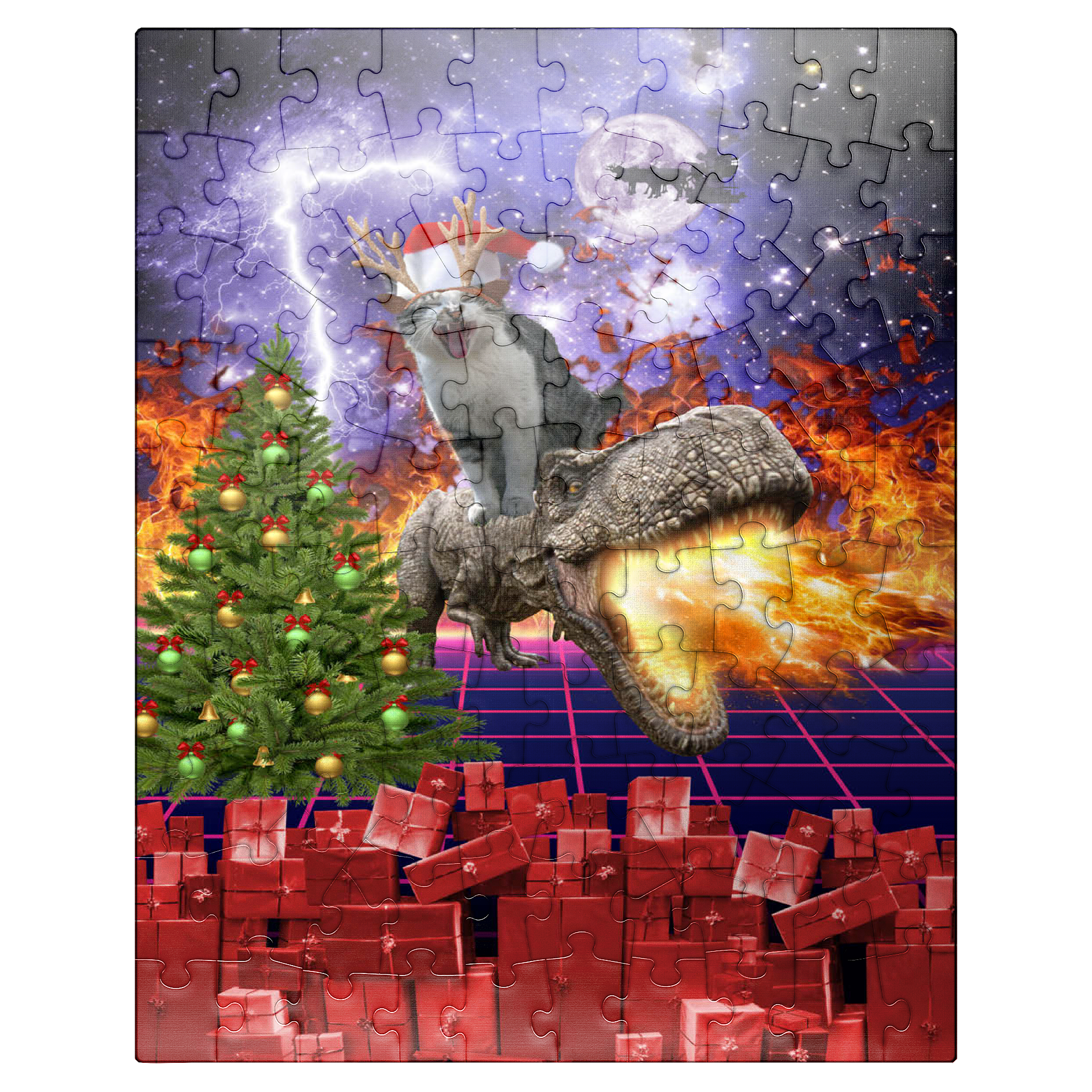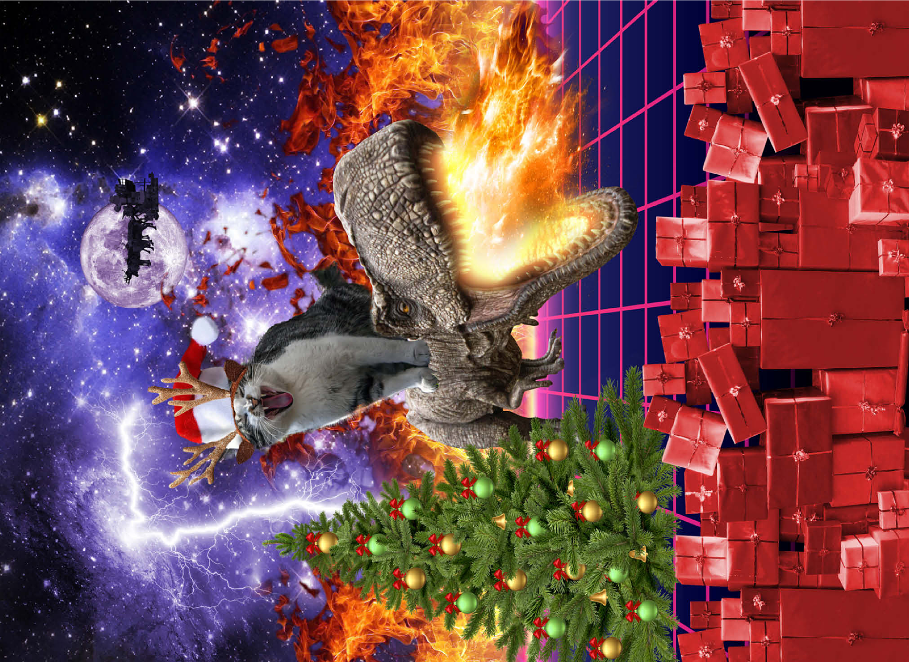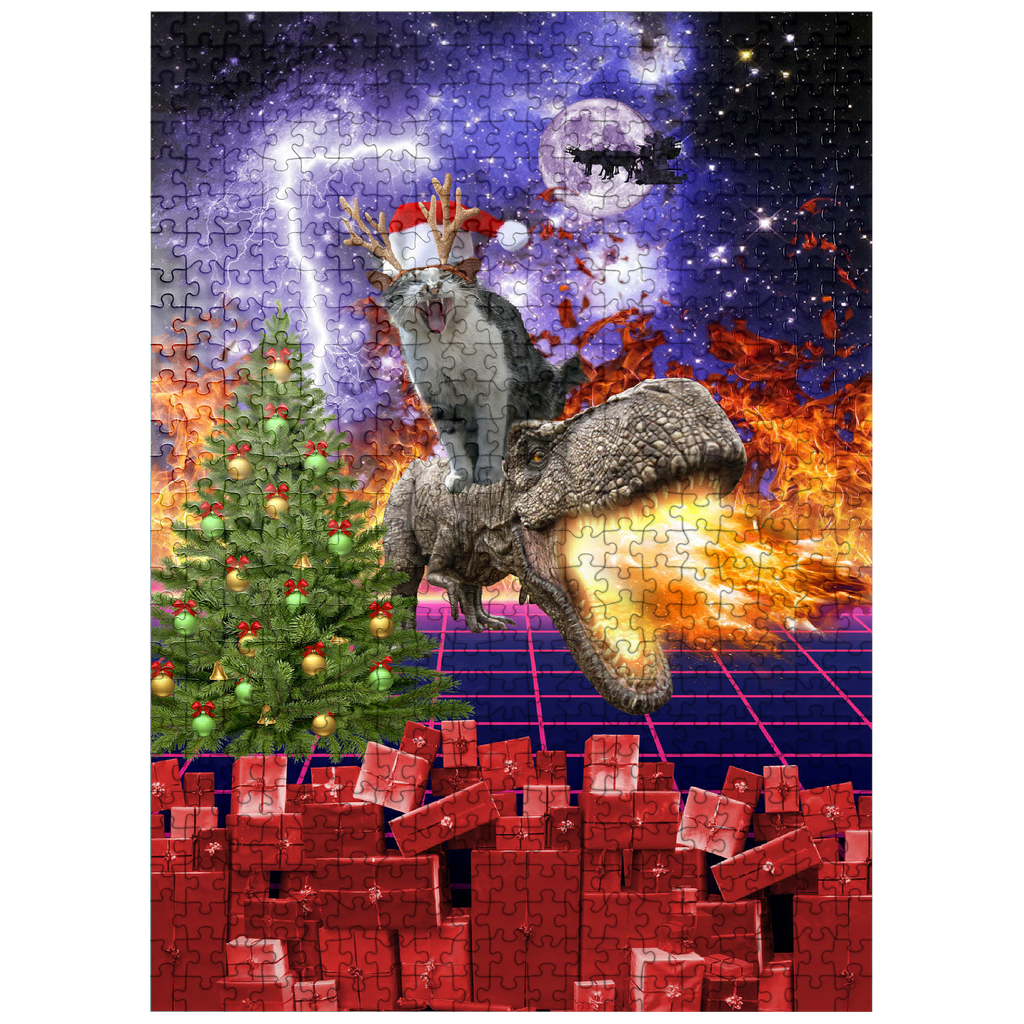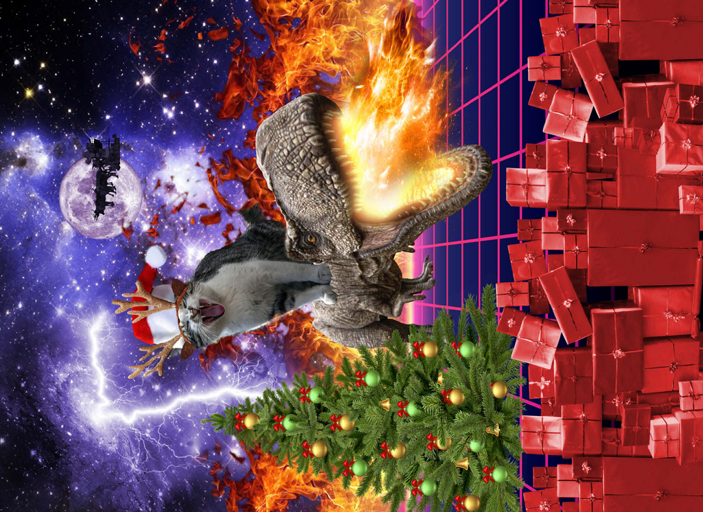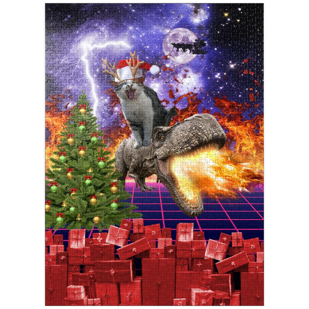 A festive cat dressed as Santa rides a roaring T-Rex across snowy galaxies. Hilariously blending dinosaurs, Christmas cheer, and cosmic absurdity, this Random Galaxy piece is unforgettable.