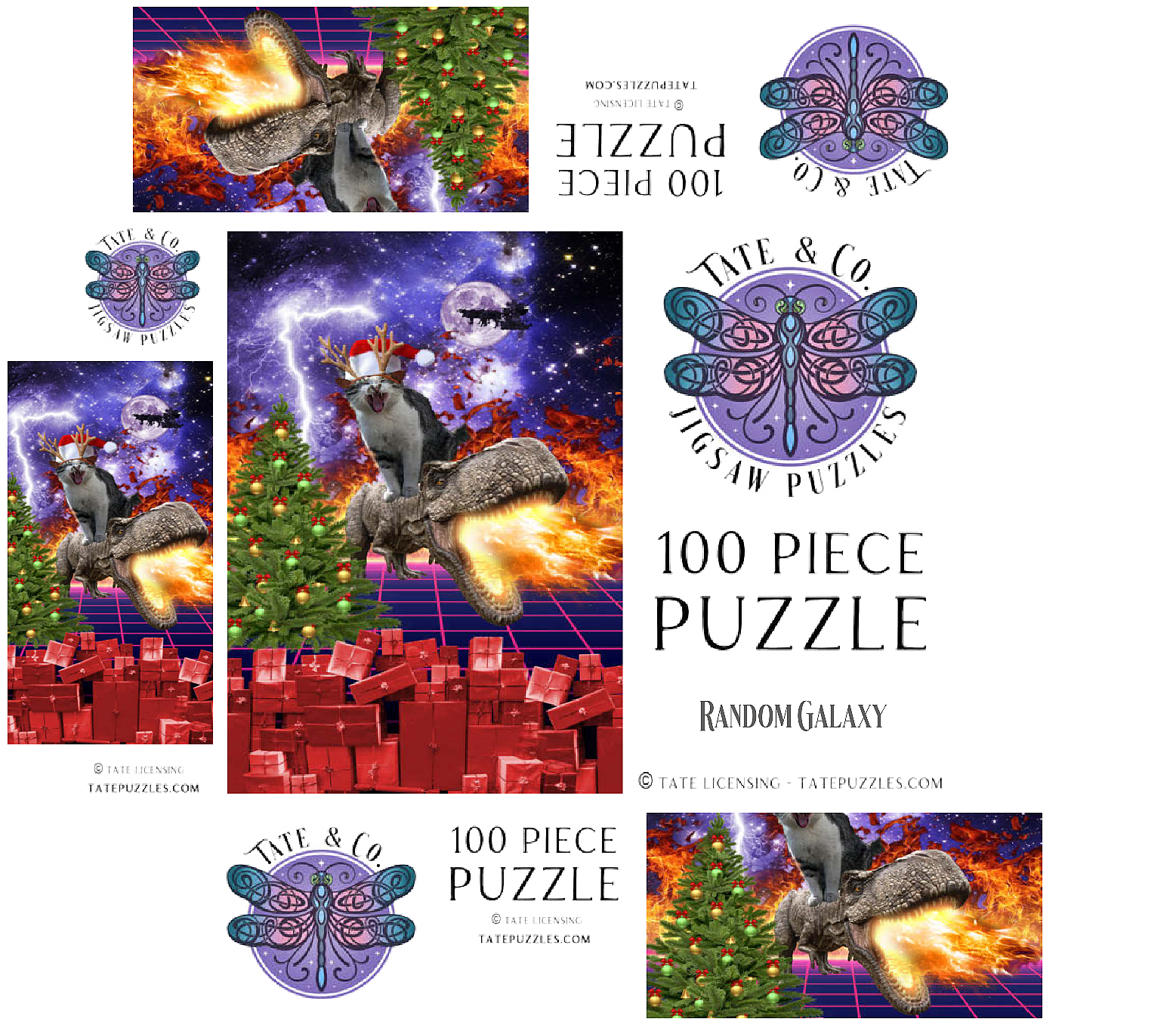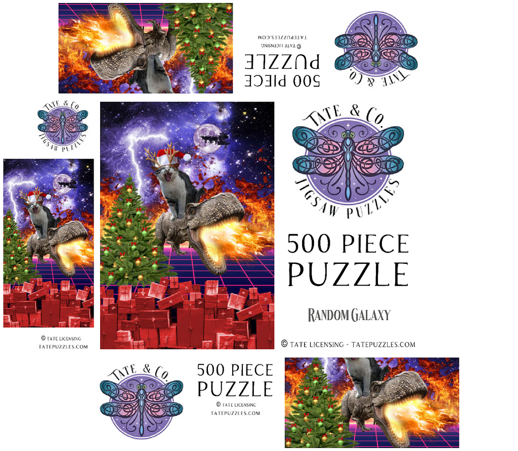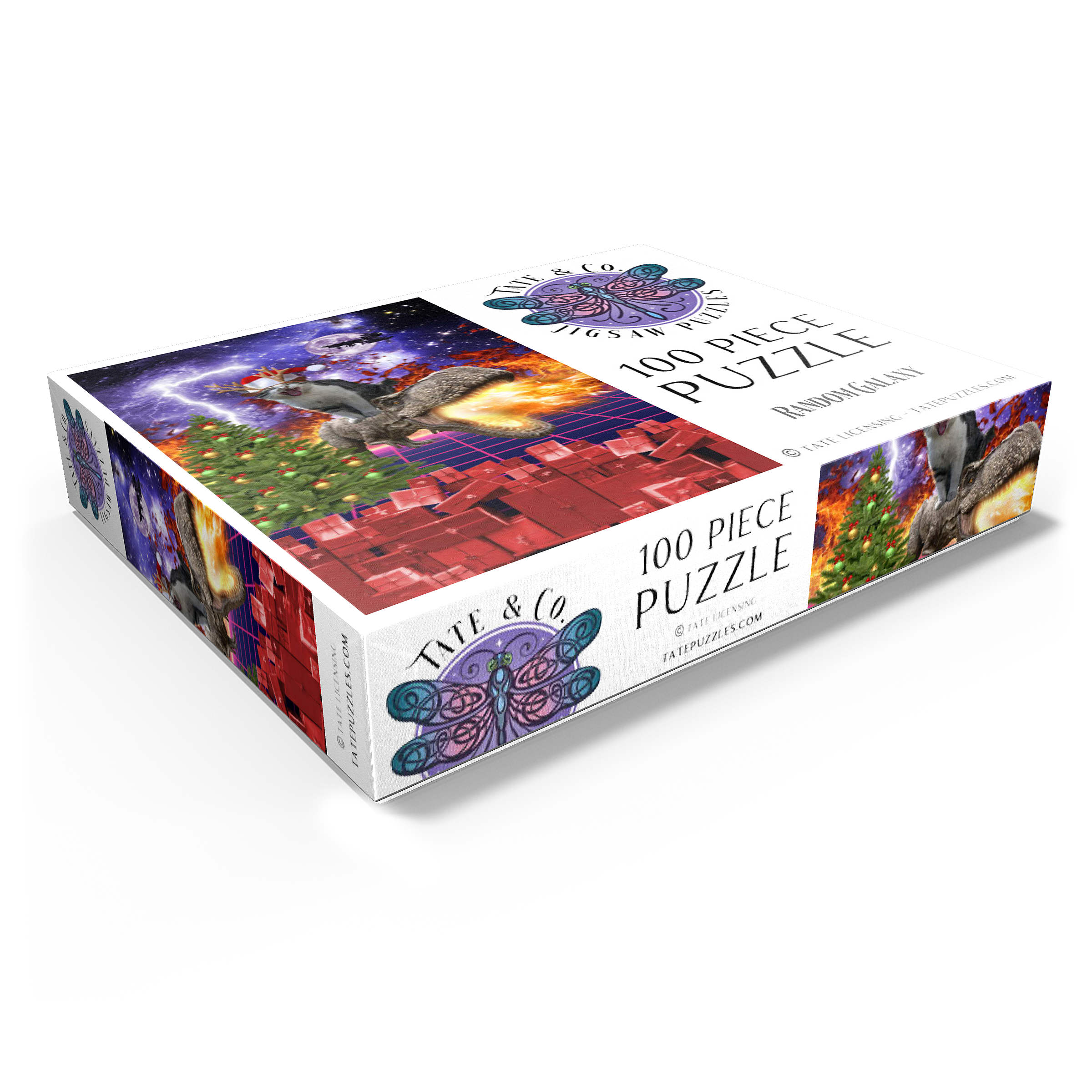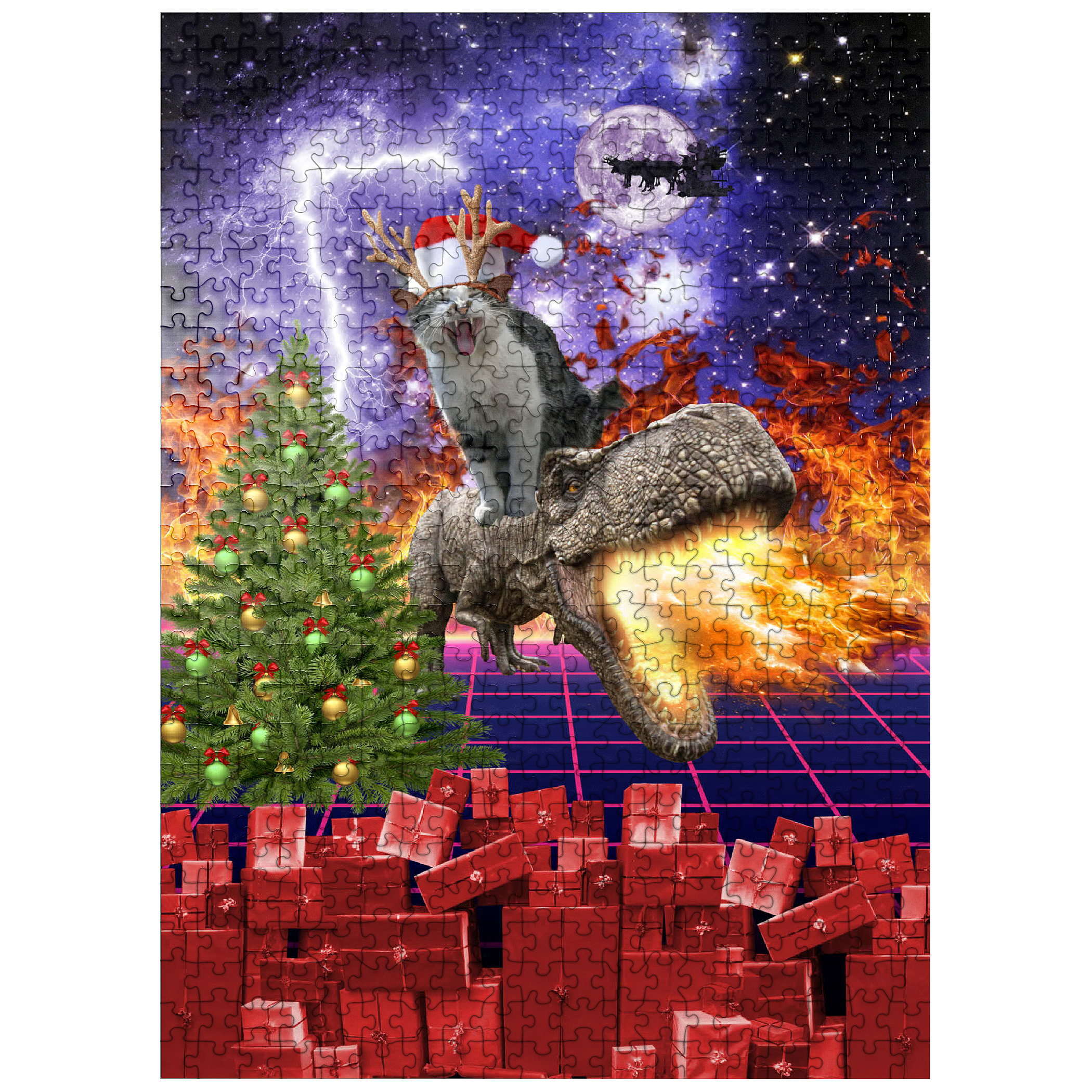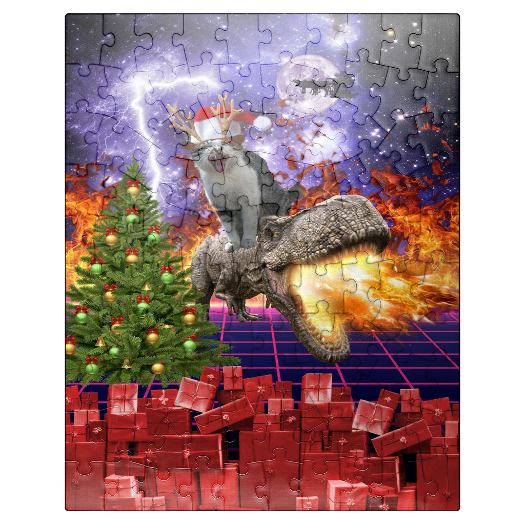 A festive cat dressed as Santa rides a roaring T-Rex across snowy galaxies. Hilariously blending dinosaurs, Christmas cheer, and cosmic absurdity, this Random Galaxy piece is unforgettable.