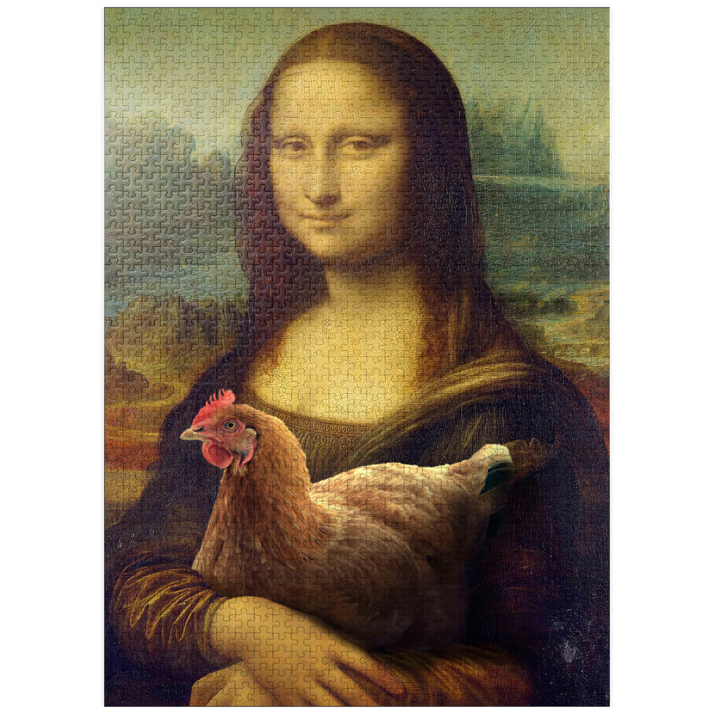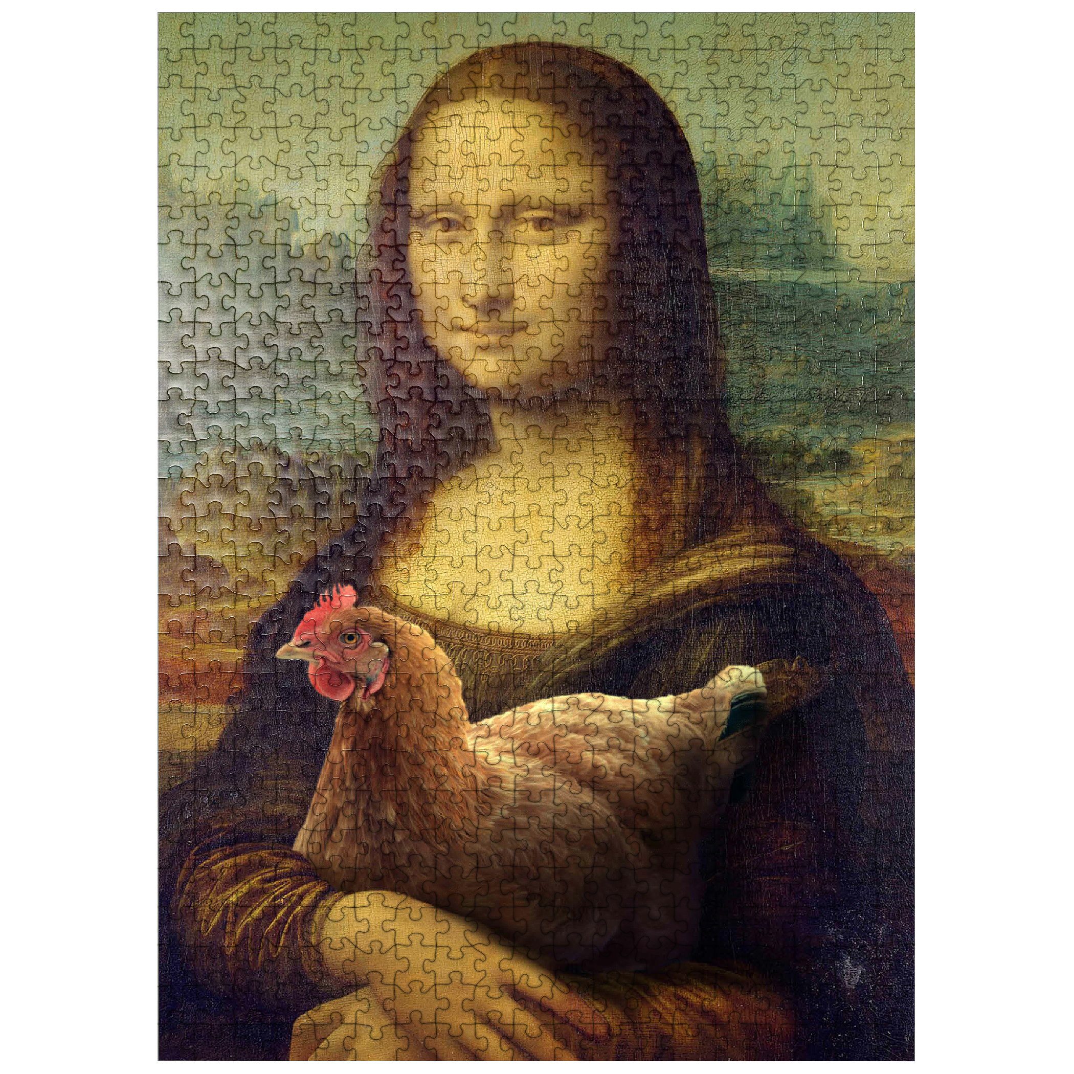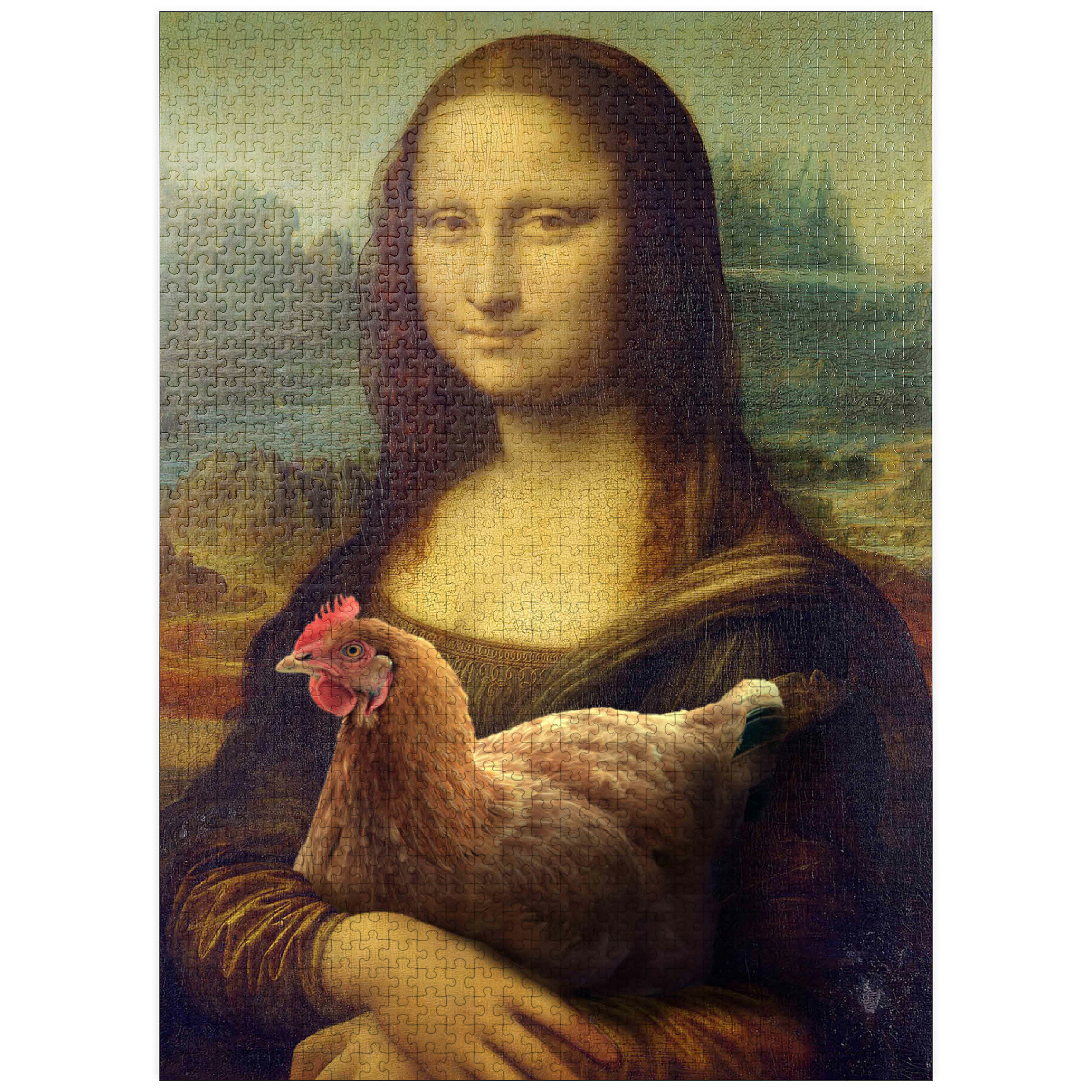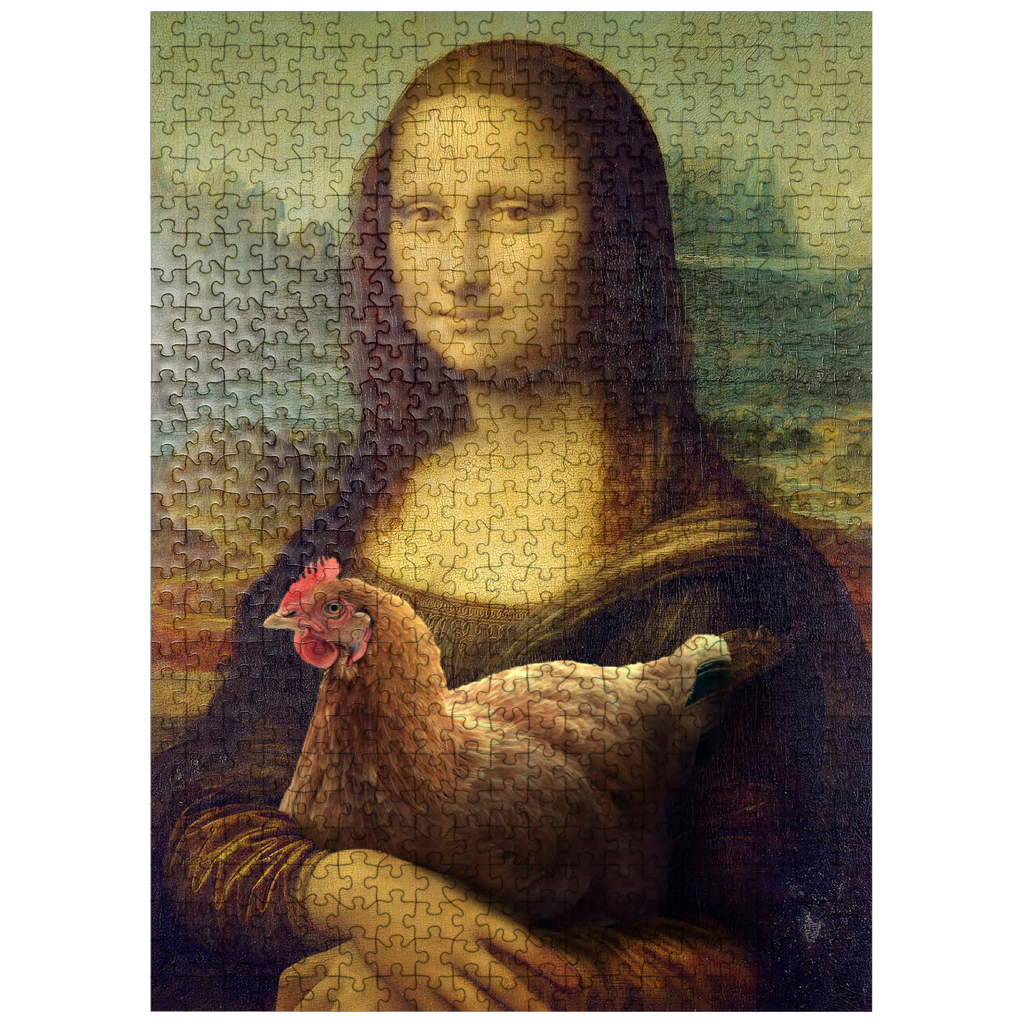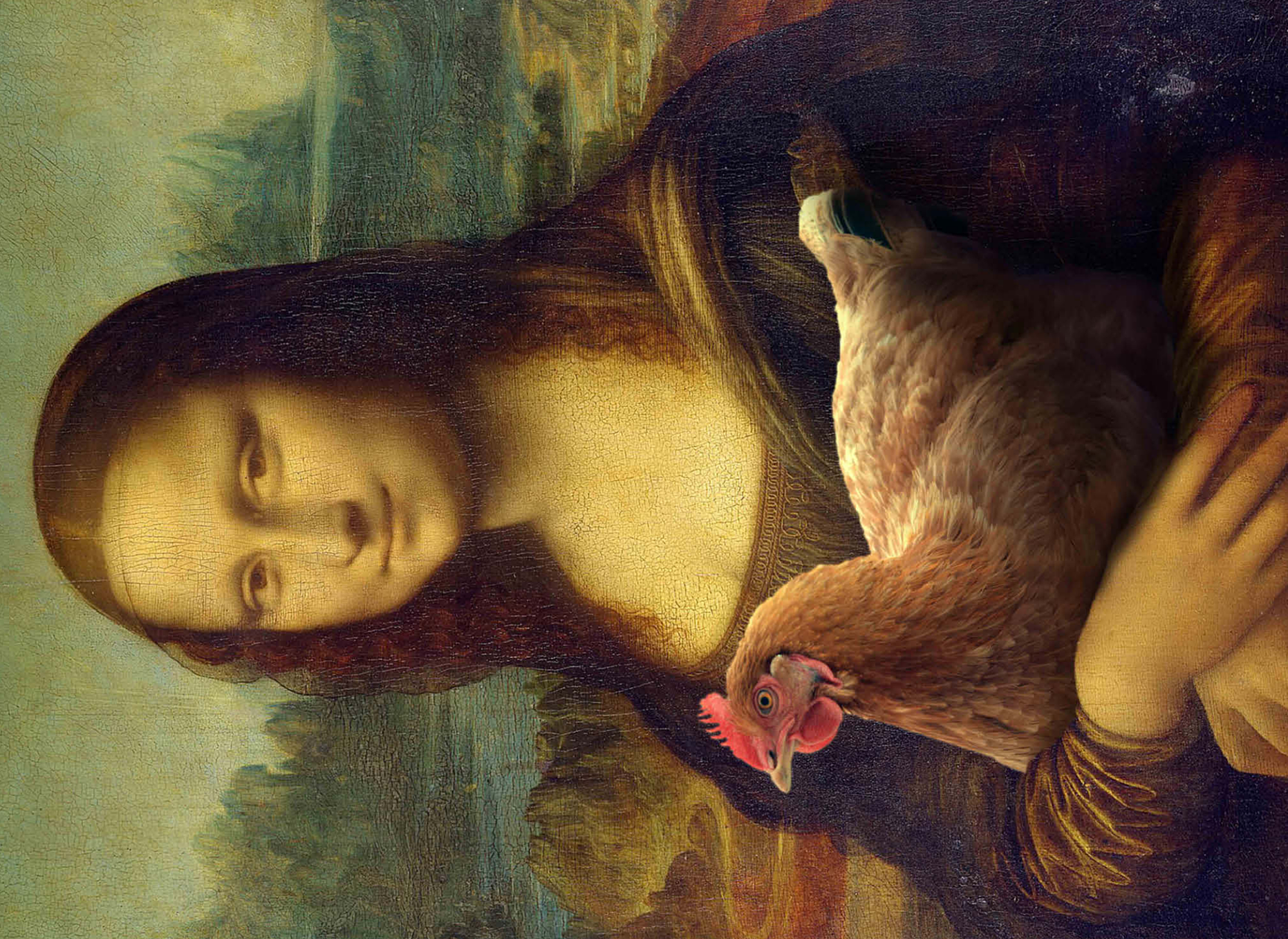 Da Vinci's Mona Lisa reimagined with a chicken companion. Random Galaxy's absurd parody adds barnyard humor to the world's most famous portrait.