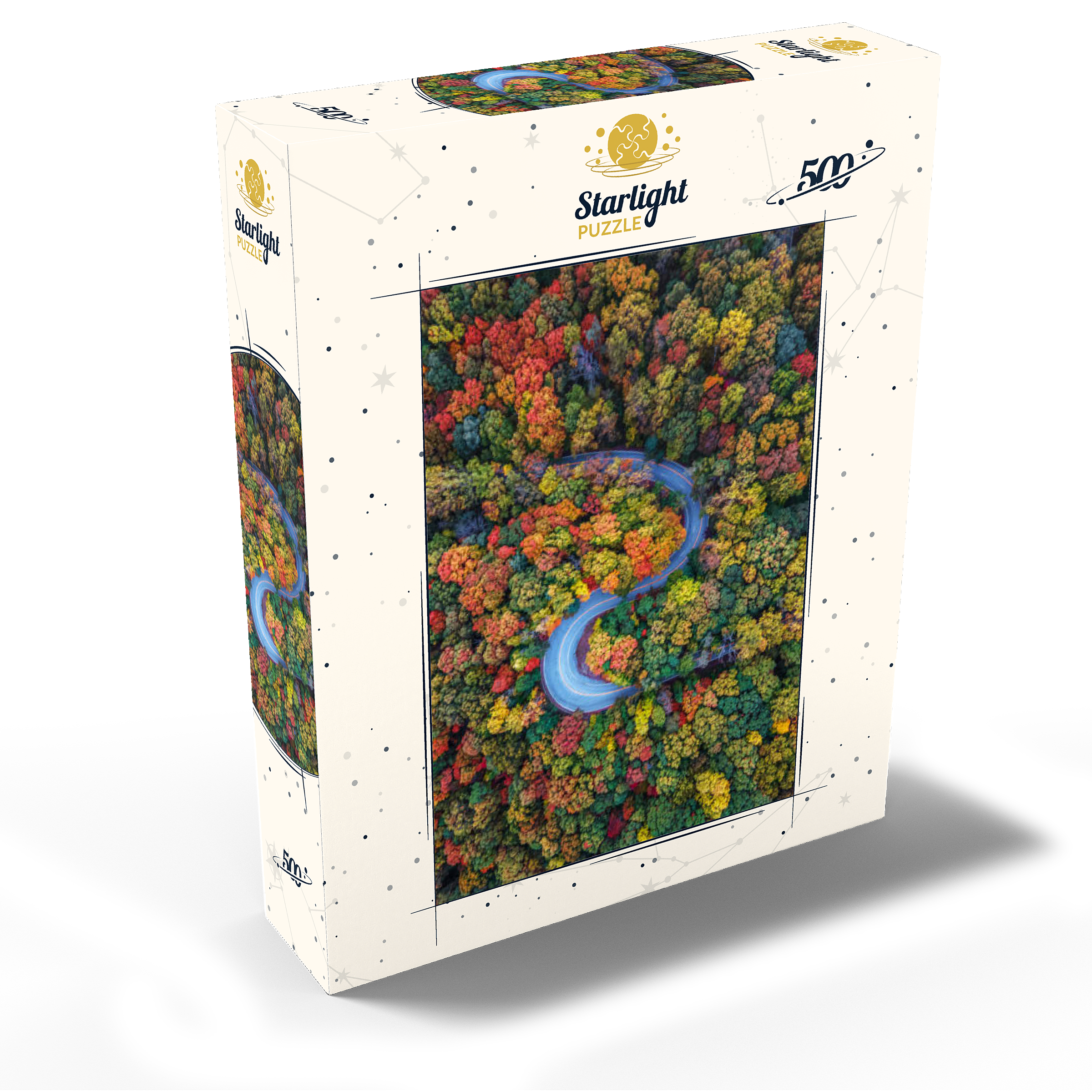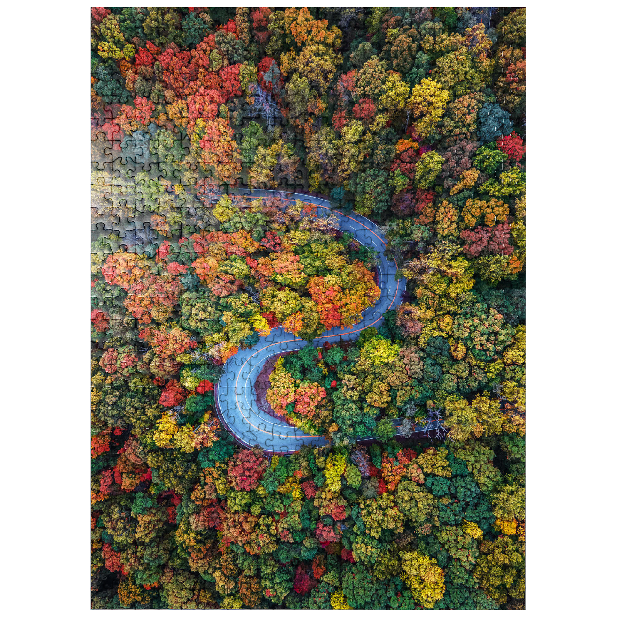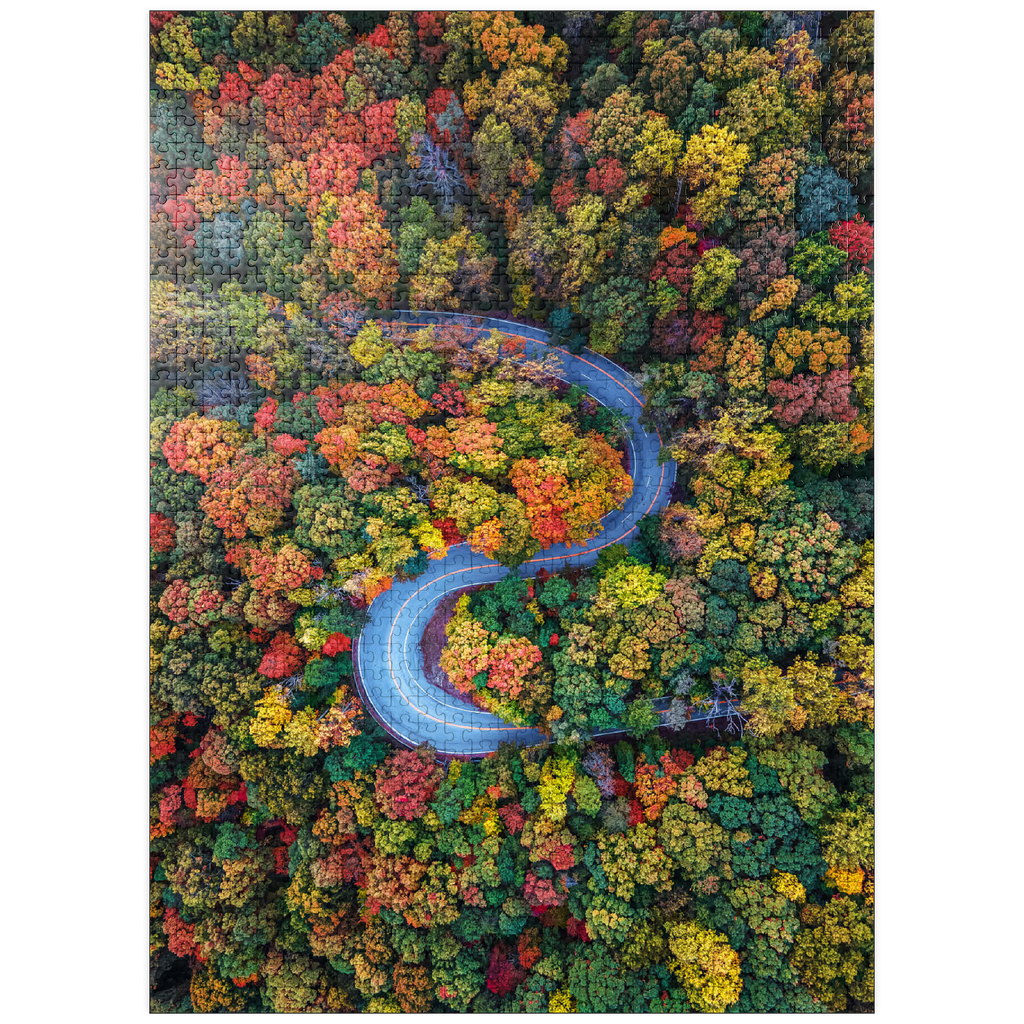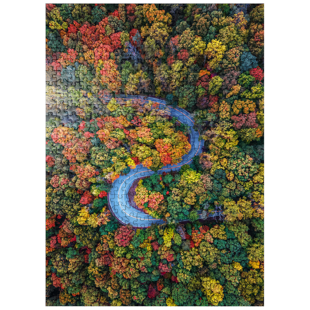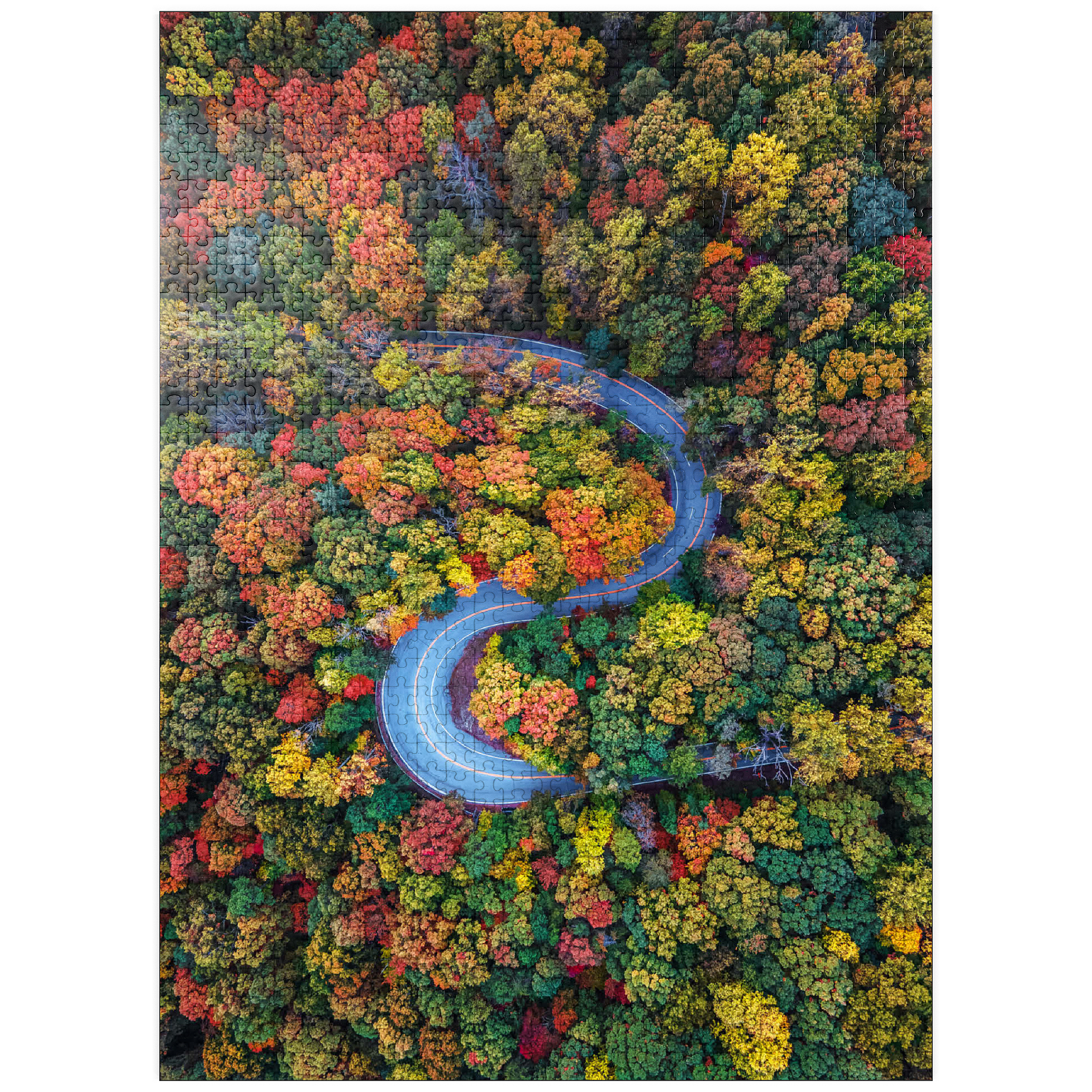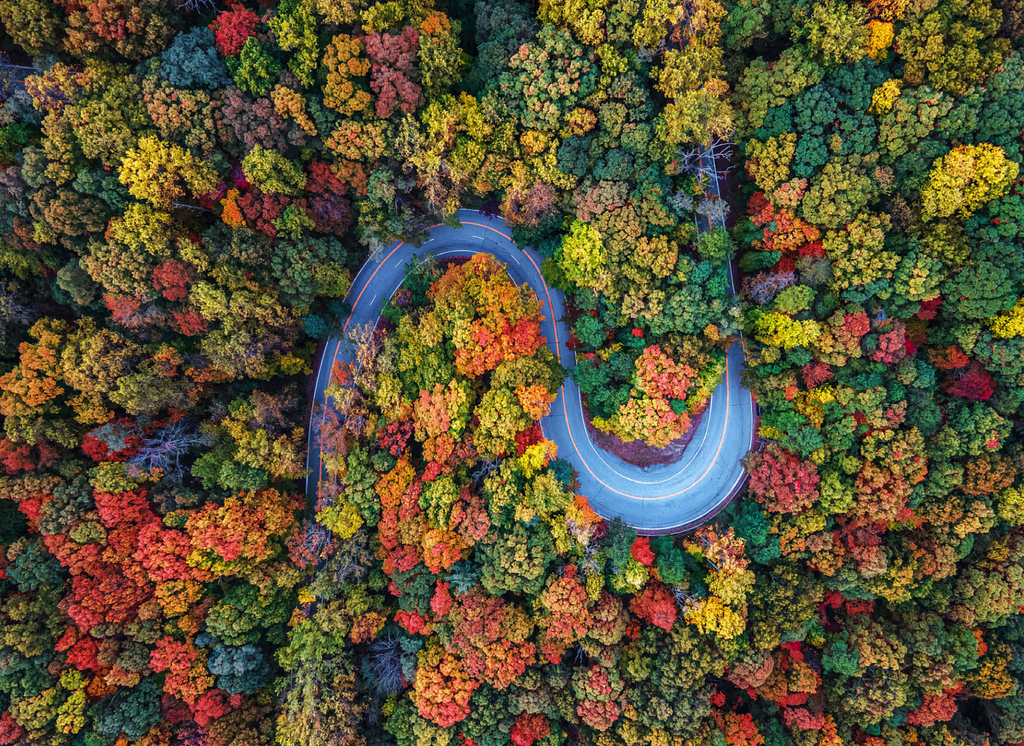This stunning aerial view showcases a winding road cutting through a dense forest ablaze with the vibrant hues of autumn. the fiery reds, golden yellows, and deep oranges of the foliage create a breathtaking mosaic of color, contrasted by the smooth, gray curve of the road. this captivating scene highlights the beauty of fall and the harmony of nature with man-made paths.