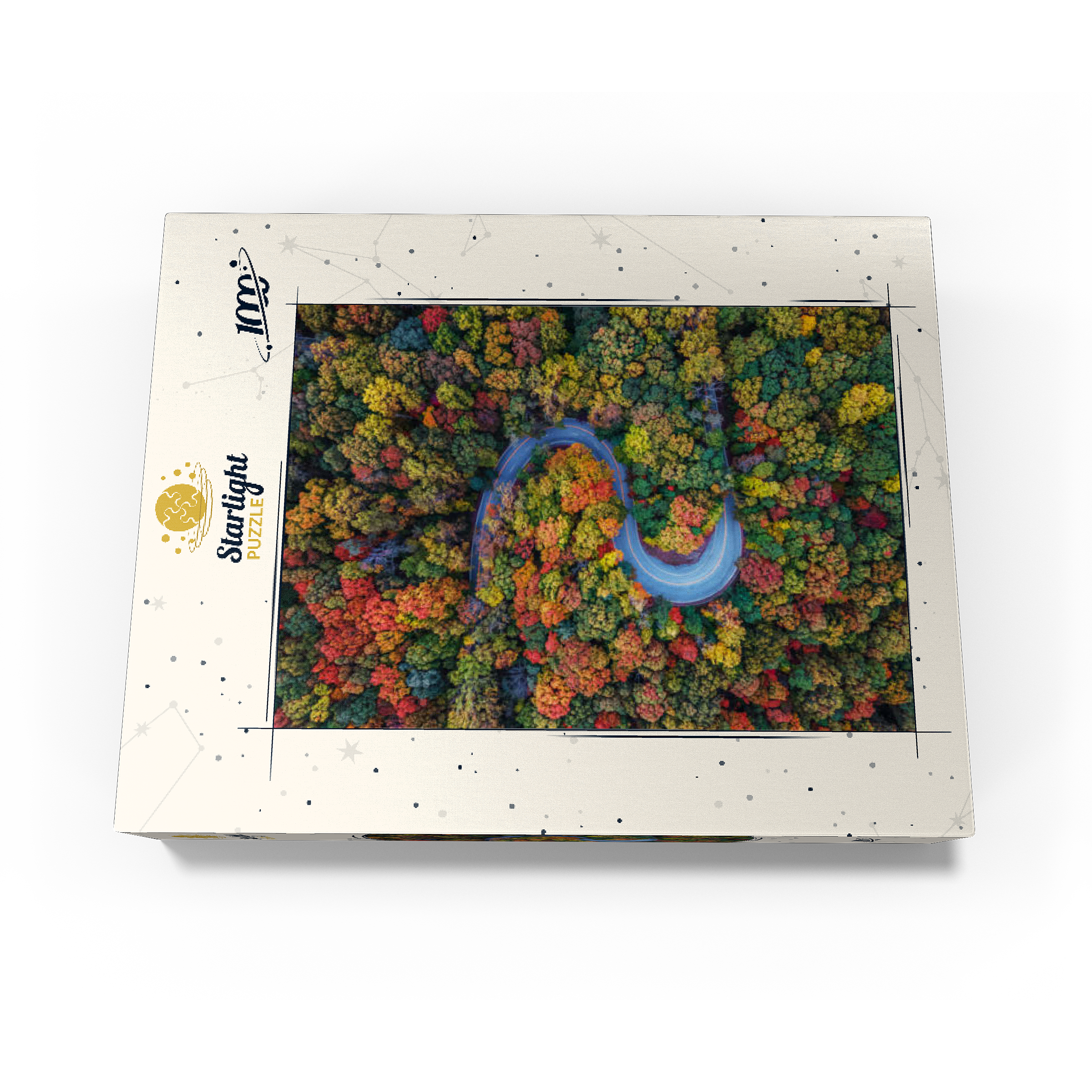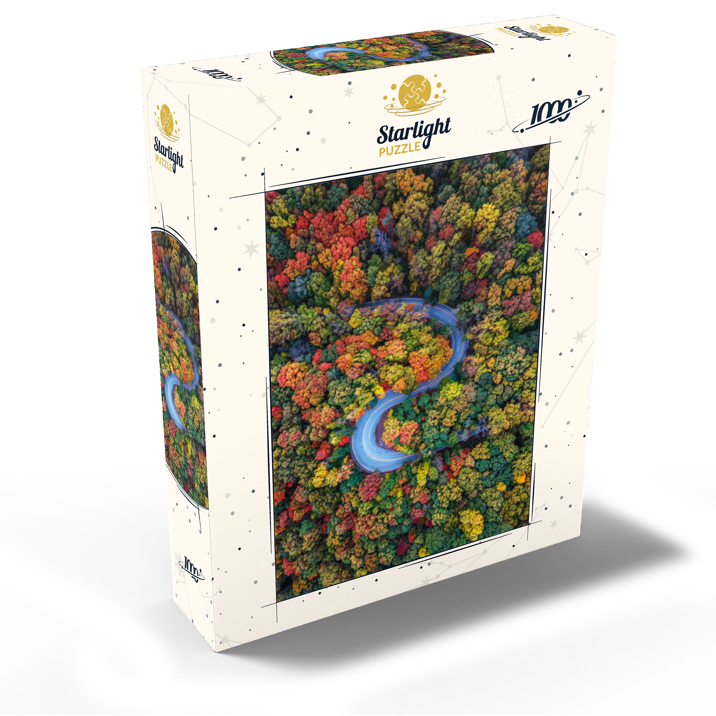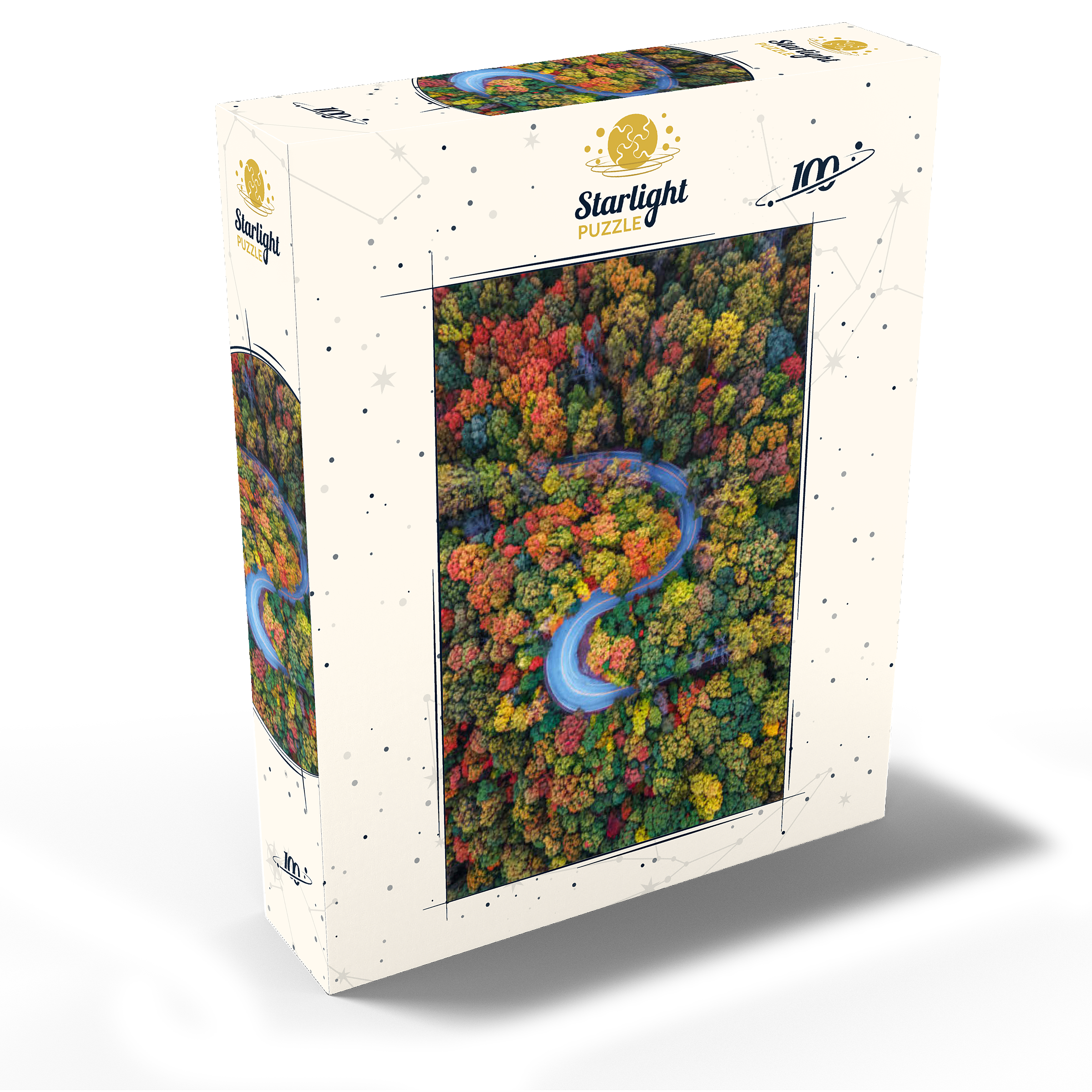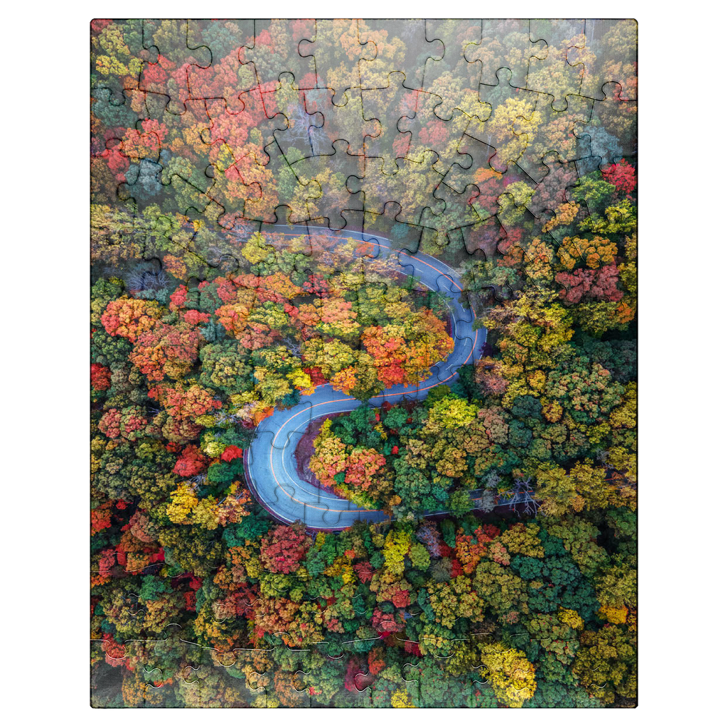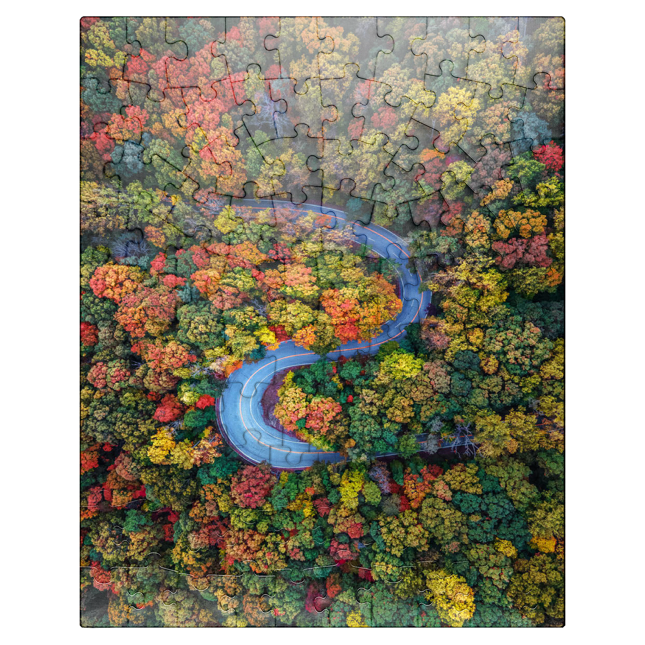 This stunning aerial view showcases a winding road cutting through a dense forest ablaze with the vibrant hues of autumn. the fiery reds, golden yellows, and deep oranges of the foliage create a breathtaking mosaic of color, contrasted by the smooth, gray curve of the road. this captivating scene highlights the beauty of fall and the harmony of nature with man-made paths.