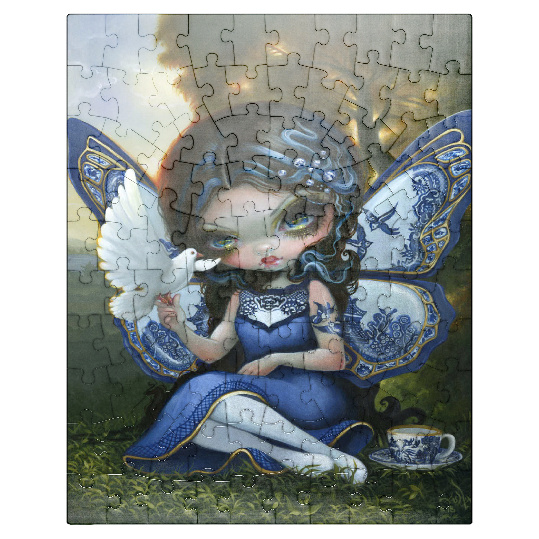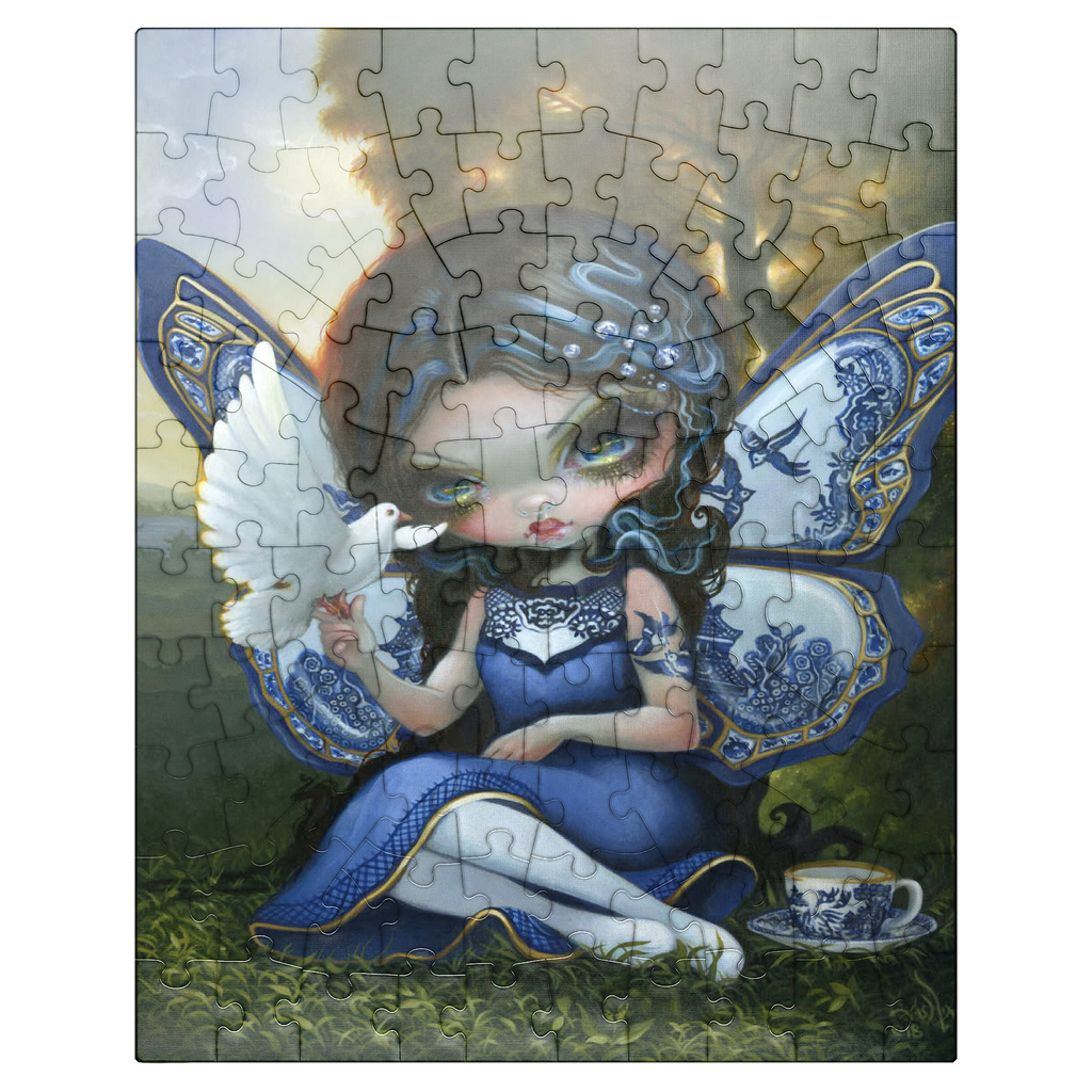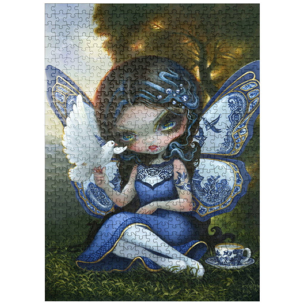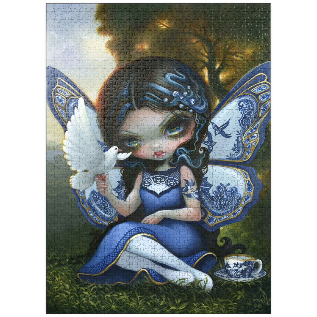 Piece together a fantastical Blue Willow dream! Discover a porcelain-winged fairy gracing a sunset landscape, inspired by the iconic Blue Willow pattern. This enchanting artwork offers a unique puzzle experience blending fantasy and classic design. Unveil the magic of the Blue Willow series!