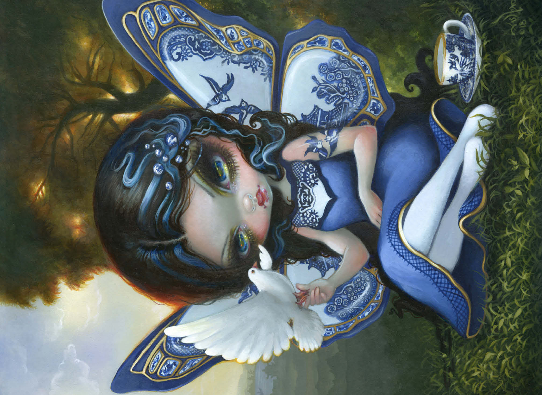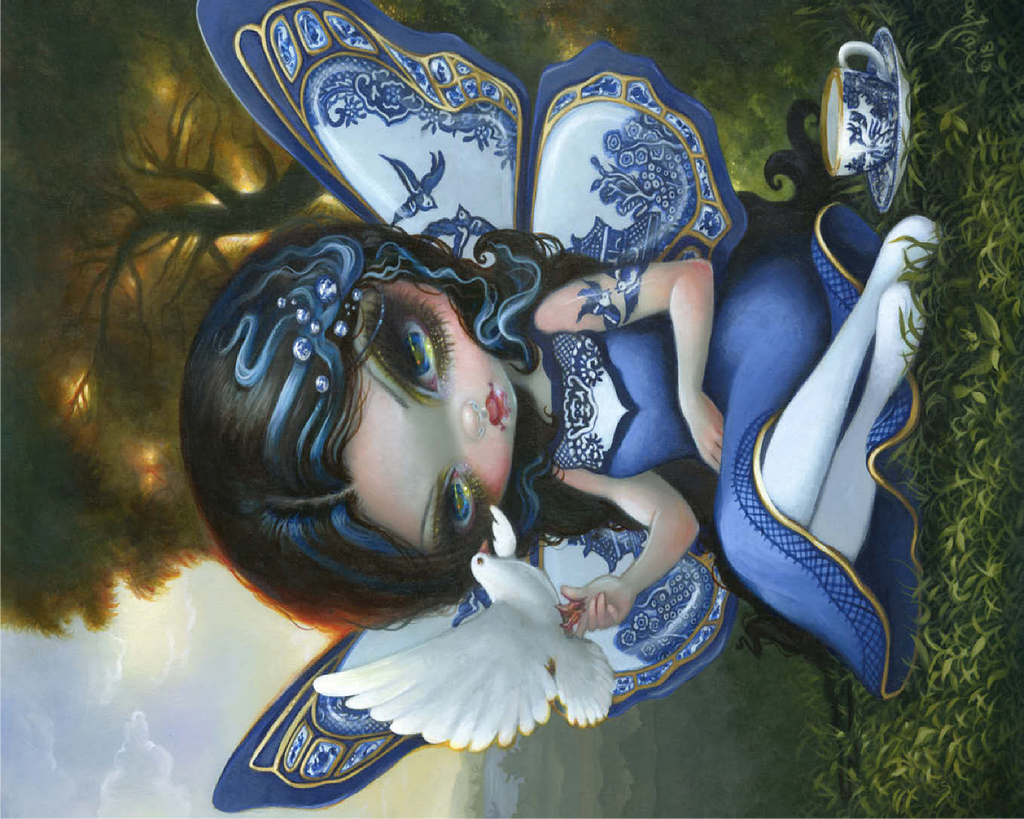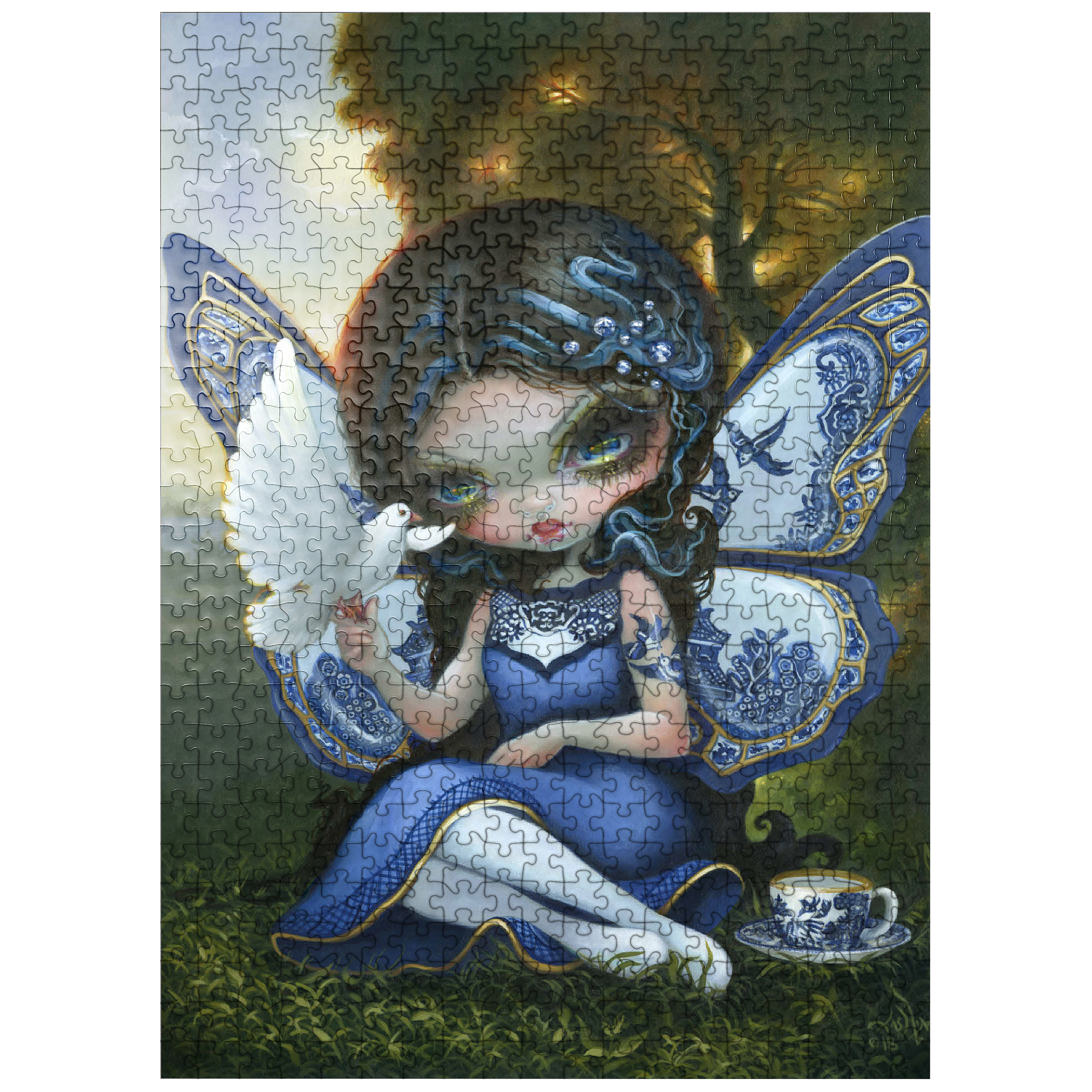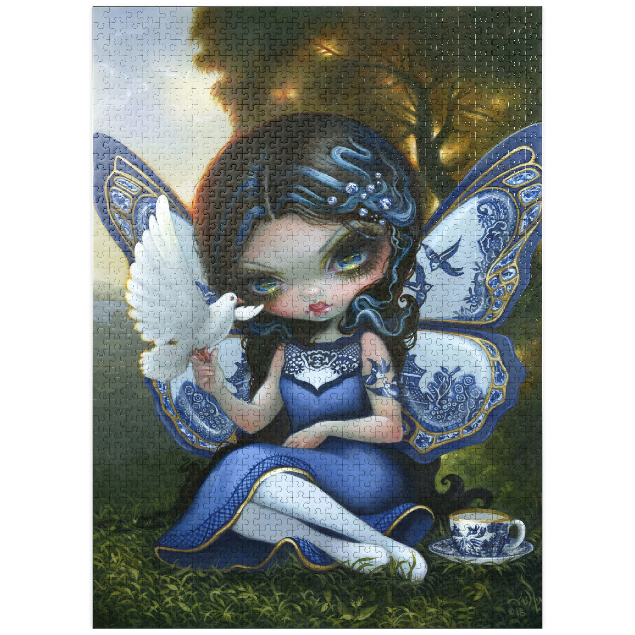 Piece together a fantastical Blue Willow dream! Discover a porcelain-winged fairy gracing a sunset landscape, inspired by the iconic Blue Willow pattern. This enchanting artwork offers a unique puzzle experience blending fantasy and classic design. Unveil the magic of the Blue Willow series!