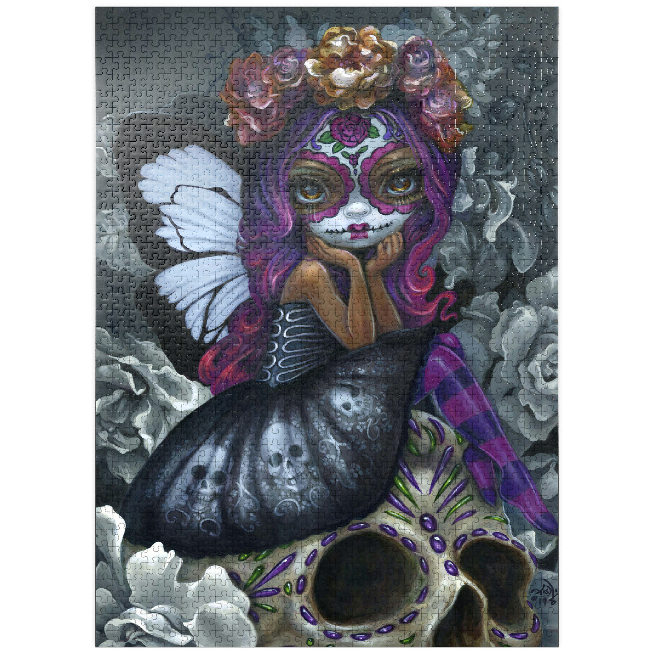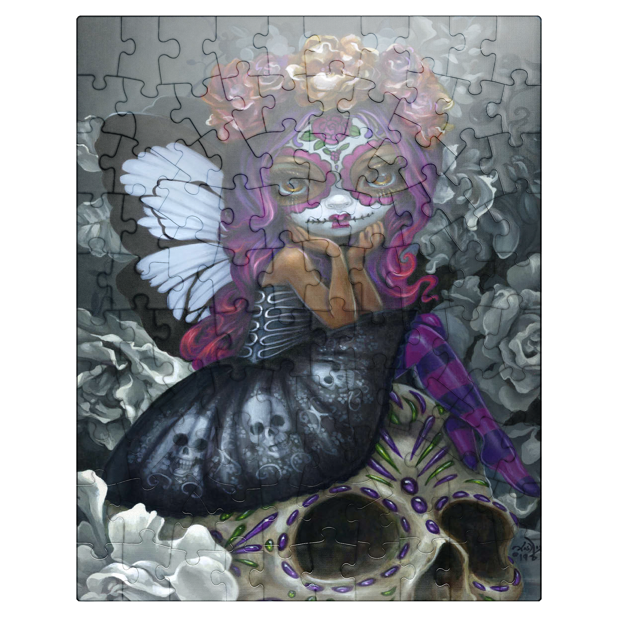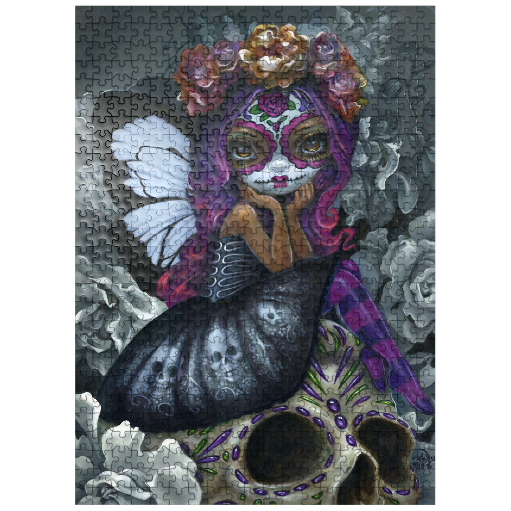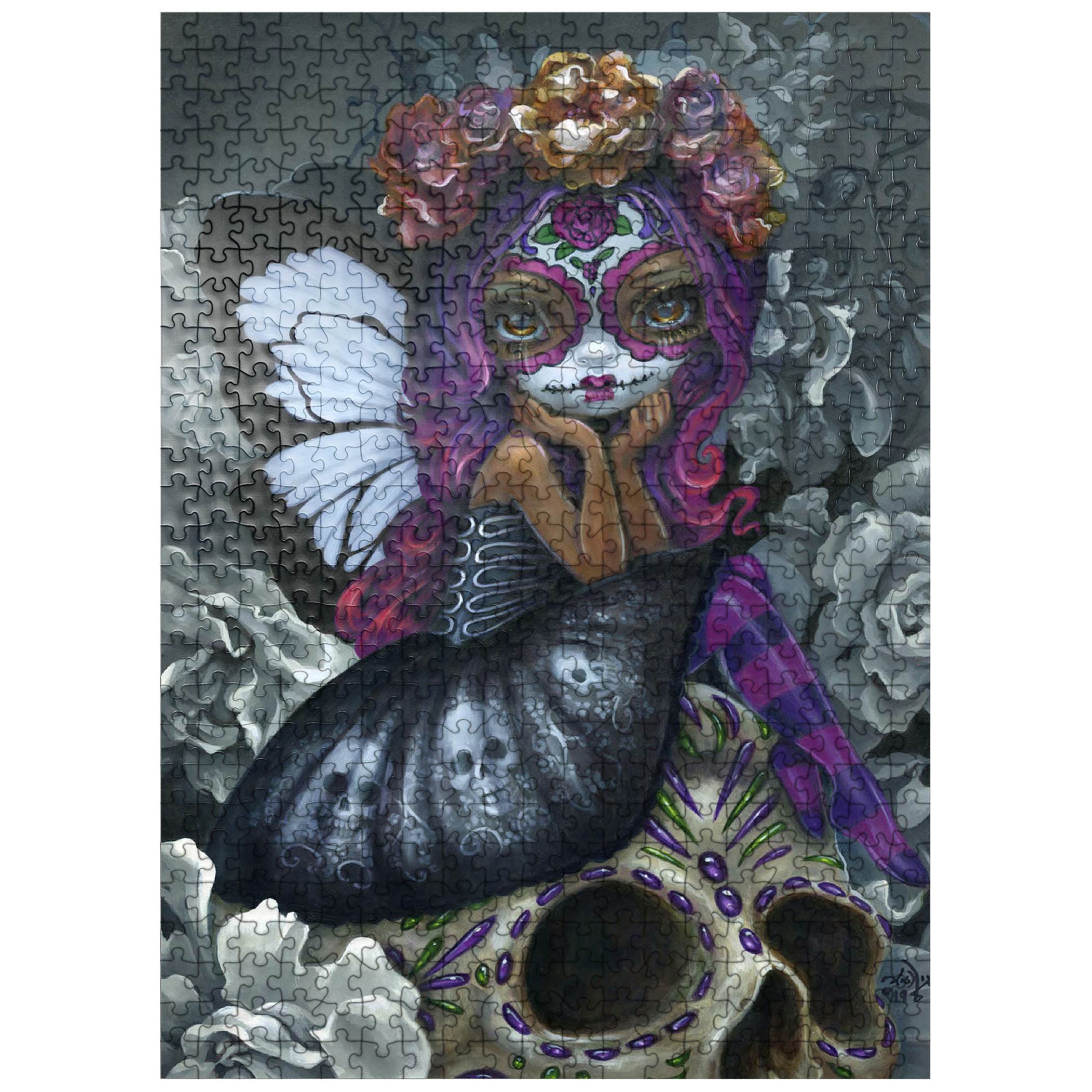 Unravel the beauty of Soulful Spirits 1 in this captivating puzzle! Piece together a striking Dia de los Muertos character with traditional Calavera face paint and stunning black & white butterfly wings. Discover grayscale florals and a delicately decorated skull. Assemble this soulful and evocative scene!