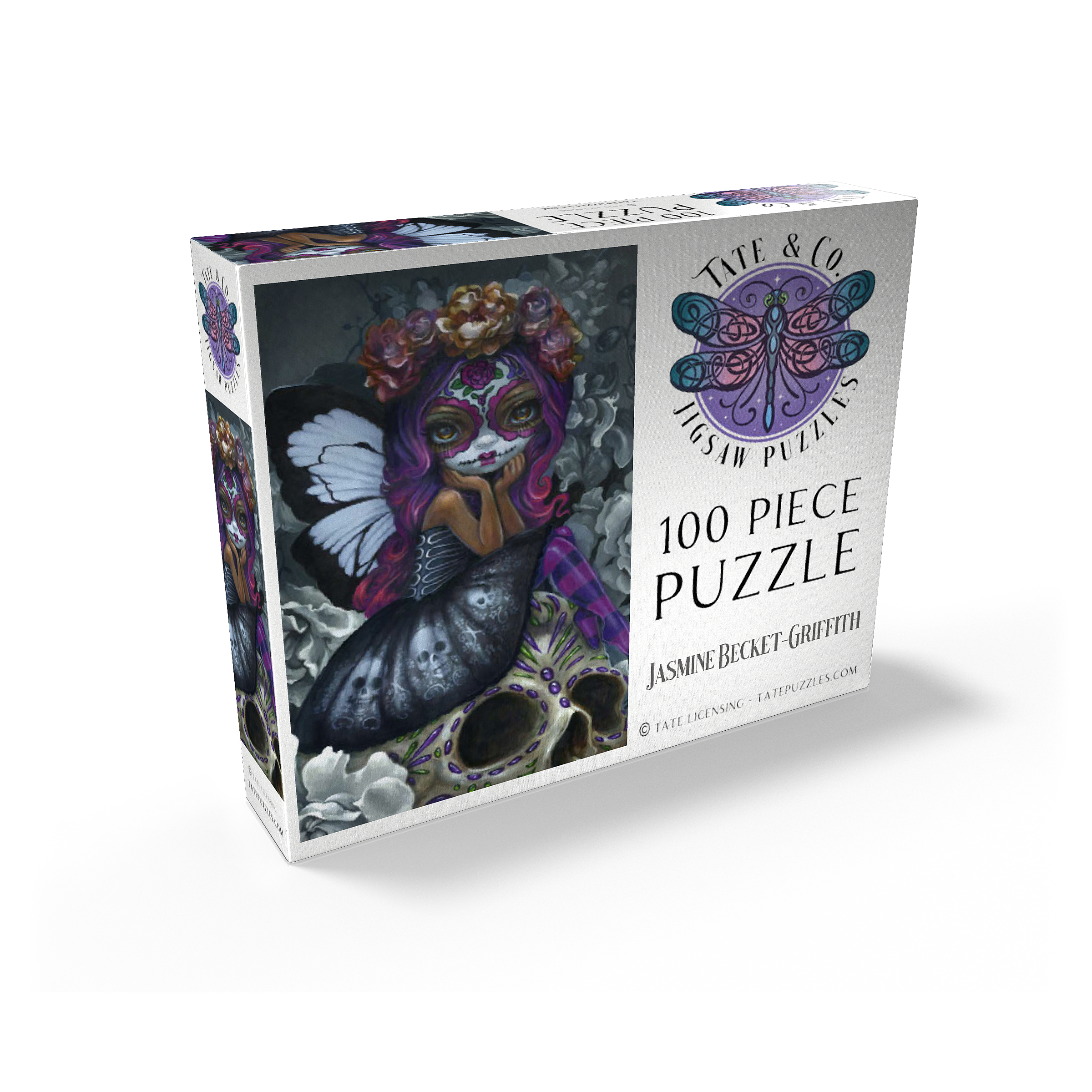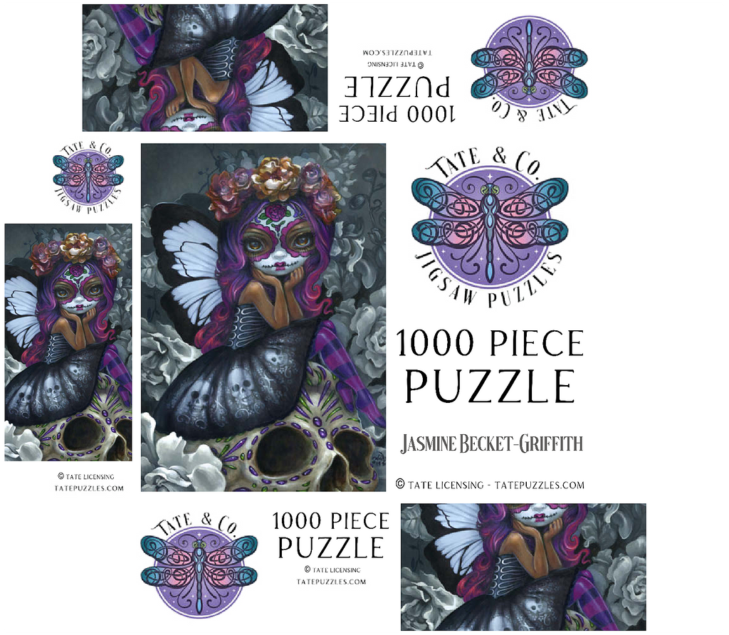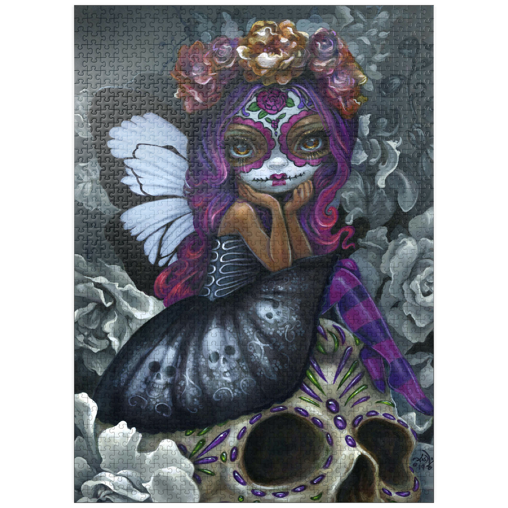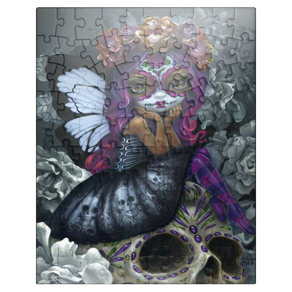 Unravel the beauty of Soulful Spirits 1 in this captivating puzzle! Piece together a striking Dia de los Muertos character with traditional Calavera face paint and stunning black & white butterfly wings. Discover grayscale florals and a delicately decorated skull. Assemble this soulful and evocative scene!