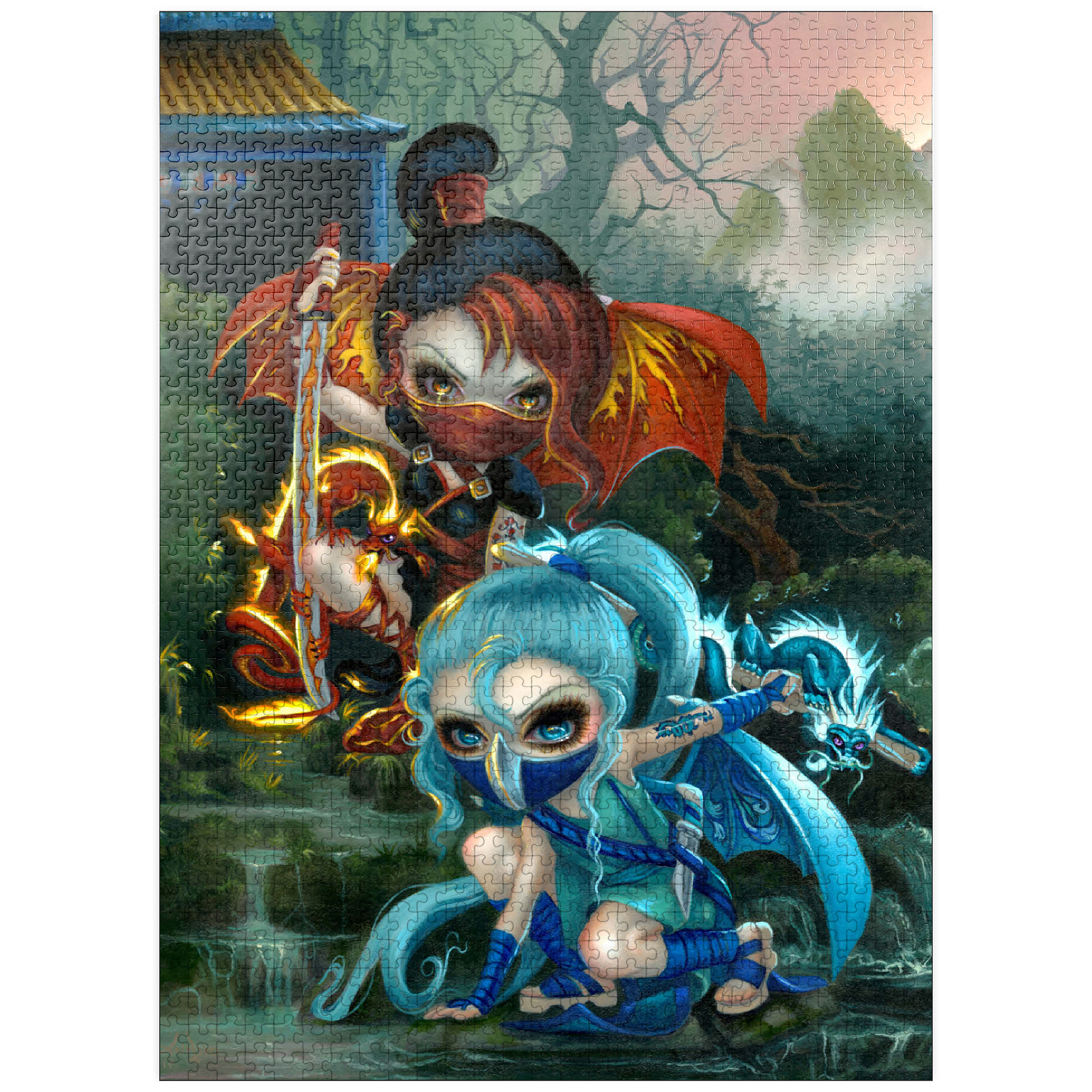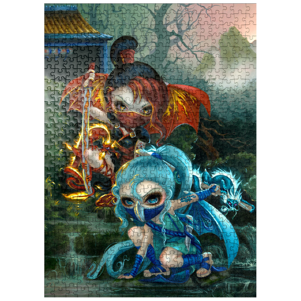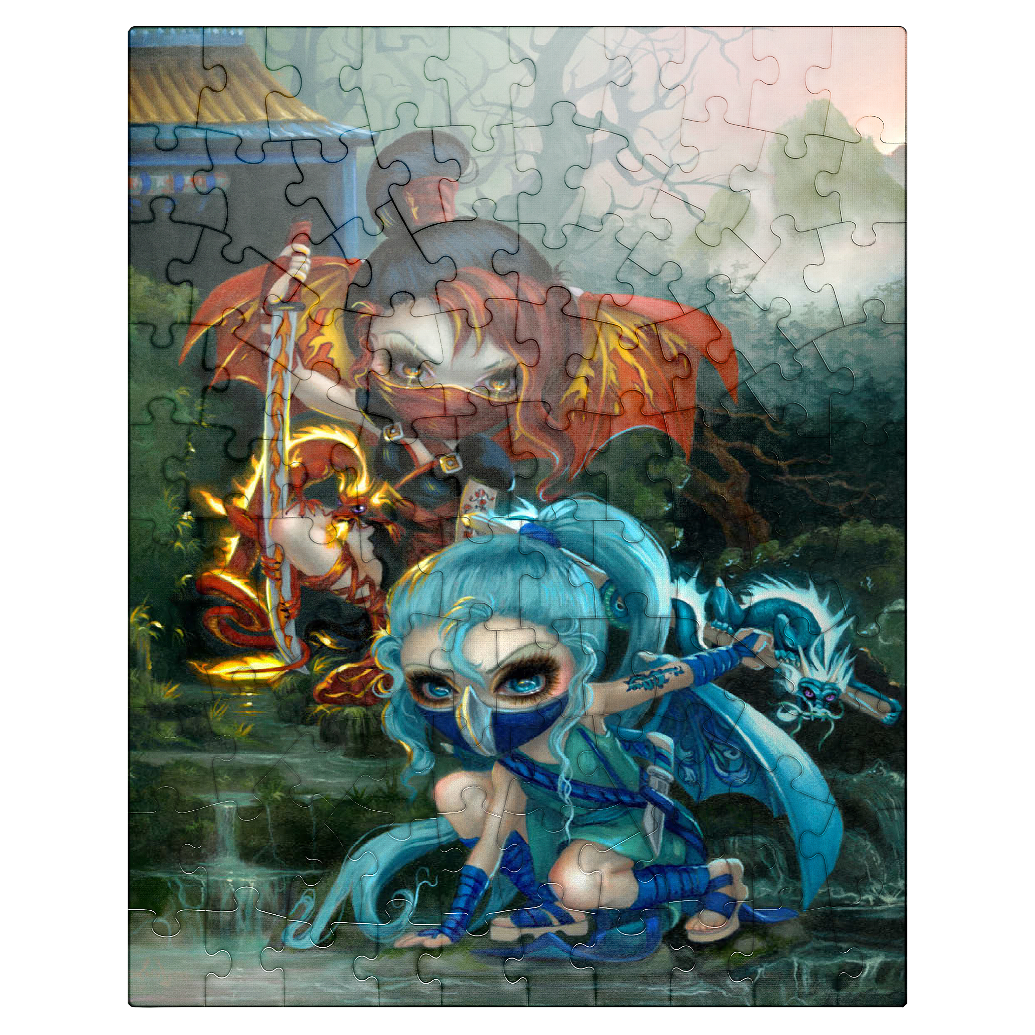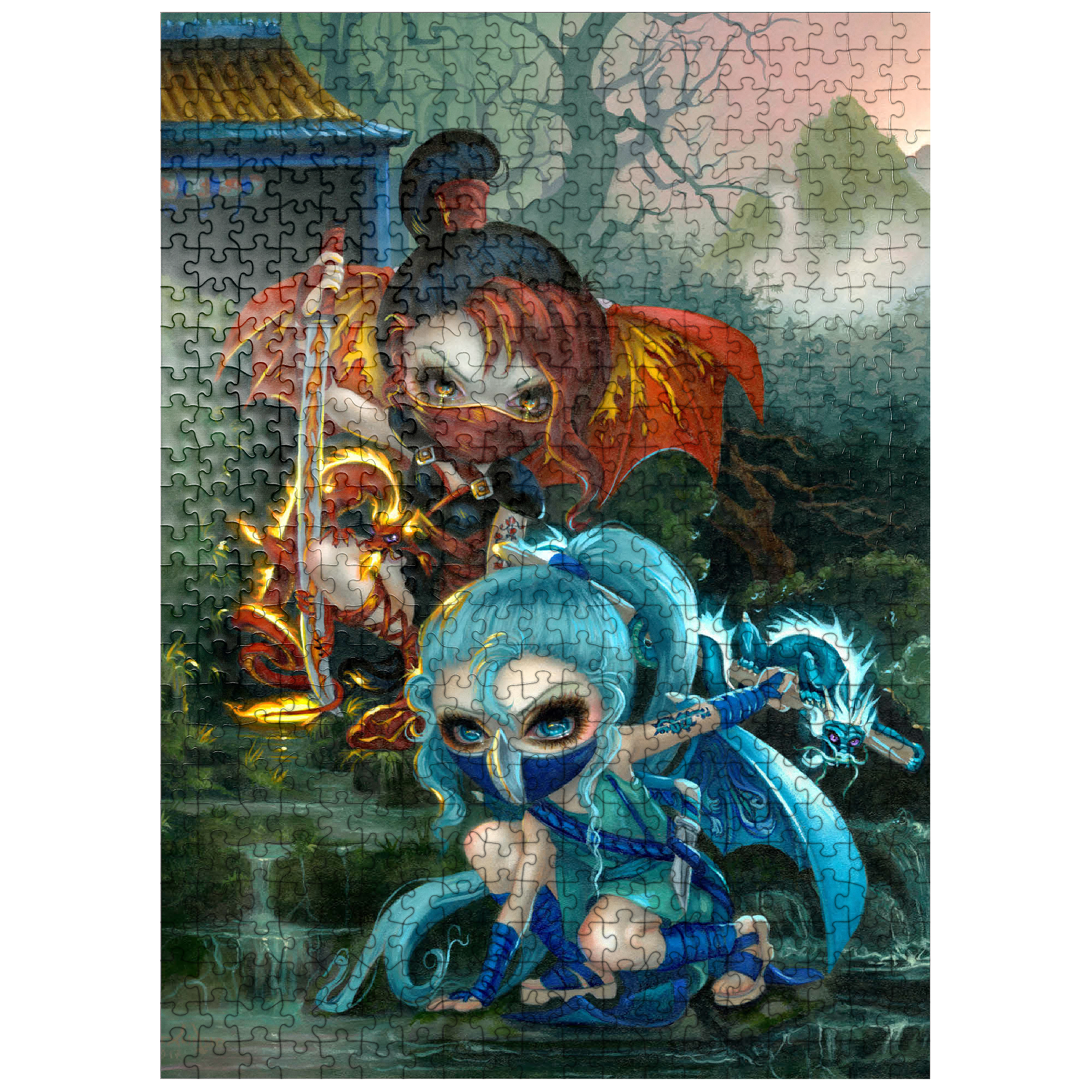 Unleash the ninja dragonlings in a captivating puzzle! Assemble Yuriko, the Fire Ninja, and Izumi, the Water Ninja, amidst a stunning Asian-inspired mountain waterfall scene. These adorable yet stealthy dragonlings are pictured with their glowing pet dragons. Piece together this unique fantasy adventure!
