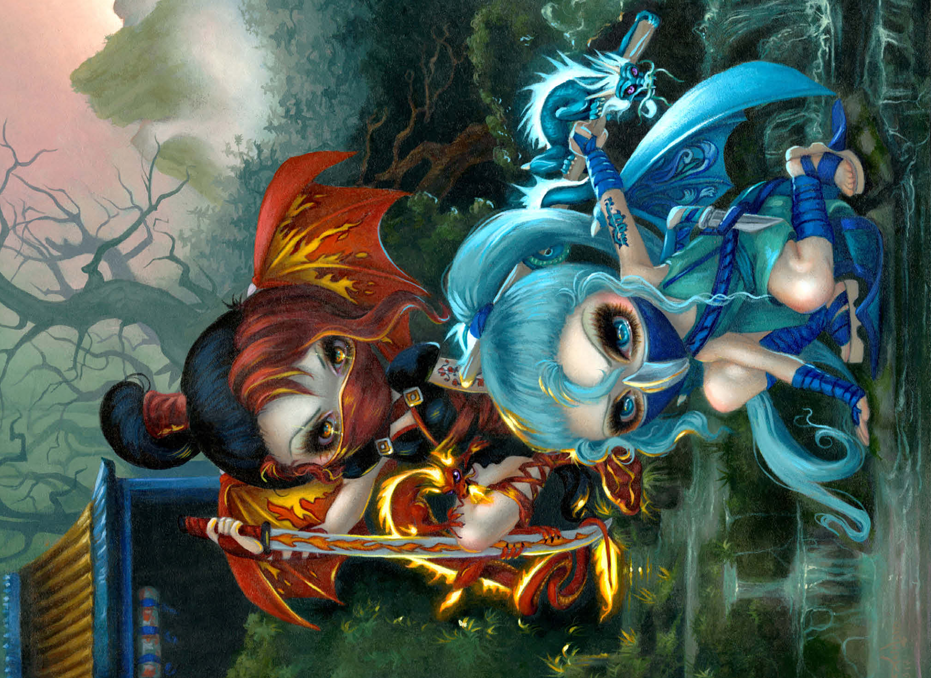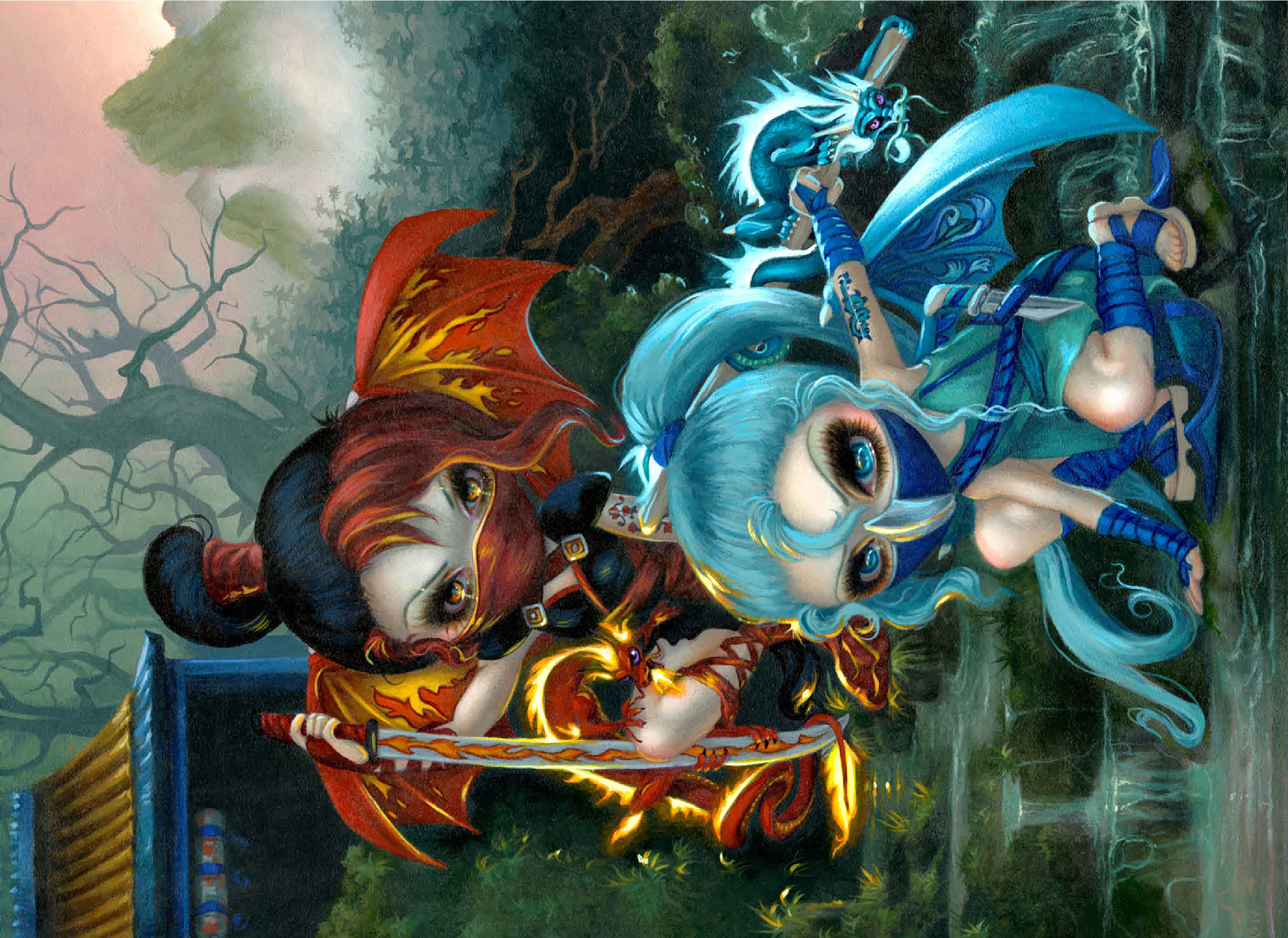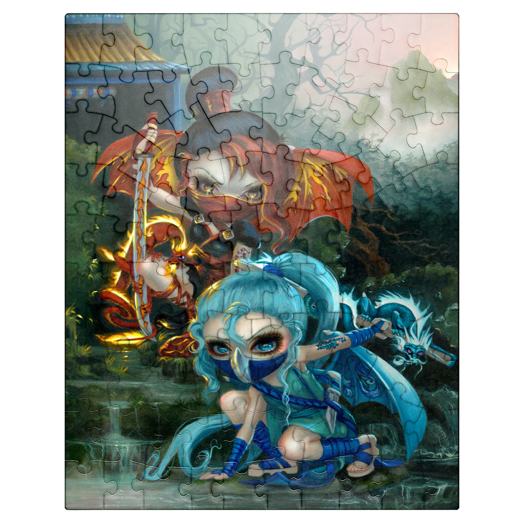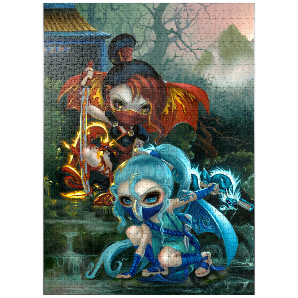 Unleash the ninja dragonlings in a captivating puzzle! Assemble Yuriko, the Fire Ninja, and Izumi, the Water Ninja, amidst a stunning Asian-inspired mountain waterfall scene. These adorable yet stealthy dragonlings are pictured with their glowing pet dragons. Piece together this unique fantasy adventure!