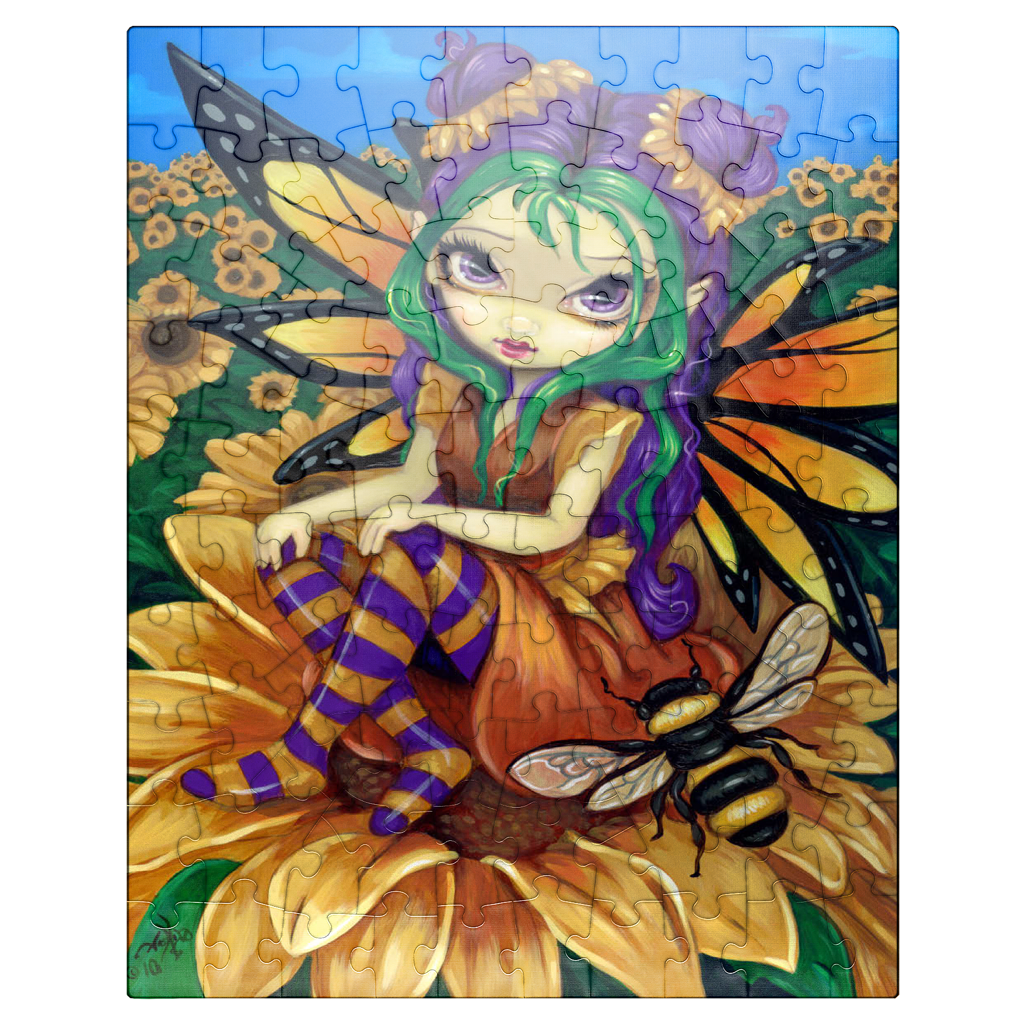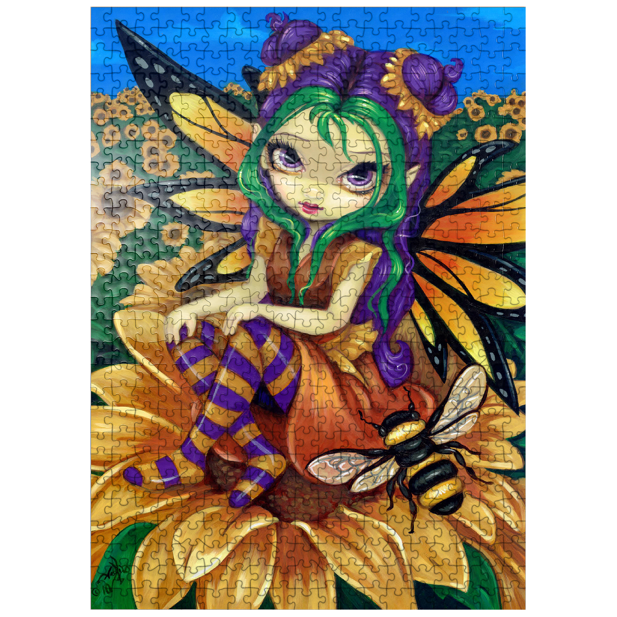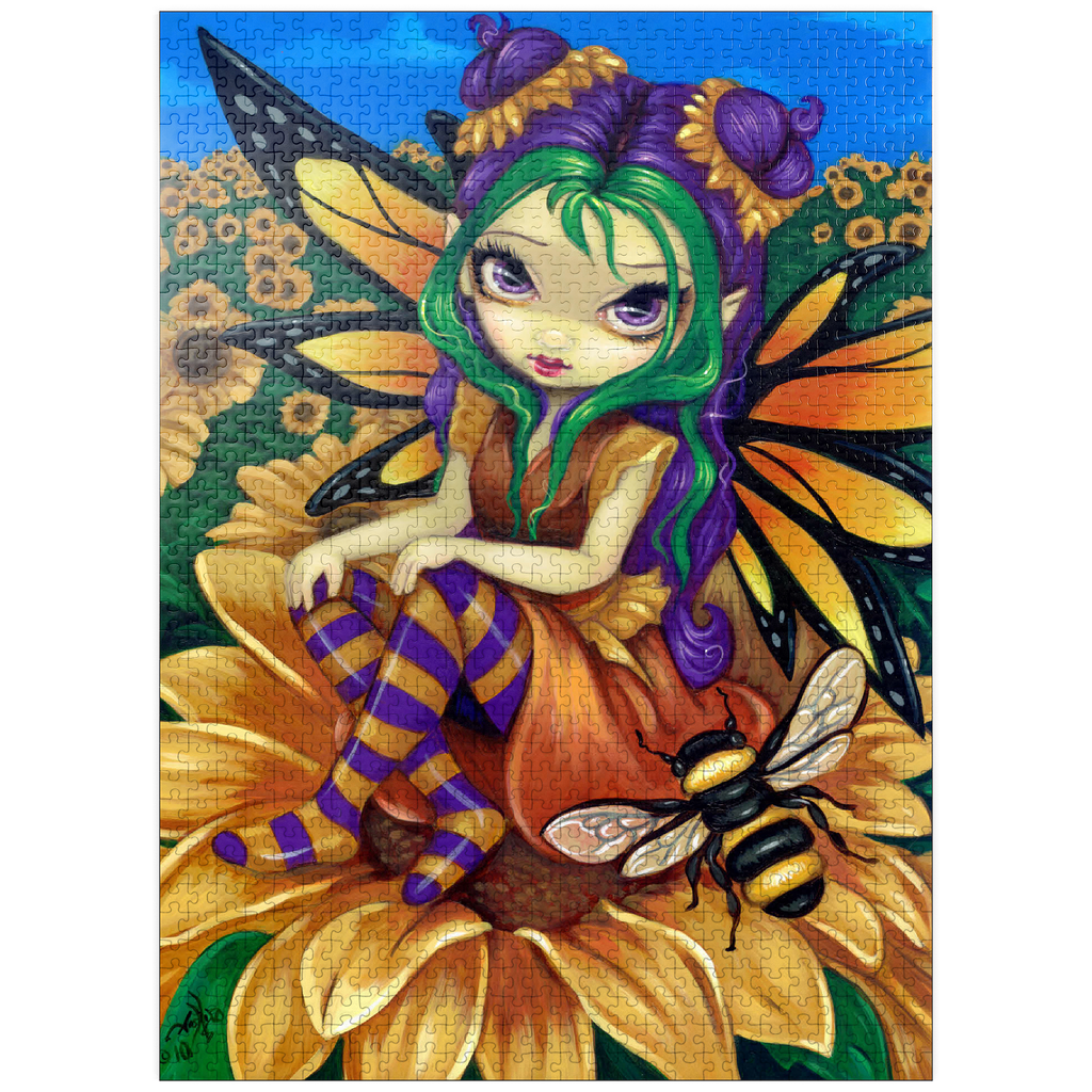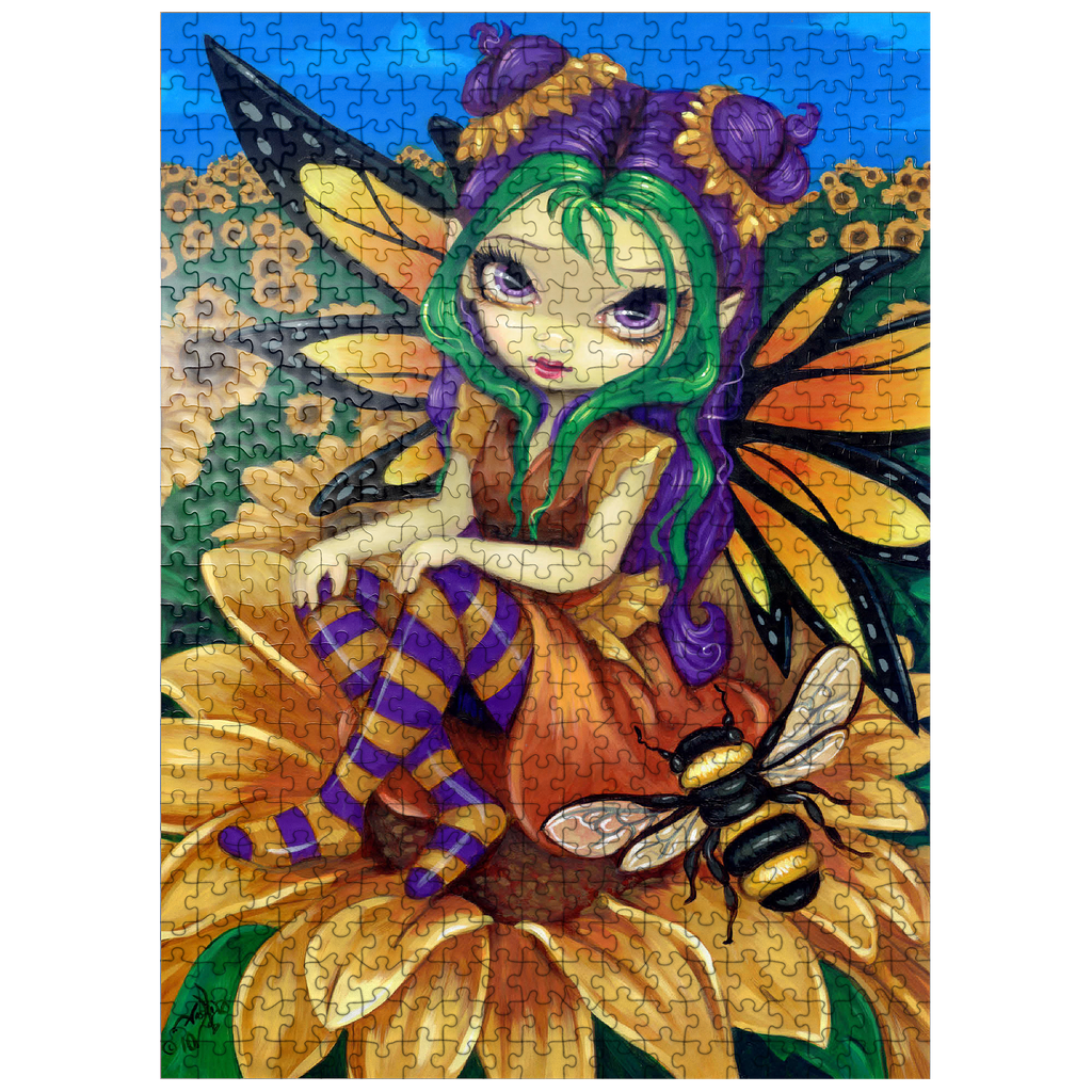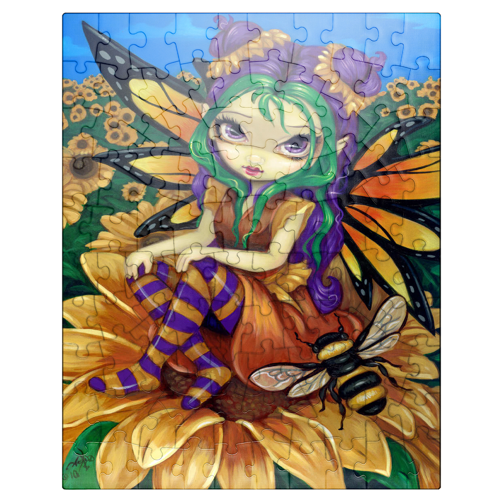 Piece together a sunny delight with the -Sitting on a Sunflower- puzzle! Assemble the cheerful fairy -Silly Sunny- as she sits atop a vibrant sunflower, accompanied by her buzzing bumblebee friend. Immerse yourself in a bright blue sky and a field of golden sunflowers. A joyful and whimsical puzzle to brighten your day!