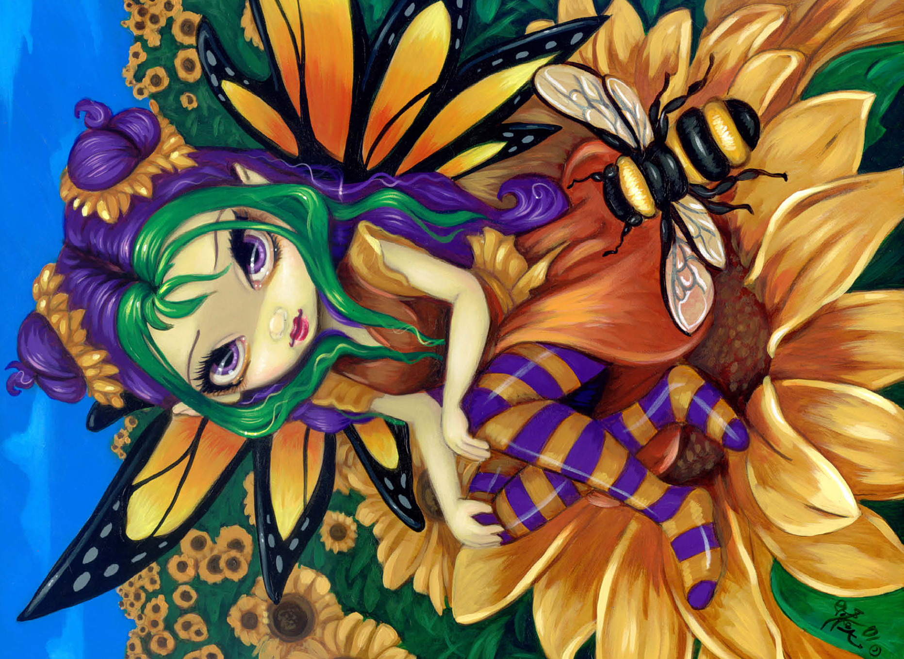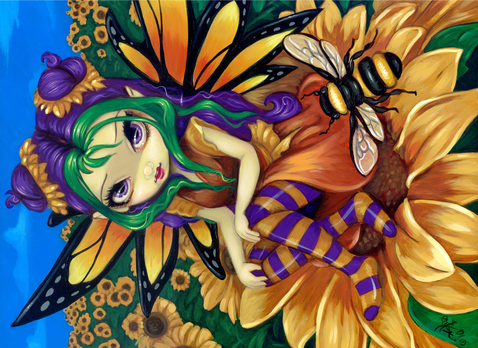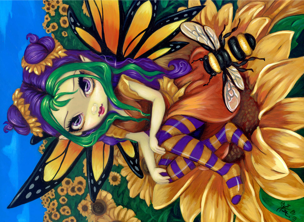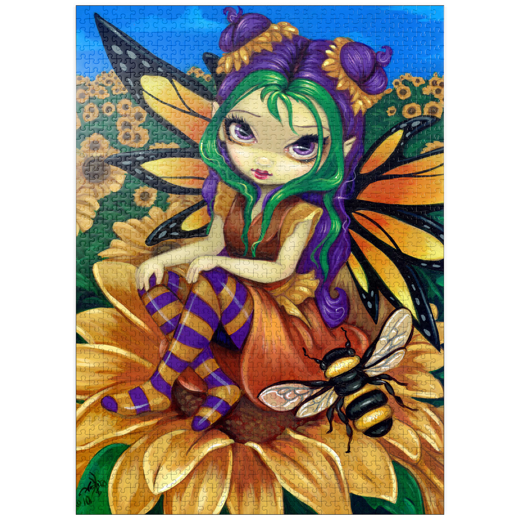 Piece together a sunny delight with the -Sitting on a Sunflower- puzzle! Assemble the cheerful fairy -Silly Sunny- as she sits atop a vibrant sunflower, accompanied by her buzzing bumblebee friend. Immerse yourself in a bright blue sky and a field of golden sunflowers. A joyful and whimsical puzzle to brighten your day!